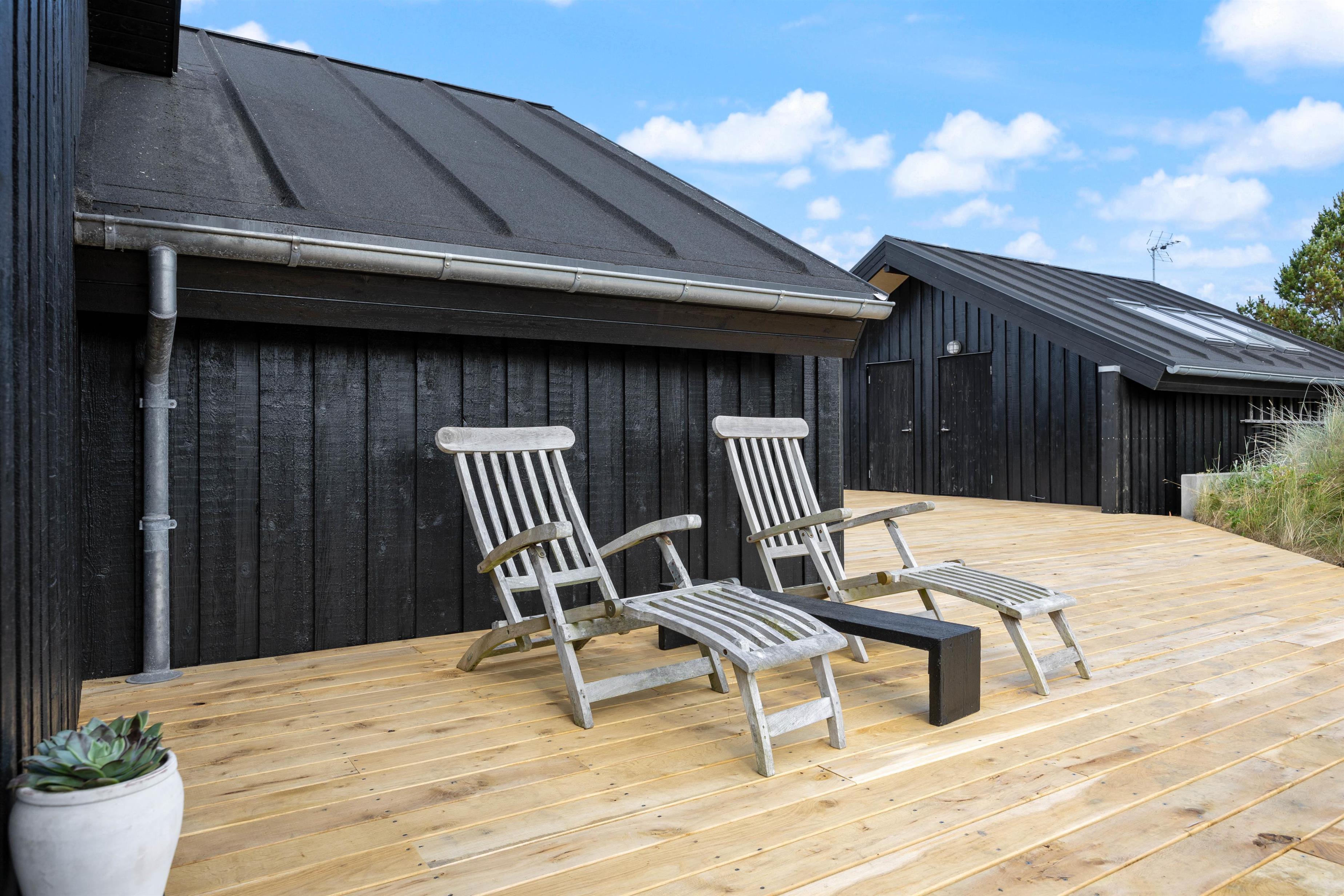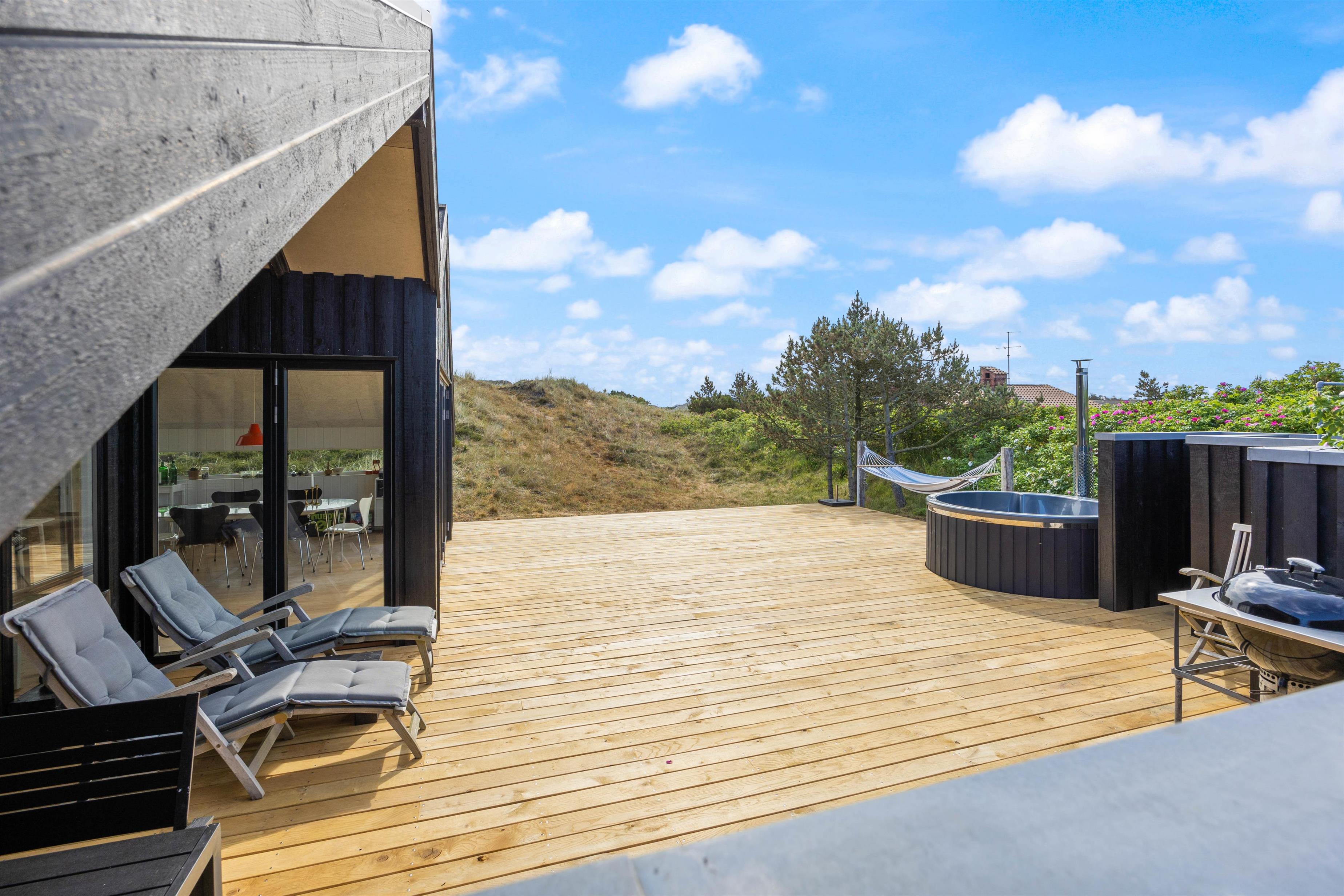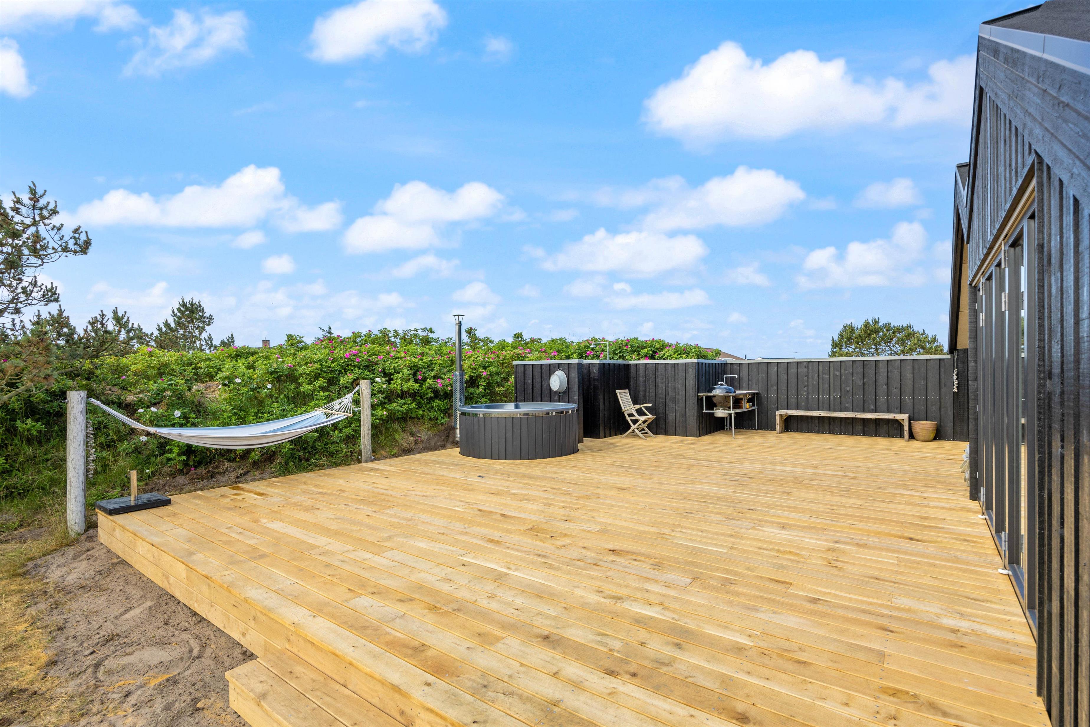 Sommerhuset ligger dejlig ugeneret på en 2053 kvm stor naturgrund og har en afskærmet terrasse, der indbyder til ren afslapning, hvor I kan sidde i fred og nyde den jyske natur. På terrassen er et udendørs køkken med både koldt og varmt vand, hvor I kan tilberede et lækkert middagsmåltid. Der er solvogne og parasol samt grill til fri afbenyttelse. Og hvad er mere skønt end at blive kølet ned under udebruseren efter at have ligget og solet på terrassen i havemøblerne? I skal dog være opmærksomme på, at udebruseren kun er tilgængelig fra april til november.