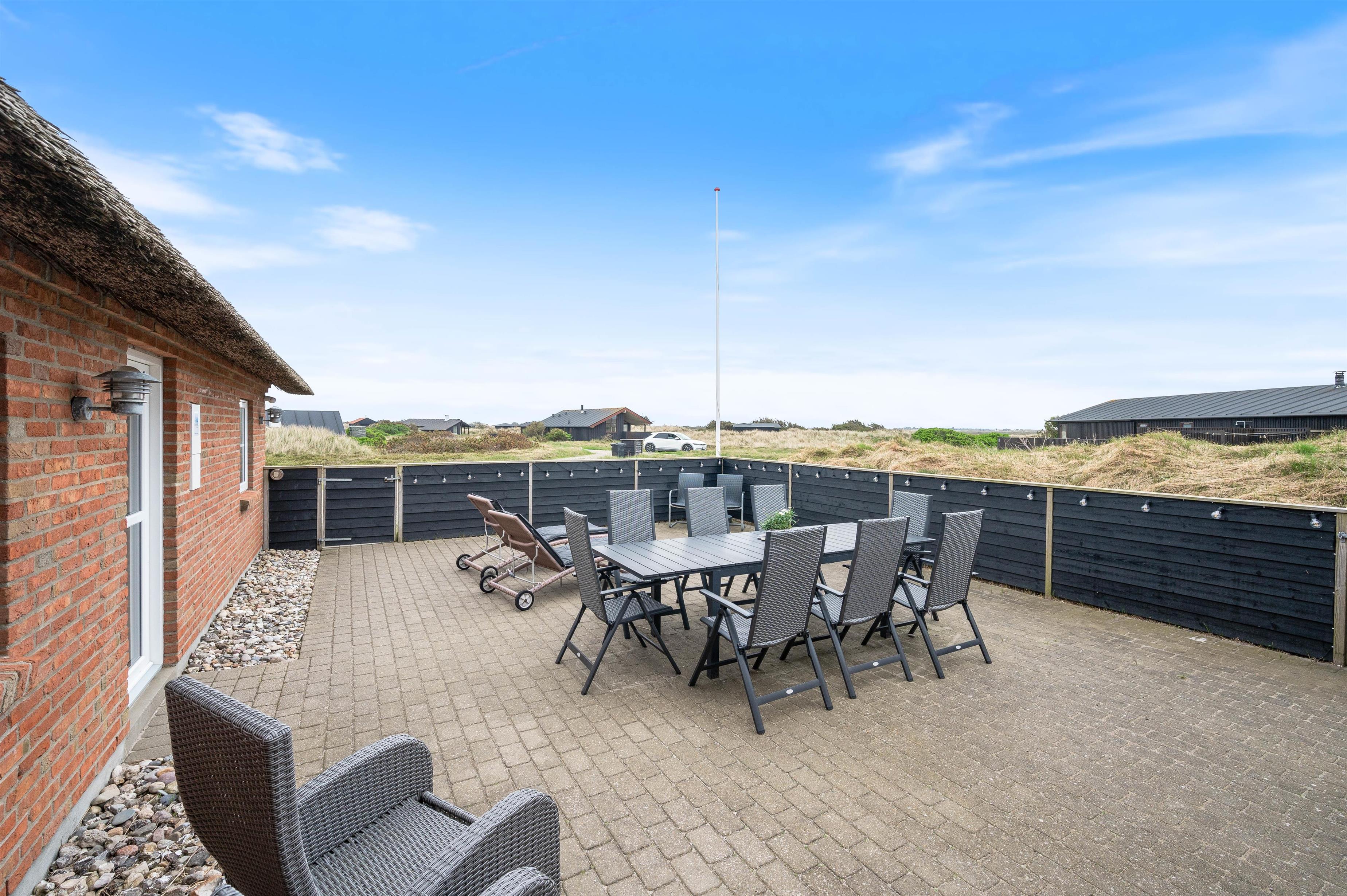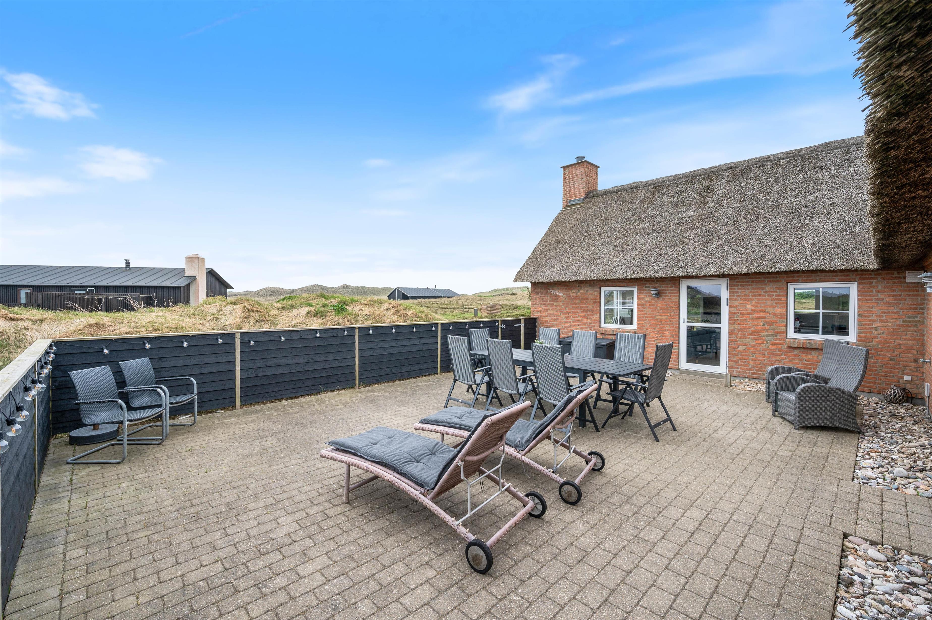 Huset har terrasse på to sider, så I kan følge solen fra morgen til aften. Havemøbler, liggestole og grill er der sørget for, så I på de varme sommerdage kan slappe af på ægte charter-manér med en kold drink i hånden og den bagende sol foroven.