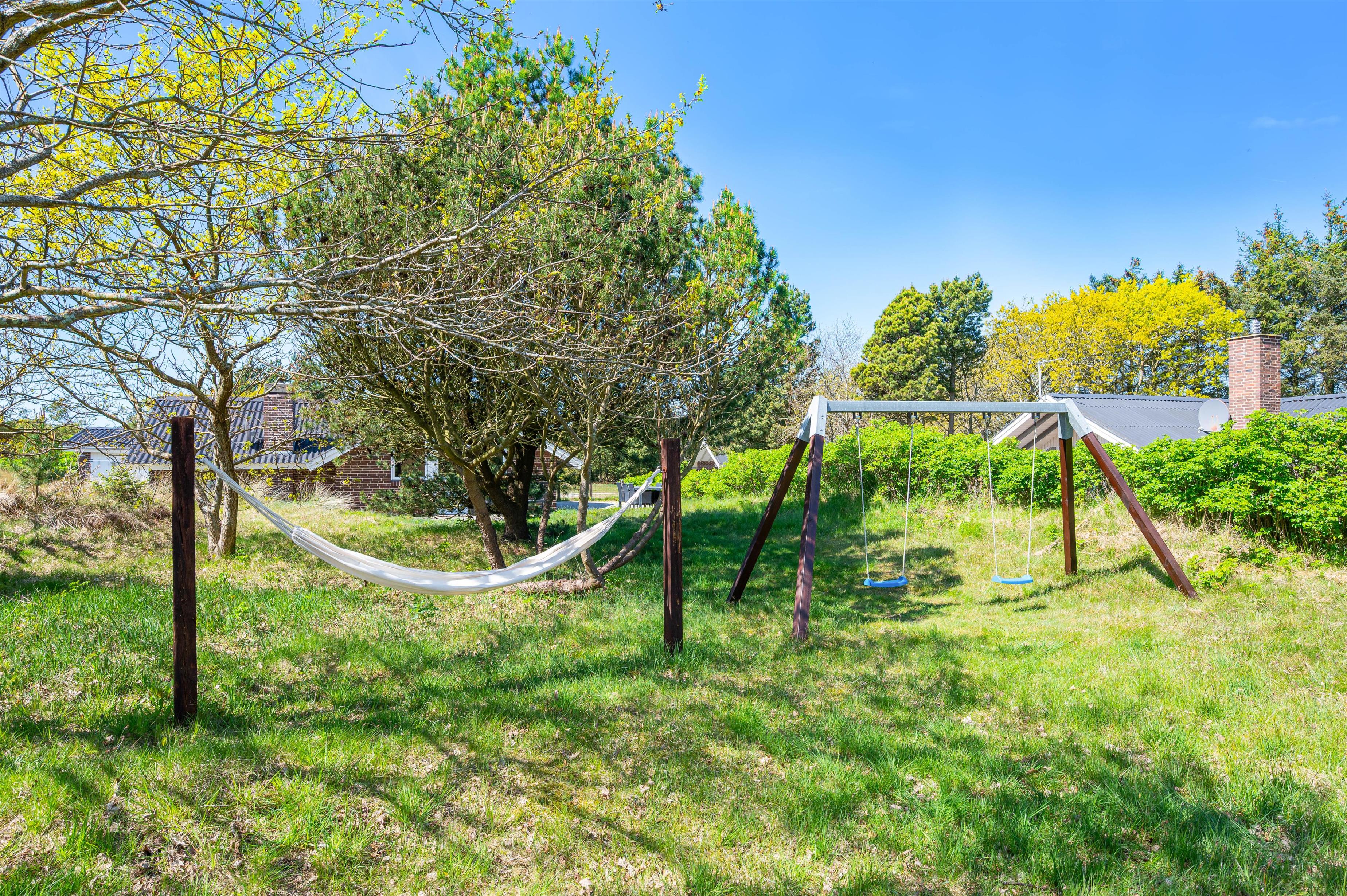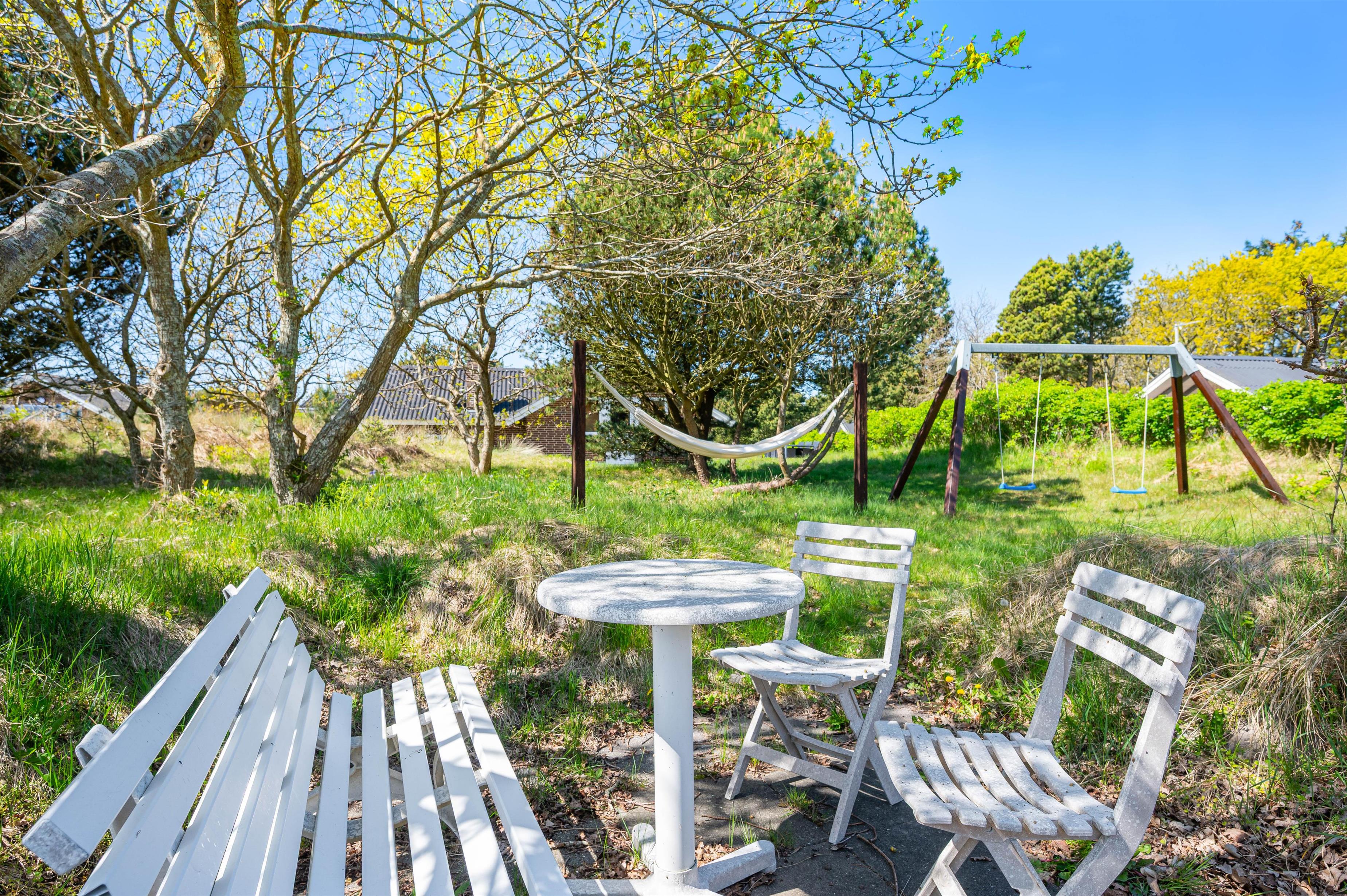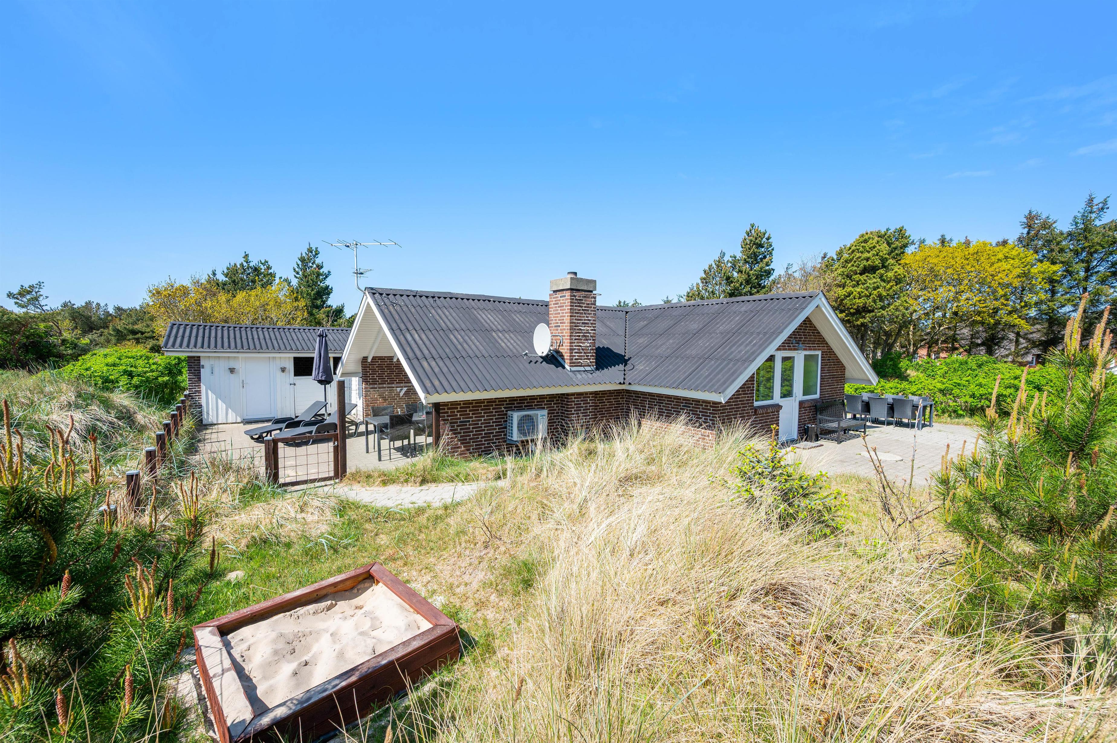 Husets terrasser er alle åbne og med god plads til hele familien. Der er også rig mulighed for, at sidde i havemøblerne på terrassen og nyde solen, stilheden samt slappe af efter en lang gåtur langs Vesterhavet. En af terrasserne er overdækket, så både børn og hunde kan søge ind i skyggen, hvis solen er for skrap. En mindre terrasse giver max mulighed for soldyrkelse, da den er omgivet af høje klitter samt bevoksning. I forlængelse af denne er opsat stativ til hængekøje hvor middagssøvnen uforstyrret kan indtages.