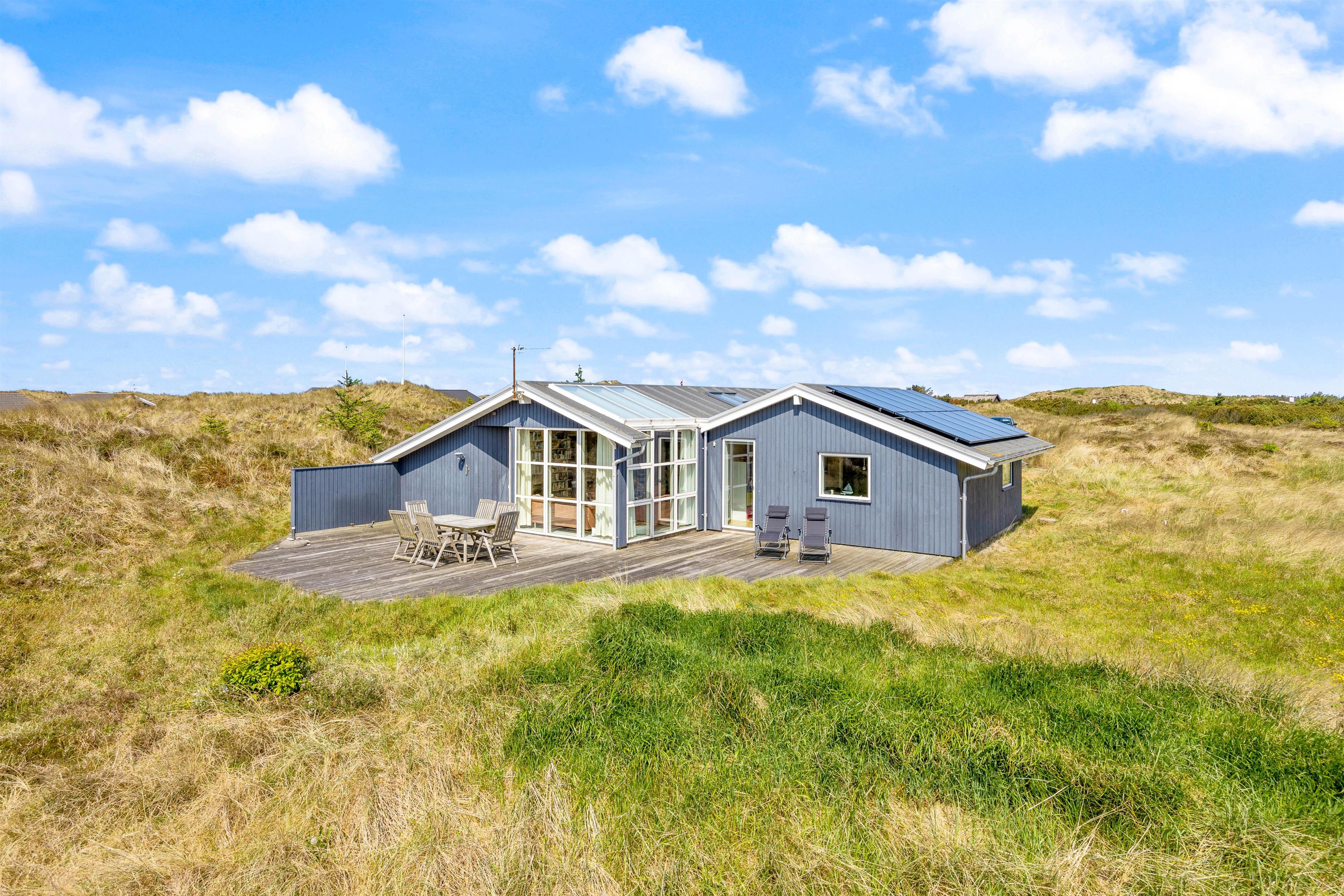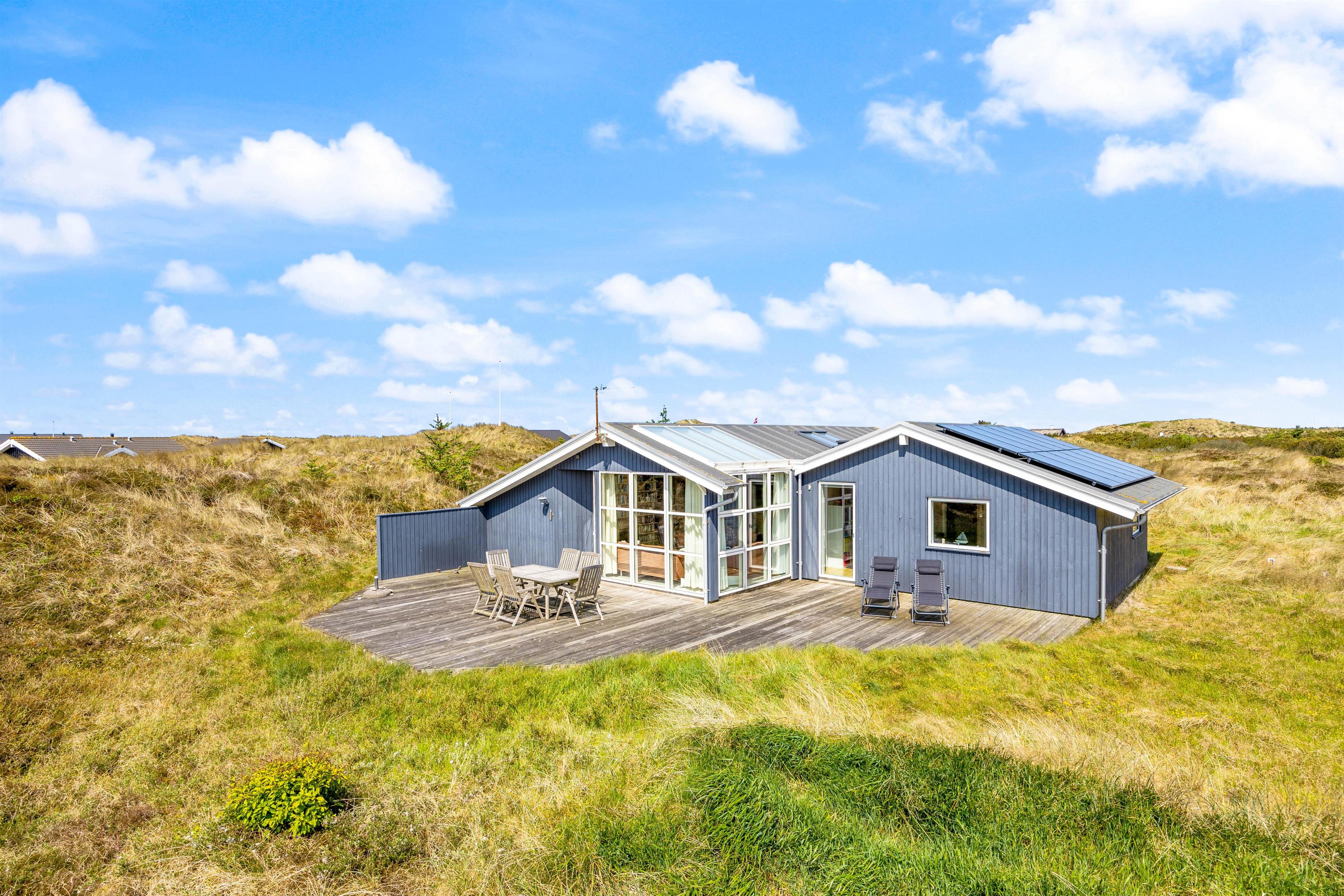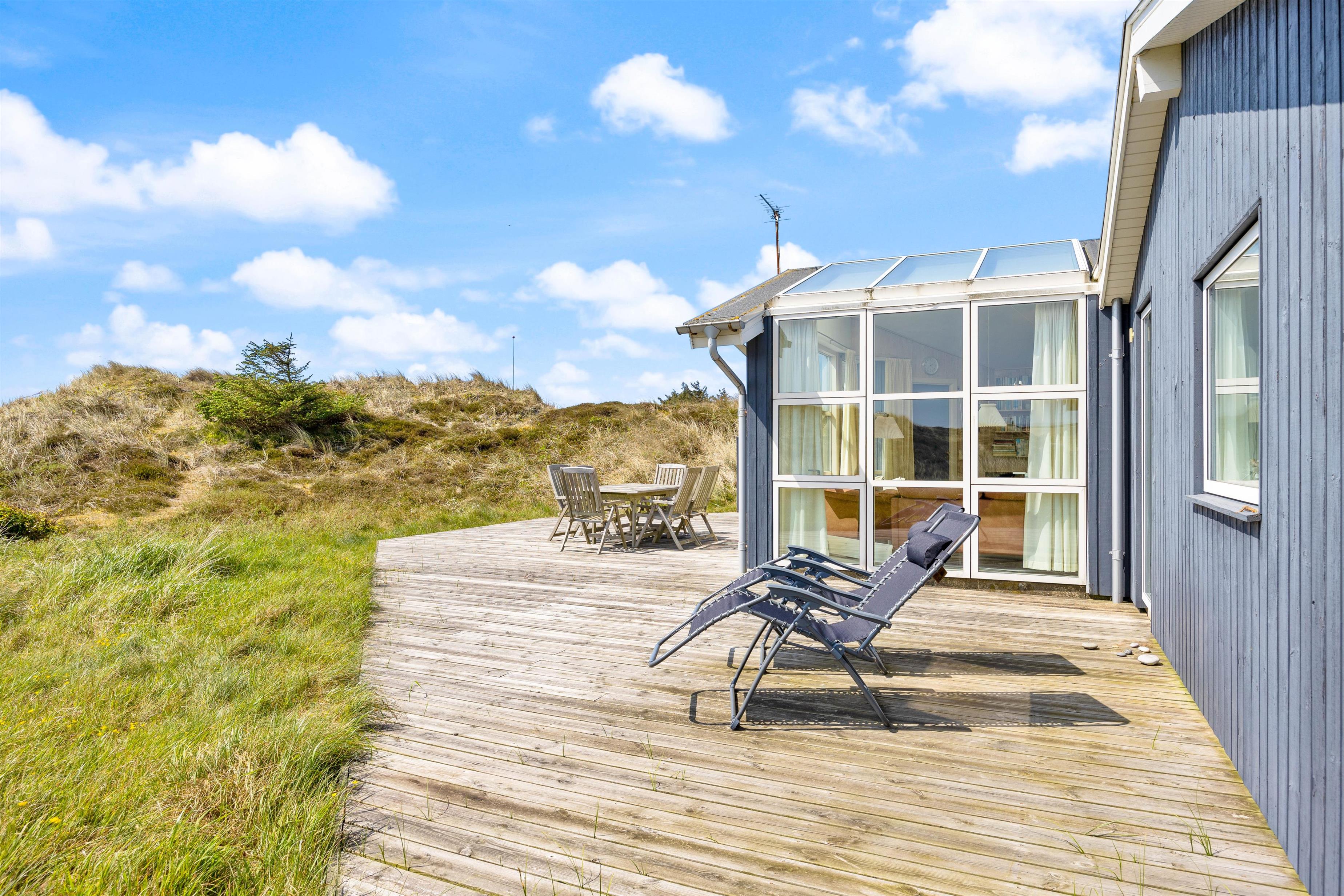 Fra stuen er der udgang til den store træterrasse, som omringer feriehuset. Terrassen er åben samt delvis afskærmet. Her kan I sidde i sommerhusets havemøbler og nyde udsigten til klitterne med en god kop kaffe, og om aftenen kan I finde feriehusets grill frem og tilberede en behagelig middag herpå. Udenfor finder I også et redskabsrum, hvor I kan opbevare diverse ting.