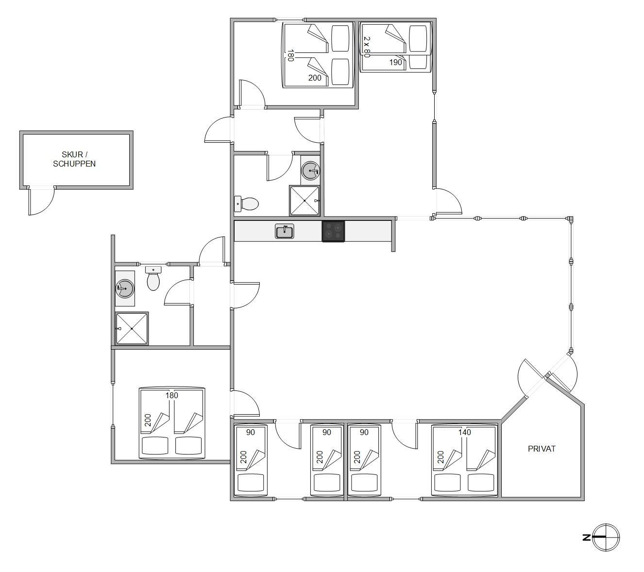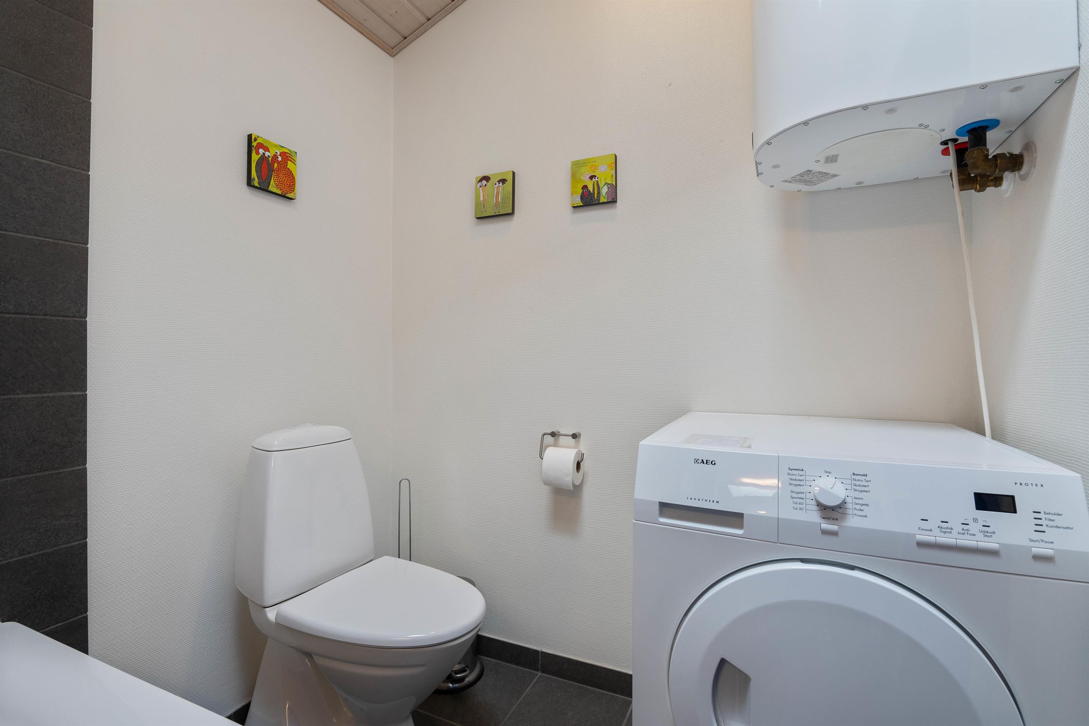 Feriehuset har 5 soverum med både enkeltsenge og dobbeltsenge. Derudover er der 2 badeværelser, som begge er med bruseniche og tilhørende gulvvarme, så man kan holde fødderne varme. I kan også varme sommerhuset op med den energibesparende luft til luft varmepumpe. På det ene badeværelse finder I også både vaskemaskine og tørretumbler, som kan klare dagens gøremål.