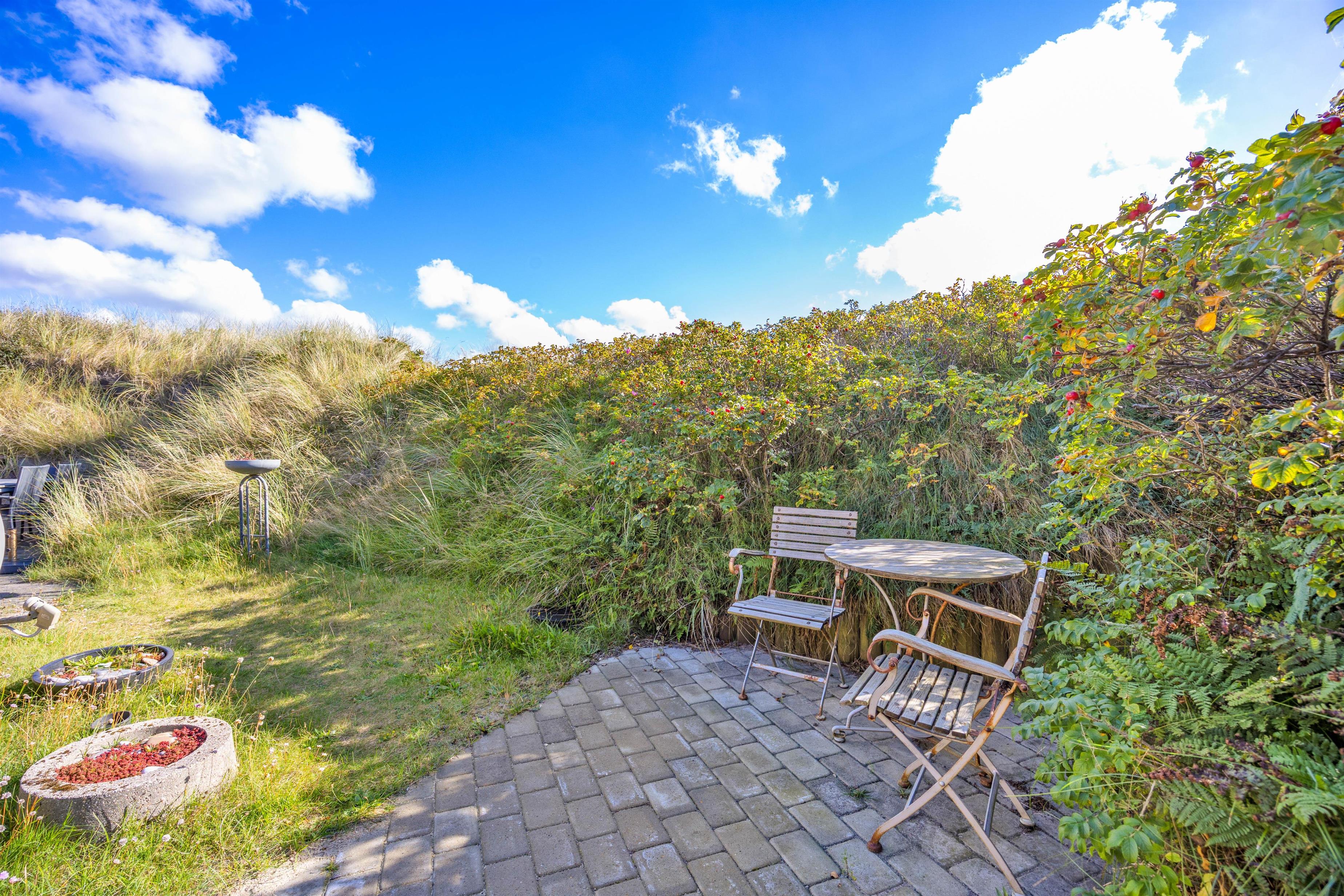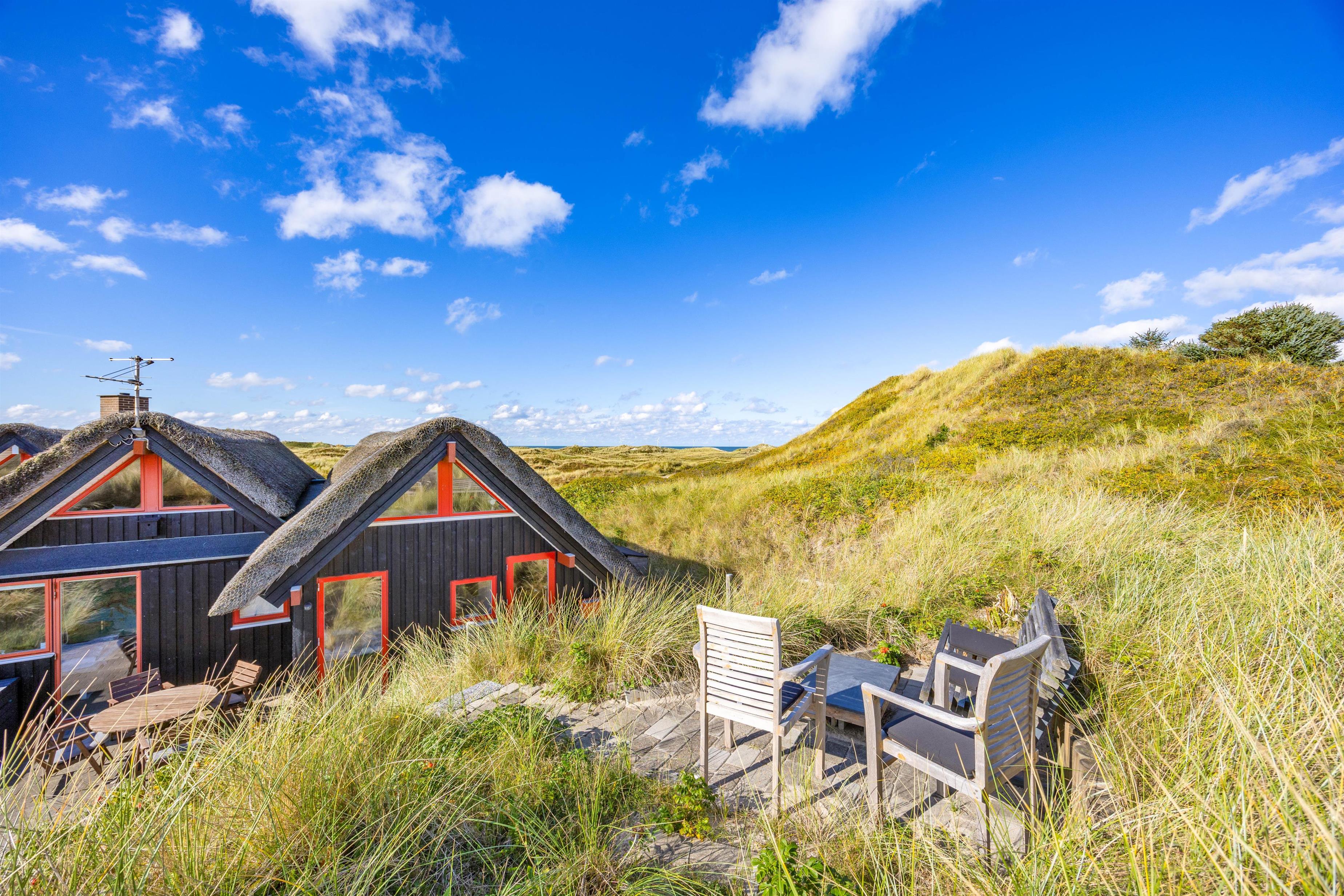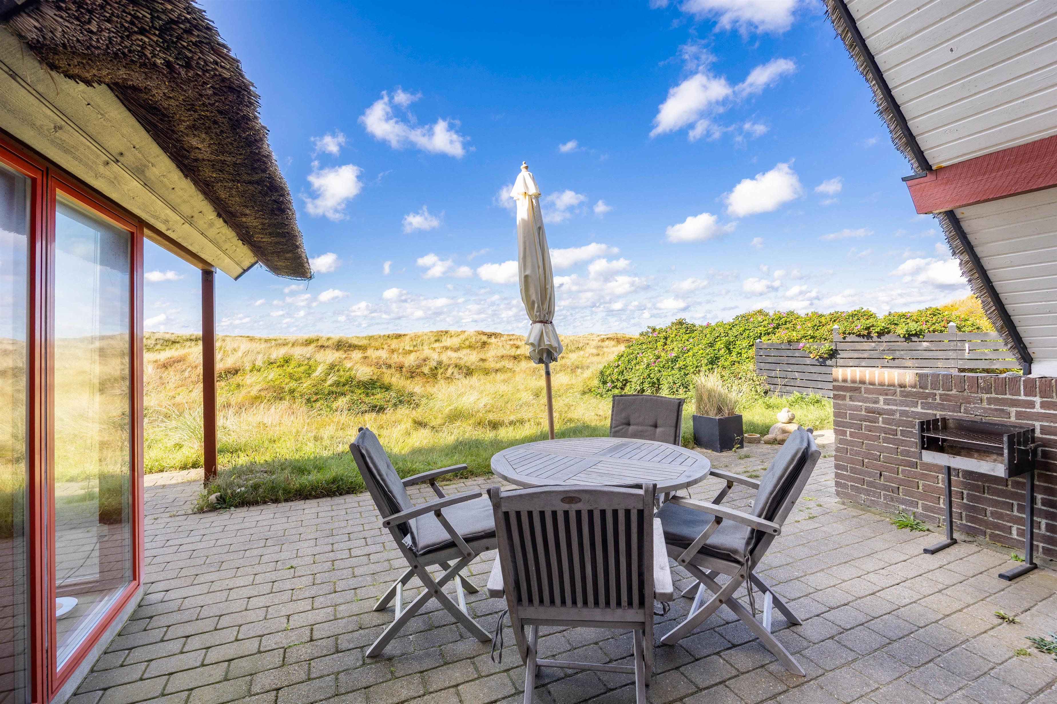 På de lune sommeraftener er sommerhusets åbne terrasse helt perfekt til hyggelige grillaftener, hvor I kan nyde udsigten til klitterne med et glas god vin, alt imens børnene leger i sandkassen, og bøfferne tilberedes på grillen. Rundt omkring sommerhuset finder I flere hyggekroge, hvor det er muligt at finde et godt sted med læ, hvor man kan nyde en stille stund.