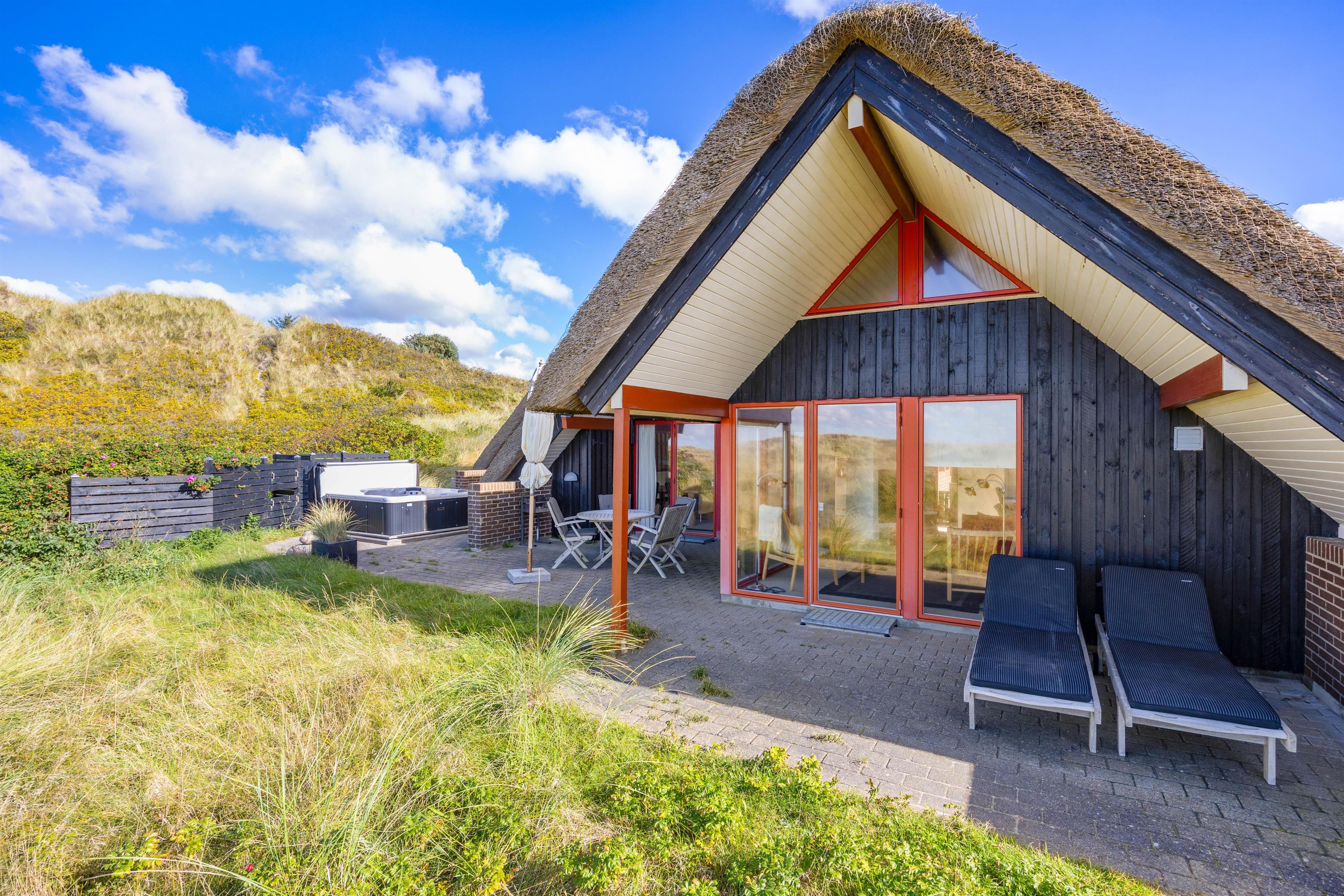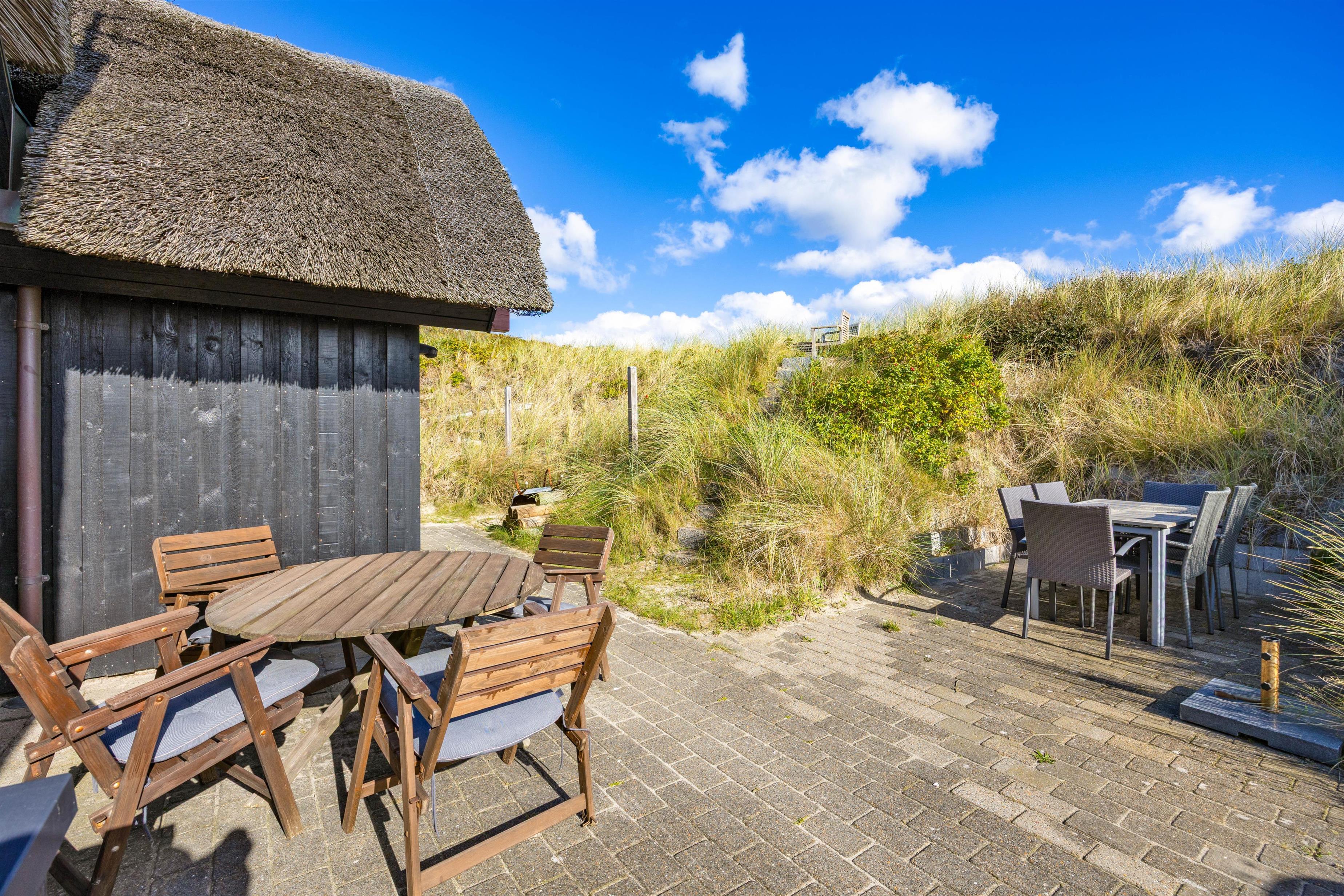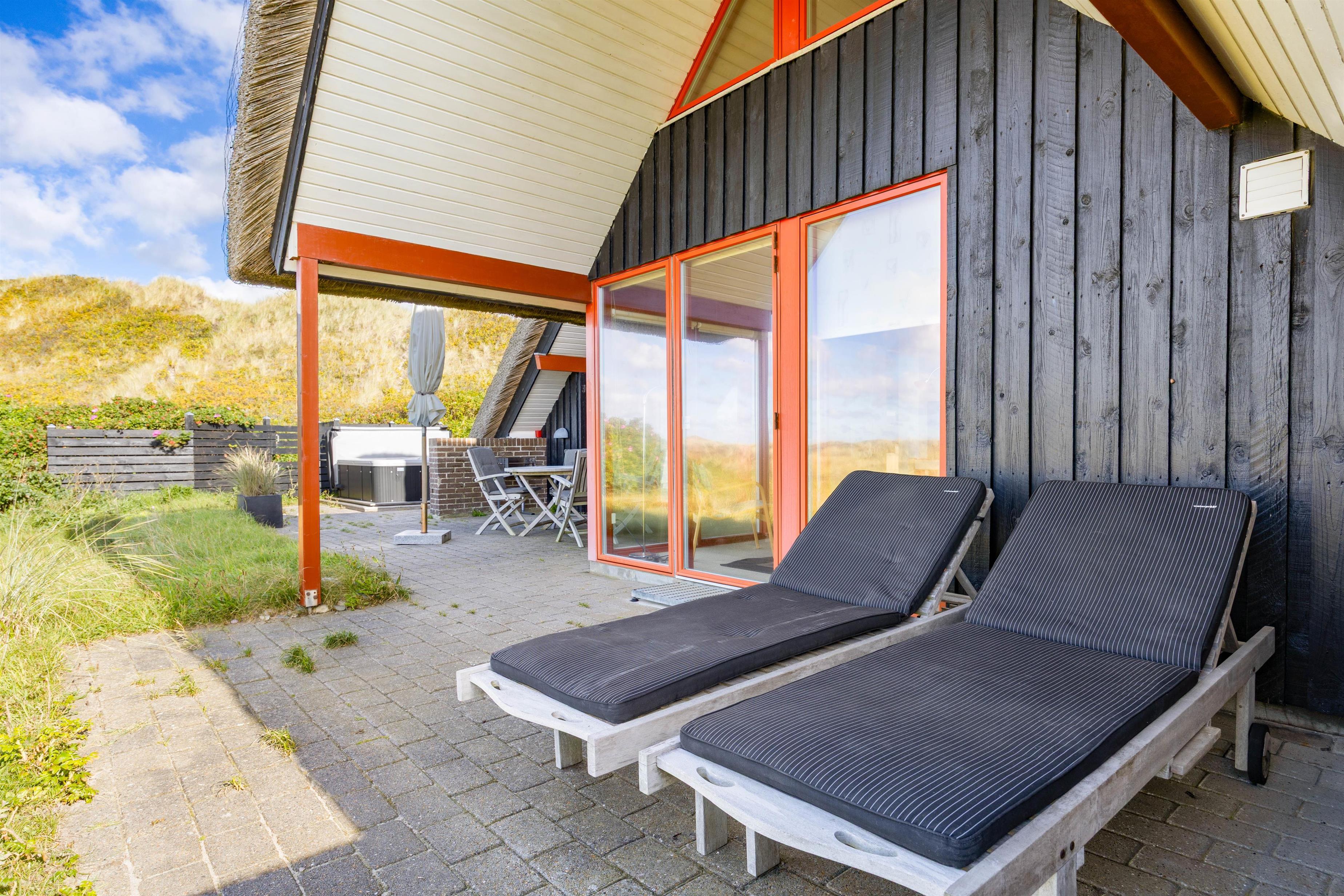 På de lune sommeraftener er sommerhusets åbne terrasse helt perfekt til hyggelige grillaftener, hvor I kan nyde udsigten til klitterne med et glas god vin, alt imens børnene leger i sandkassen, og bøfferne tilberedes på grillen. Rundt omkring sommerhuset finder I flere hyggekroge, hvor det er muligt at finde et godt sted med læ, hvor man kan nyde en stille stund.