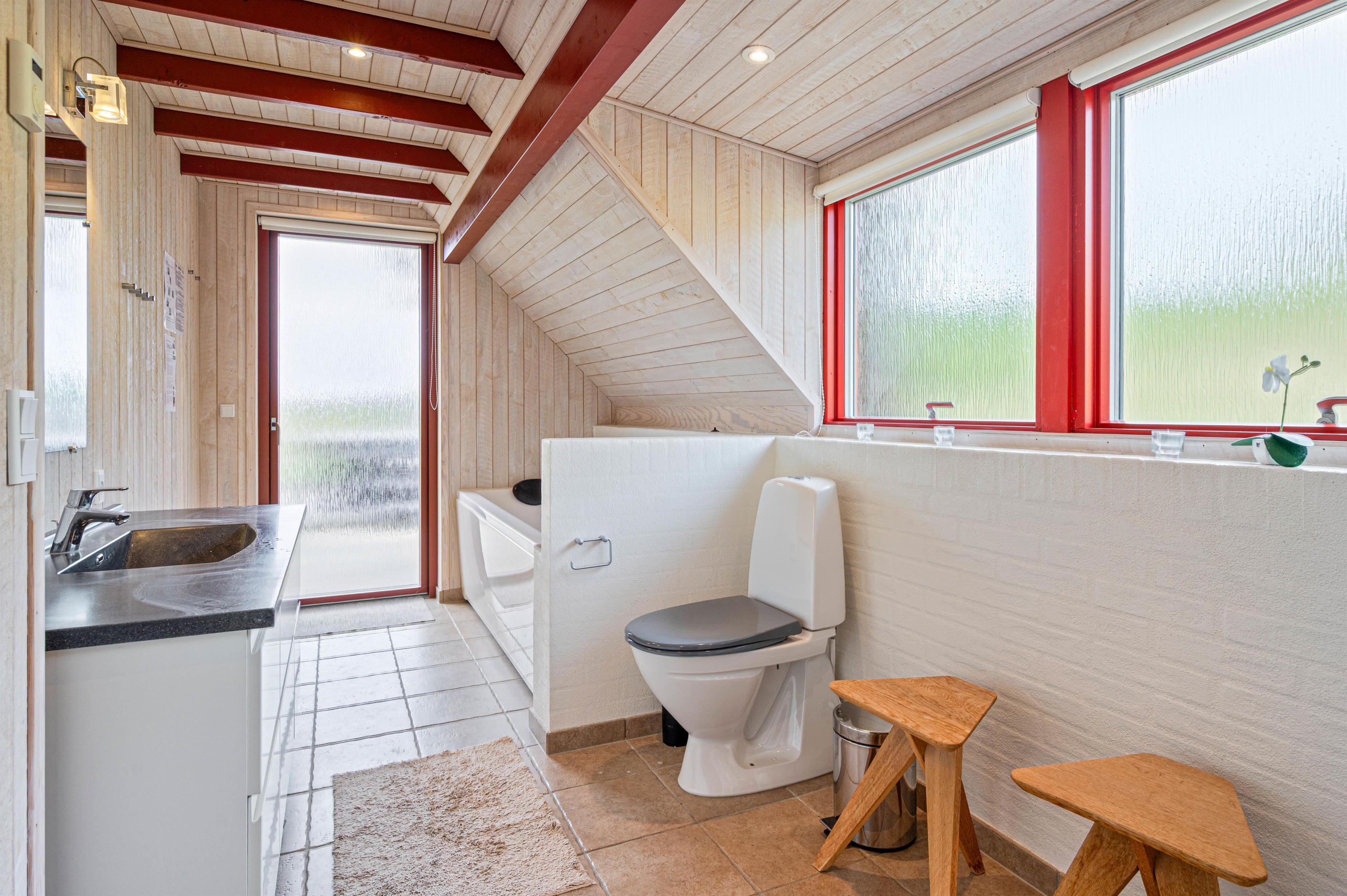 Badeværelset byder på et skønt element, nemlig et spabad. Her kan I efter en lang dag, med masser frisk luft og skønne oplevelser, afslutte dagen på bedstevis, nemlig med et lækkert boblende spabad. Derudover er der også gulvvarme på begge badeværelser, som sørger for at holde jeres fødder varme om morgenen.