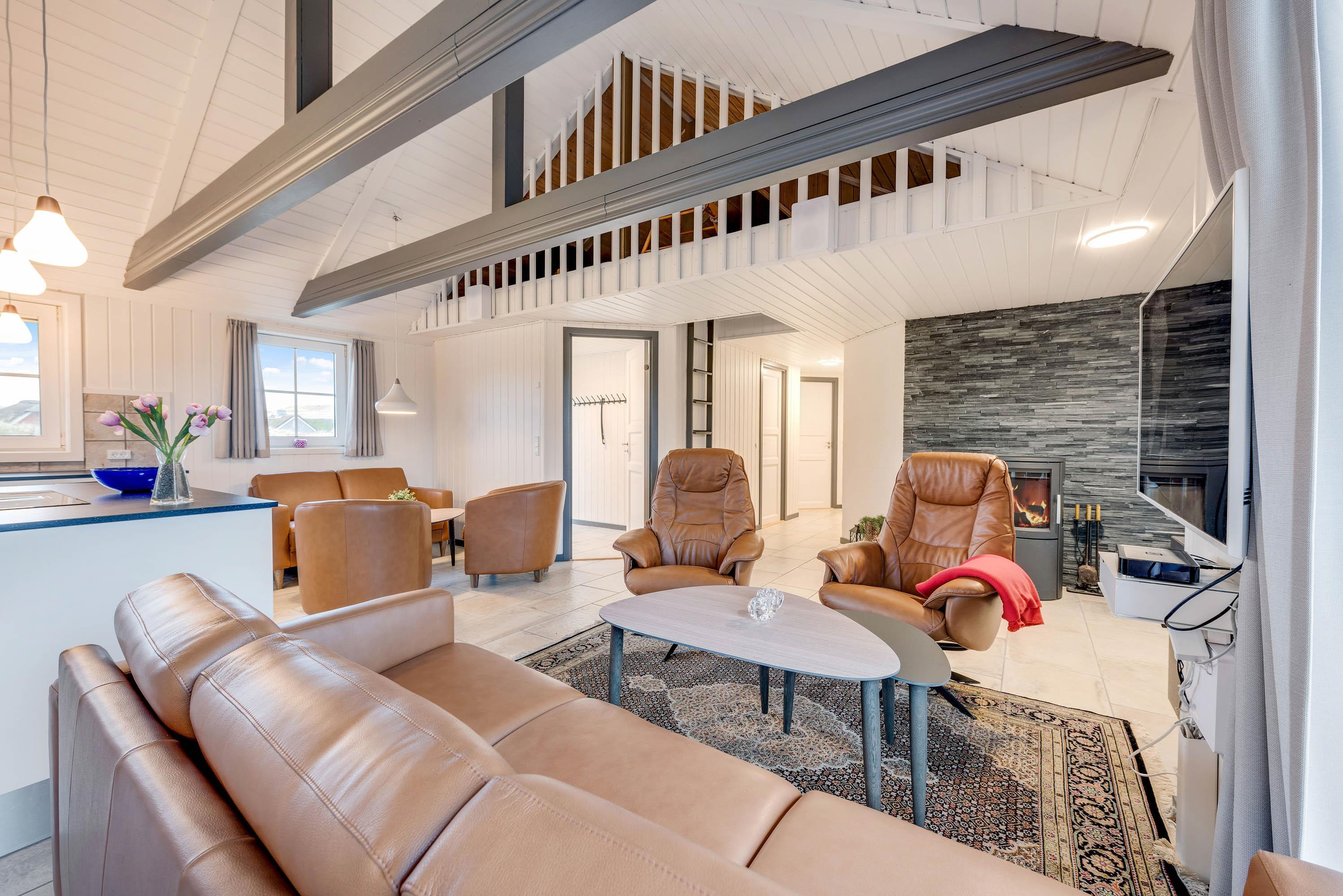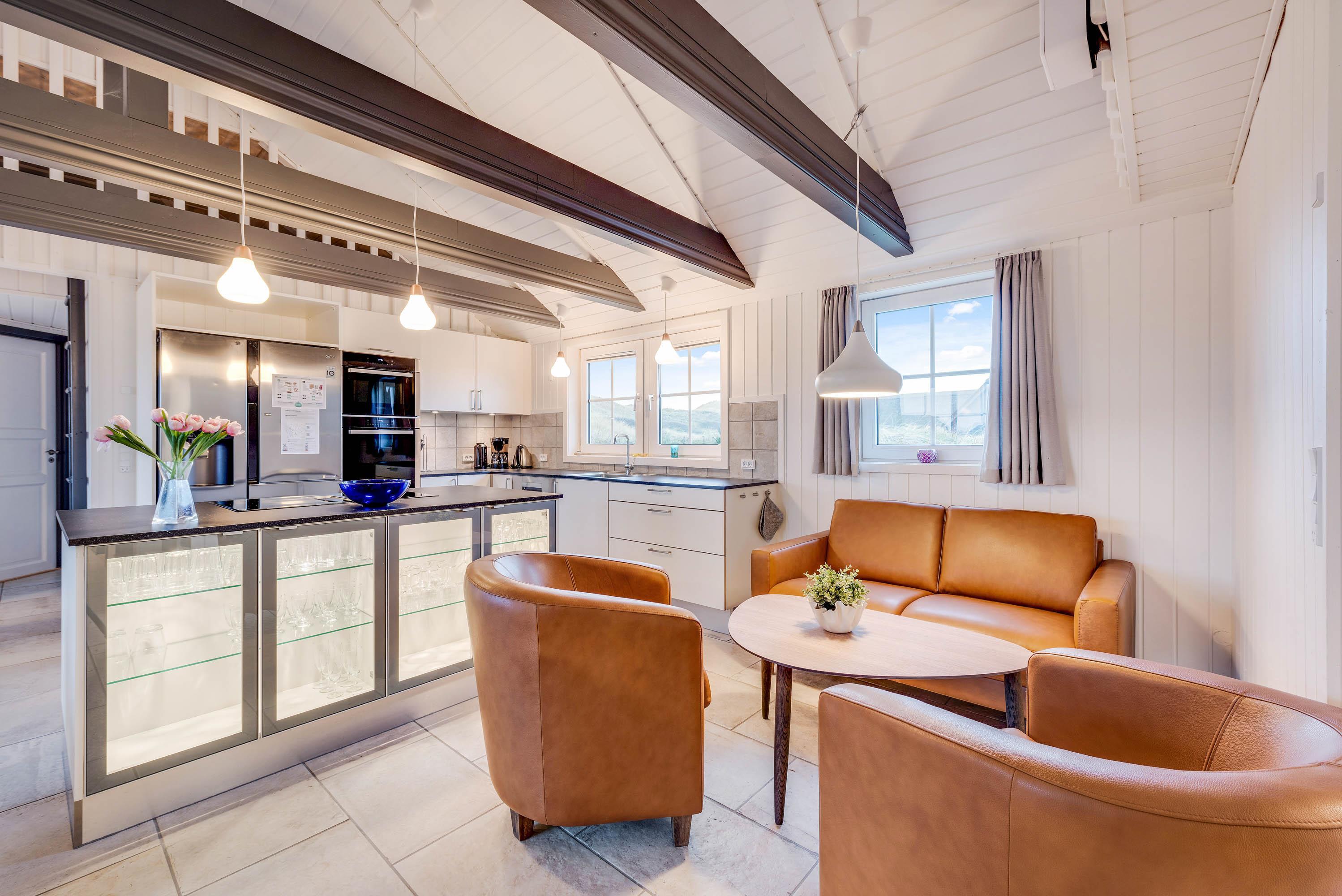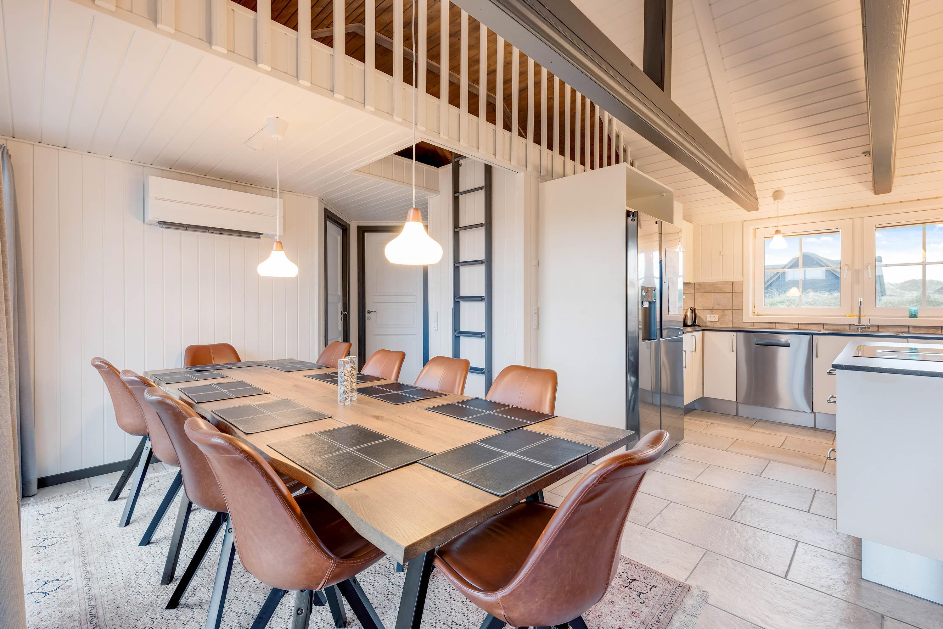 spiseafdeling og stue finder du i åben forbindelse i husets centrum. Her kan I tilbringe mange hyggelige timer sammen. I forbindelse med stuen er der 2 store brugbare hemse. Huset er velegnet til flere familier, der ønsker at holde en hyggelig ferie sammen.