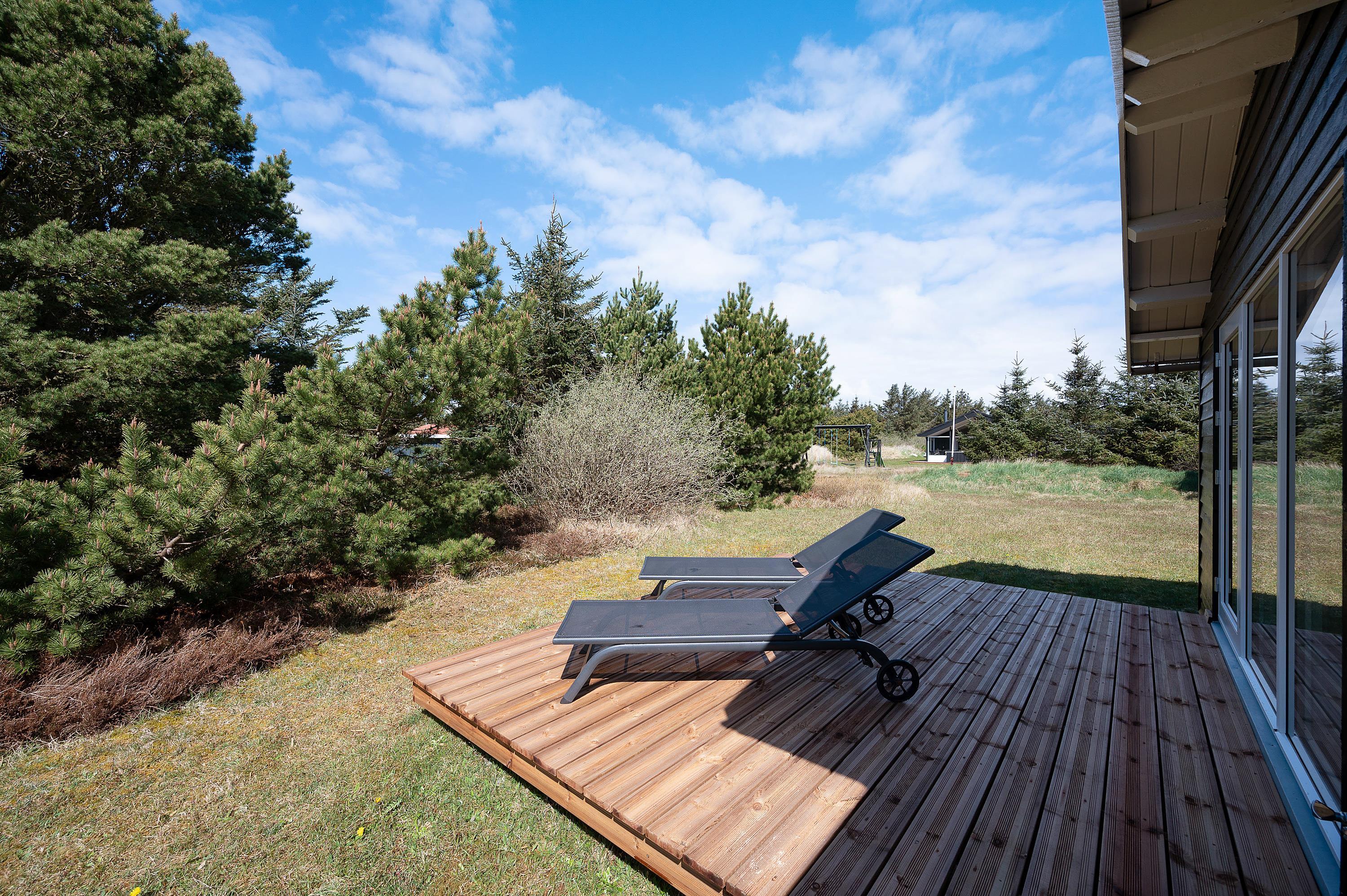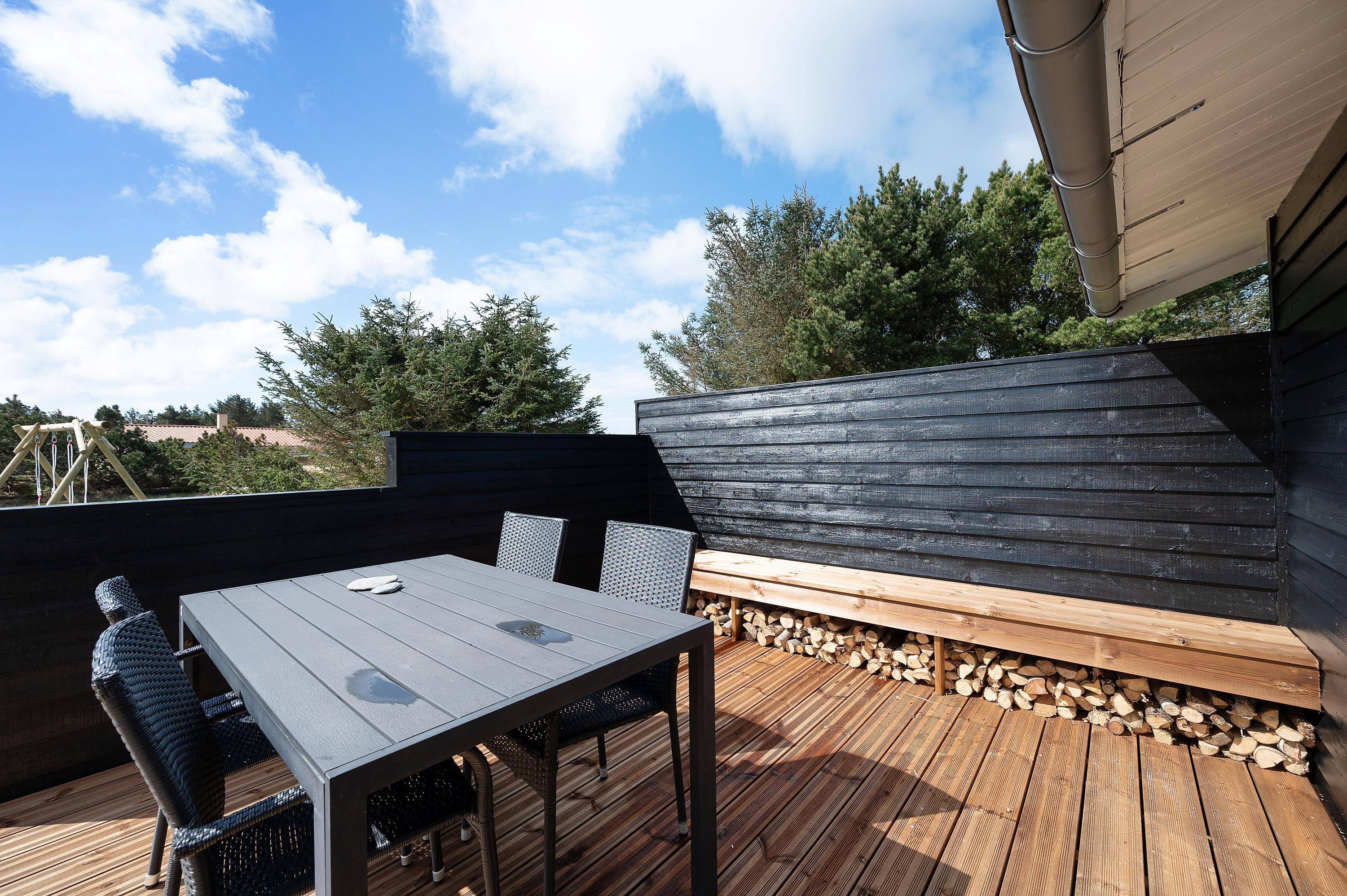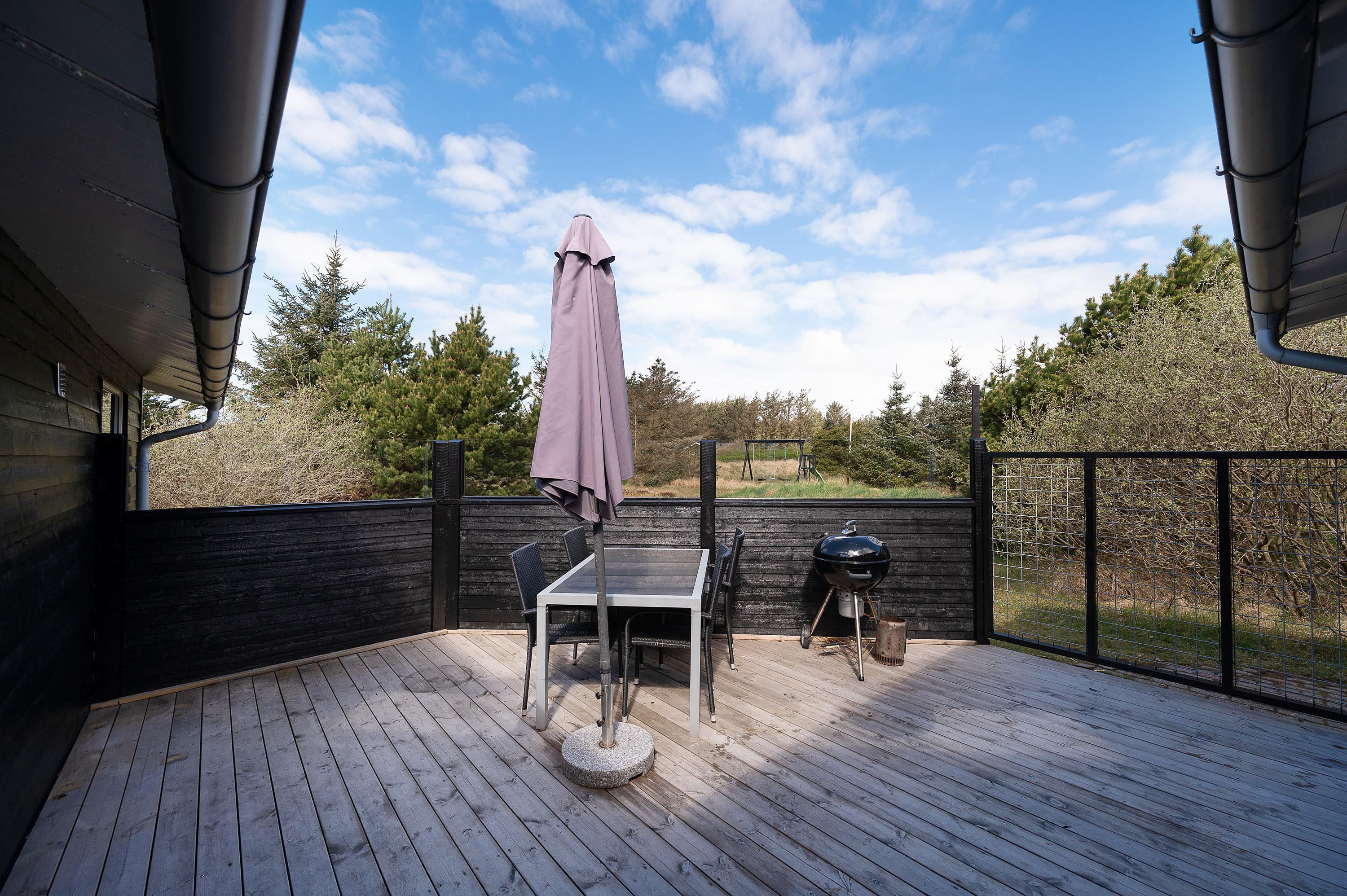 Feriehuset har også en lukket terrasse mod nord og en lille åben terrasse mod vest. I har altså god mulighed for at finde en god plads at nyde ferien fra på de 3 gode terrasser. Om aftenen kan I tænde op i grillen og samles om en lækker middag på én af terrasserne.