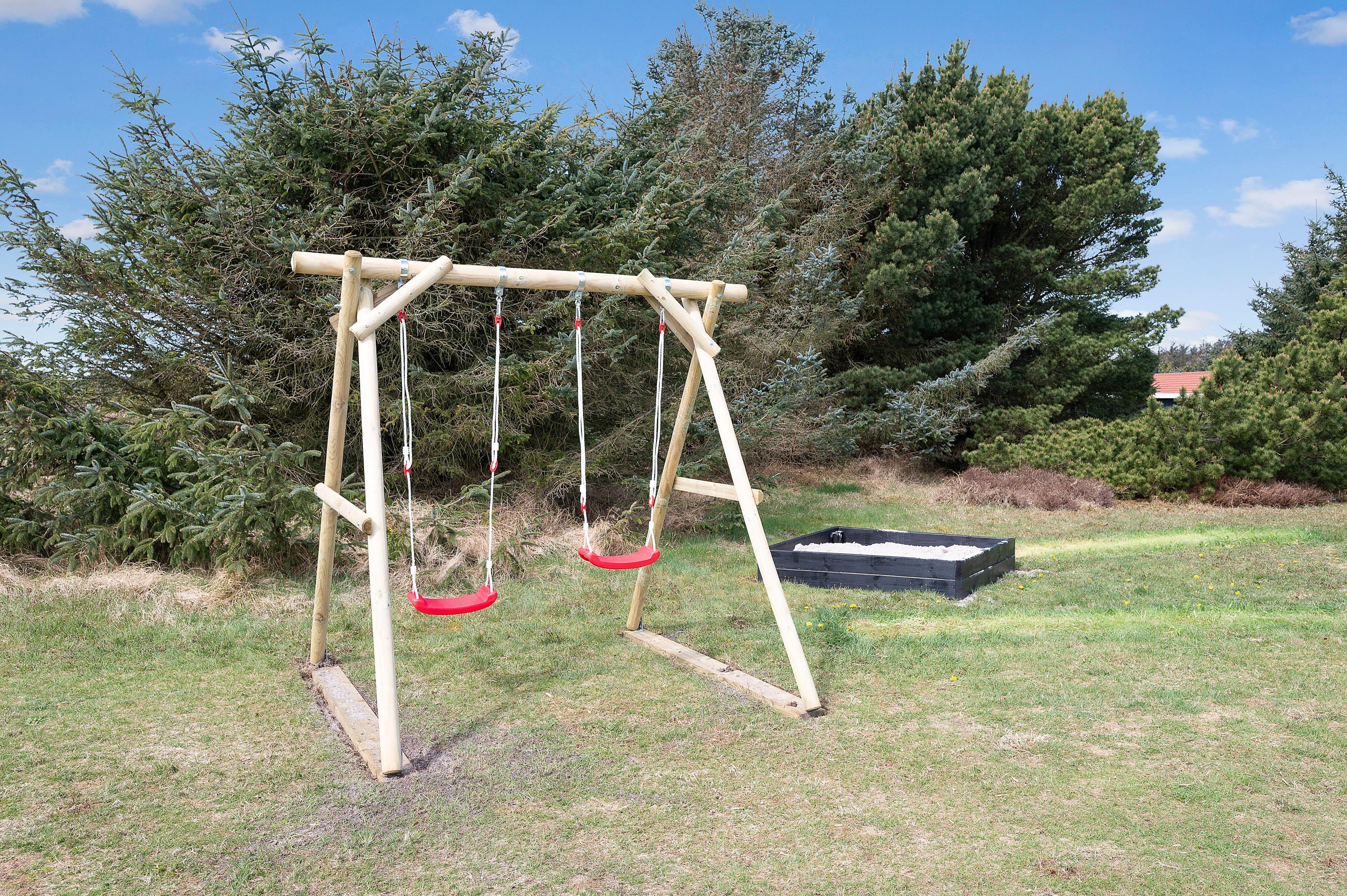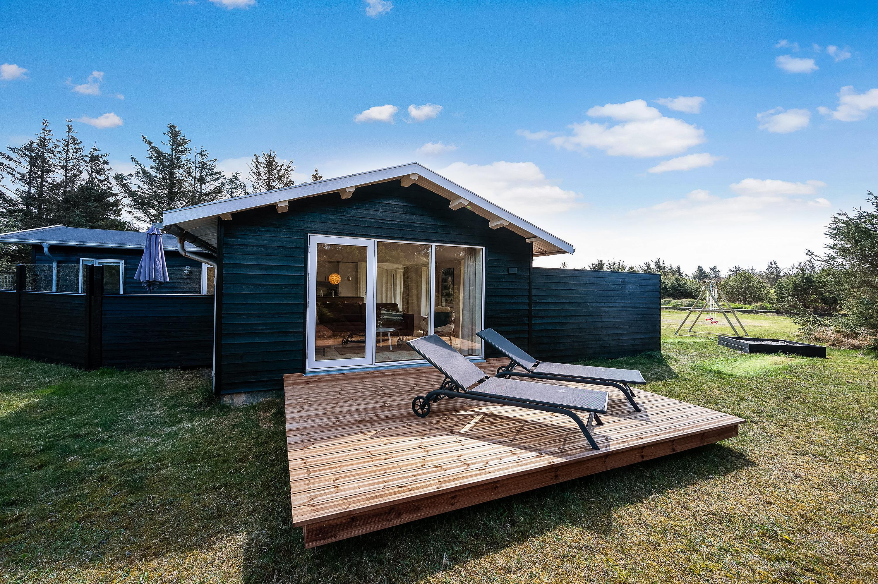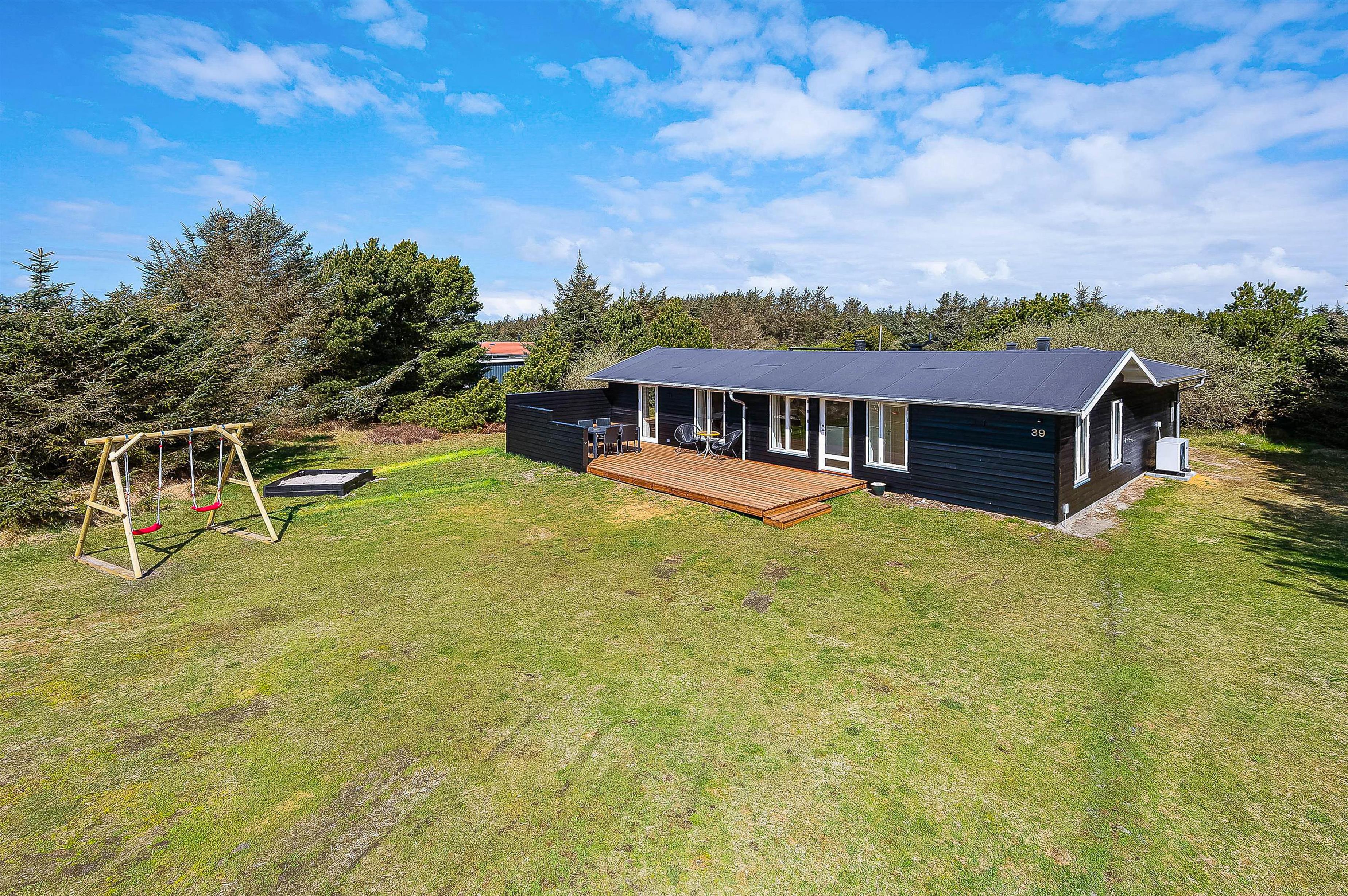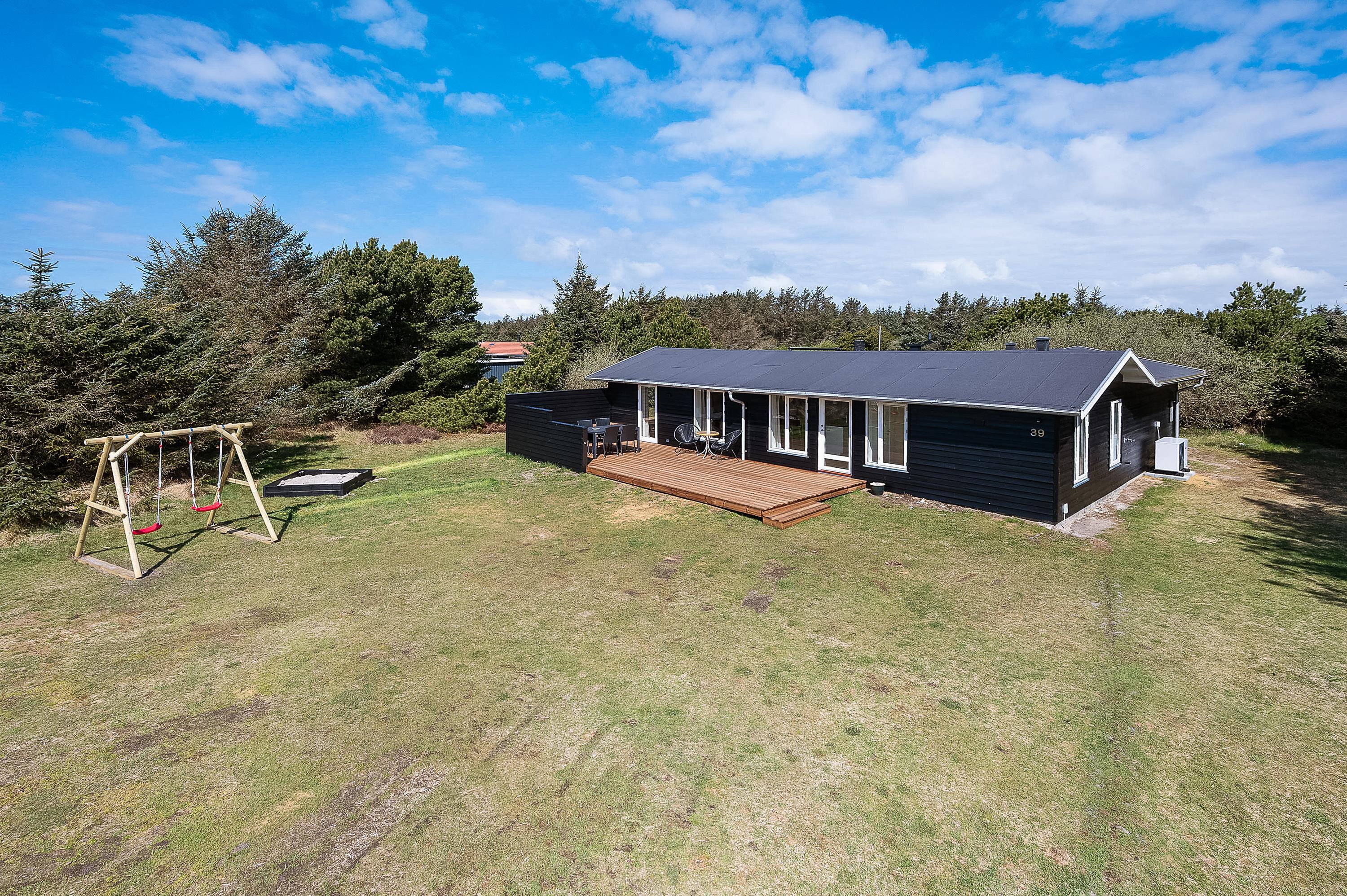 Sommerhuset har hele 3 gode terrasser. På sommerhusets sydside har I en afskærmet terrasse, hvor I kan nyde solen det meste af dagen. Fra denne terrasse kan I også se ud til haven, hvor hunden kan snuse rundt, og børnene har god plads at lege på – og så er der også gyngestativ og sandkasse til dem.