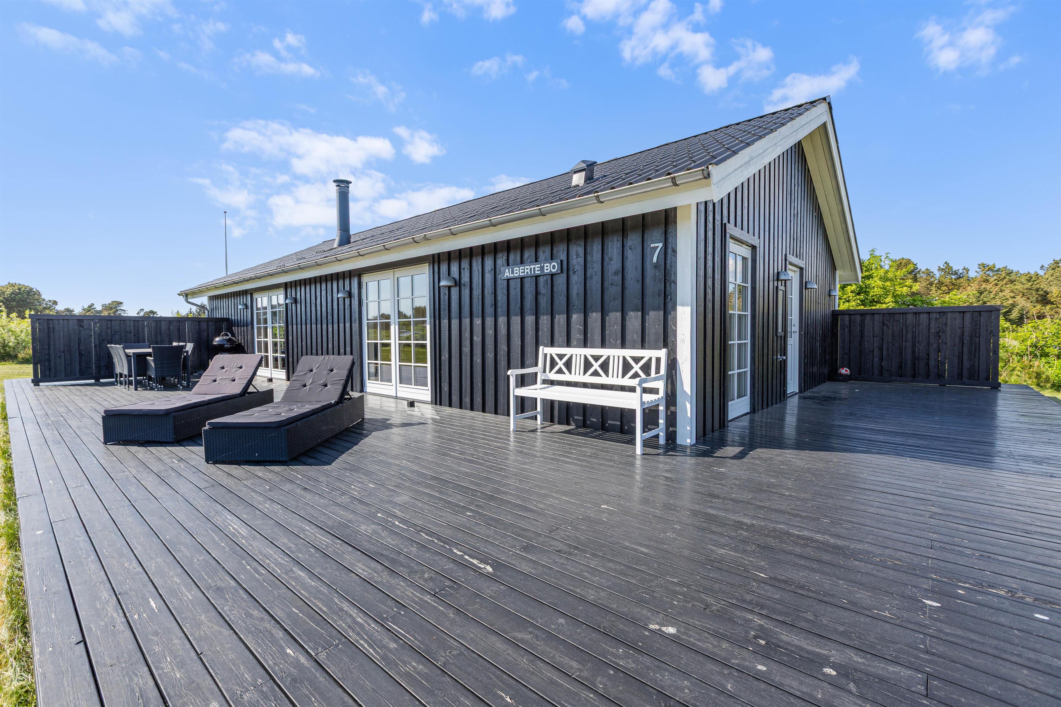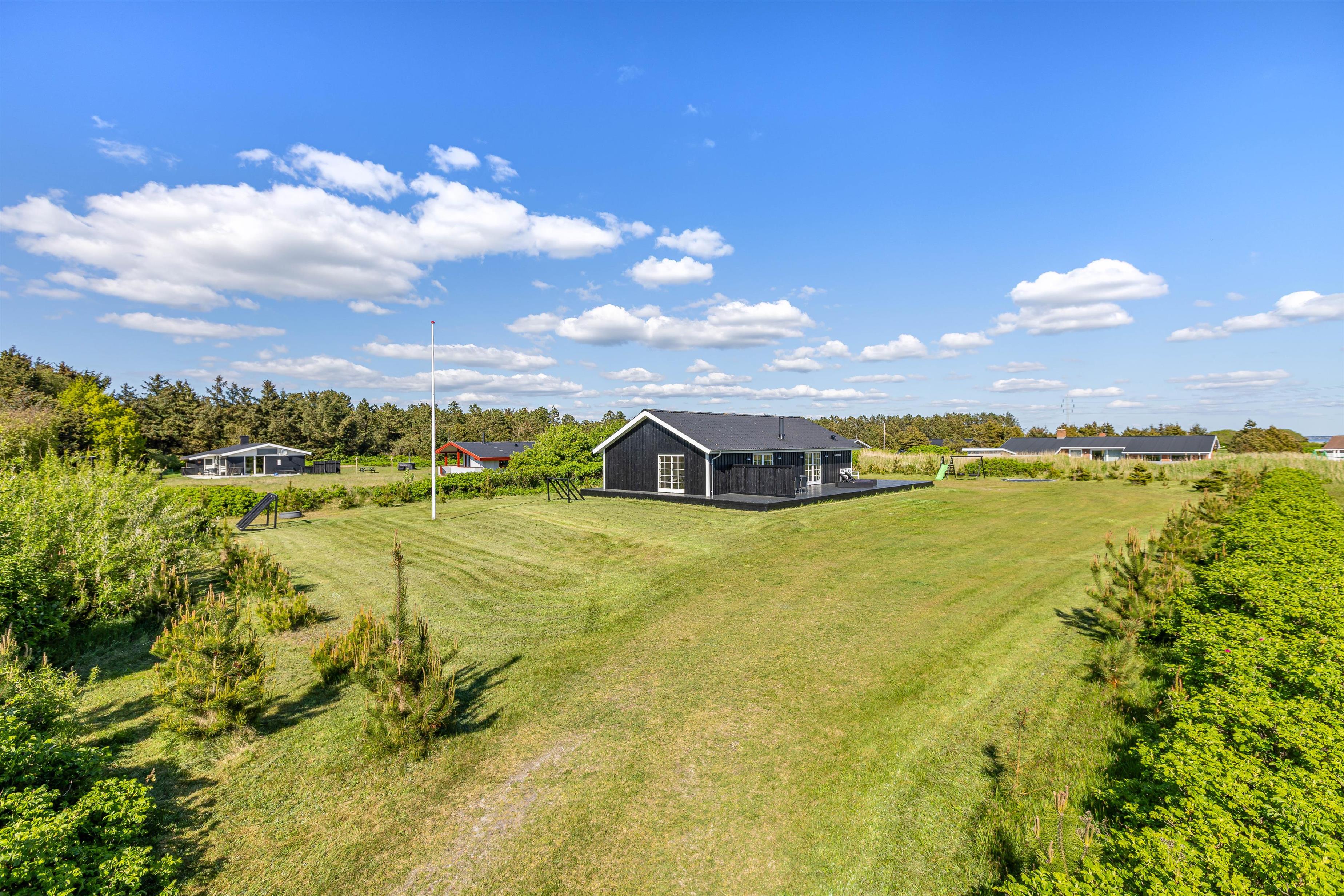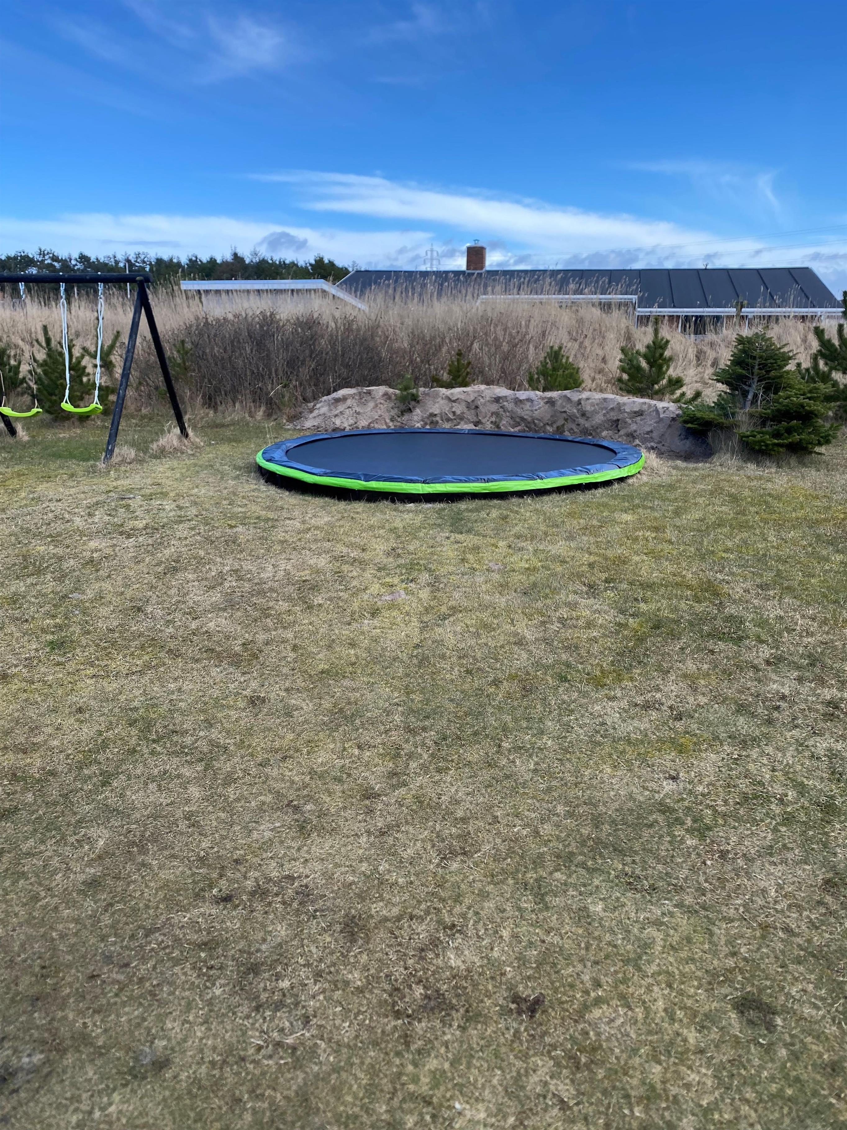 Den lækre træterrasse strækker sig hele vejen rundt om huset. Her kan I følge solen rundt i liggestolene. Sydsiden af terrassen er afskærmet, så I kan sidde og nyde jeres lækre grillmad i læ. Børnene behøver på ingen måde at kede sig i ulvetimen. På den store græsplæne er der både gyngestativ med rutsjebane, trampolin og fodboldmål. Masser af plads til at boltre sig på for børn og barnlige sjæle.