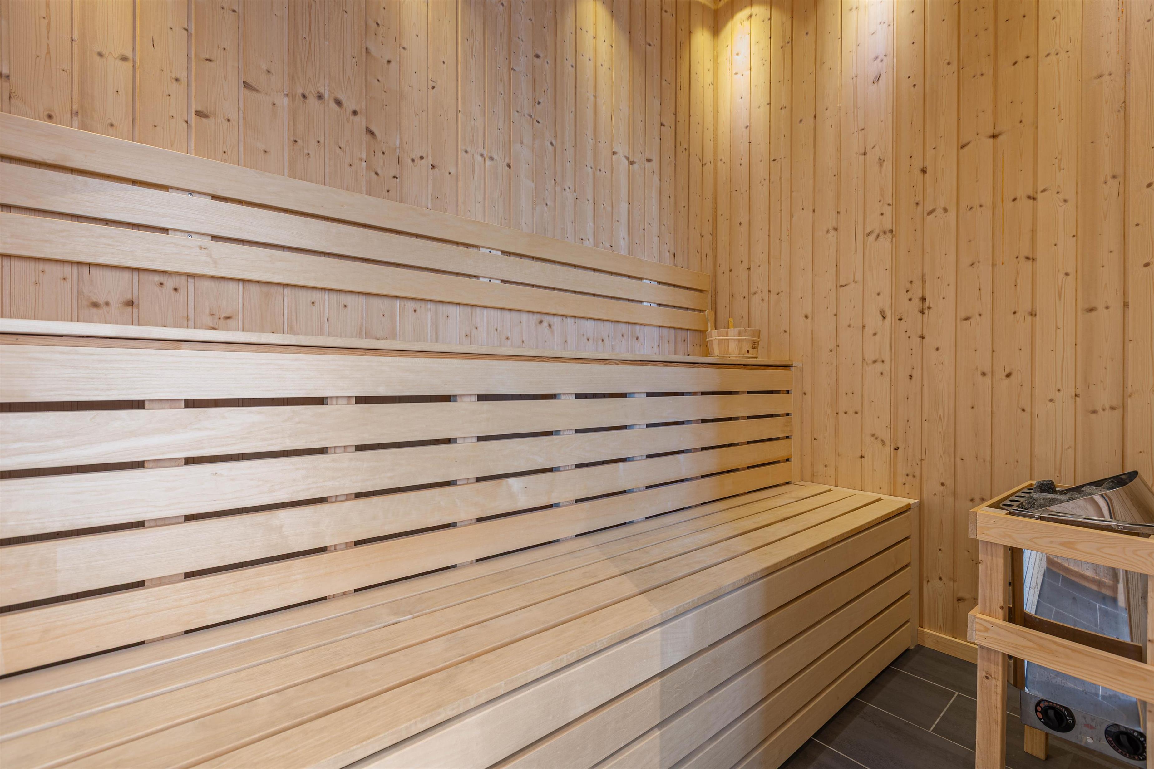 Badeværelset er et sandt wellnessområde. Her kan I glemme hverdagens stress og jag, mens I tager jer et velfortjent bad i spabadet eller nyder husets sauna. De mørke fliser står i kontrast til de lyse møbler i badeværelset og giver dermed et flot og moderne sammenspil i det lækre wellnessområde.