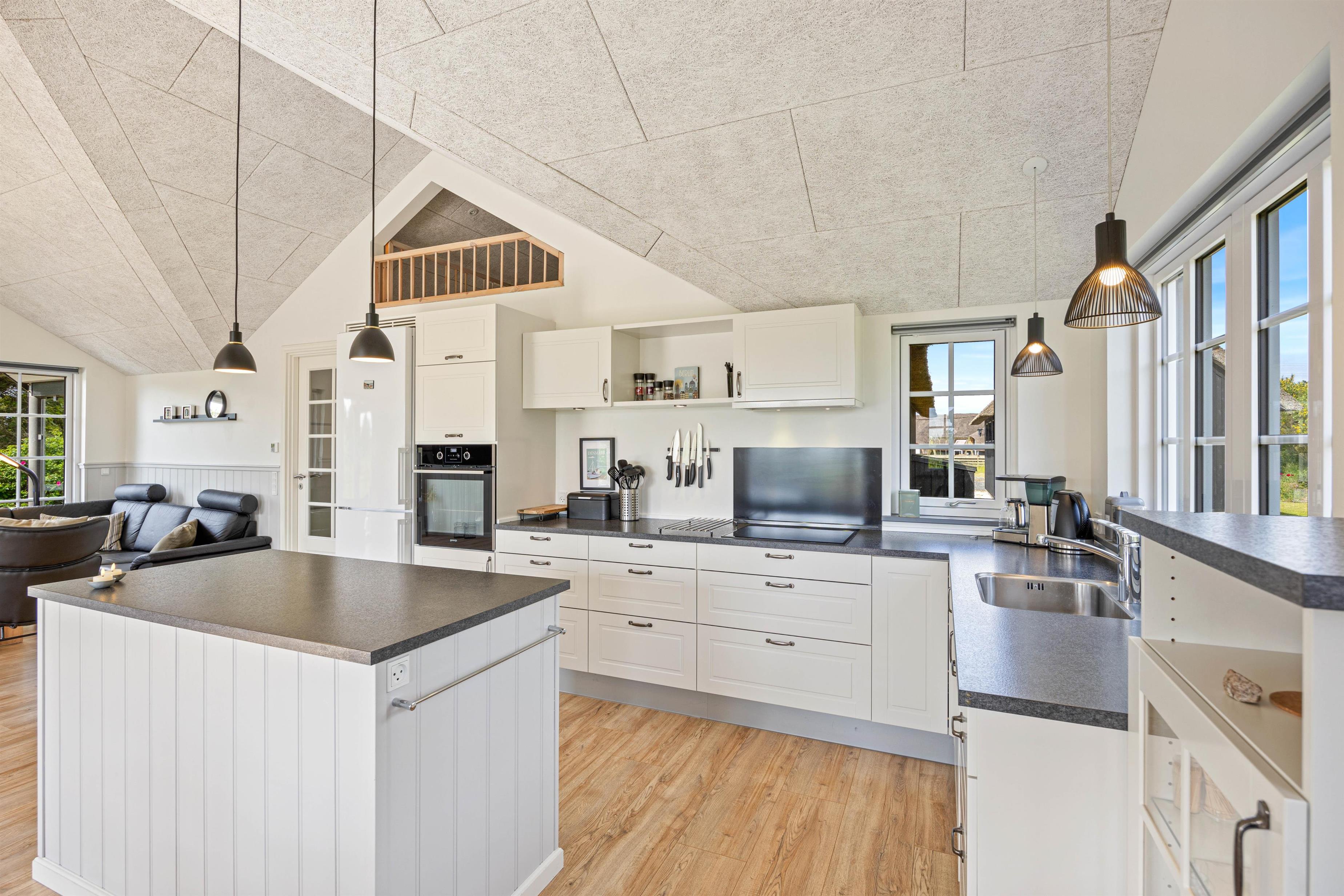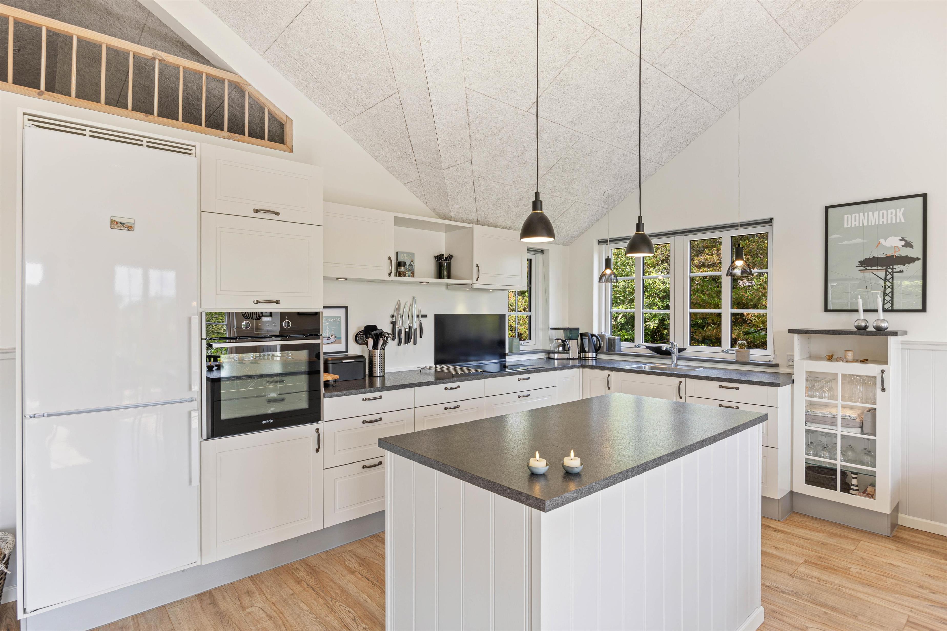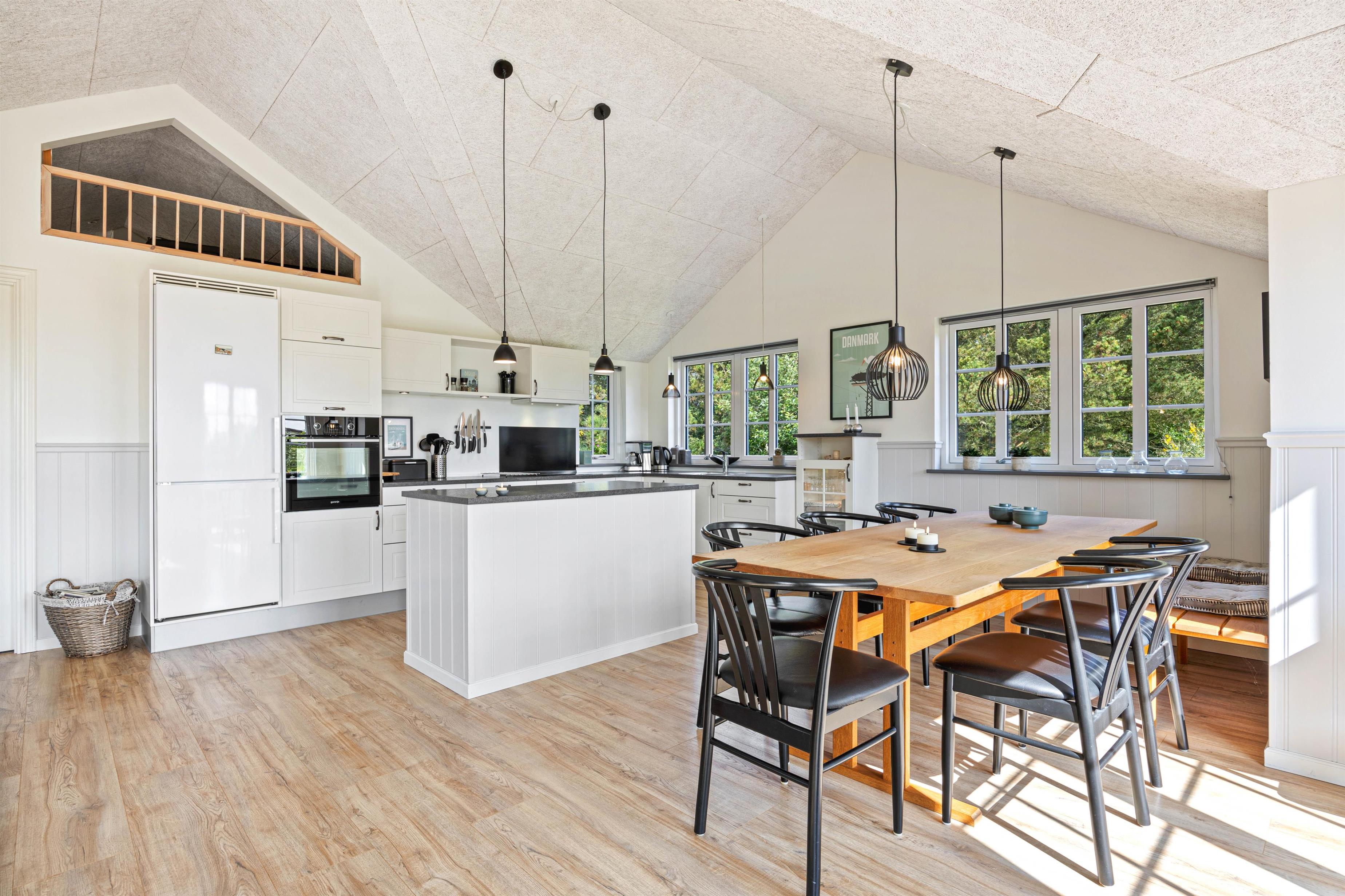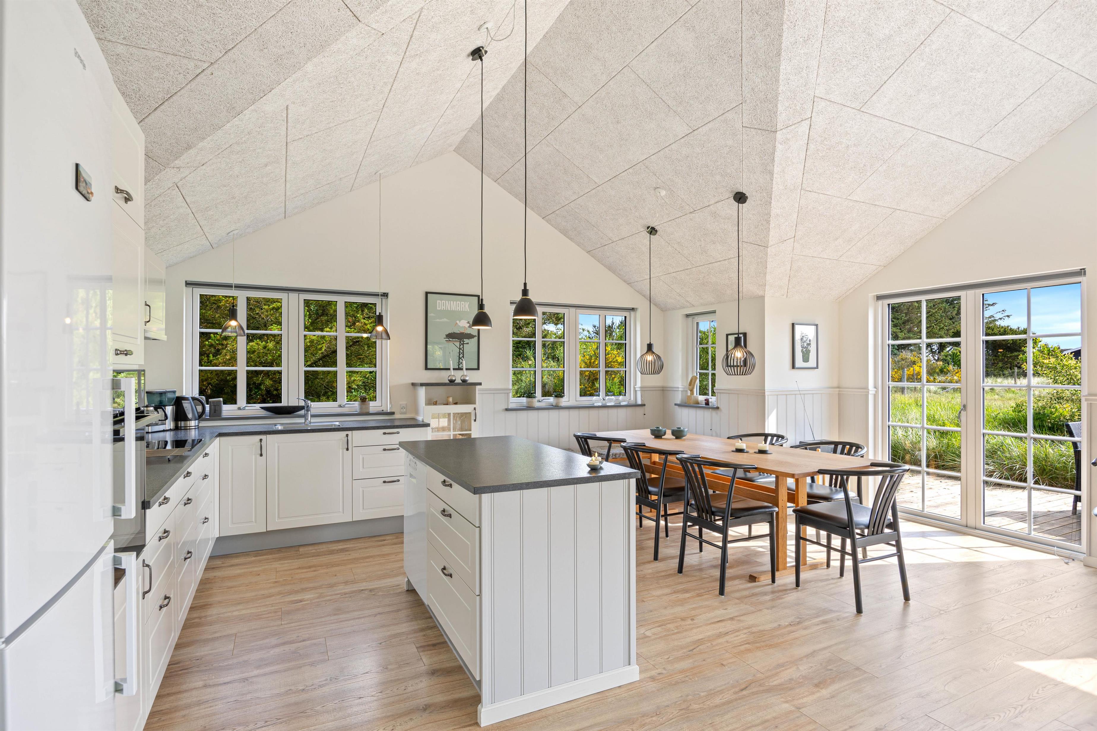 Dette hyggelige sommerhus har plads til 6 personer og har en dejlig atmosfære med højt til loftet. Det rummelige køkken-alrum er veludstyret med opvaskemaskine, ovn, mikrobølgeovn og en køkkenø, der indbyder til fælles madlavning.