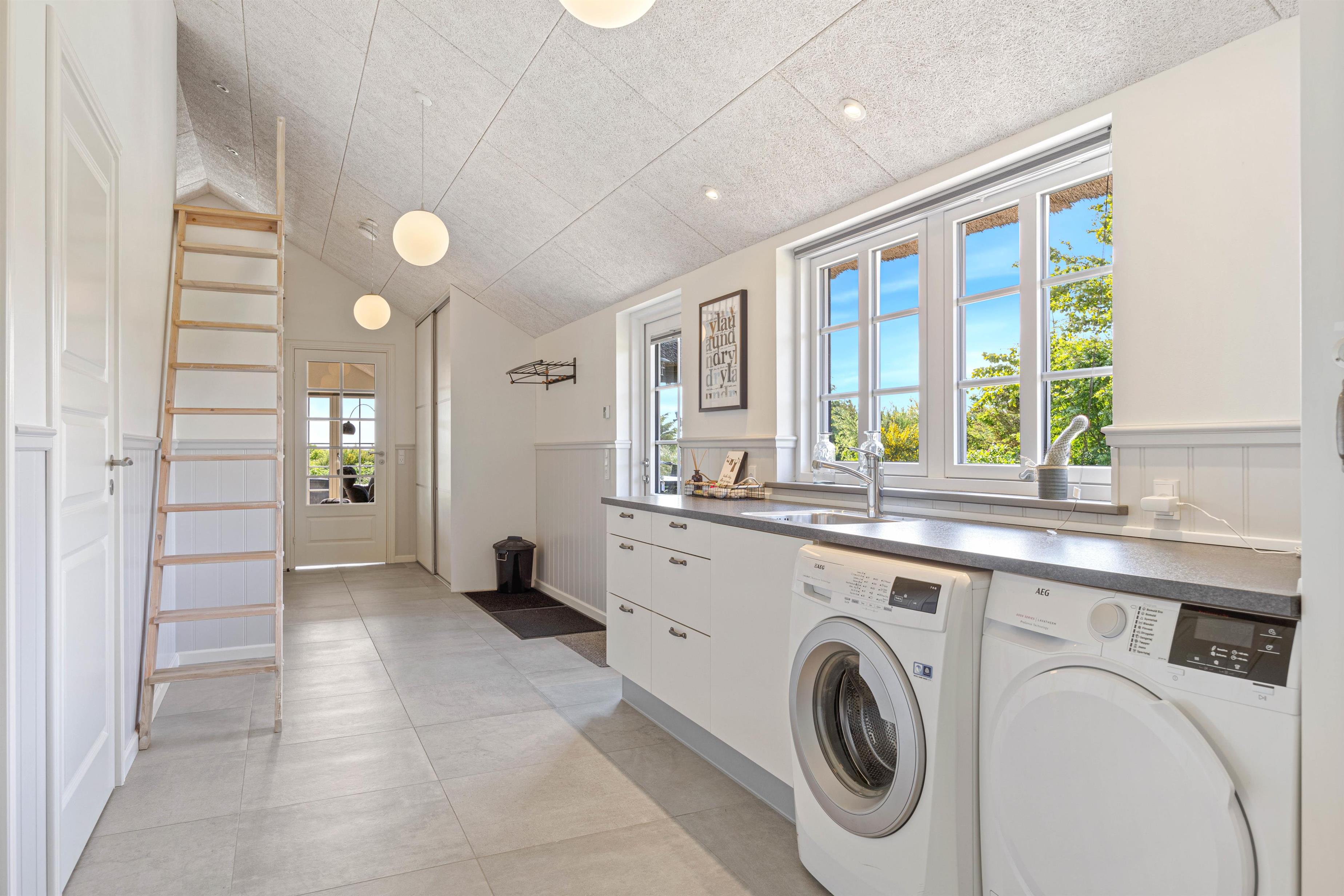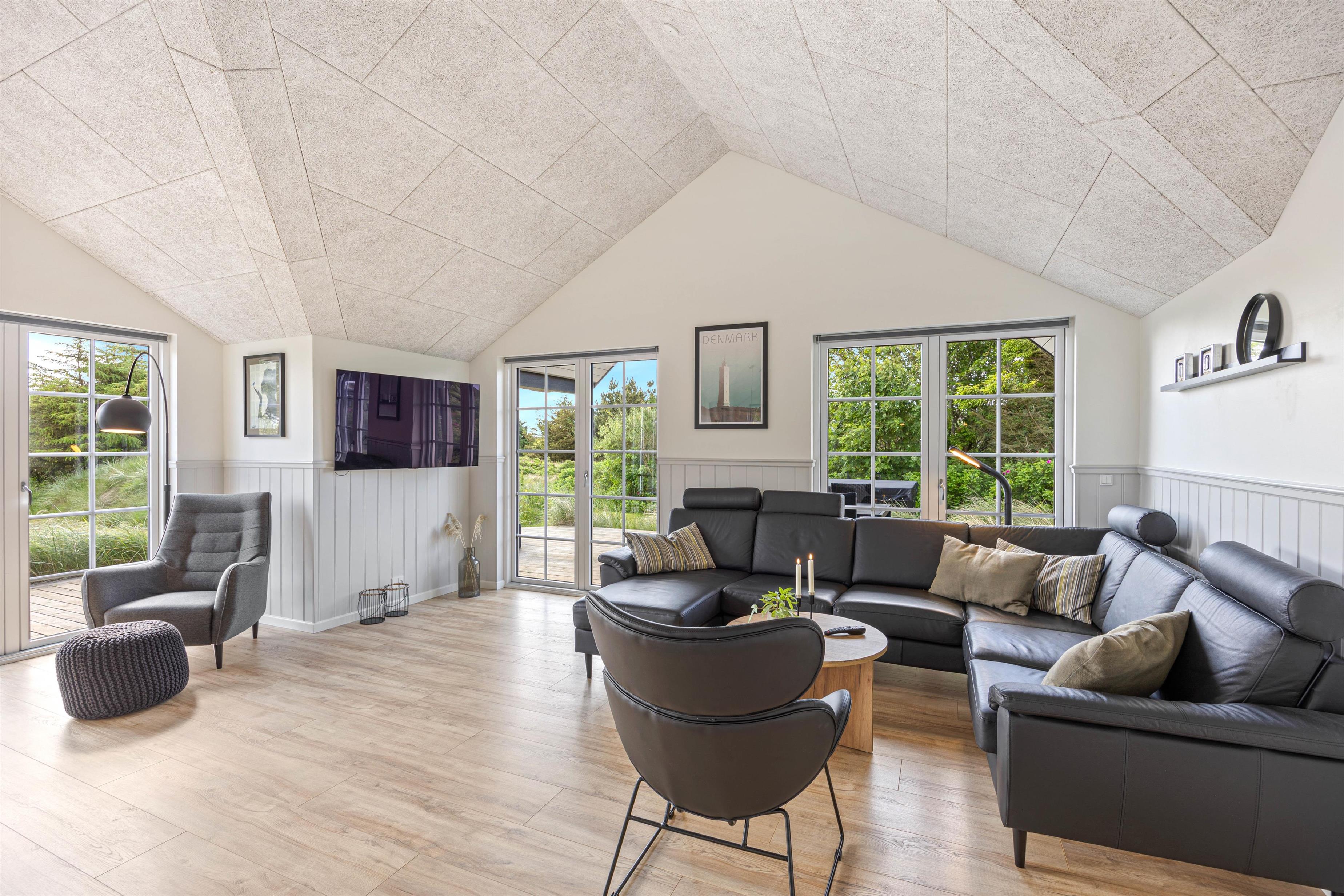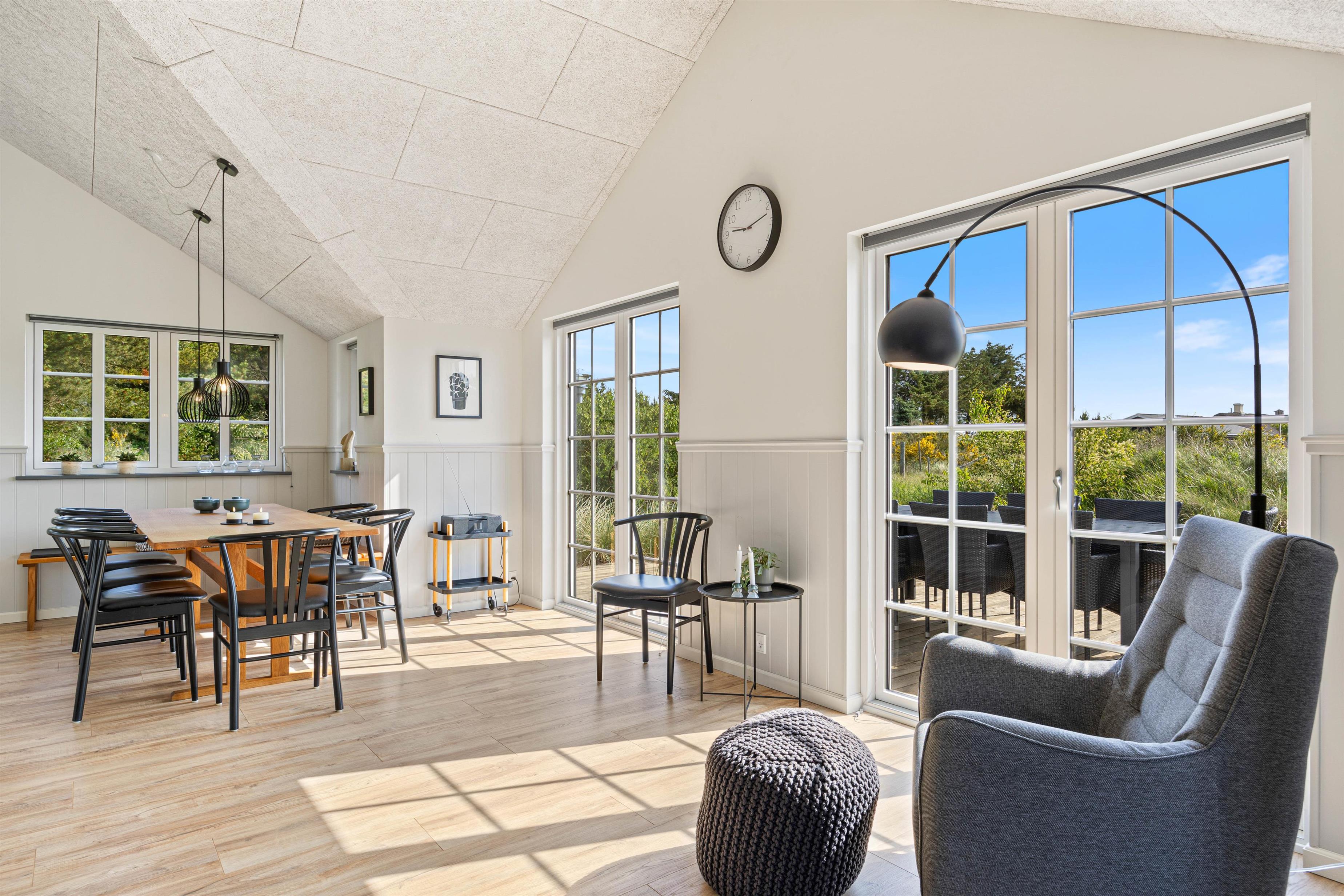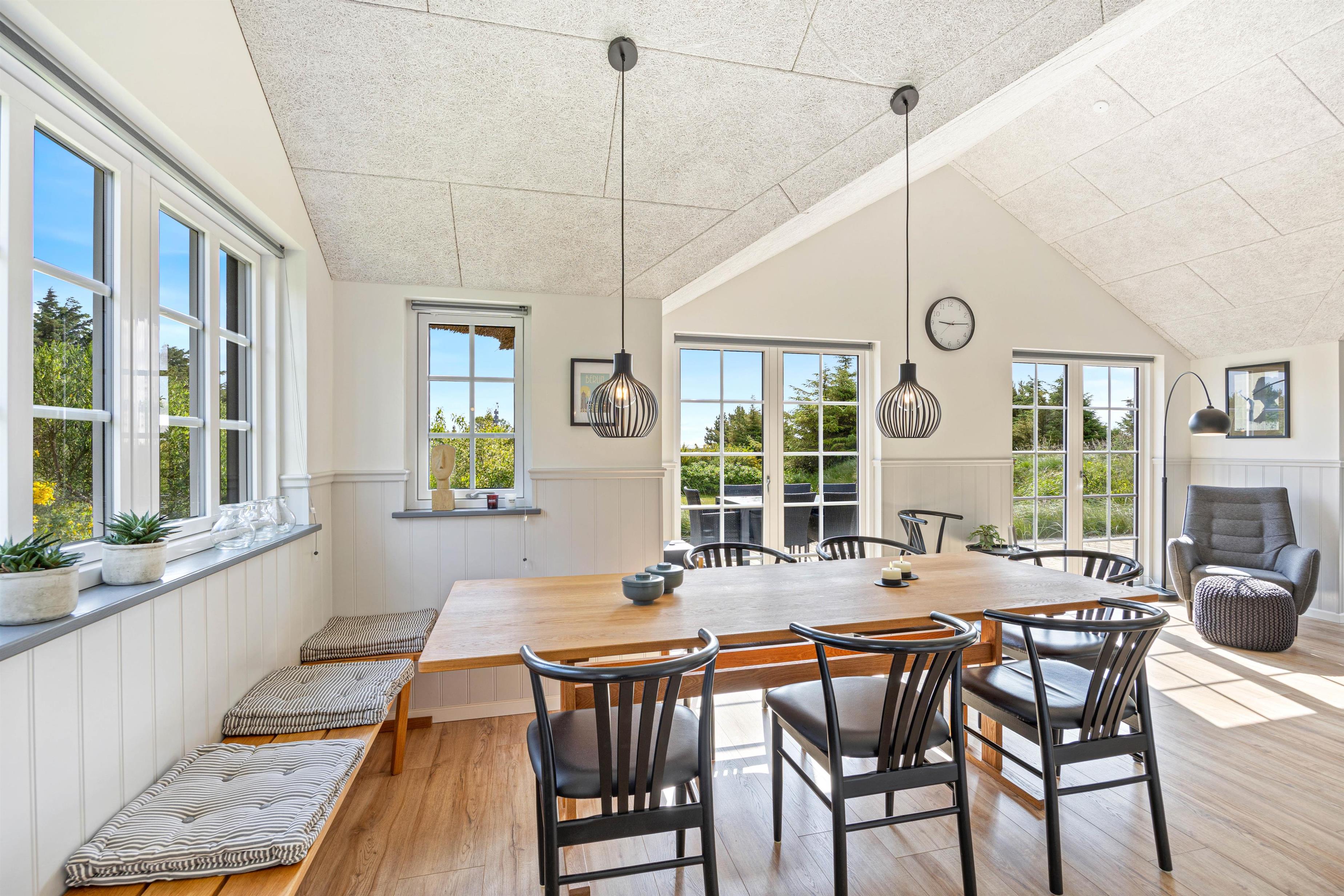 Dette hyggelige sommerhus har plads til 6 personer og har en dejlig atmosfære med højt til loftet. Det rummelige køkken-alrum er veludstyret med opvaskemaskine, ovn, mikrobølgeovn og en køkkenø, der indbyder til fælles madlavning.
