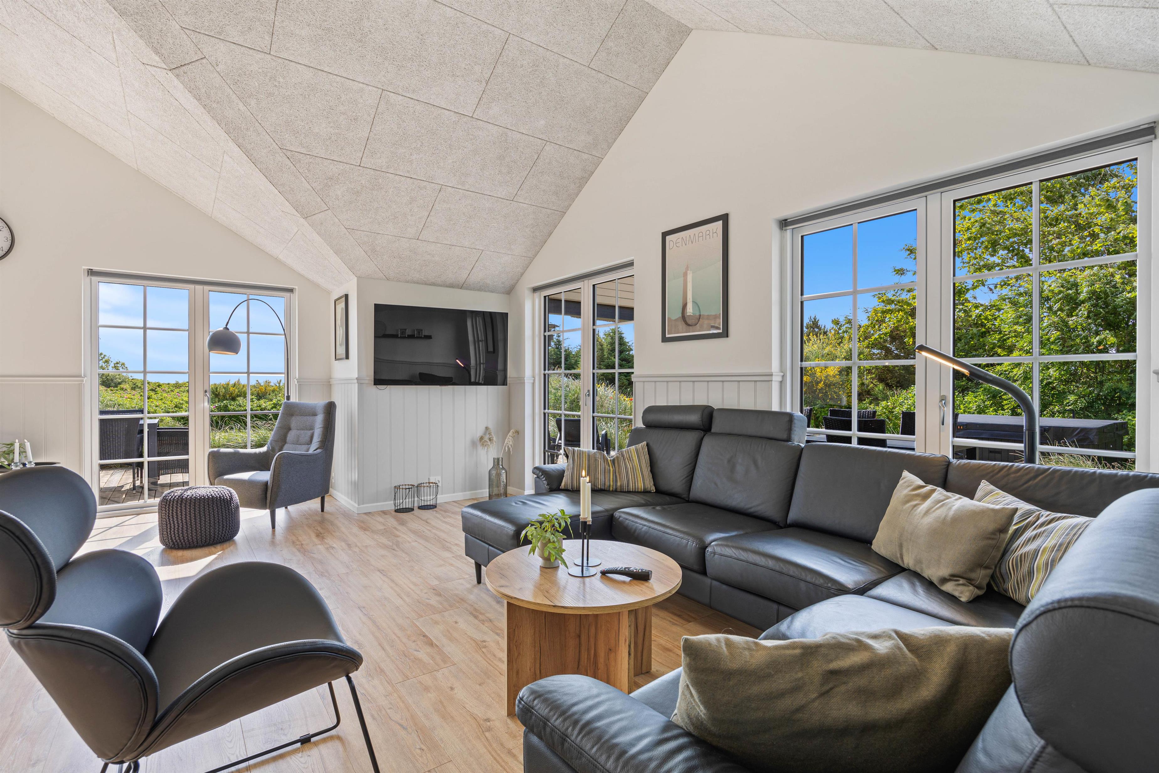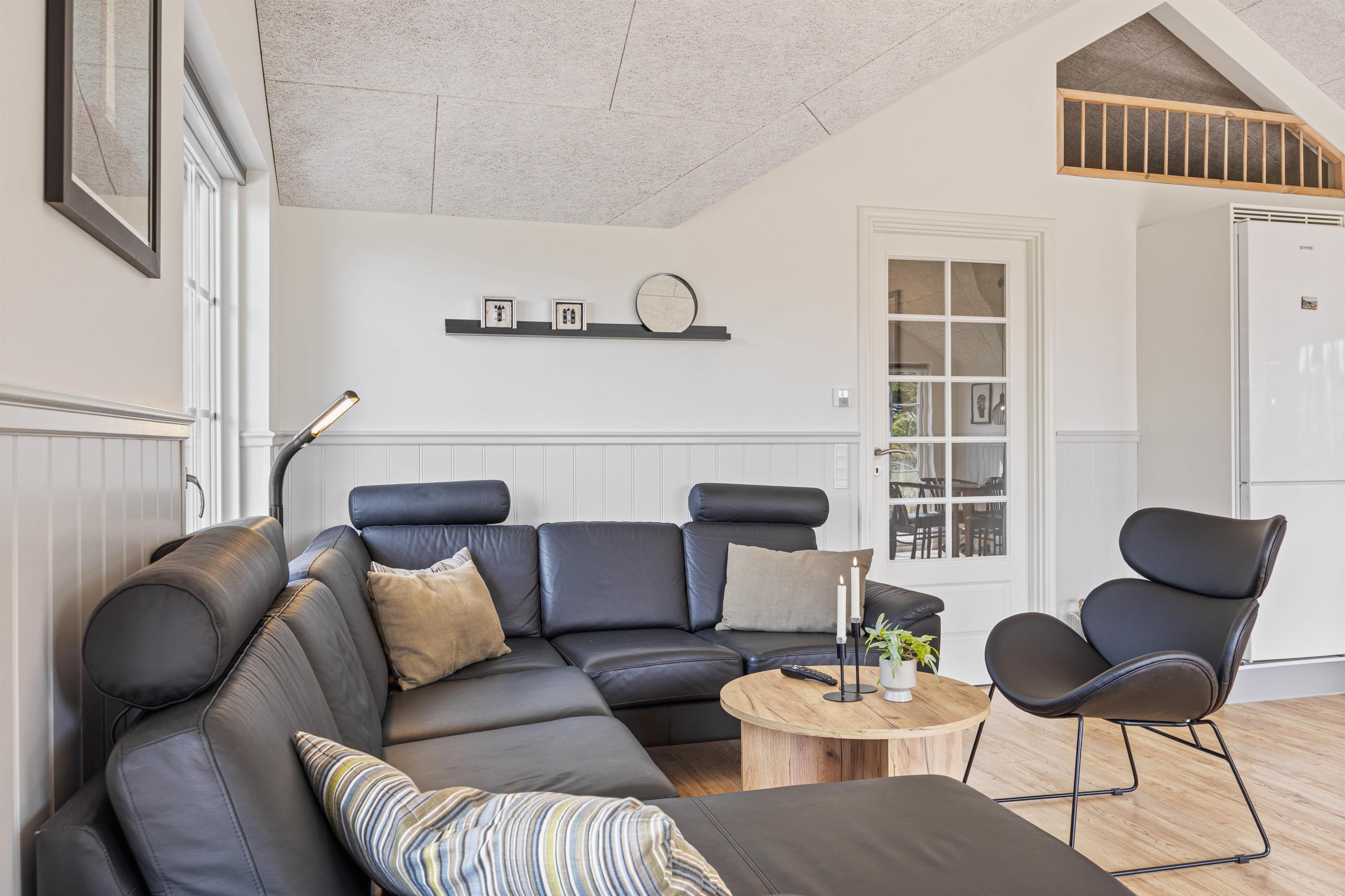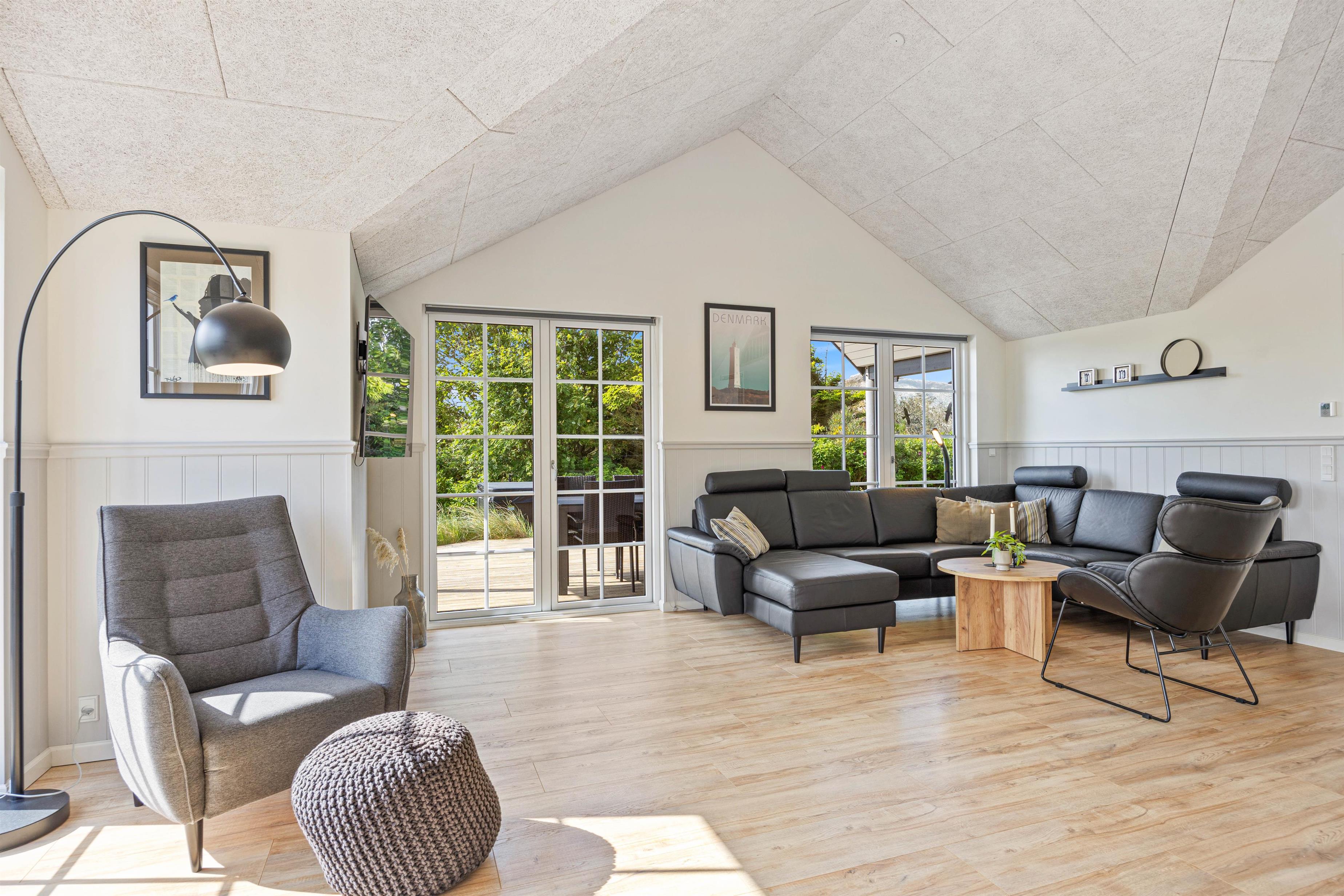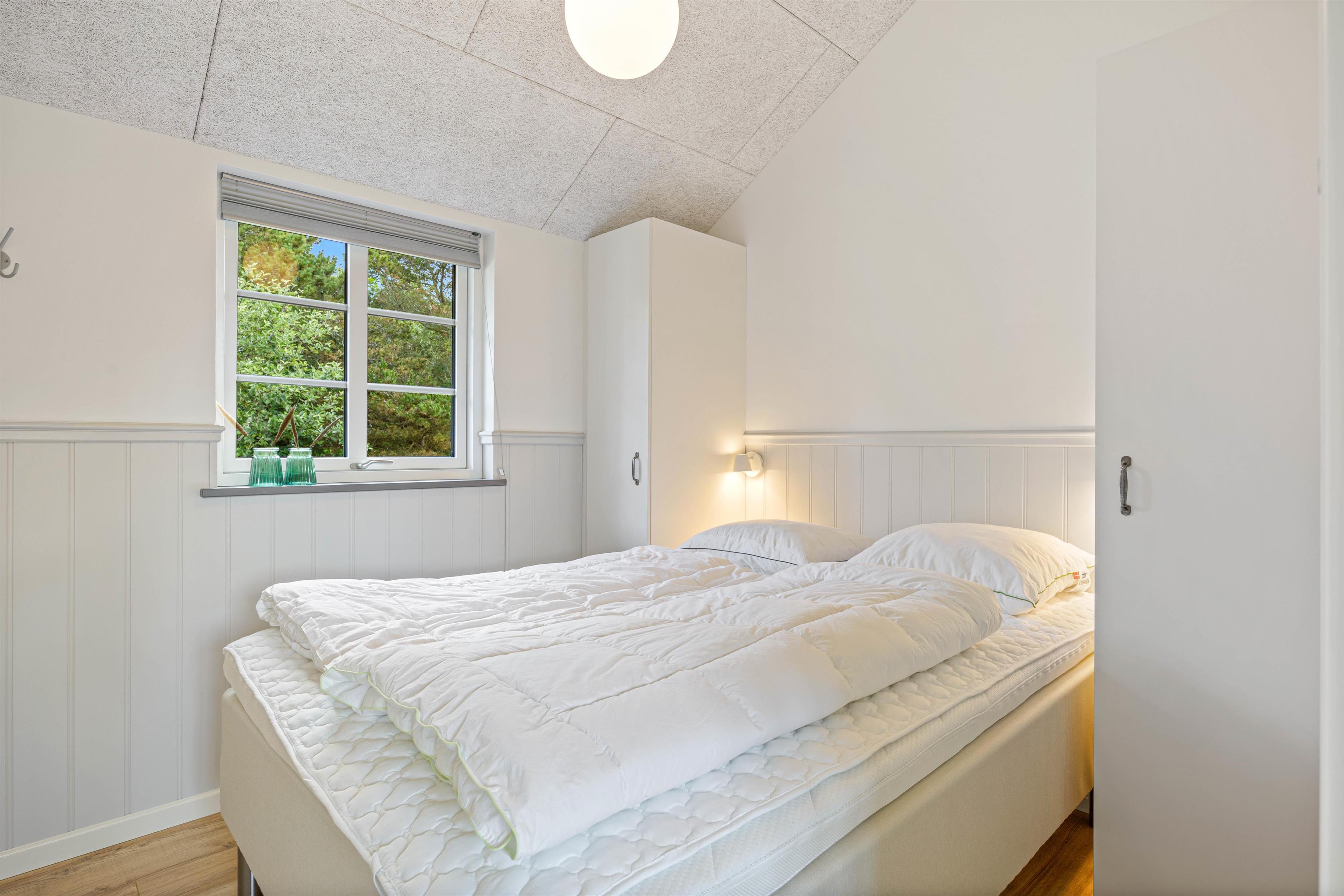 Dette hyggelige sommerhus har plads til 6 personer og har en dejlig atmosfære med højt til loftet. Det rummelige køkken-alrum er veludstyret med opvaskemaskine, ovn, mikrobølgeovn og en køkkenø, der indbyder til fælles madlavning.