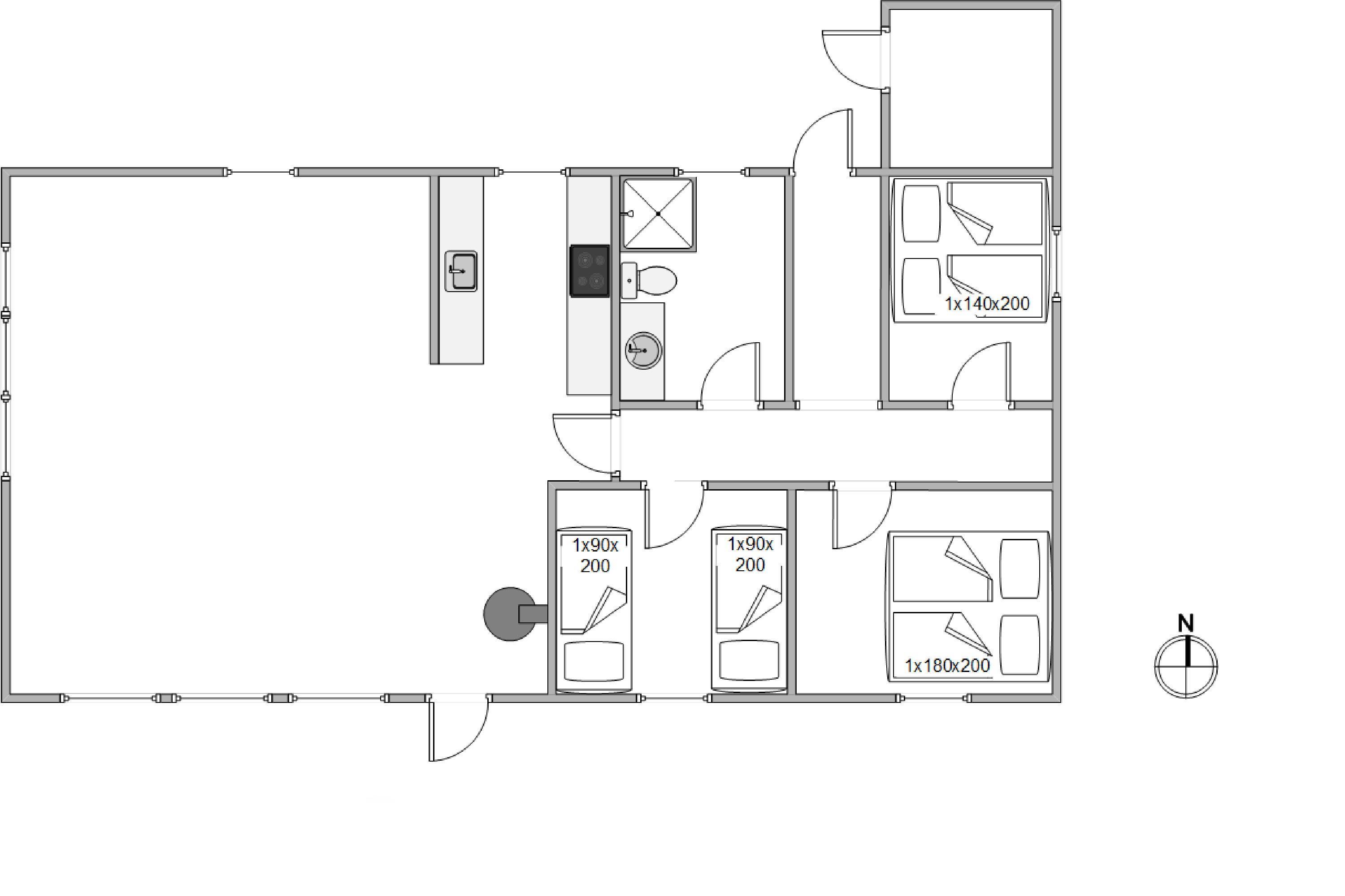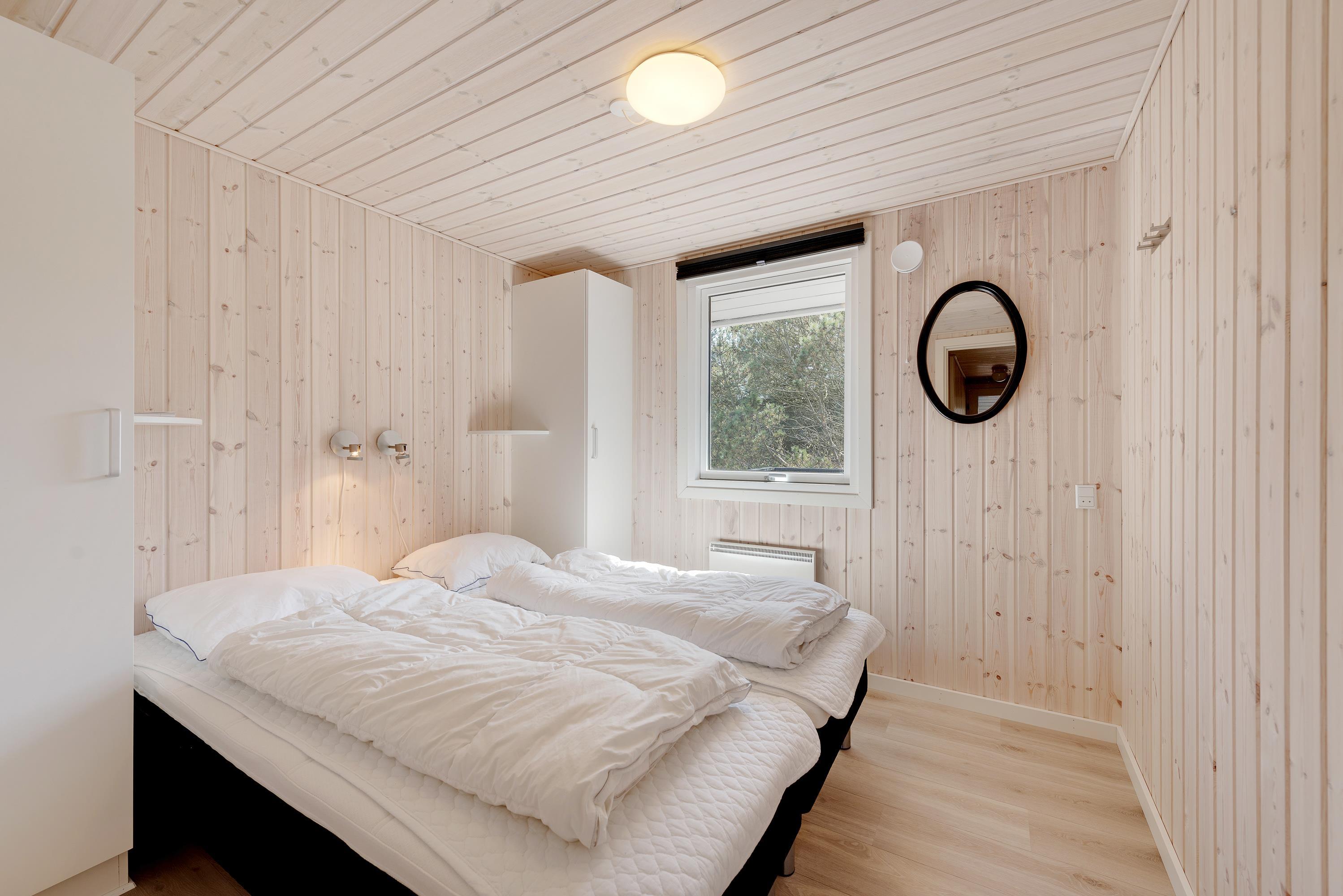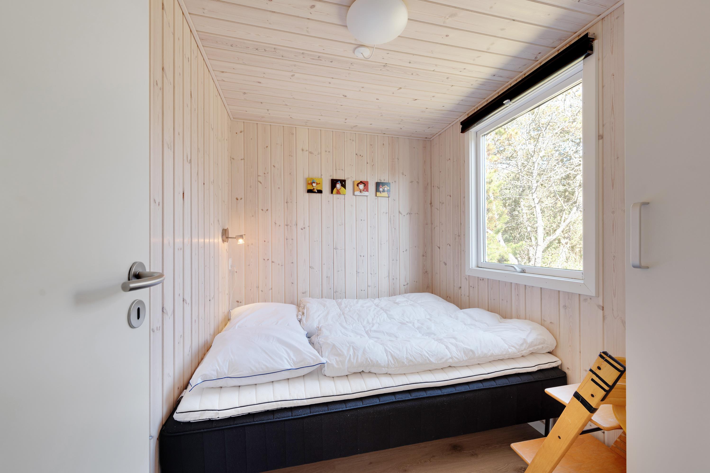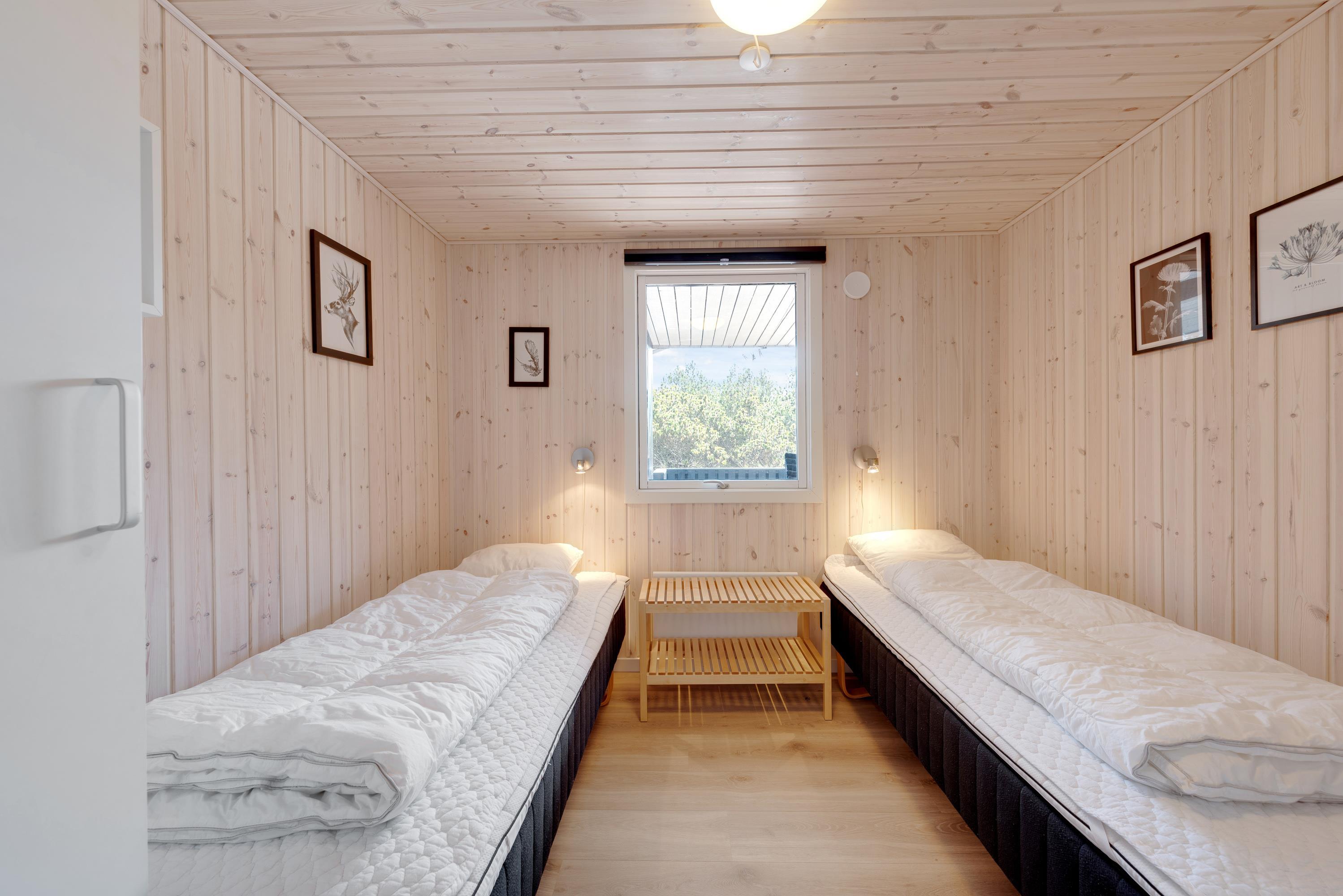 Der er i alt 6 sovepladser i sommerhuset, som i alt er fordelt på 3 soveværelser; to værelser med 2 enkelt senge og et værelse med en dobbeltseng.