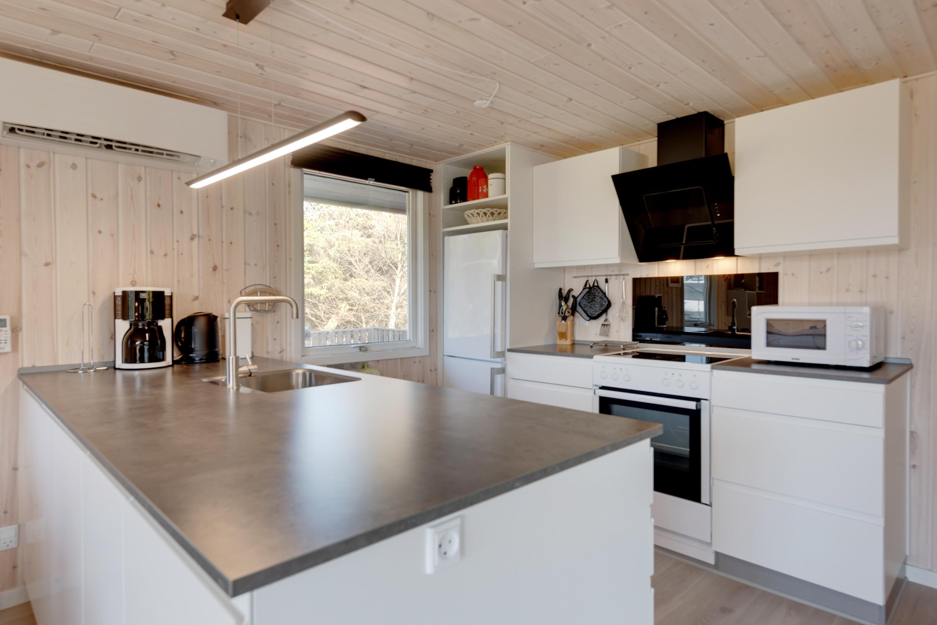 I køkkenet finder I alle de nødvendige faciliteter for at lave et lækkert måltid mad. Køkkenet ligger i åben forbindelse med stuen, og udgør derfor et stort alrum. Her er der oplagt at samles hele familien til en aften med fælles madlavning eller brætspils hygge. I kan desuden tænde op for brændeovnen, som igen sørger for en hyggelig og indbydende atmosfære.
