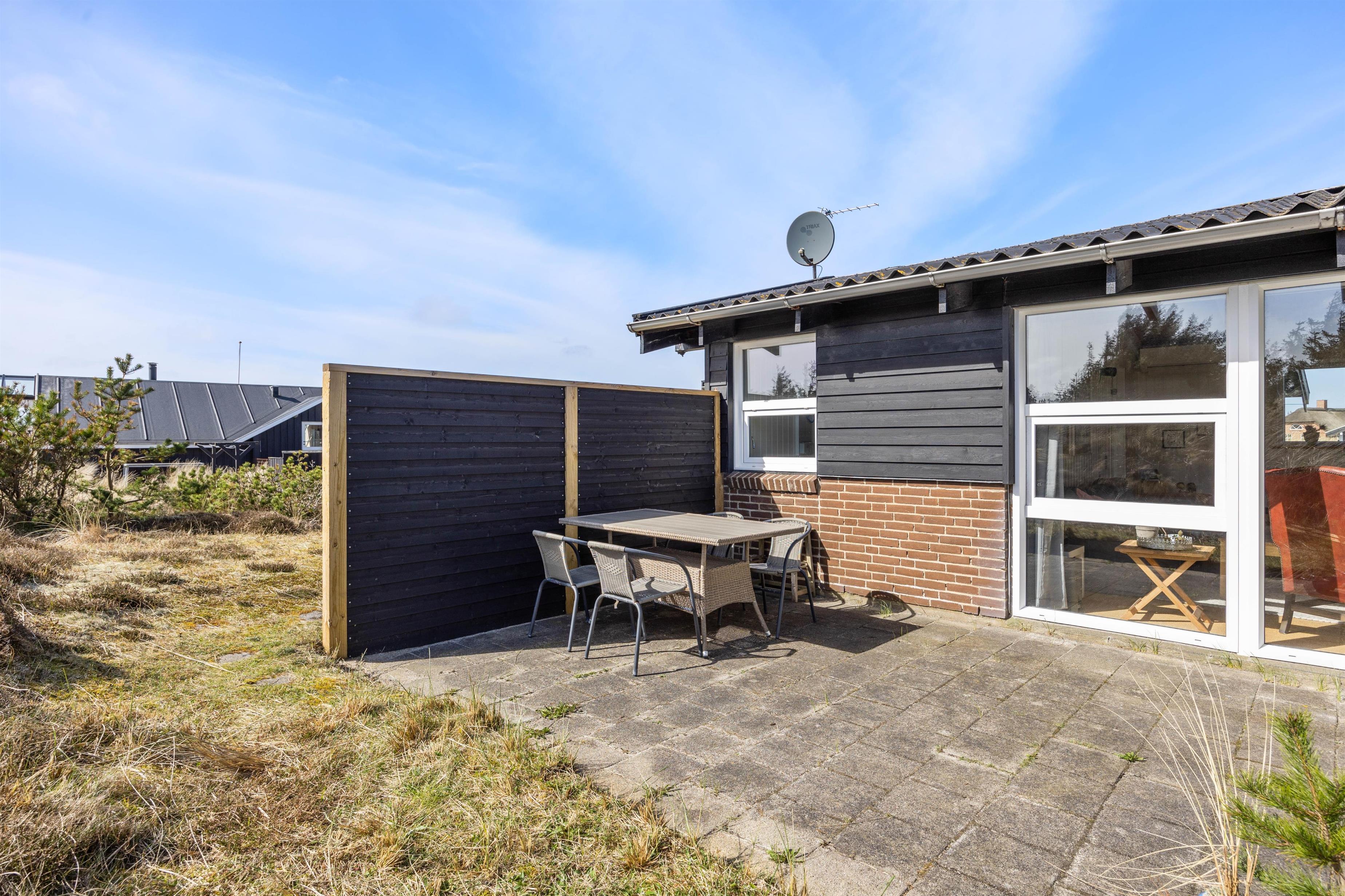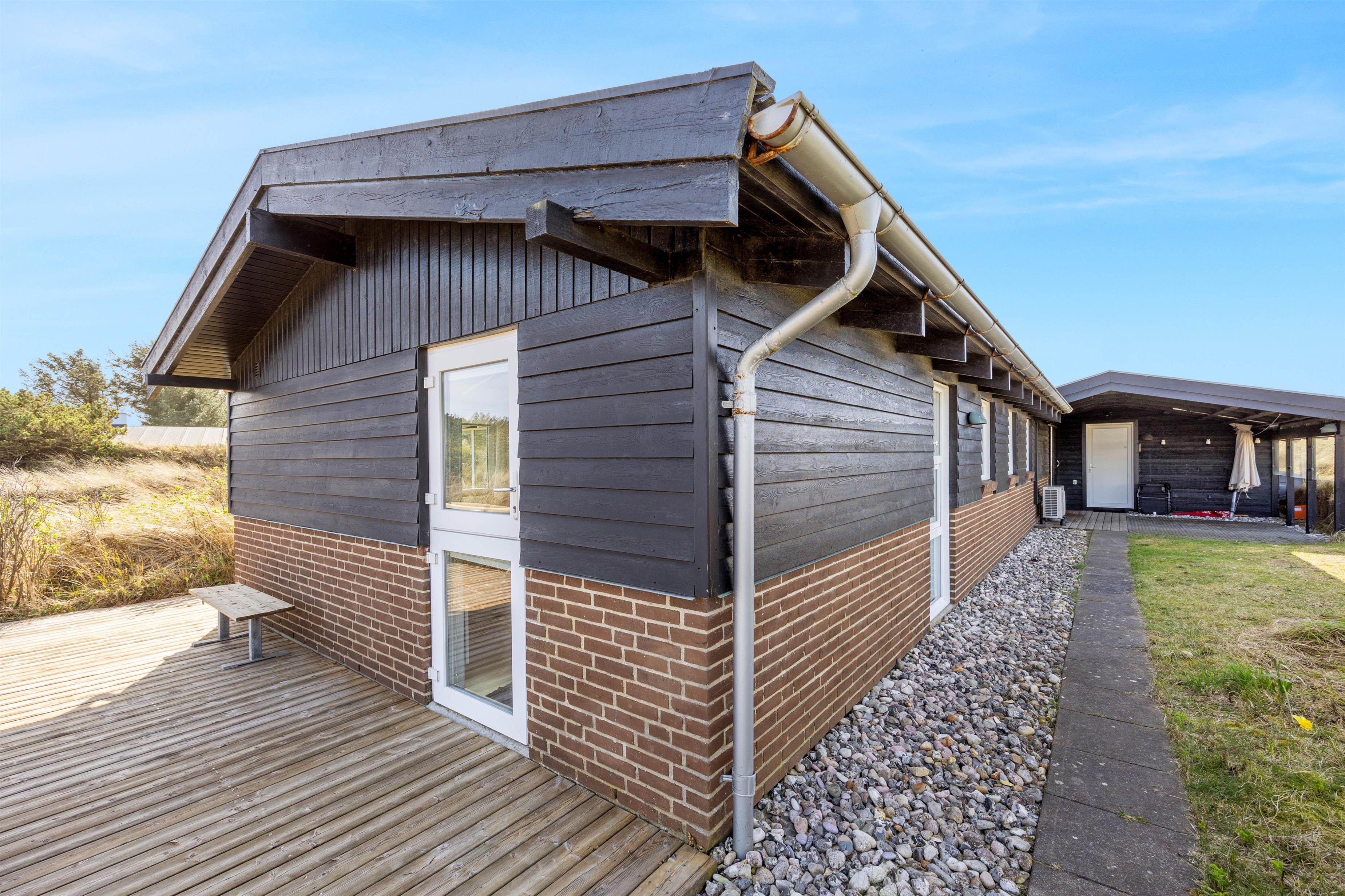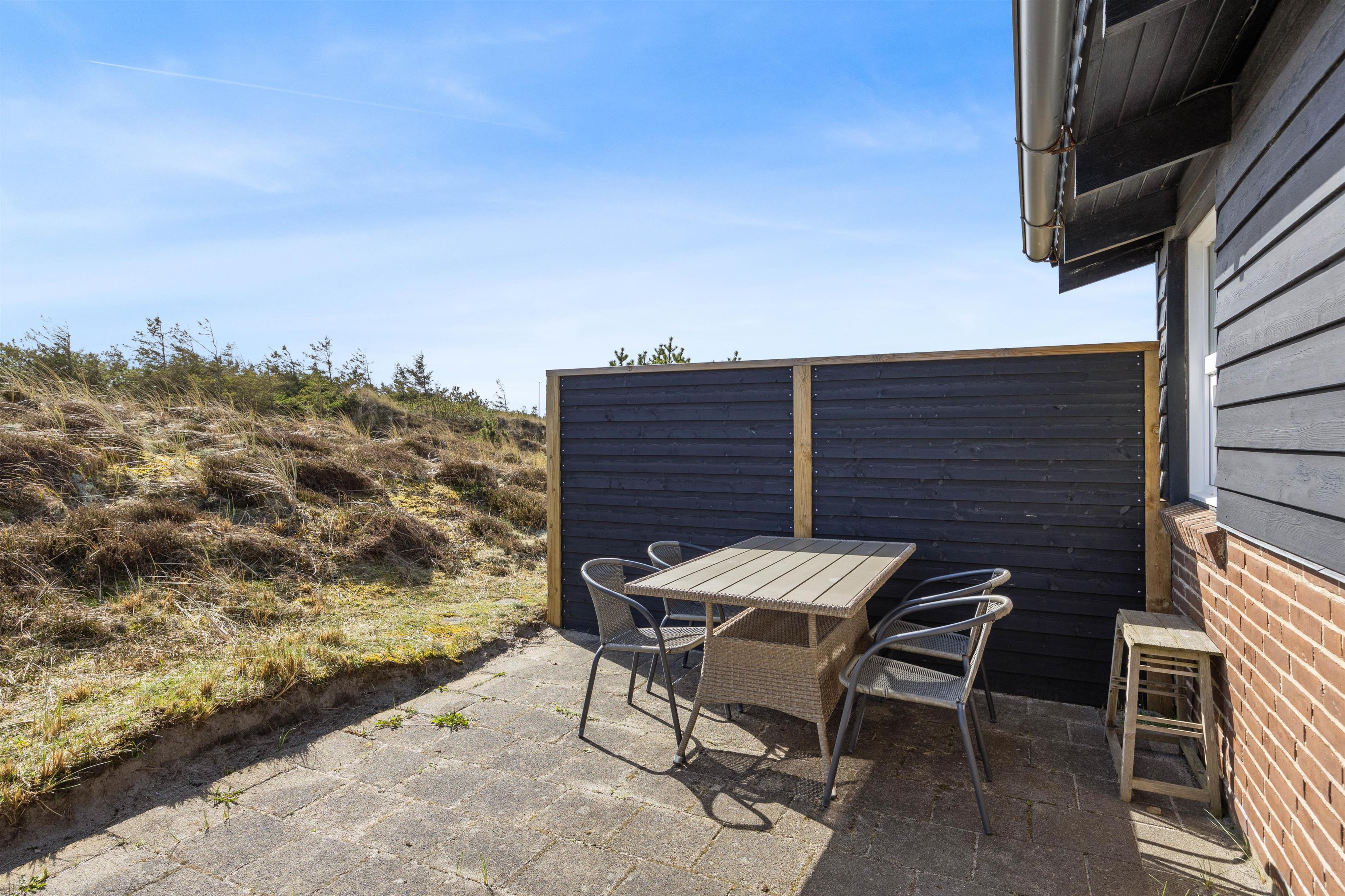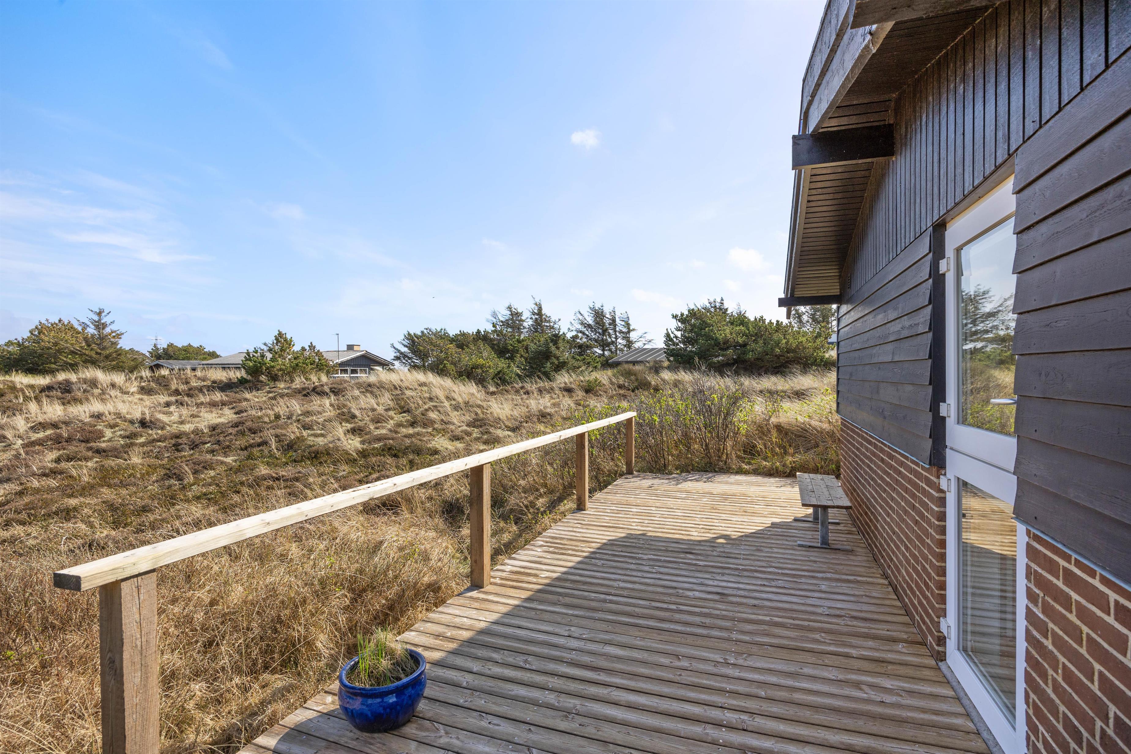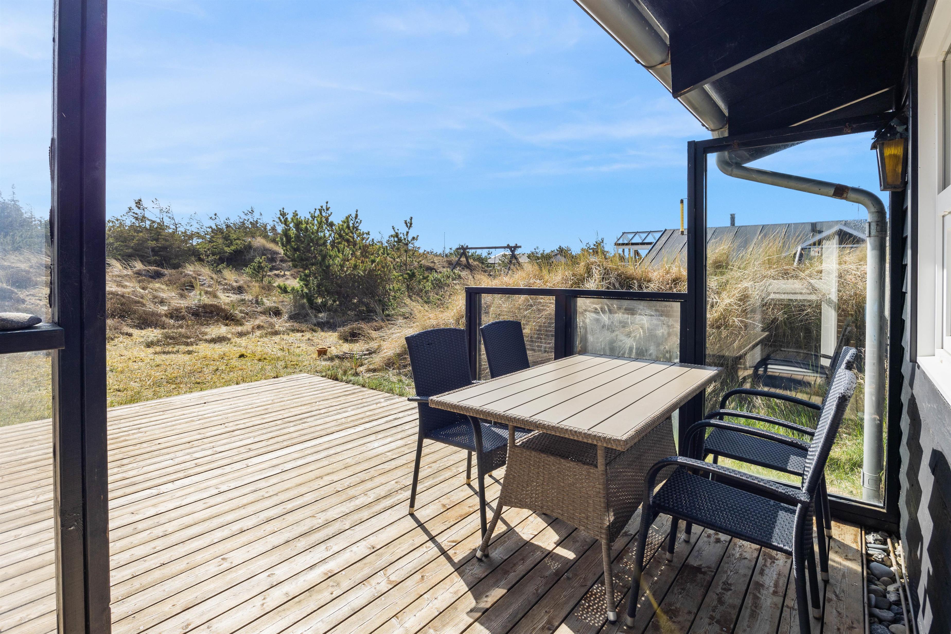 Der er sørget for hyggelige terrasser hele vejen rundt om huset, så man har overalt her på Havklitvej 16 i Klegod rig mulighed for at nyde solens stråler og den storslåede natur. "Ude-tiden" bliver forlænget af de afskærmede og delvis overdækkede terrasser rundt om huset.