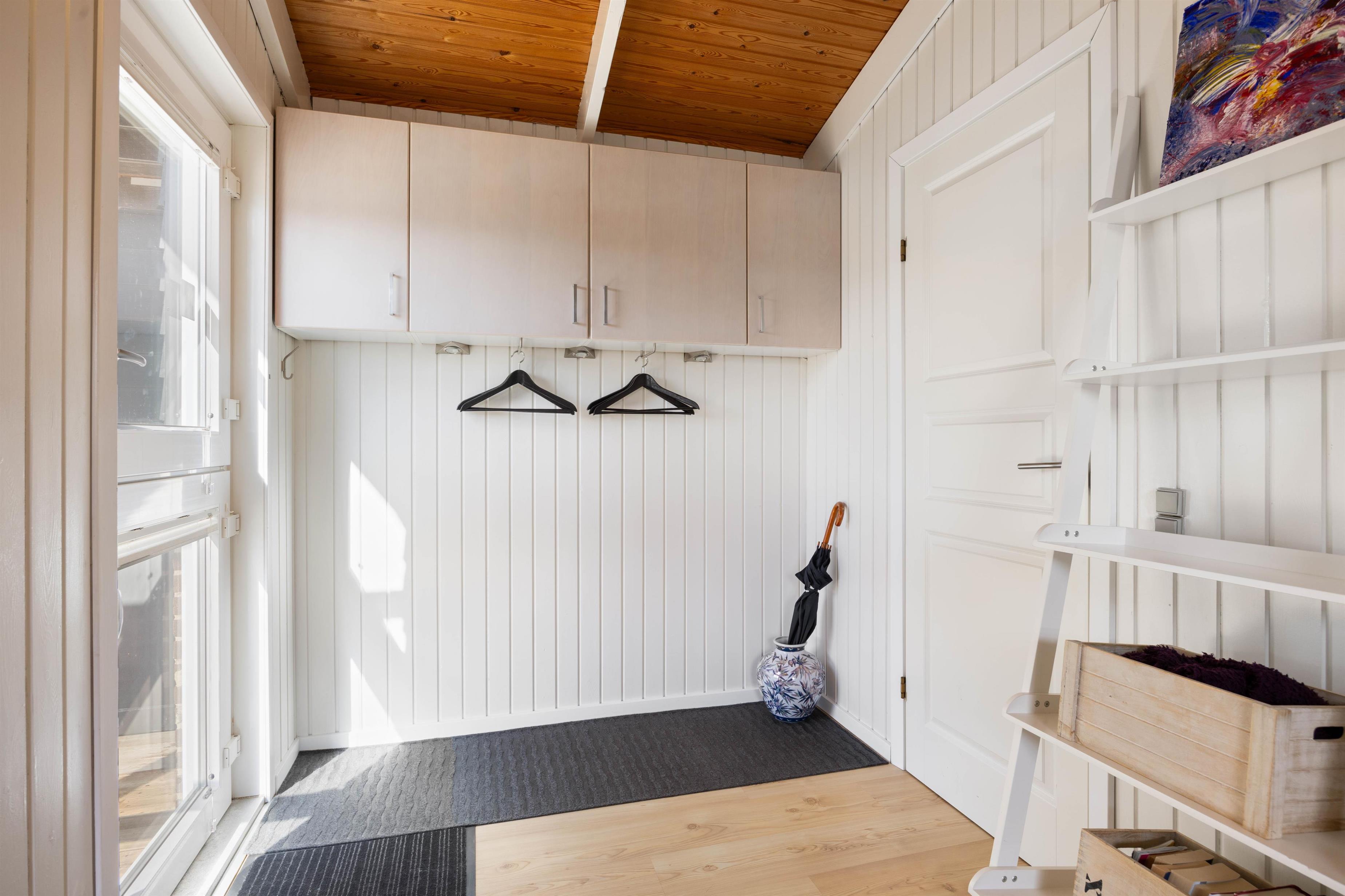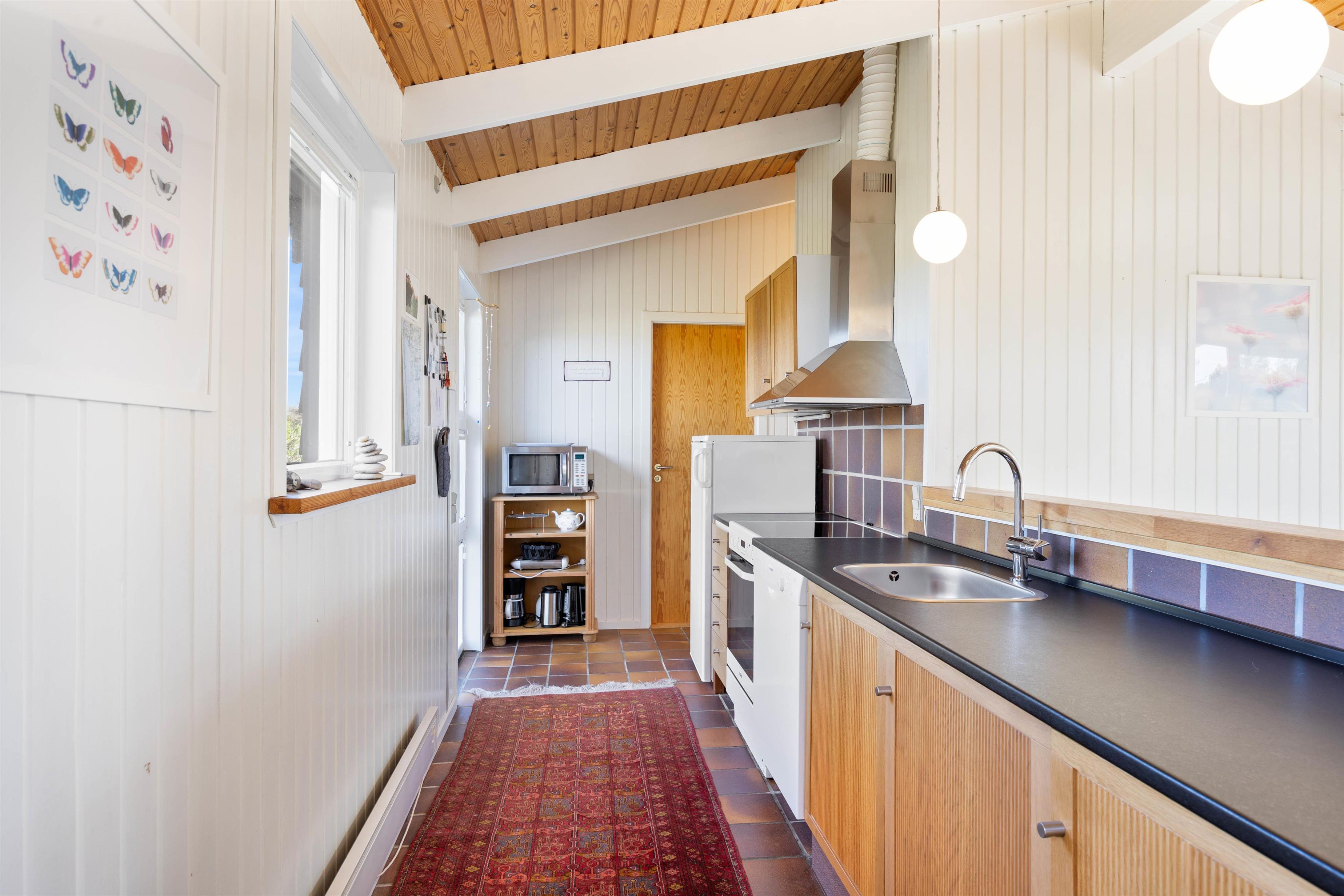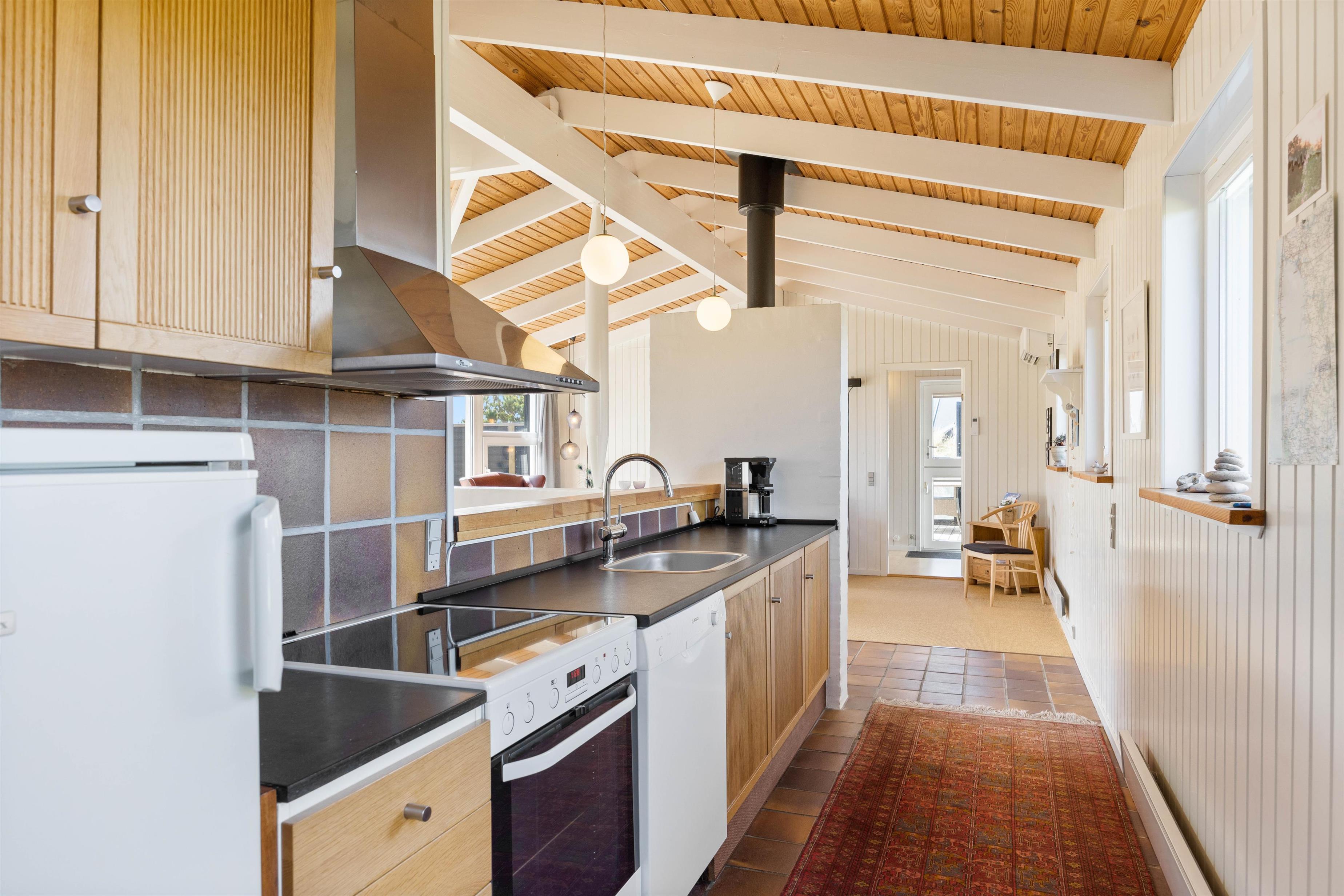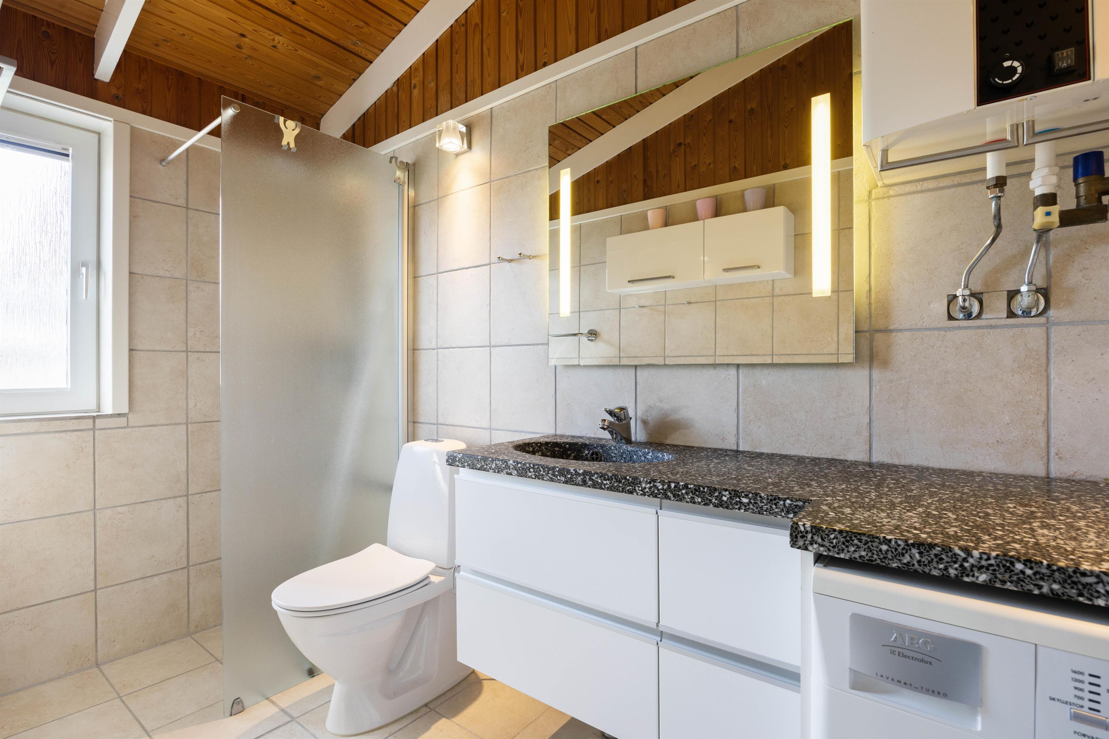 I det rummelige og praktisk indrettede badeværelse er der bl.a. vaskemaskine og tørretumbler. Derfor kan småbørnsfamilier roligt slappe af og lade børnene lege i klitterne og ved vandet.