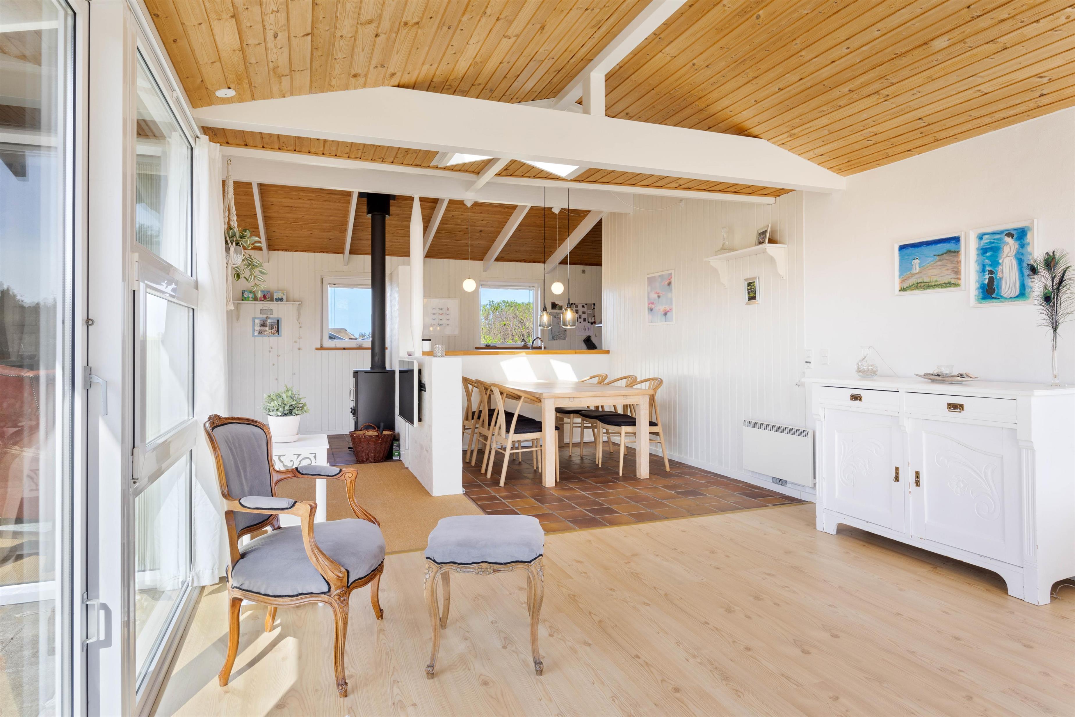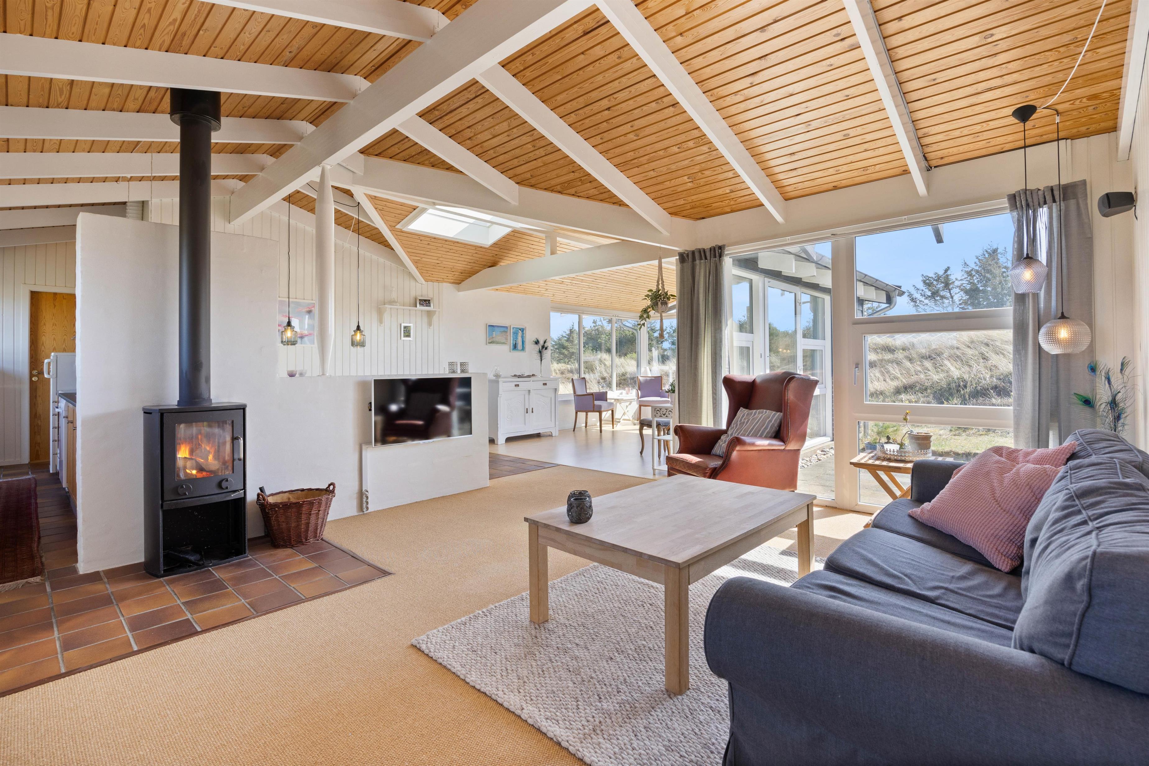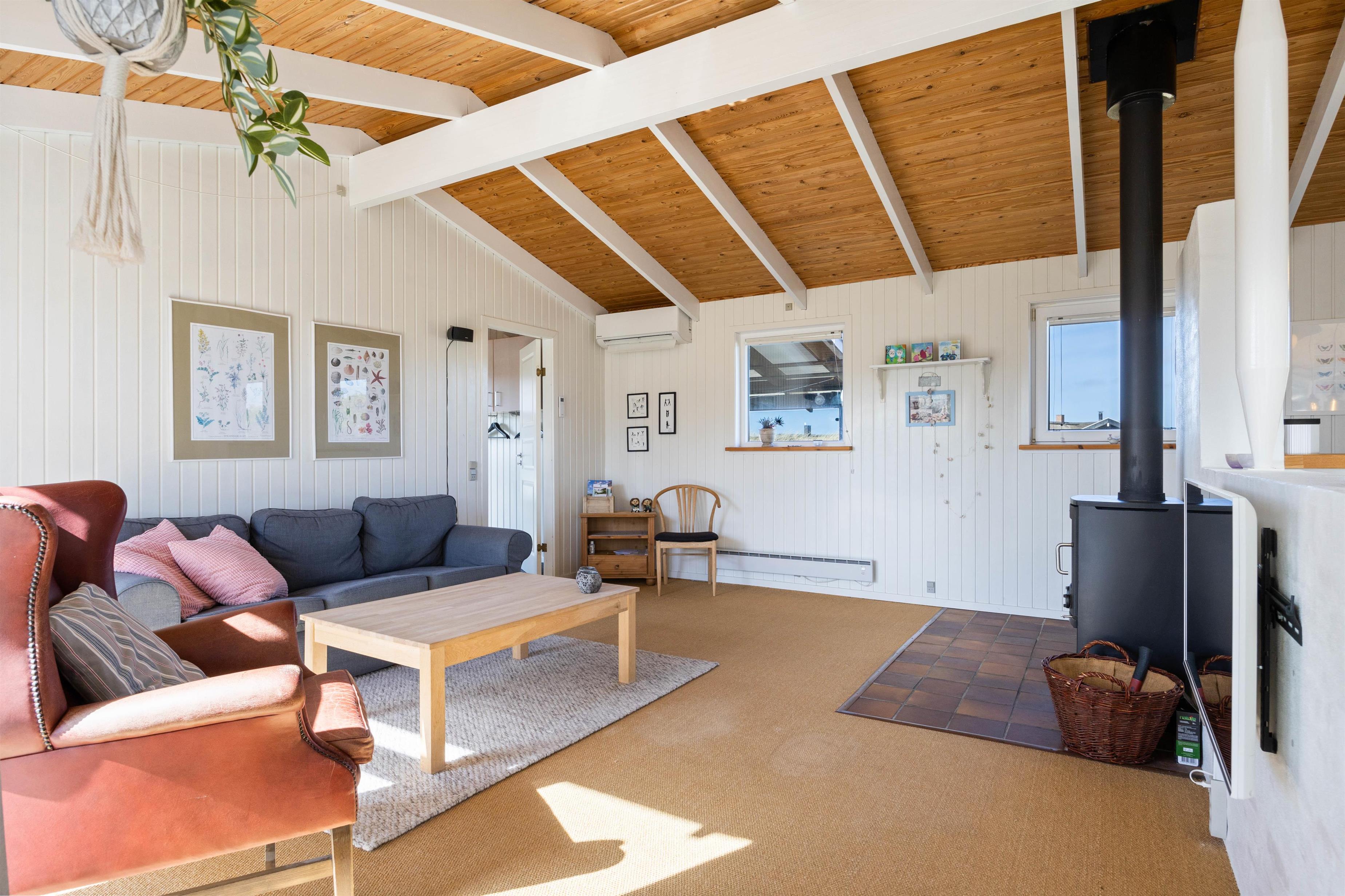Opholdsstuen er lys og hyggelig indrettet med lyse møbler og store vinduespartier, som giver et dejligt lys. En brændeovn midt i rummet spreder varme og hygge på de kolde dage. Her kan man rigtig slappe af med en god bog og en kop kaffe foran den knitrende ild.