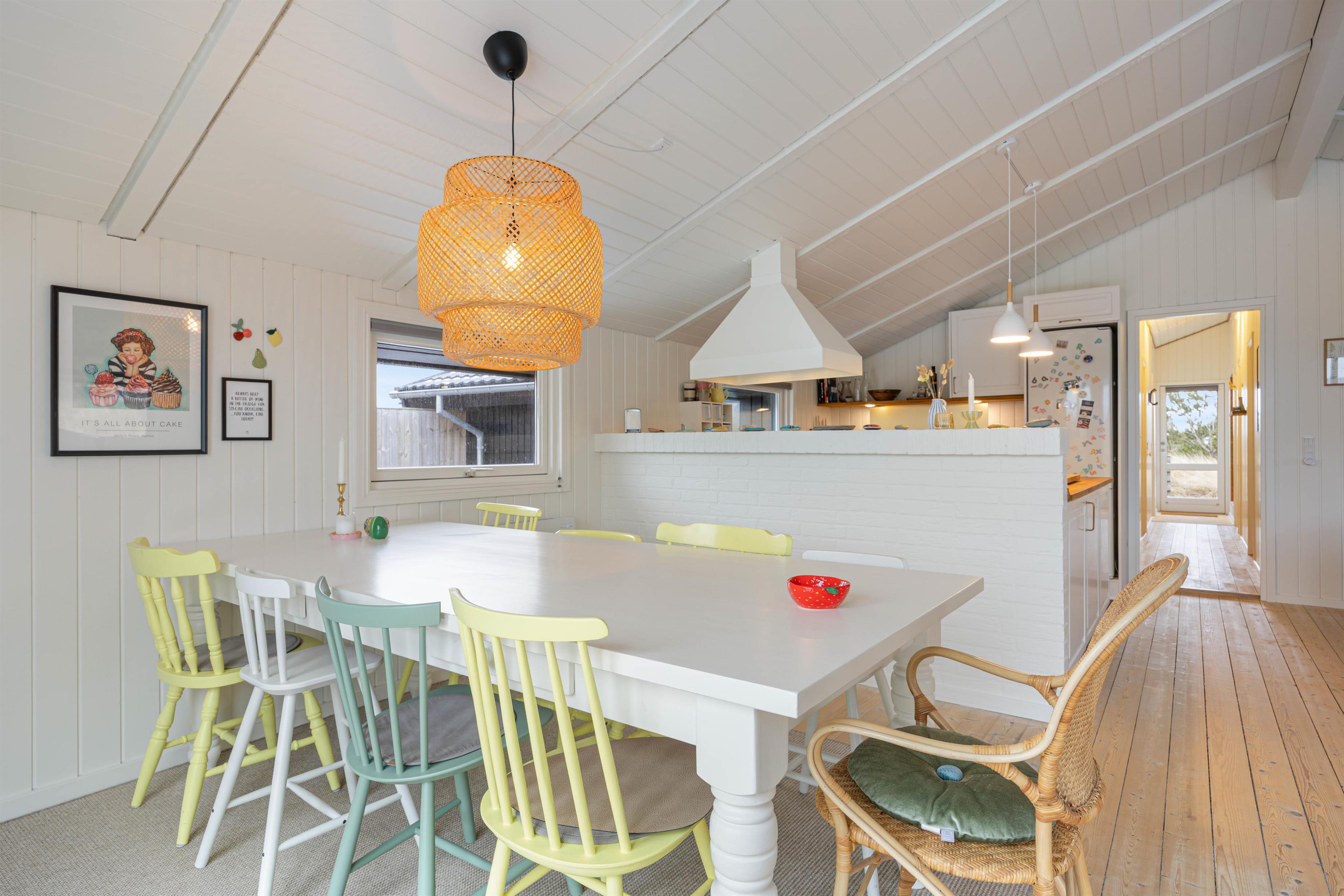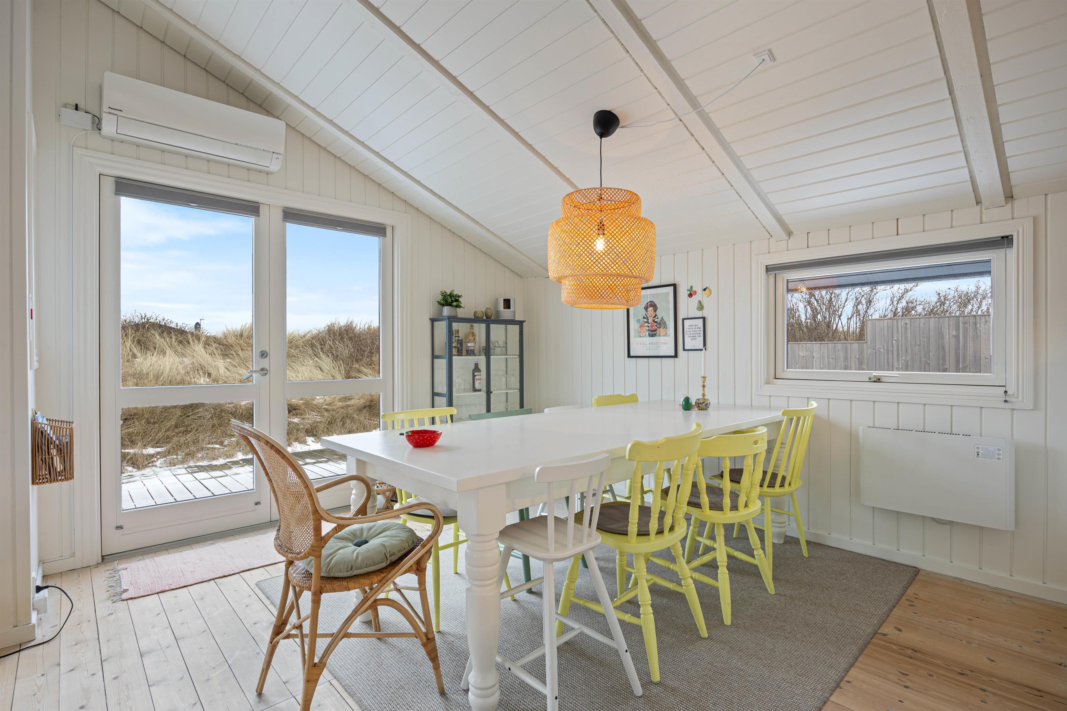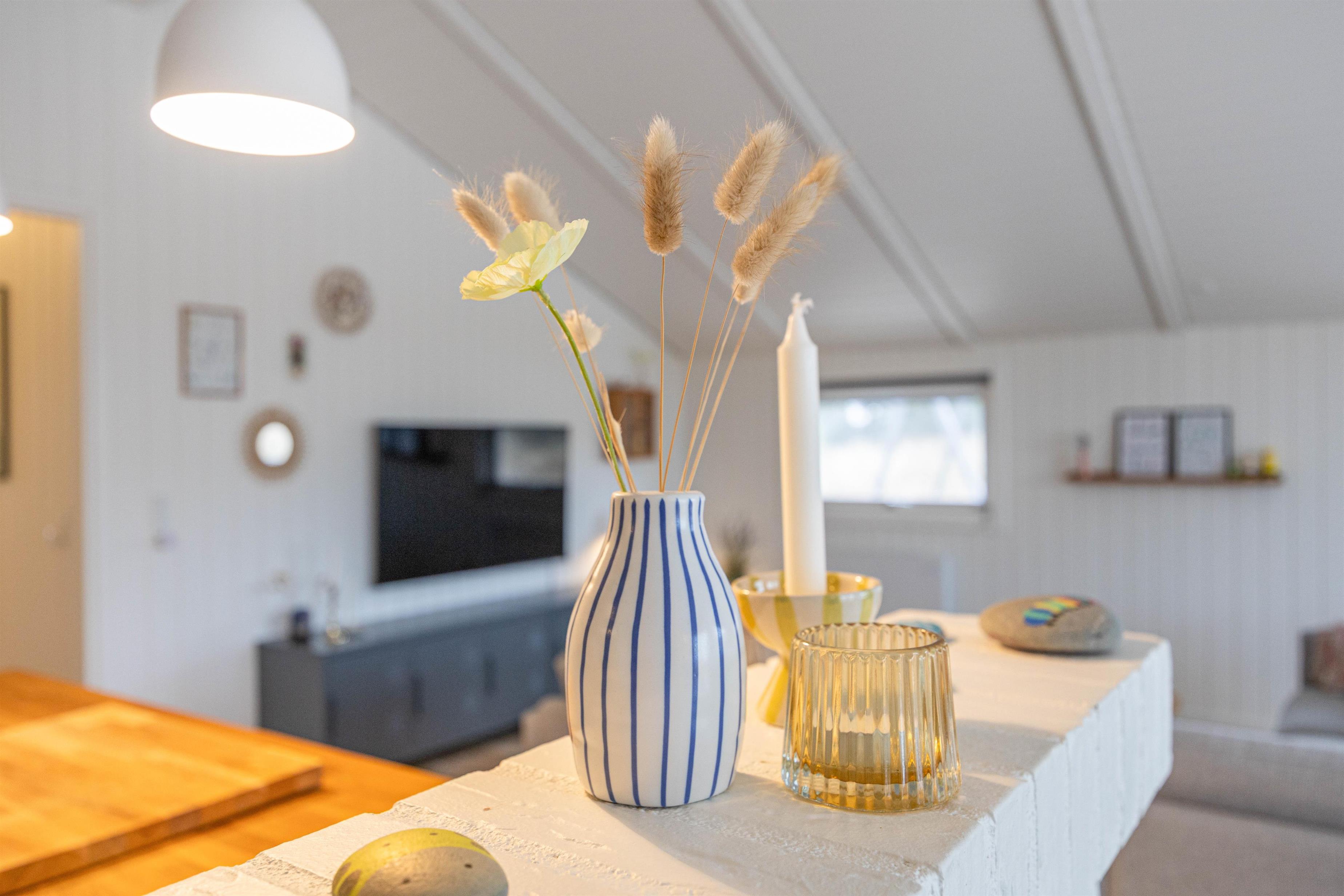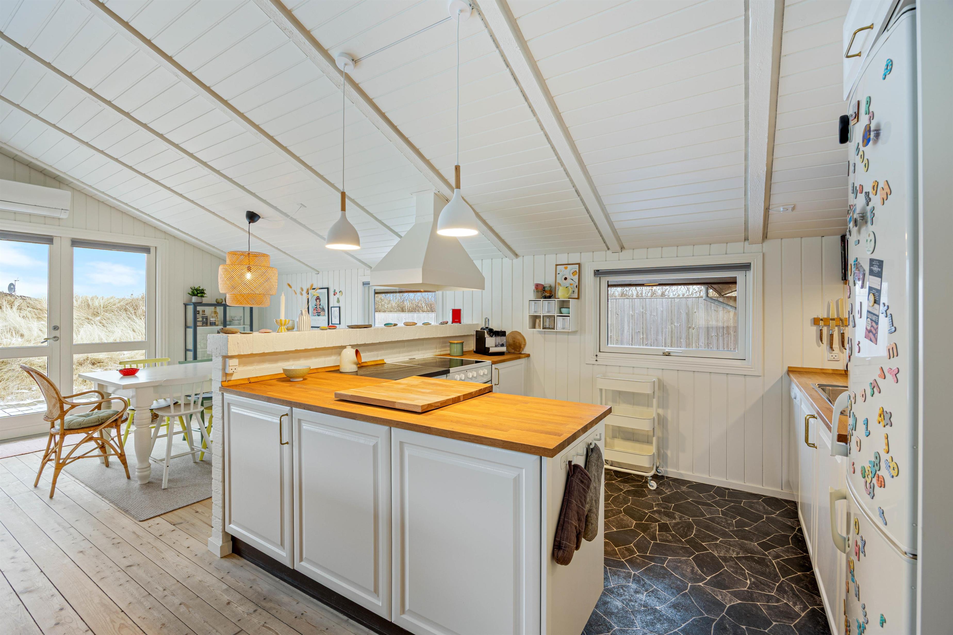 Sommerhuset byder på en hyggelig atmosfære med lyse trævægge og træloft, som skaber en dejlig rummelighed i opholdsrummet. Her kan I samles i sofaen foran brændeovnen, mens flammerne knitrer på de kølige dage. Den åbne forbindelse mellem stue og køkken gør det nemt at være sammen, uanset om der laves mad eller slappes af. Udover brændeovnen er der en varmepumpe i sommerhuset, som sikrer en dejlig inde temperatur året rundt.