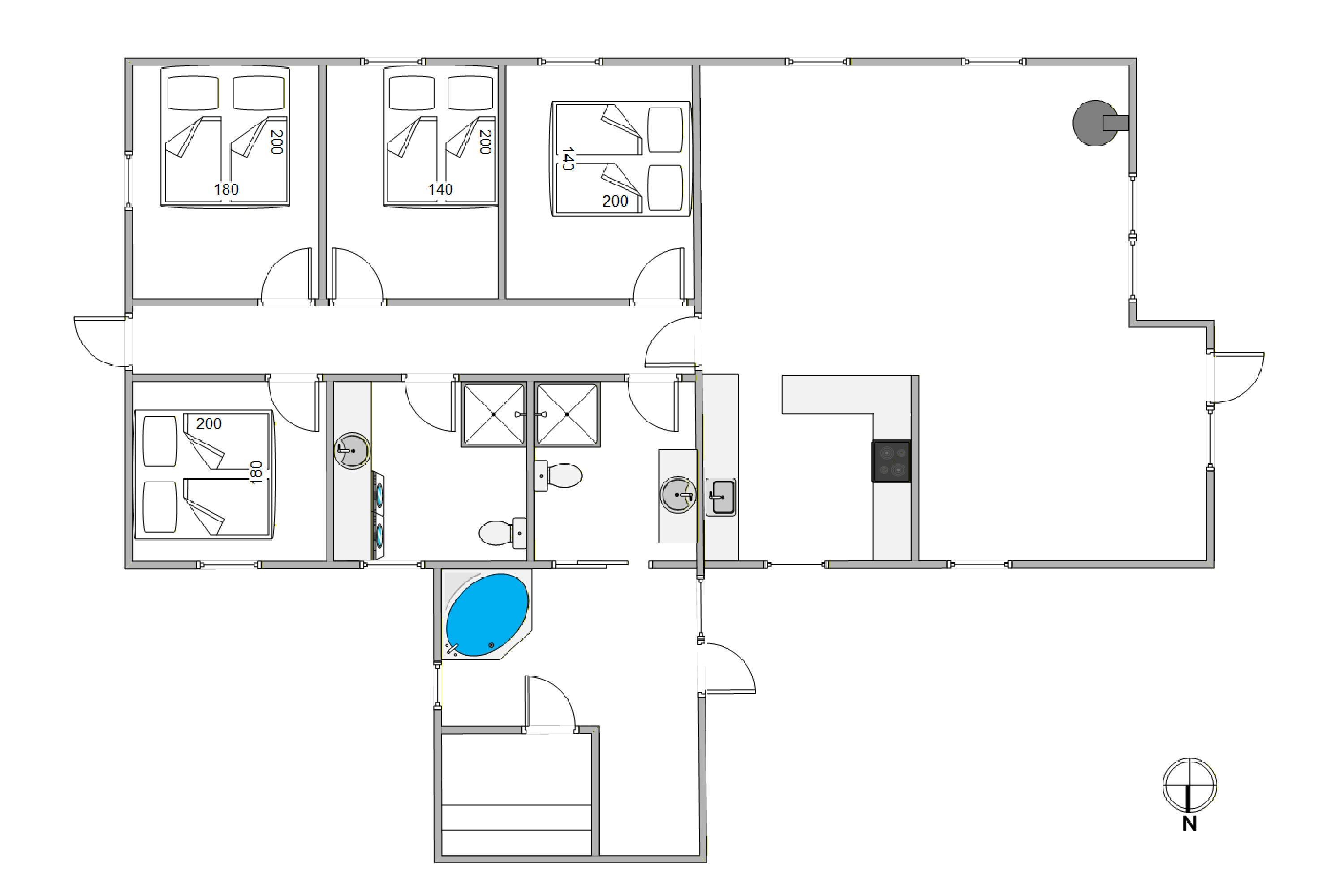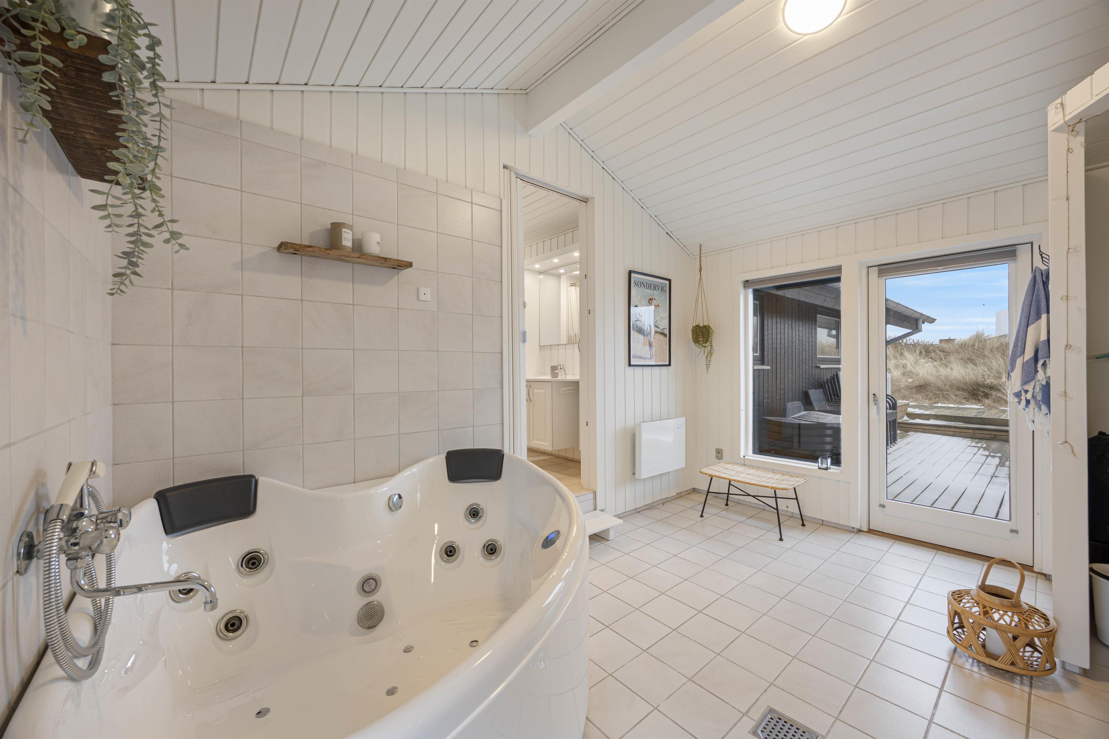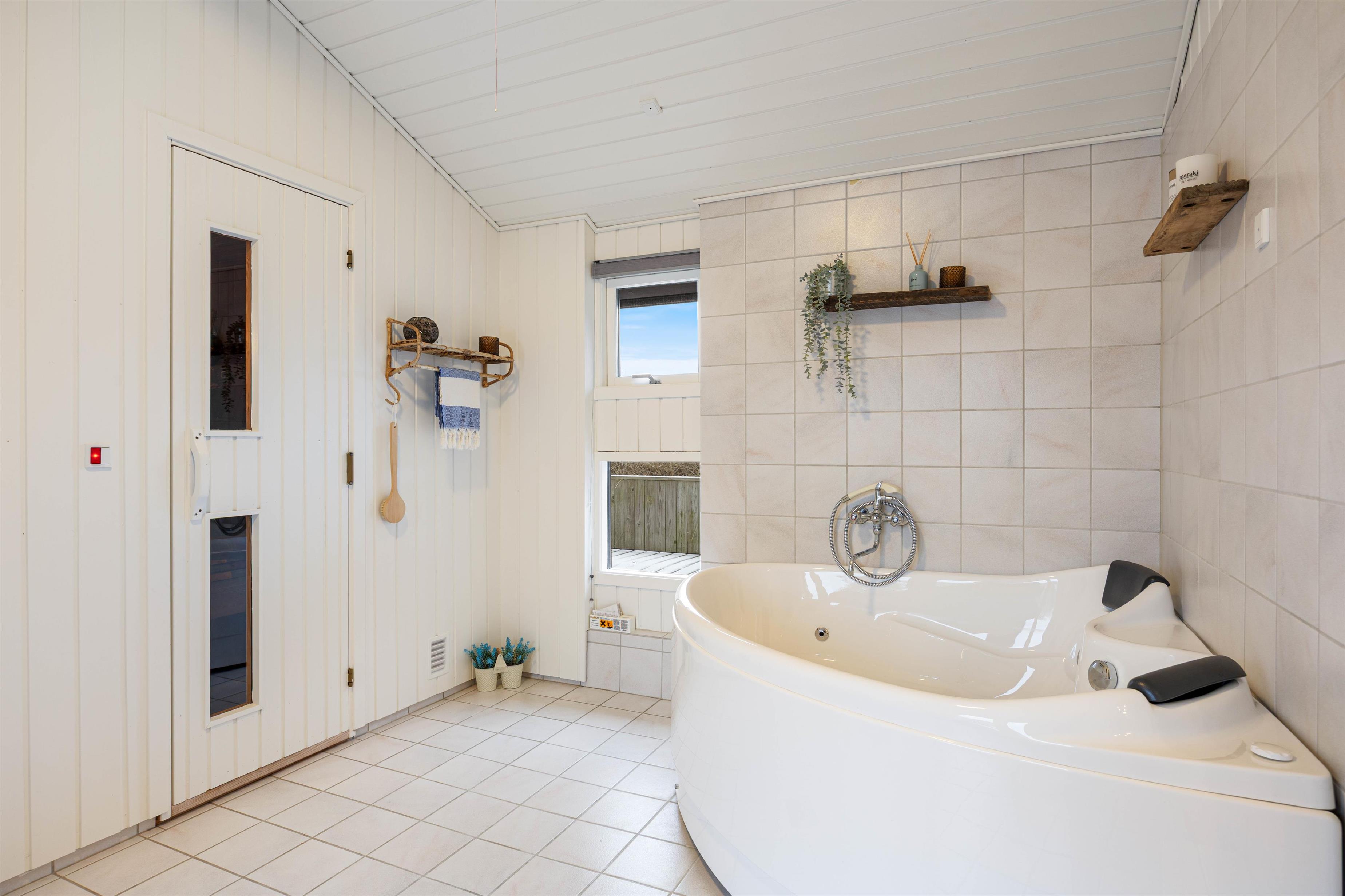 De 8 sovepladser fordeler sig på 4 soverum, så der er god plads til hele familien eller vennegruppen. Sommerhuset råder over 2 badeværelser, begge med gulvvarme, så I får ekstra komfort – især på de kølige morgener. Det ene badeværelse byder desuden på en sauna og tømmespa, hvor I virkelig kan forkæle jer selv efter en dag i den friske havluft.