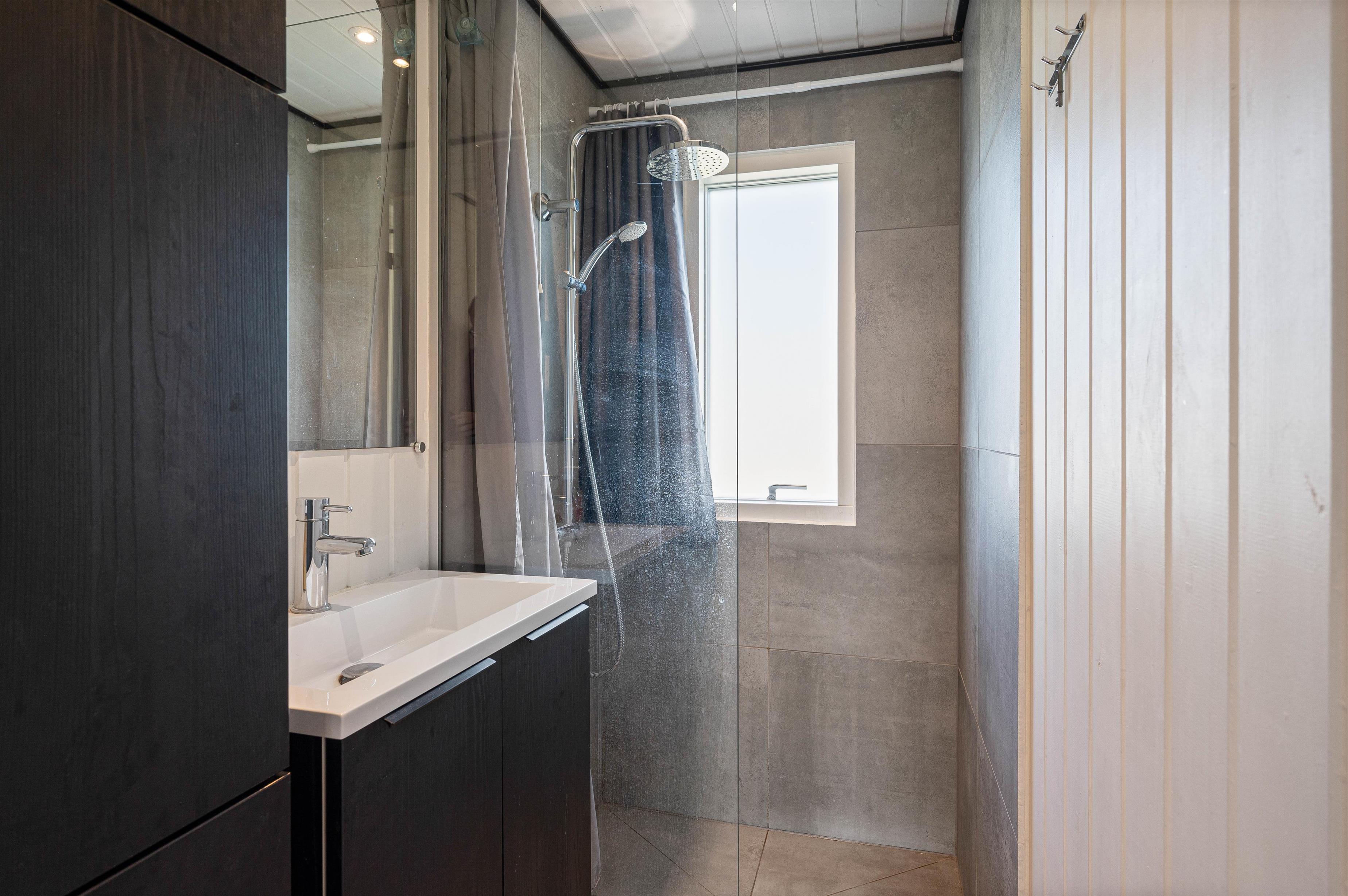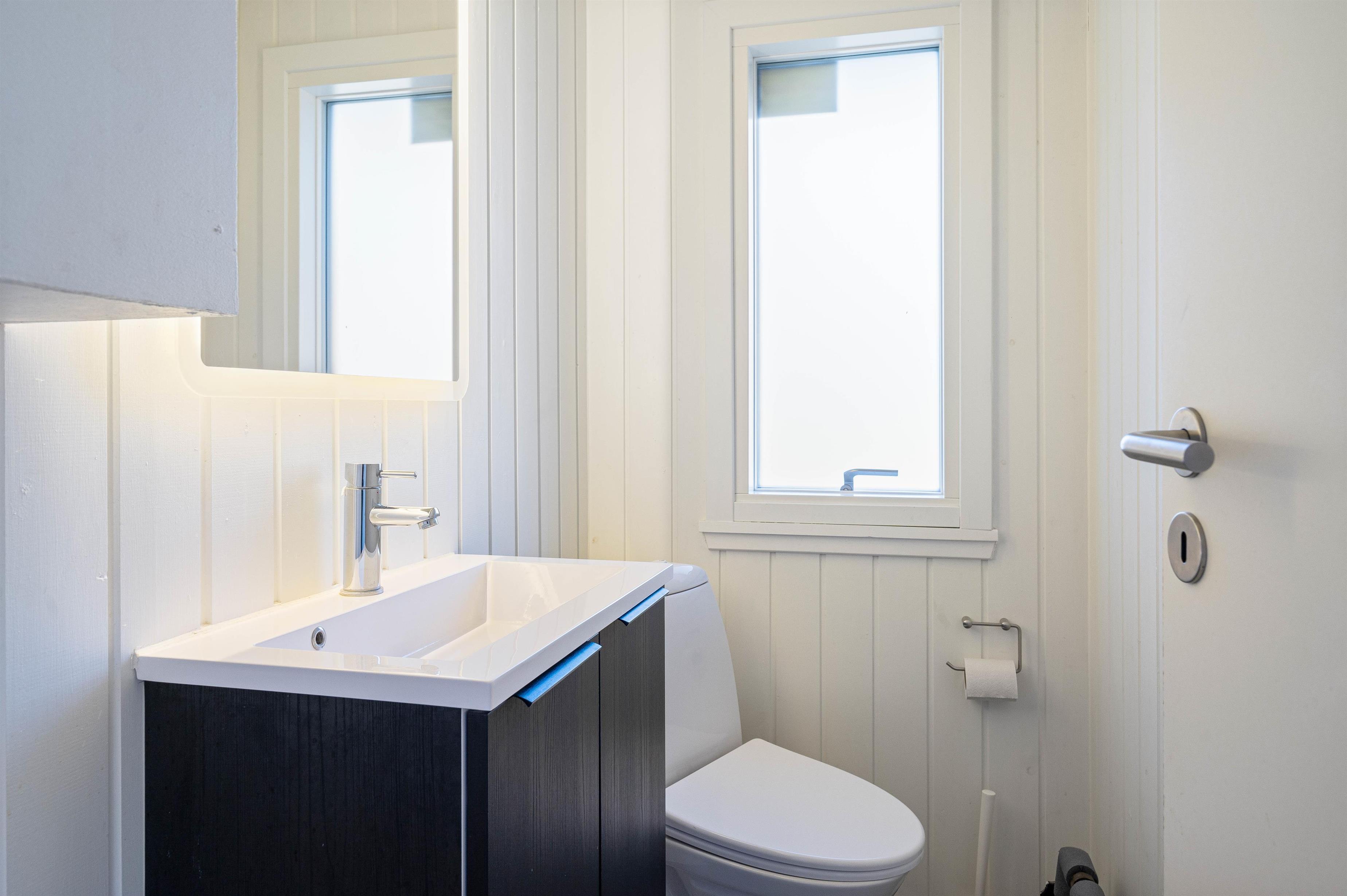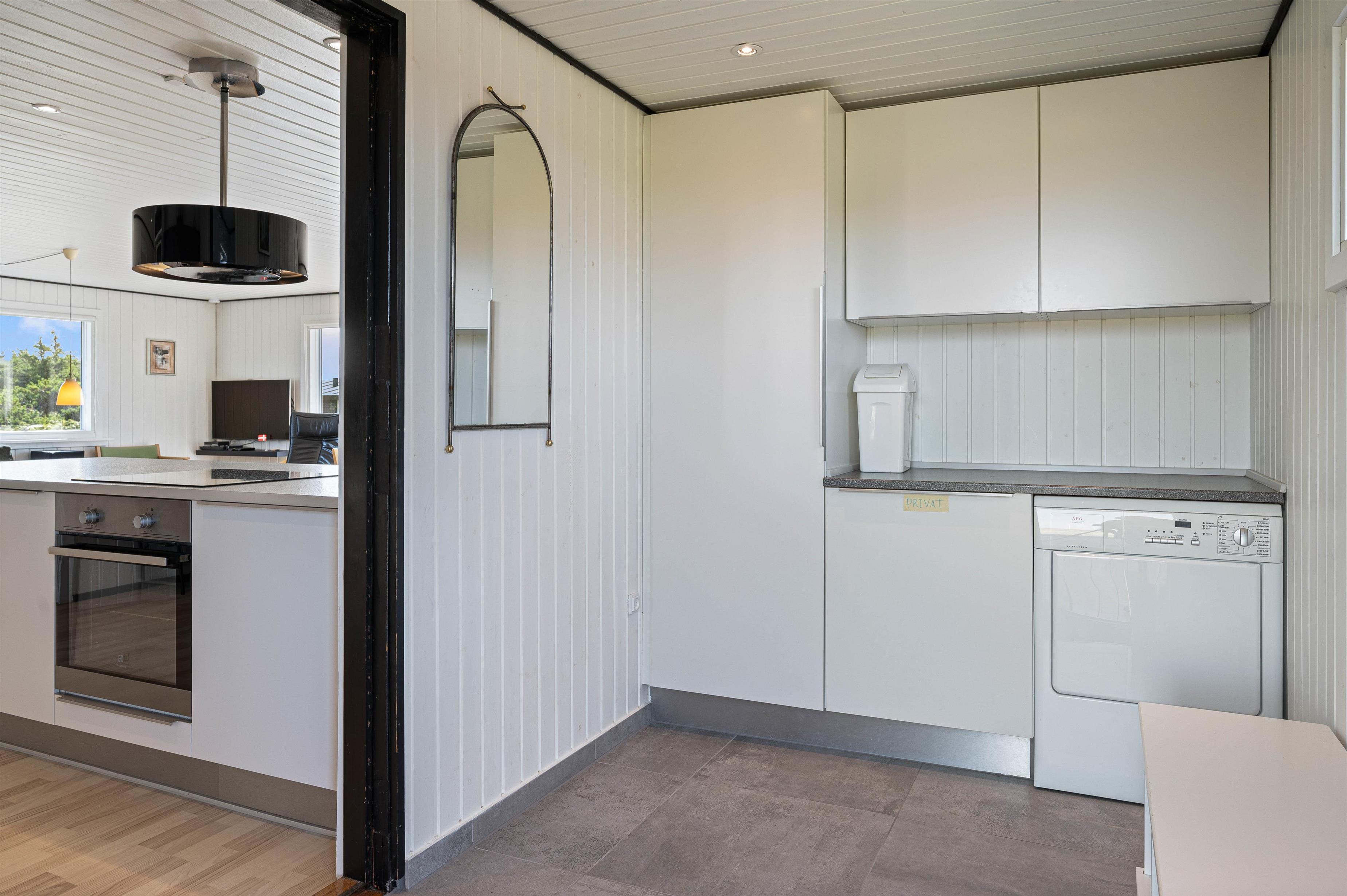 Badeværelset og gæstetoilettet har begge gulvvarme, hvilket skaber en ekstra god komfort, især på de lidt køligere morgener. Vaskemaskine og tørretumbler gør det let at holde styr på de praktiske gøremål under ferien.