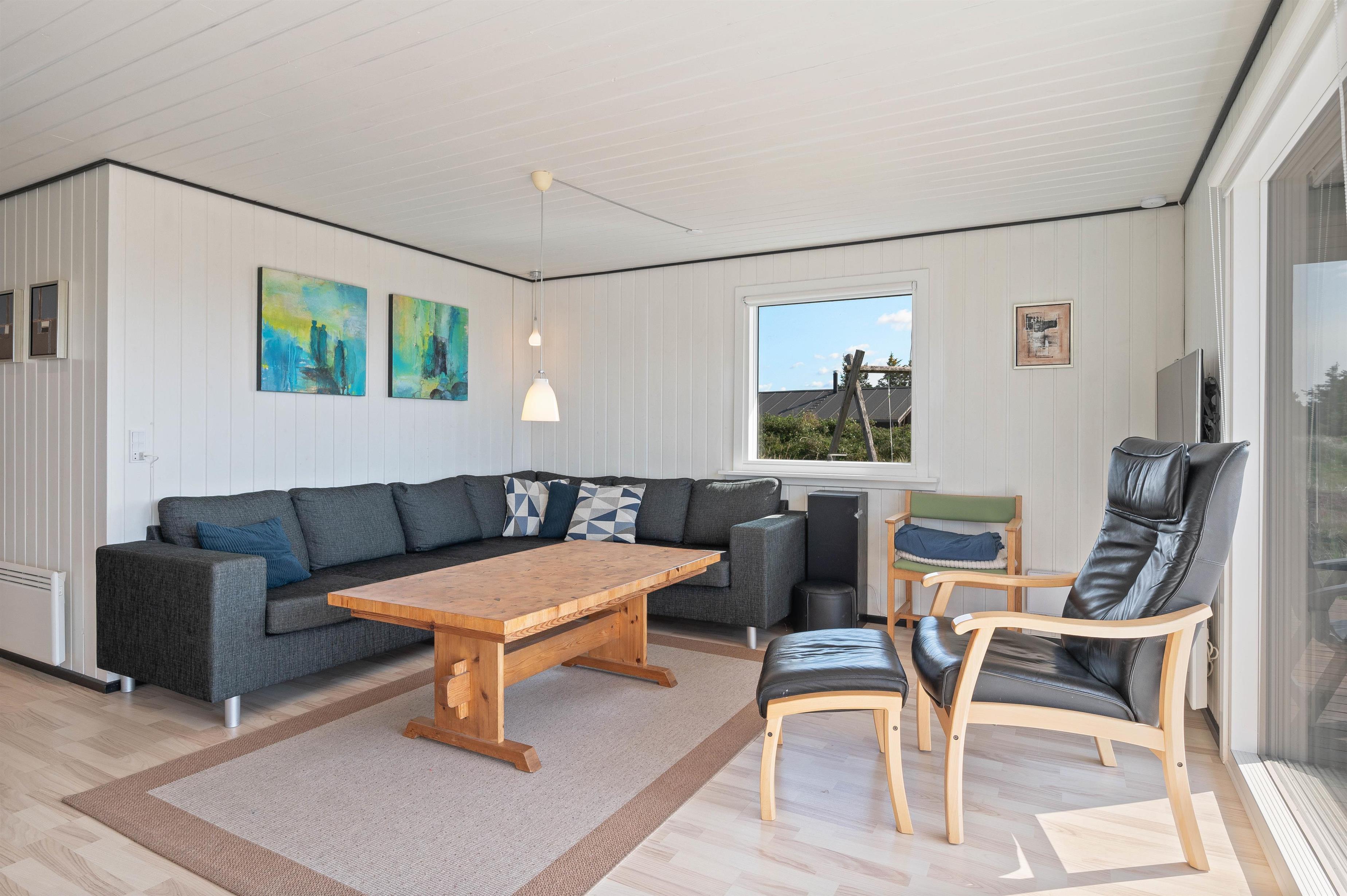 Stuen er hyggeligt indrettet med en komfortabel sofagruppe, perfekt til afslapning efter en dag ved stranden. Sommerhuset råder over tre gode soveværelser, så der er plads til, at I alle kan få en god nattesøvn.