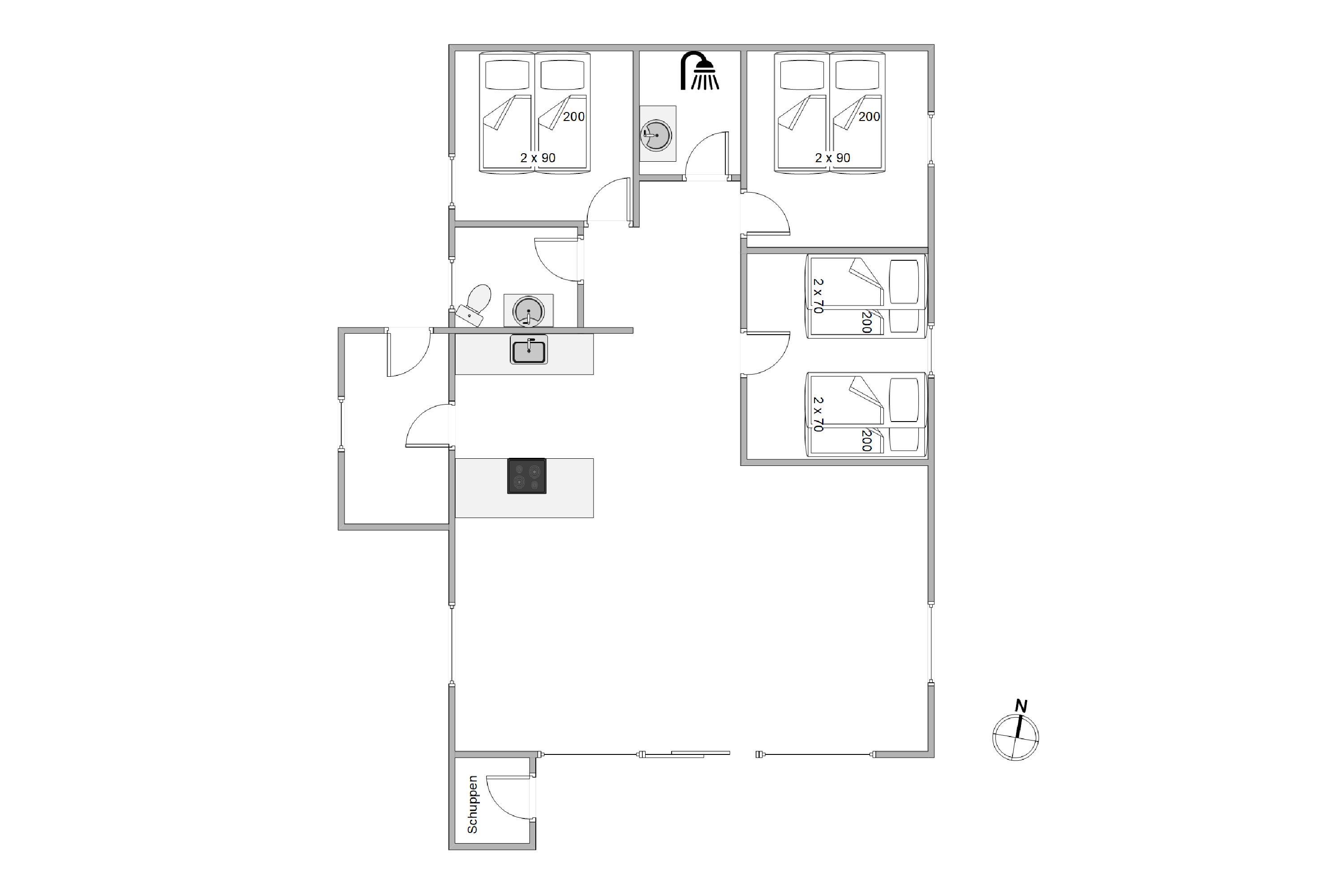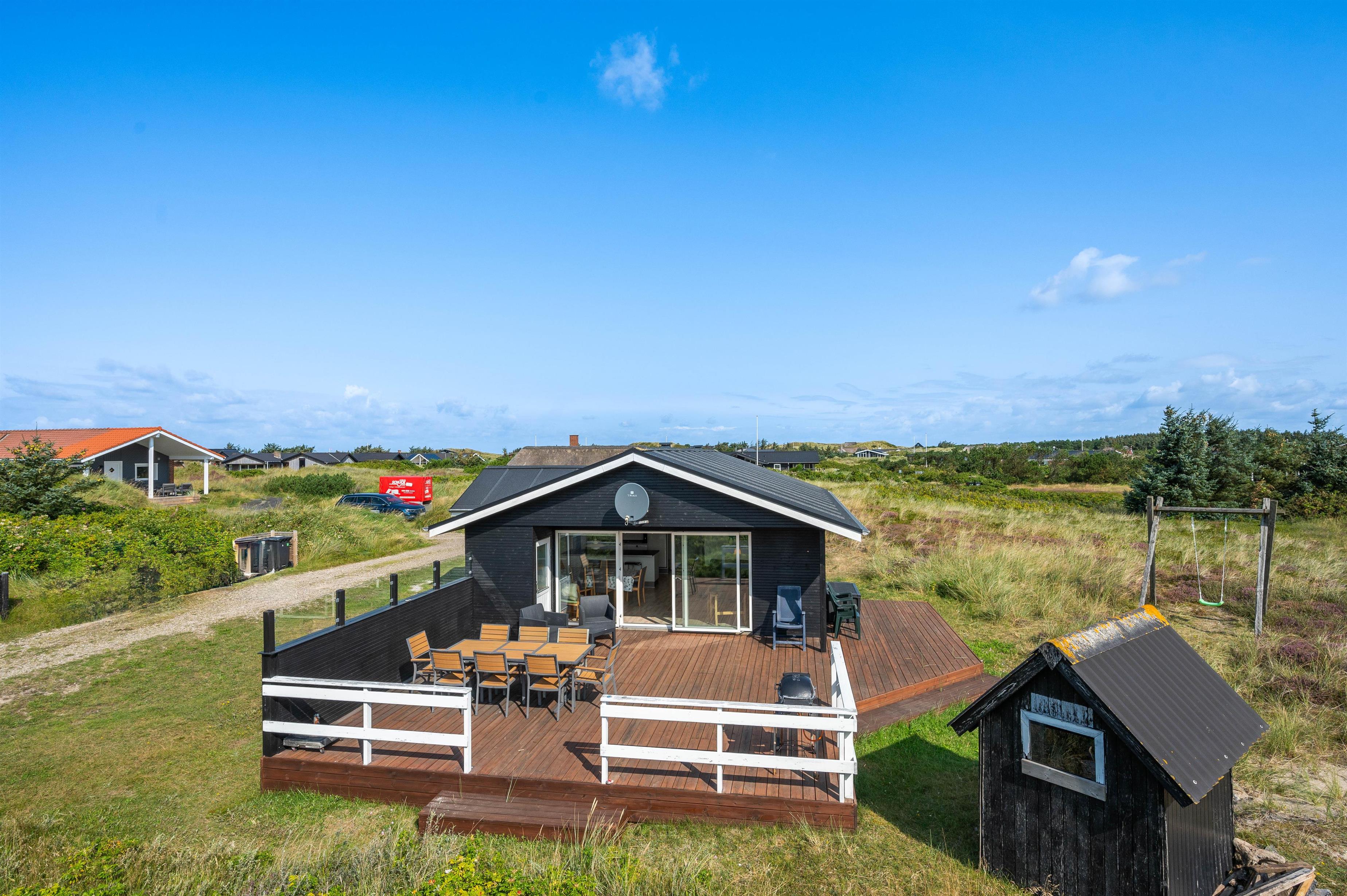 Udenfor byder sommerhuset på en dejlig afskærmet terrasse, hvor I kan nyde måltider i det fri eller slappe af i solen. Havemøblerne og grillen inviterer til hyggelige grillaftener, mens børnene frit, kan lege i sandkassen, på gyngen eller i det charmerende legehus.