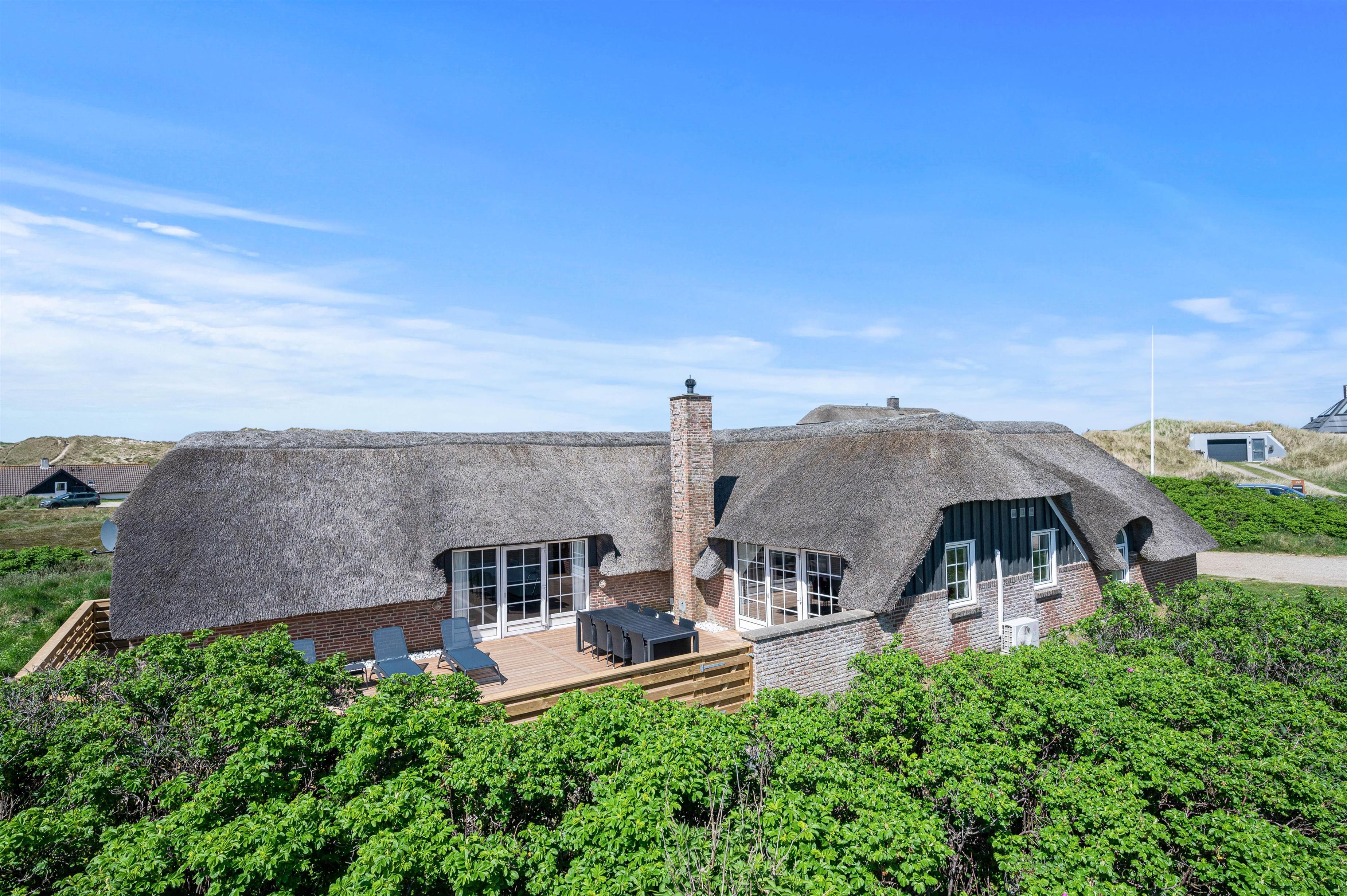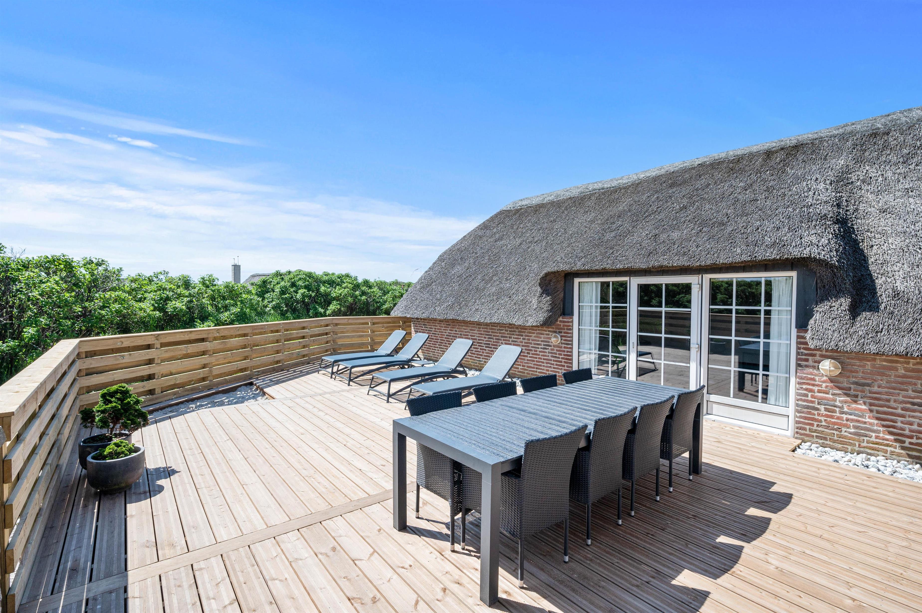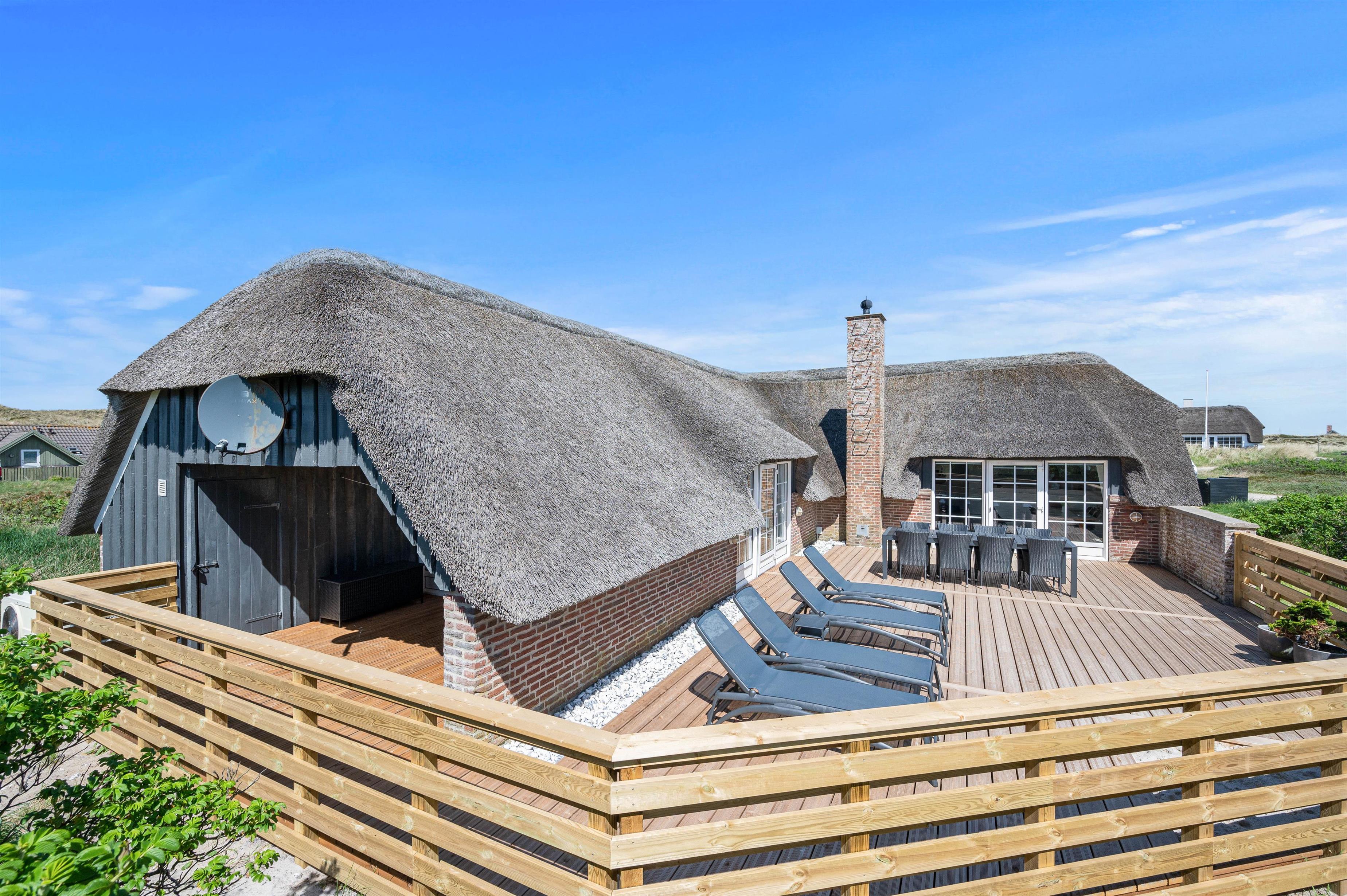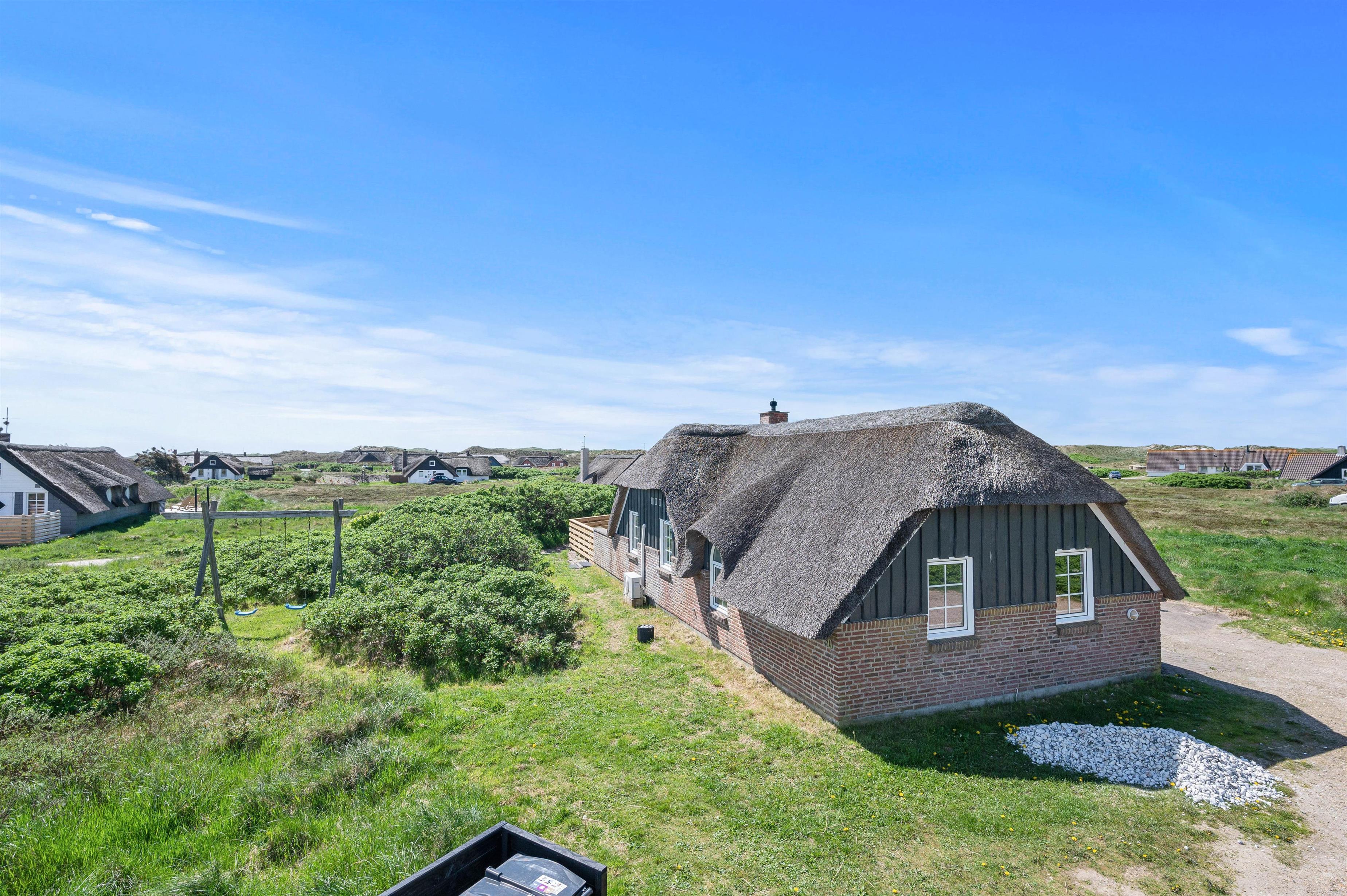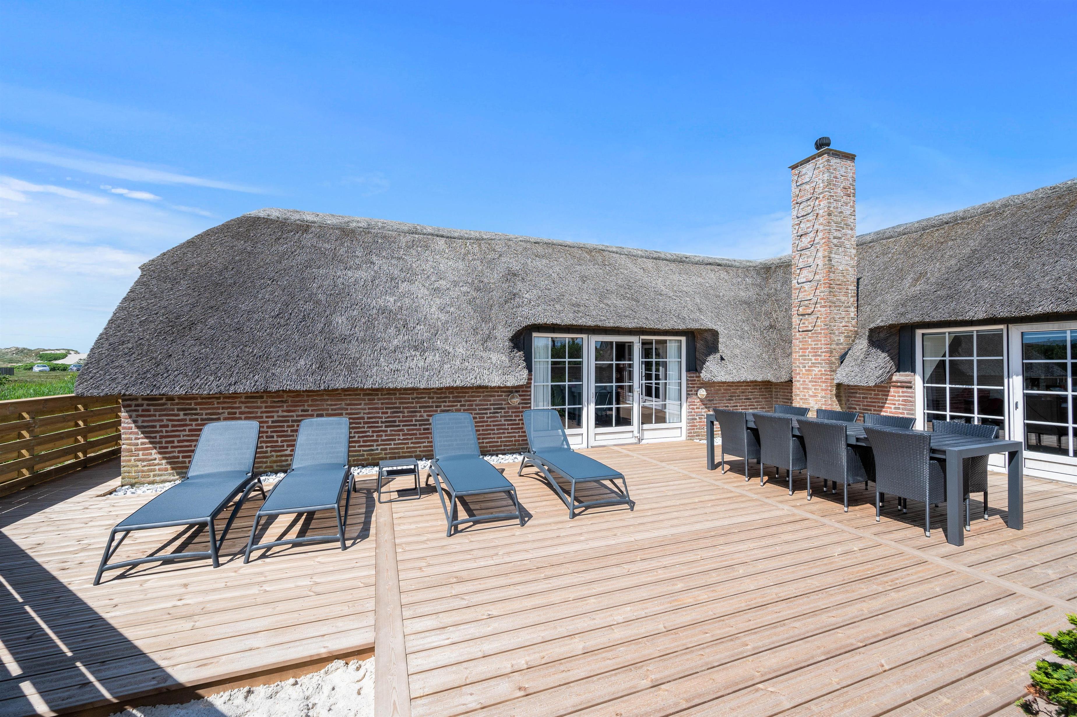 Udendørs har sommerhuset en skøn terrasse, der er delvist overdækket og lukket, og dermed har I mulighed for at sidde i ly og læ, når I er på terrassen. Her står der havemøbler og liggestole klar til jer, så I kan læne jer godt tilbage på en plads i solen, hvor I kan nyde det omkringliggende landskab og lyden af brændingen i baggrunden.