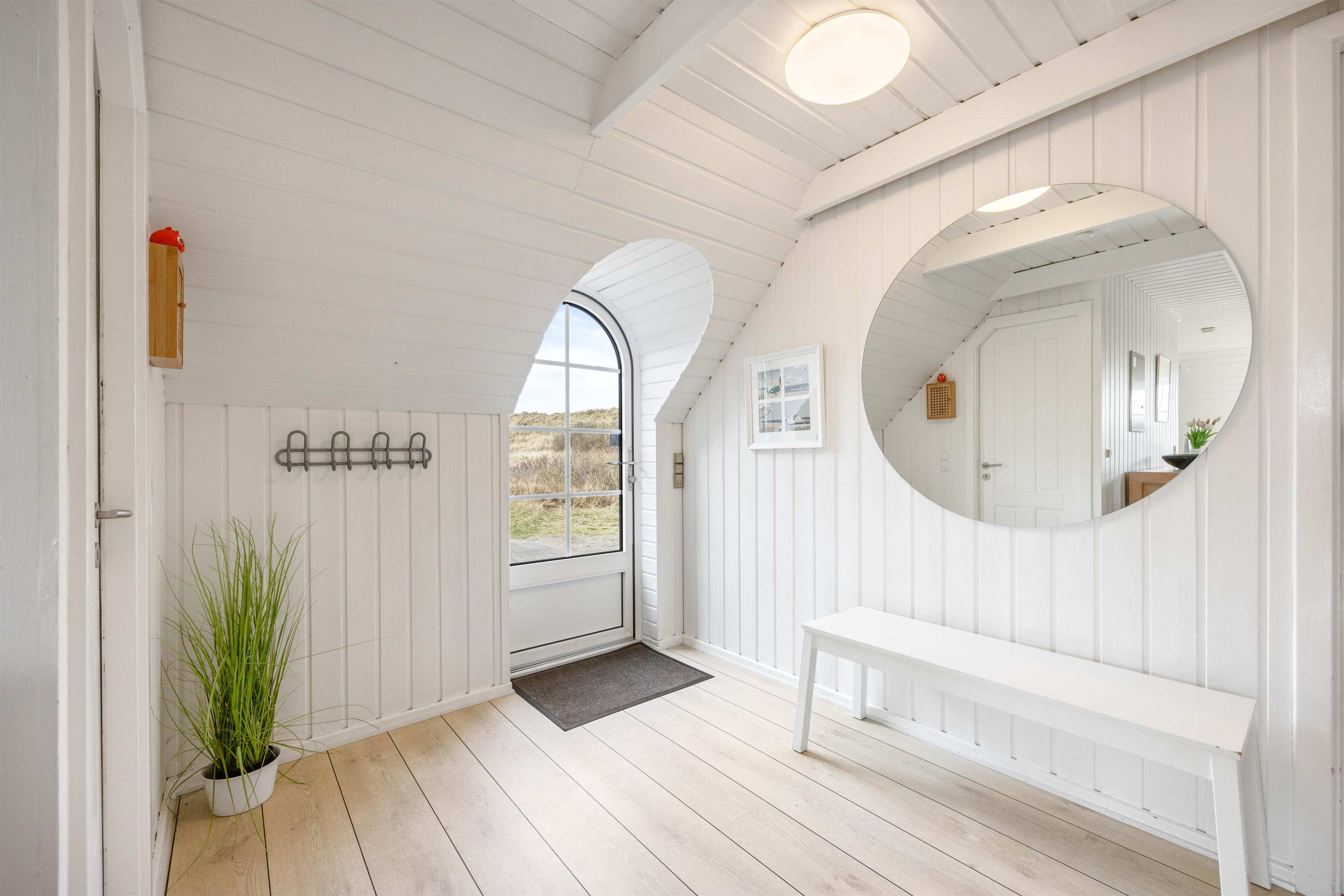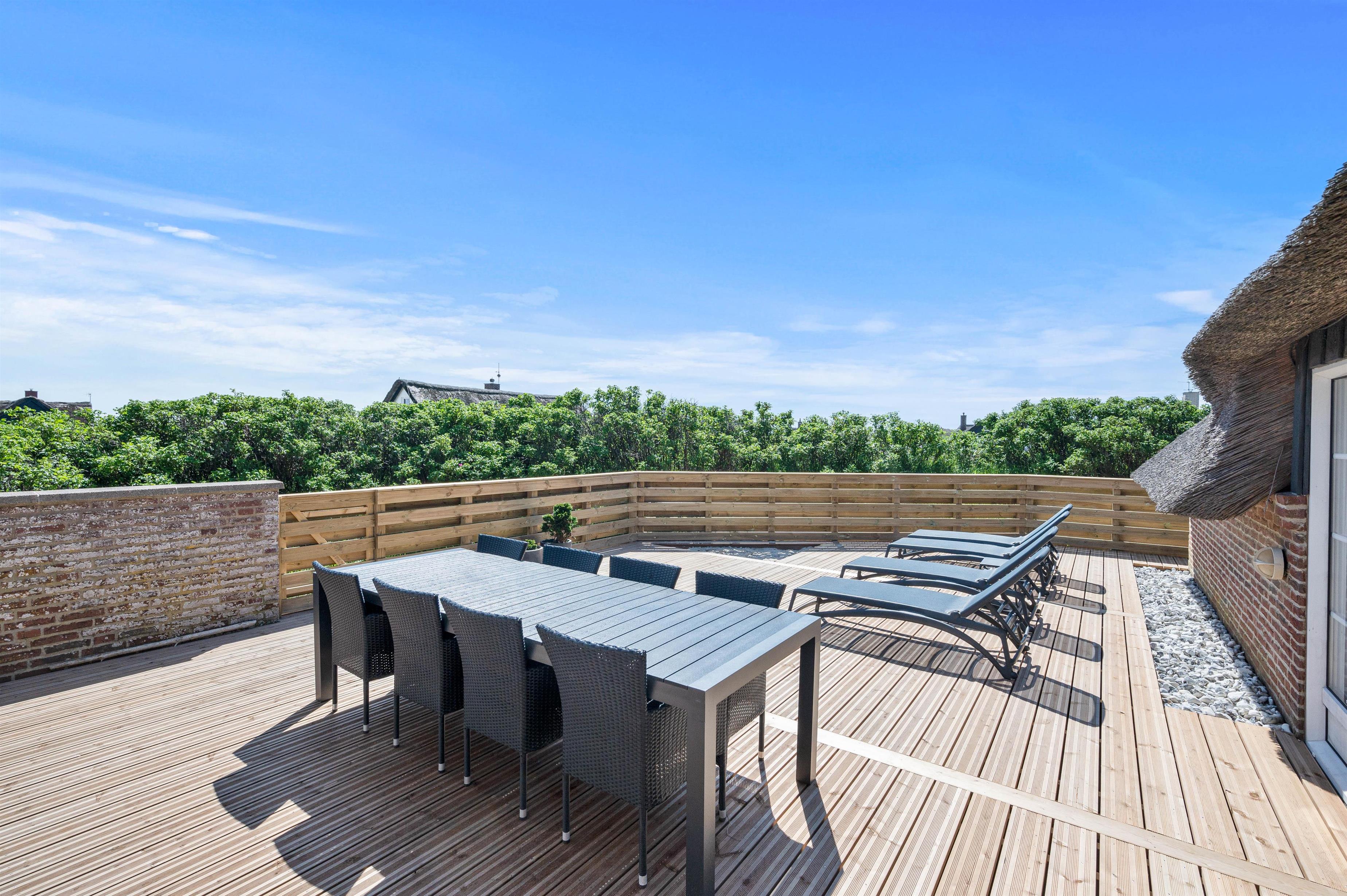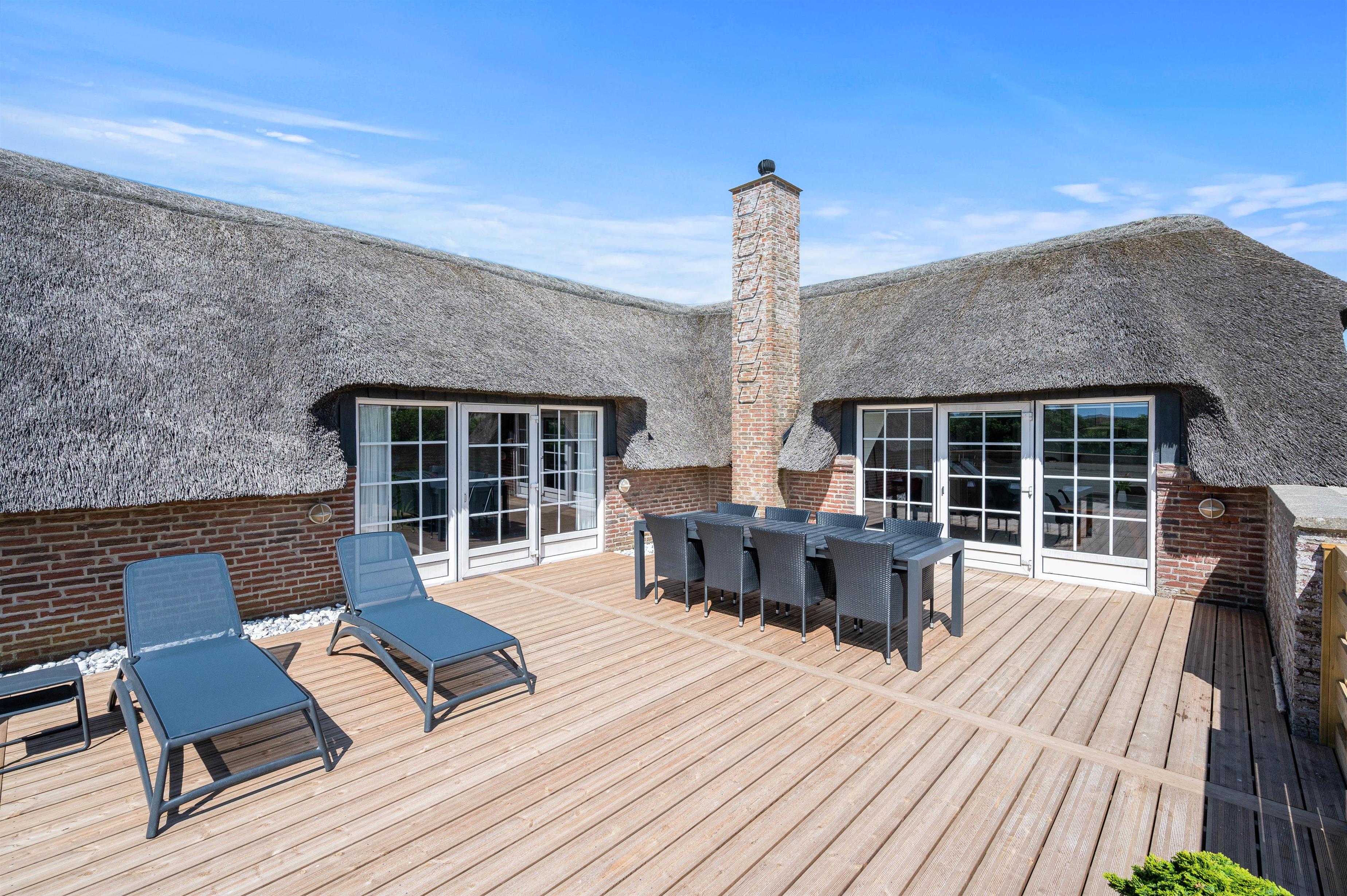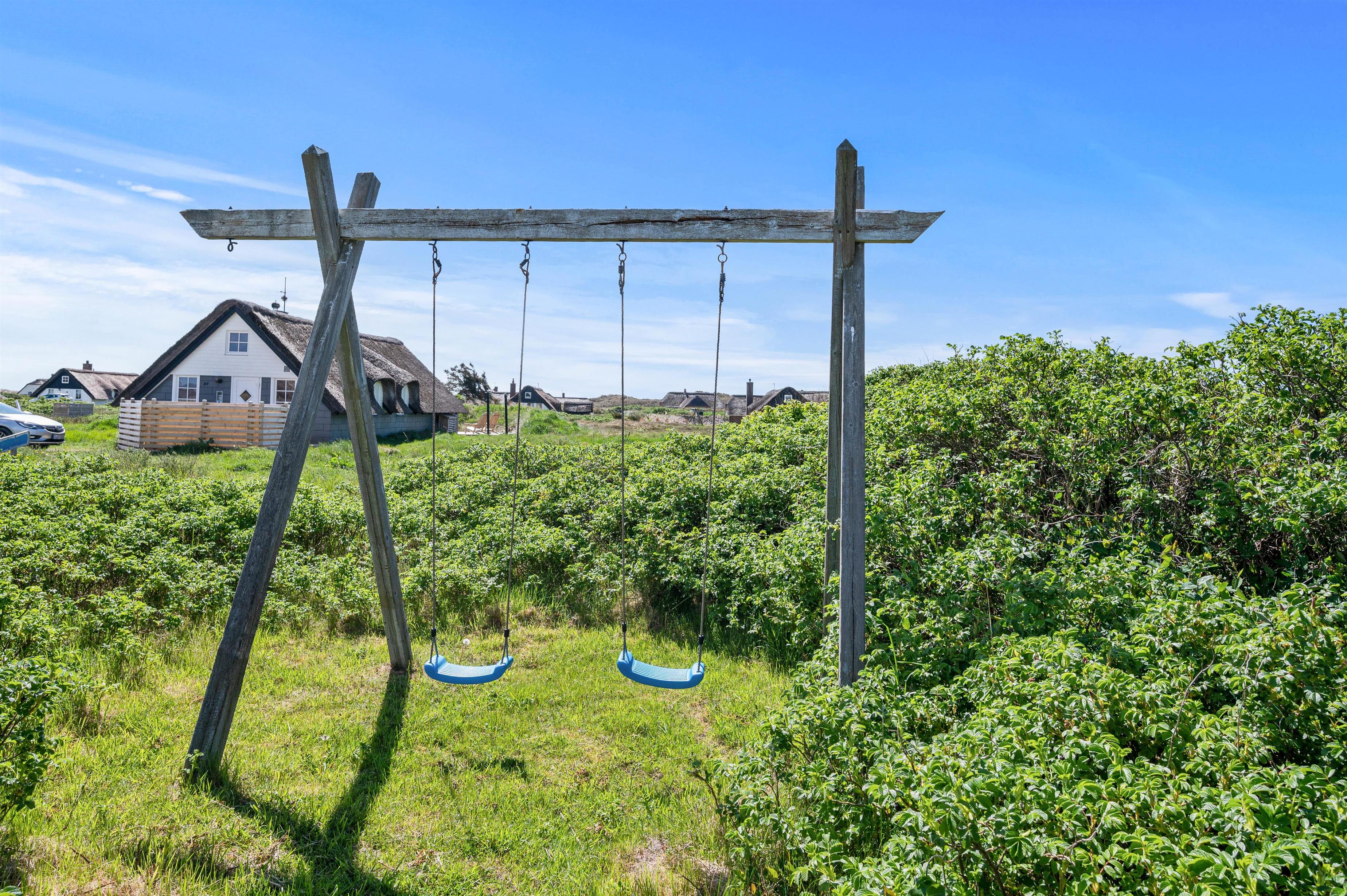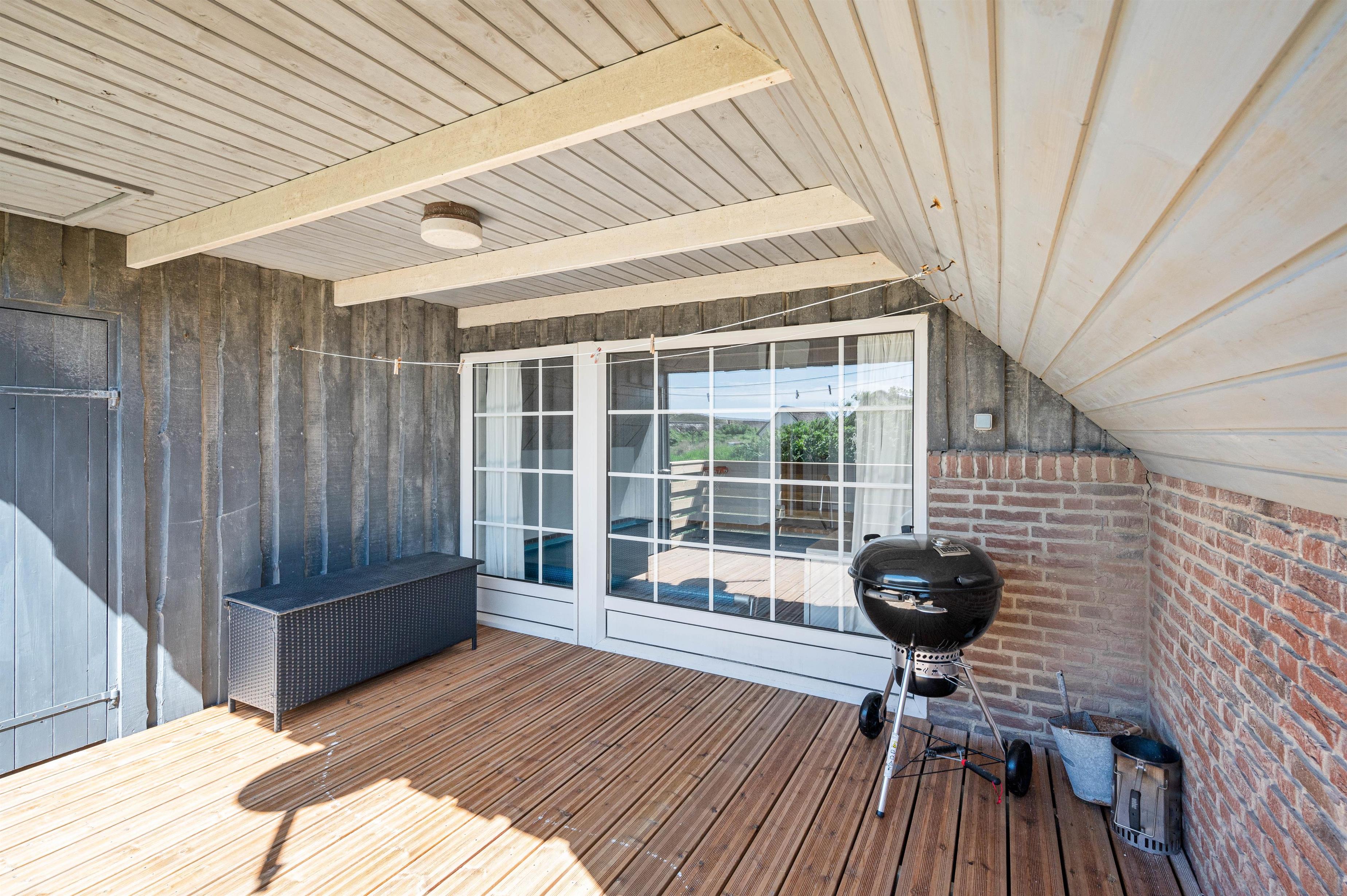 Udendørs har sommerhuset en skøn terrasse, der er delvist overdækket og lukket, og dermed har I mulighed for at sidde i ly og læ, når I er på terrassen. Her står der havemøbler og liggestole klar til jer, så I kan læne jer godt tilbage på en plads i solen, hvor I kan nyde det omkringliggende landskab og lyden af brændingen i baggrunden.