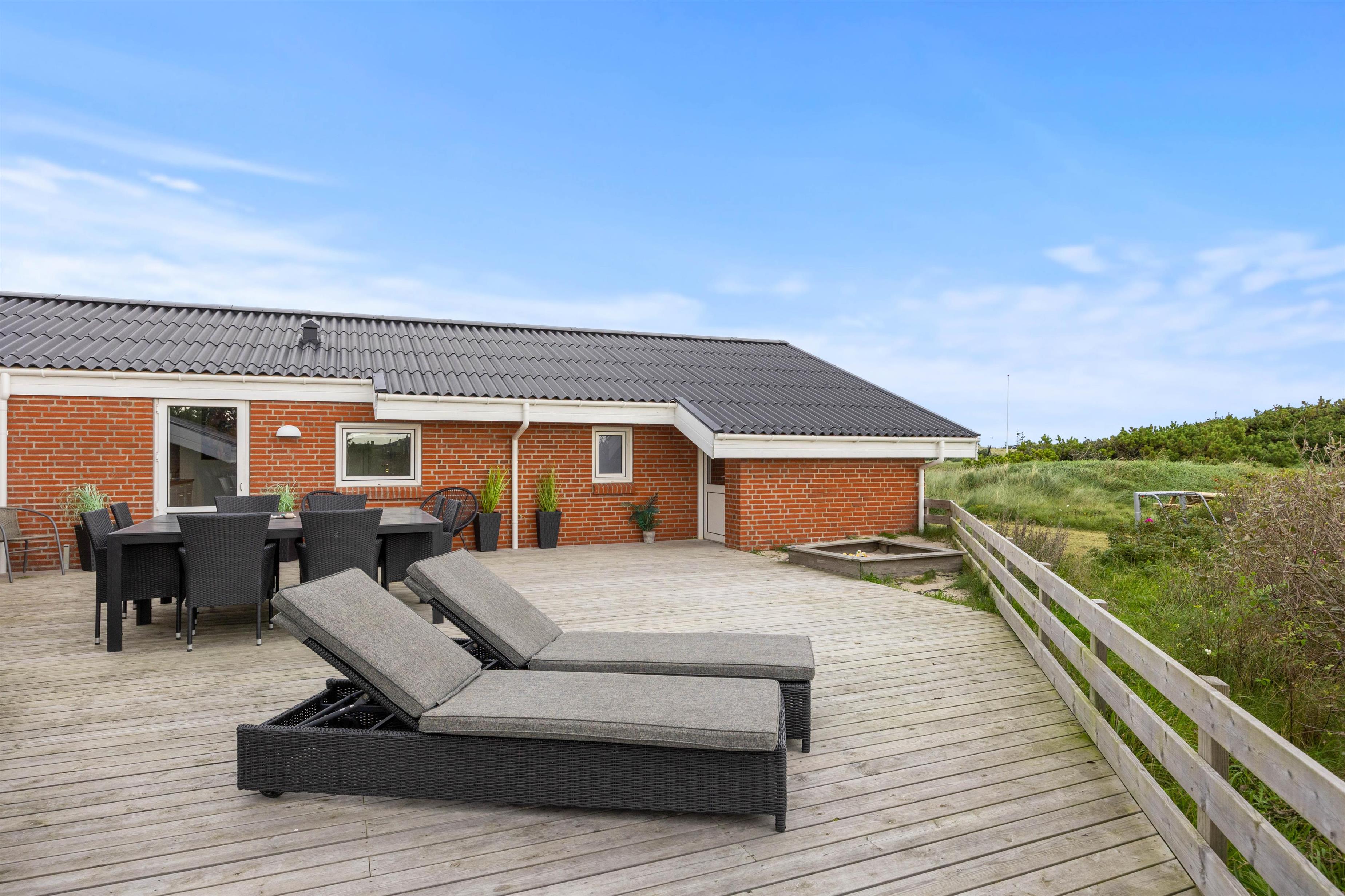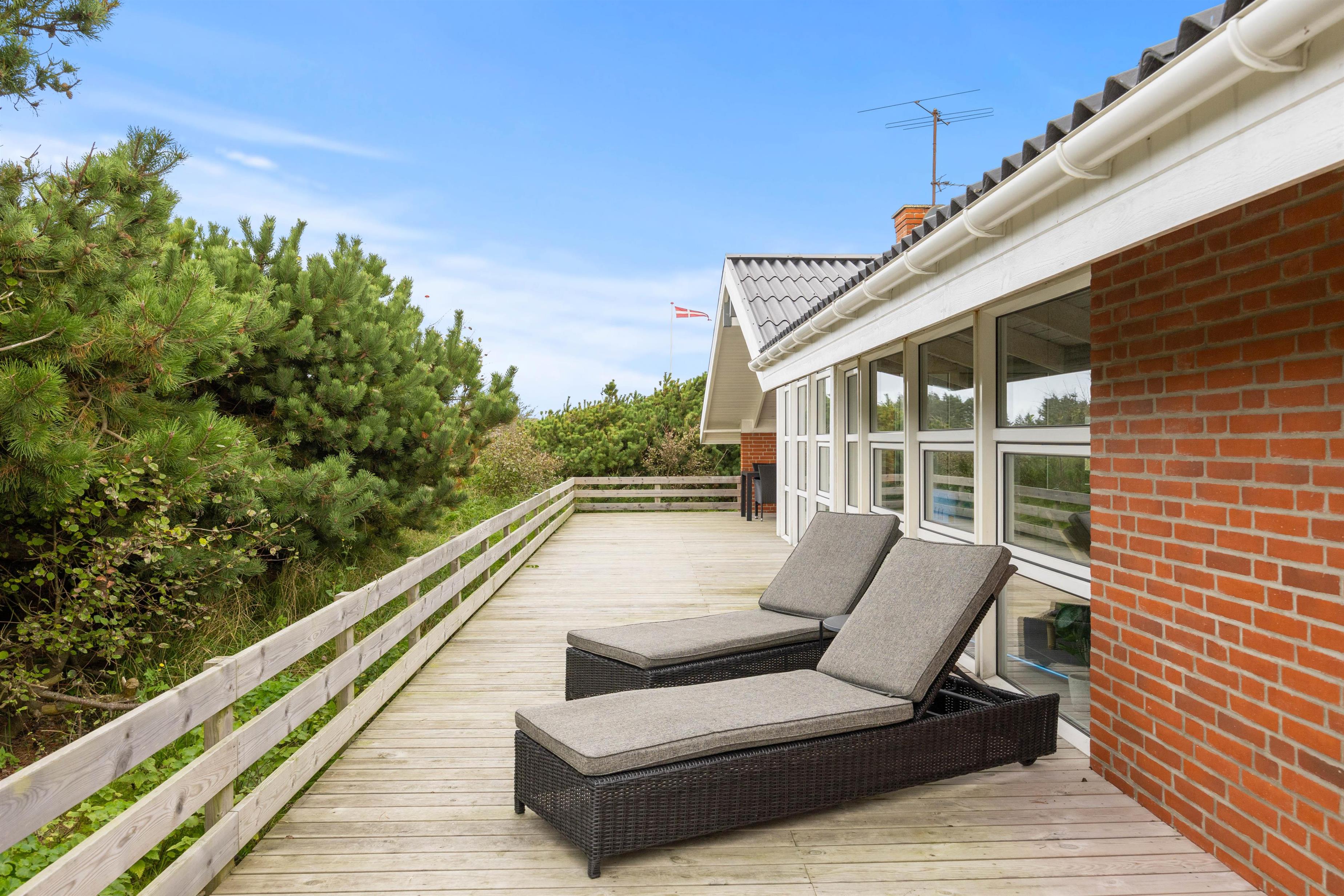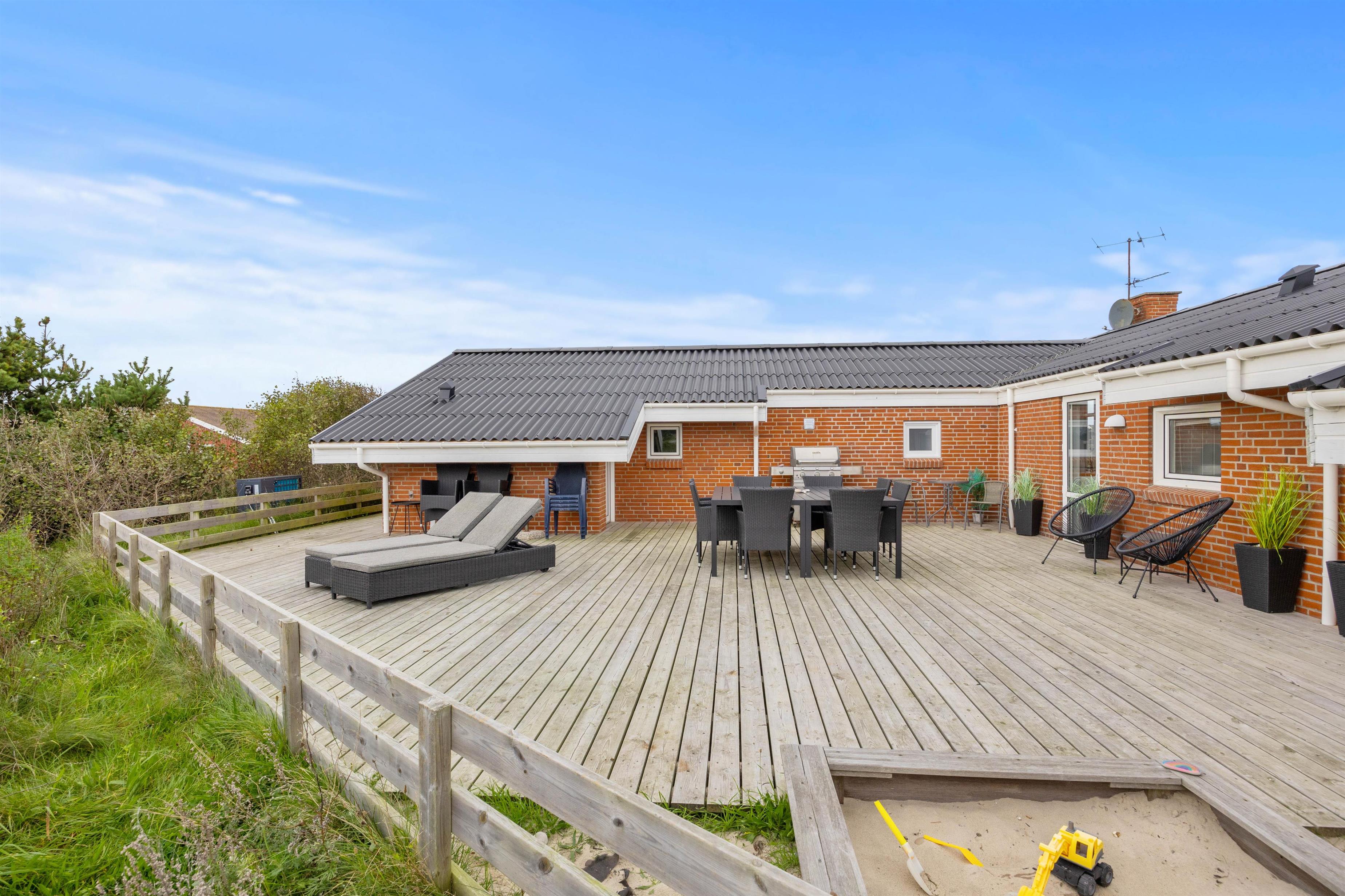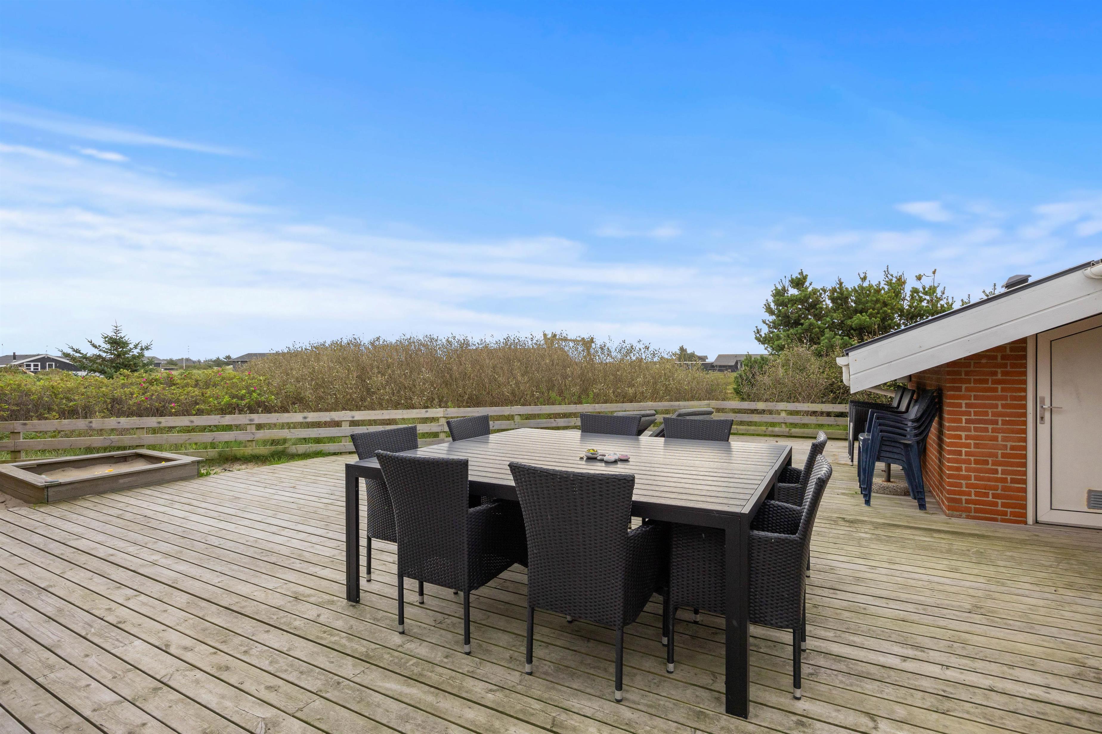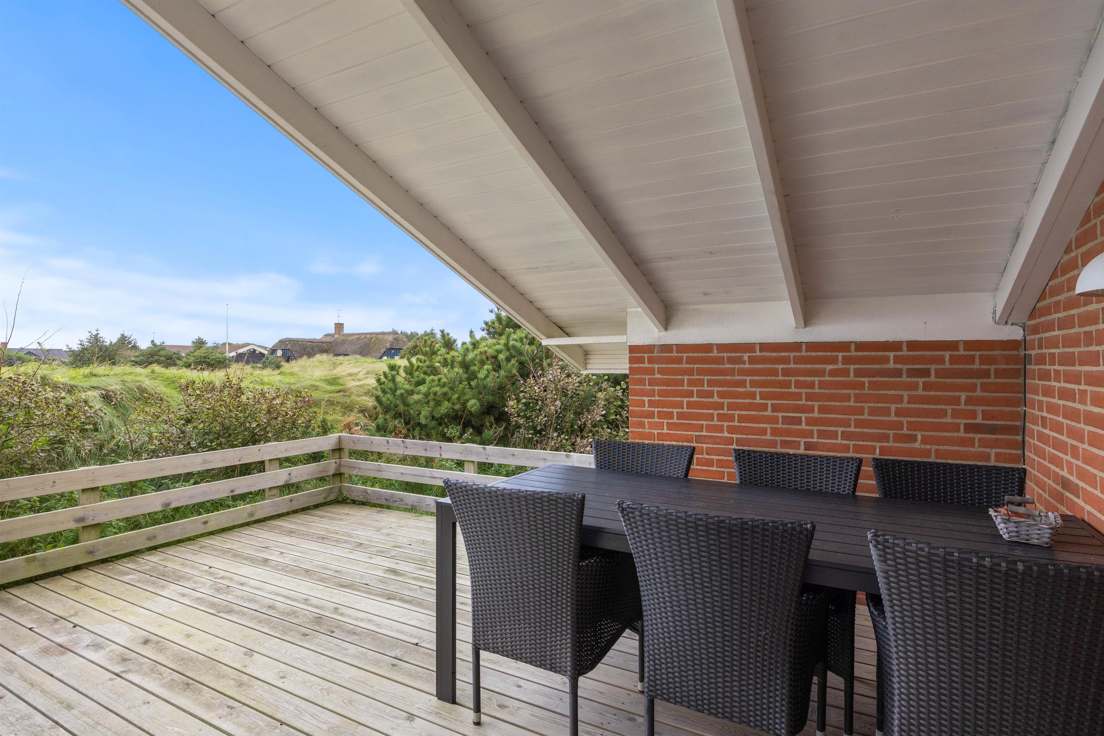 Tilhørende sommerhuset er der en stor træterrasse, hvor I kan tilbringe feriens varme og solrige dage. Her kan I nyde udsigten til den omkringliggende og karakteristiske natur, hvor klitter og hedearealer er dominerende. I har både havemøbler, liggestole og gasgrill til rådighed.