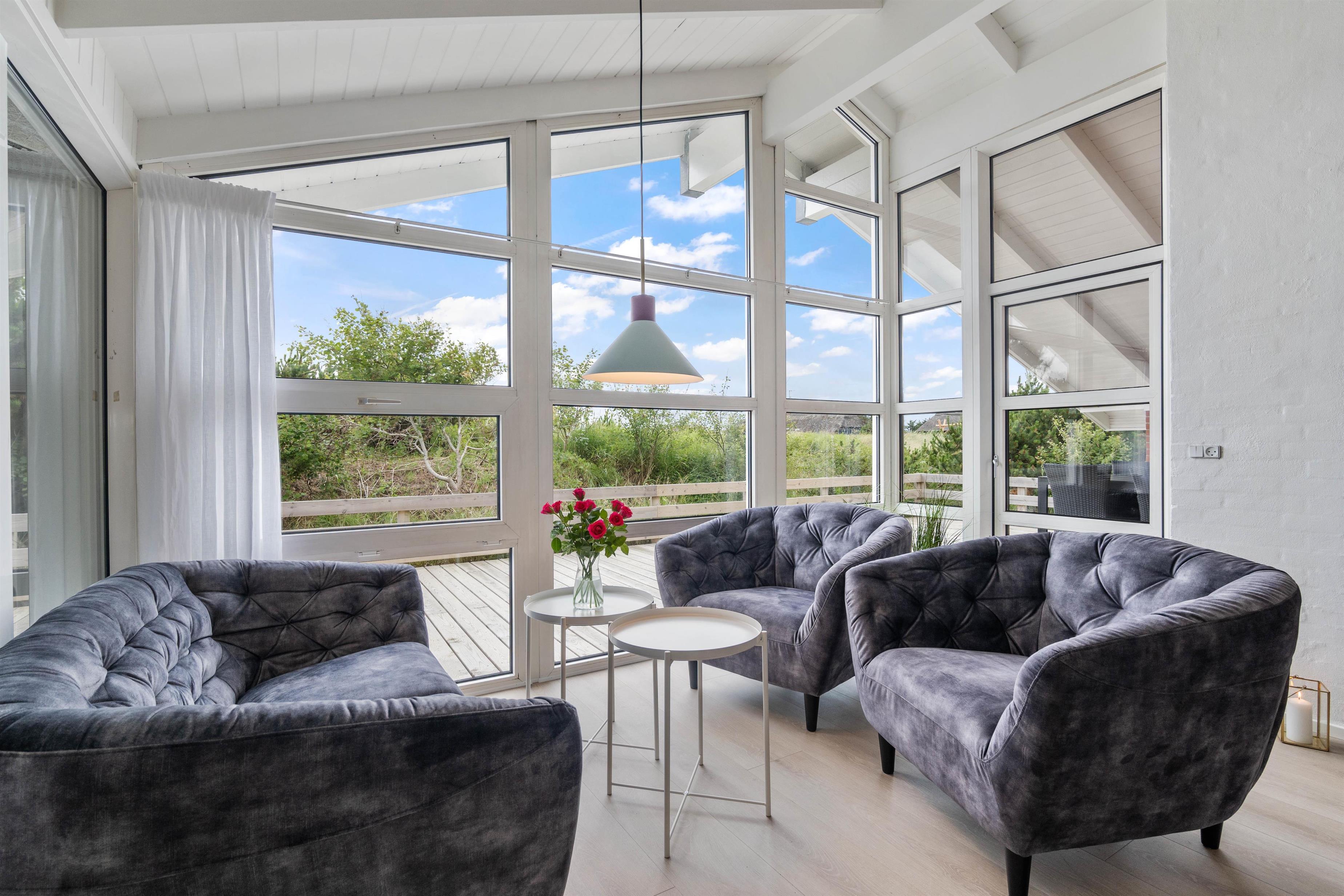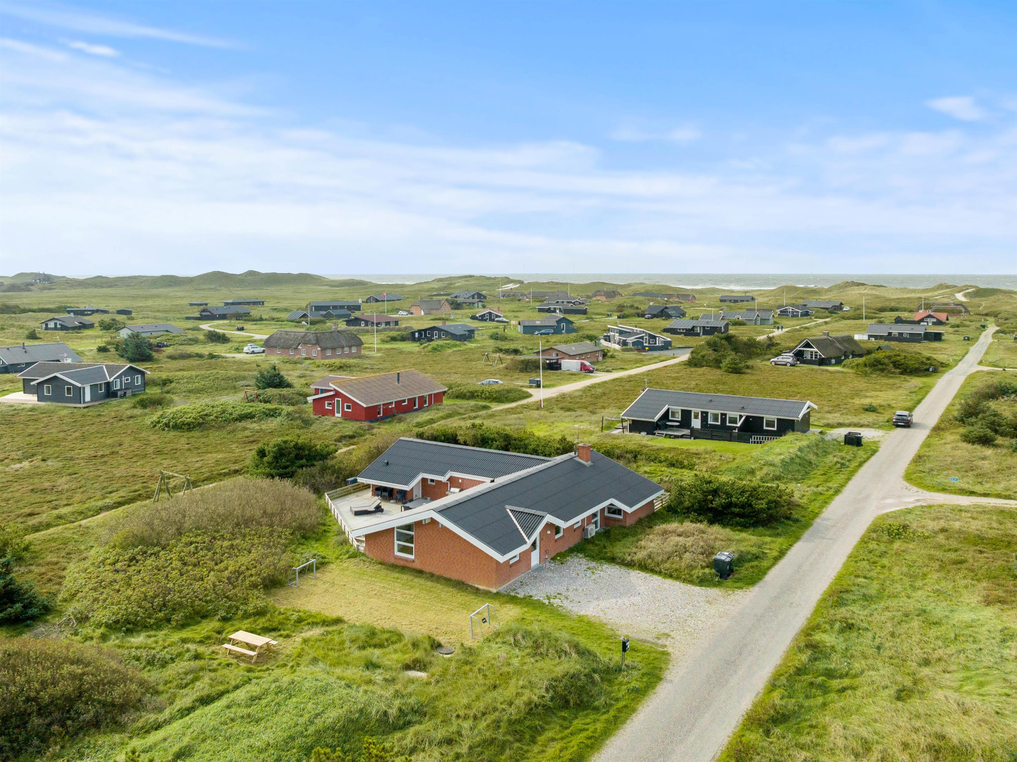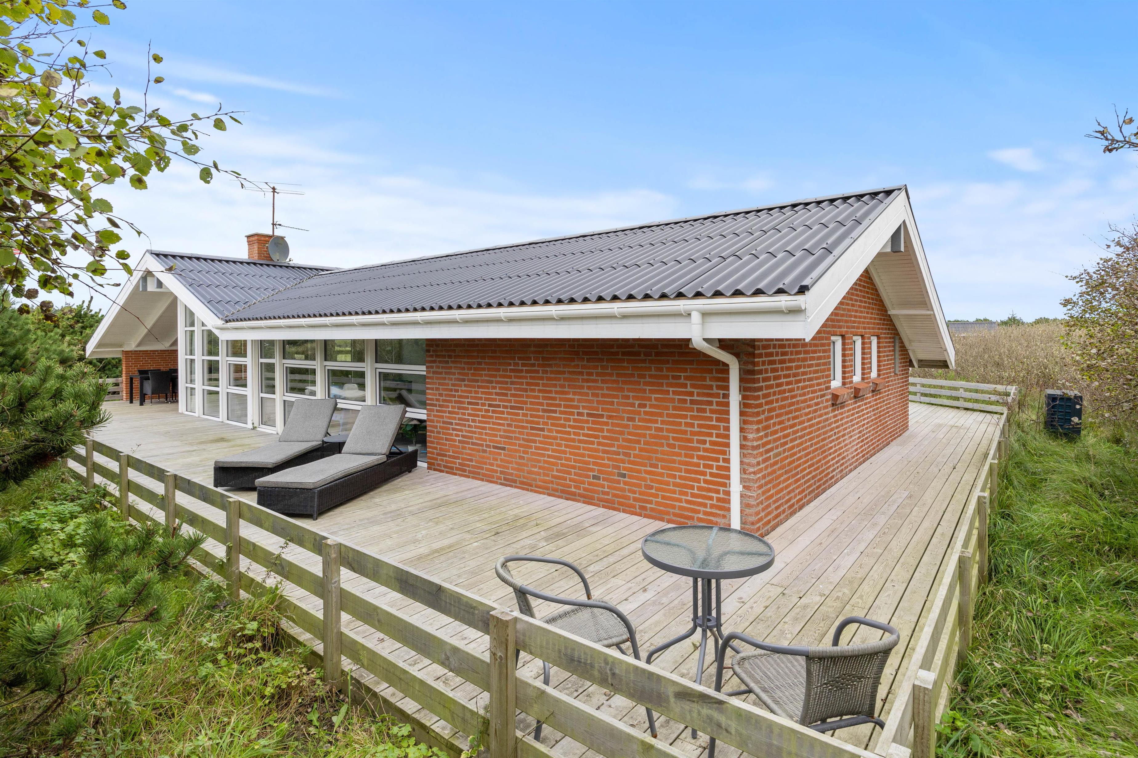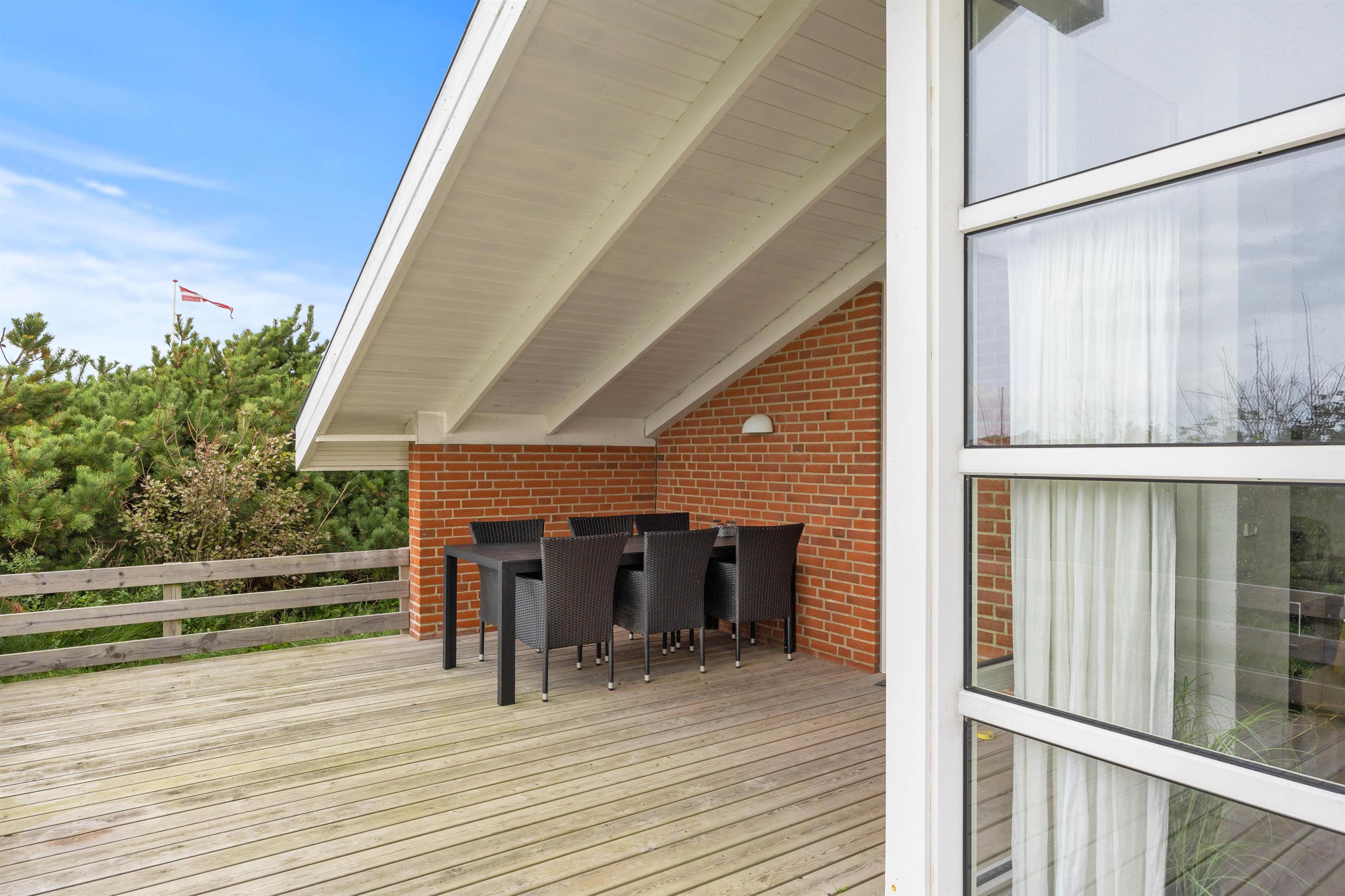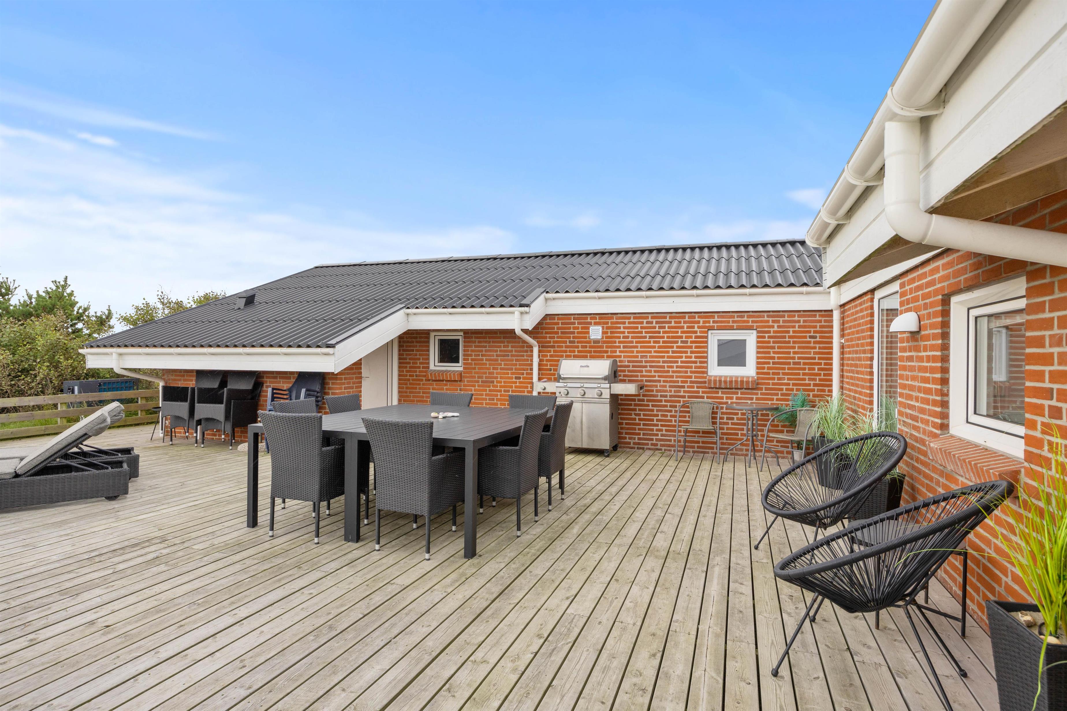 Tilhørende sommerhuset er der en stor træterrasse, hvor I kan tilbringe feriens varme og solrige dage. Her kan I nyde udsigten til den omkringliggende og karakteristiske natur, hvor klitter og hedearealer er dominerende. I har både havemøbler, liggestole og gasgrill til rådighed.