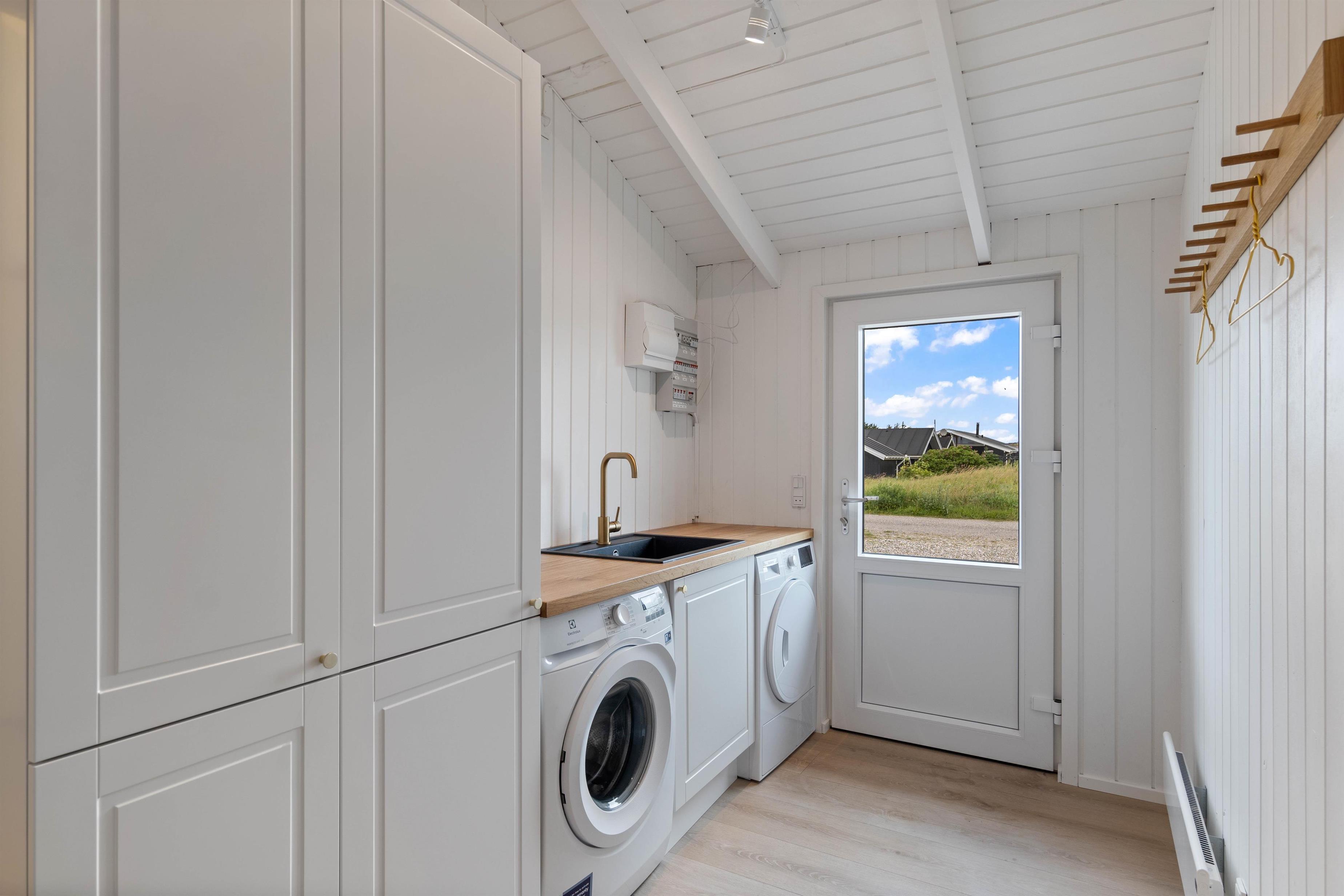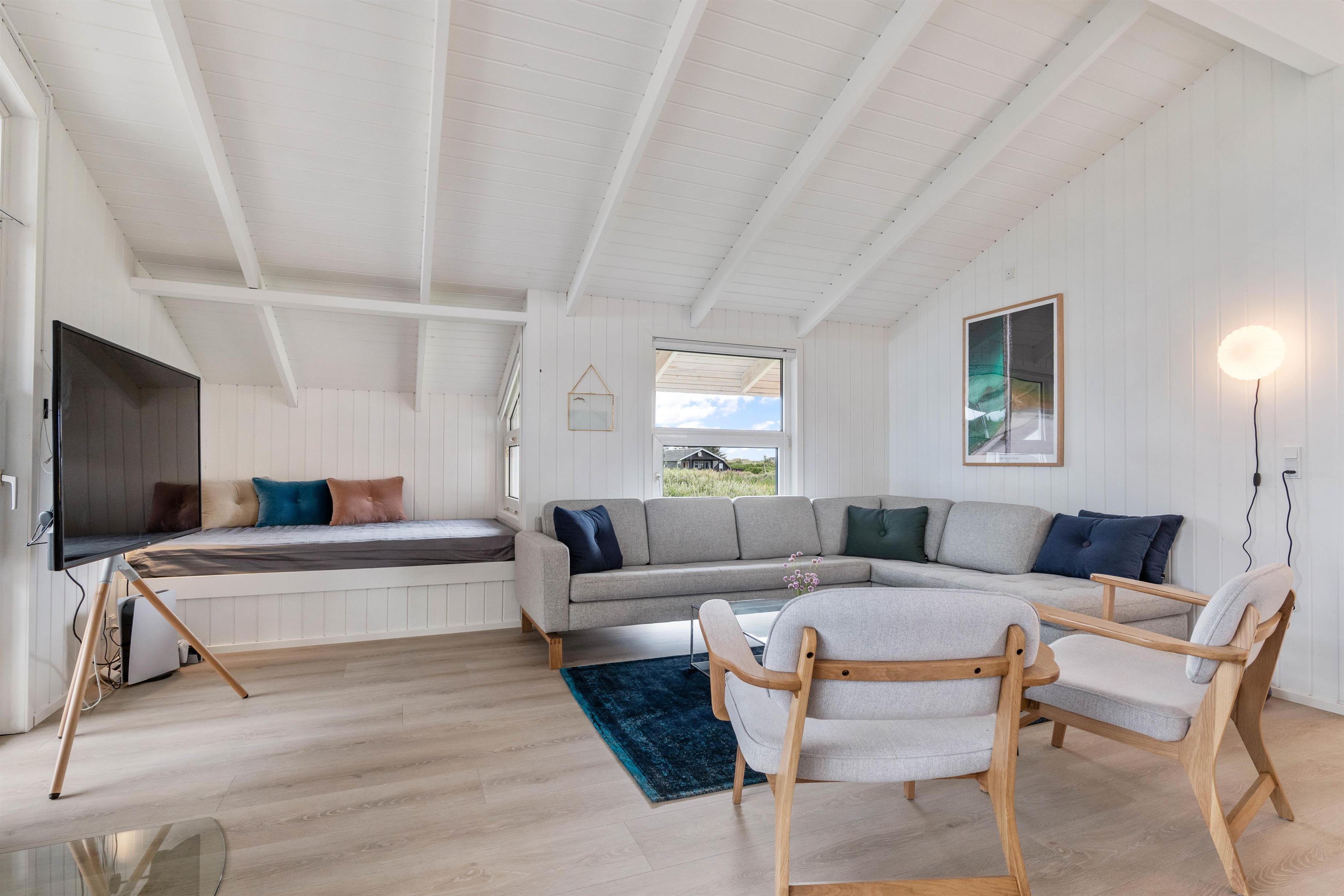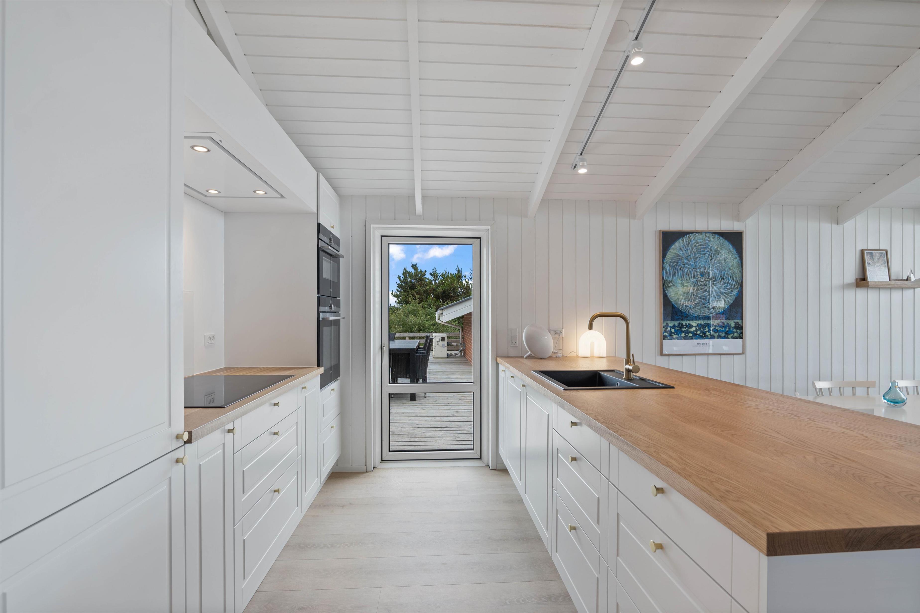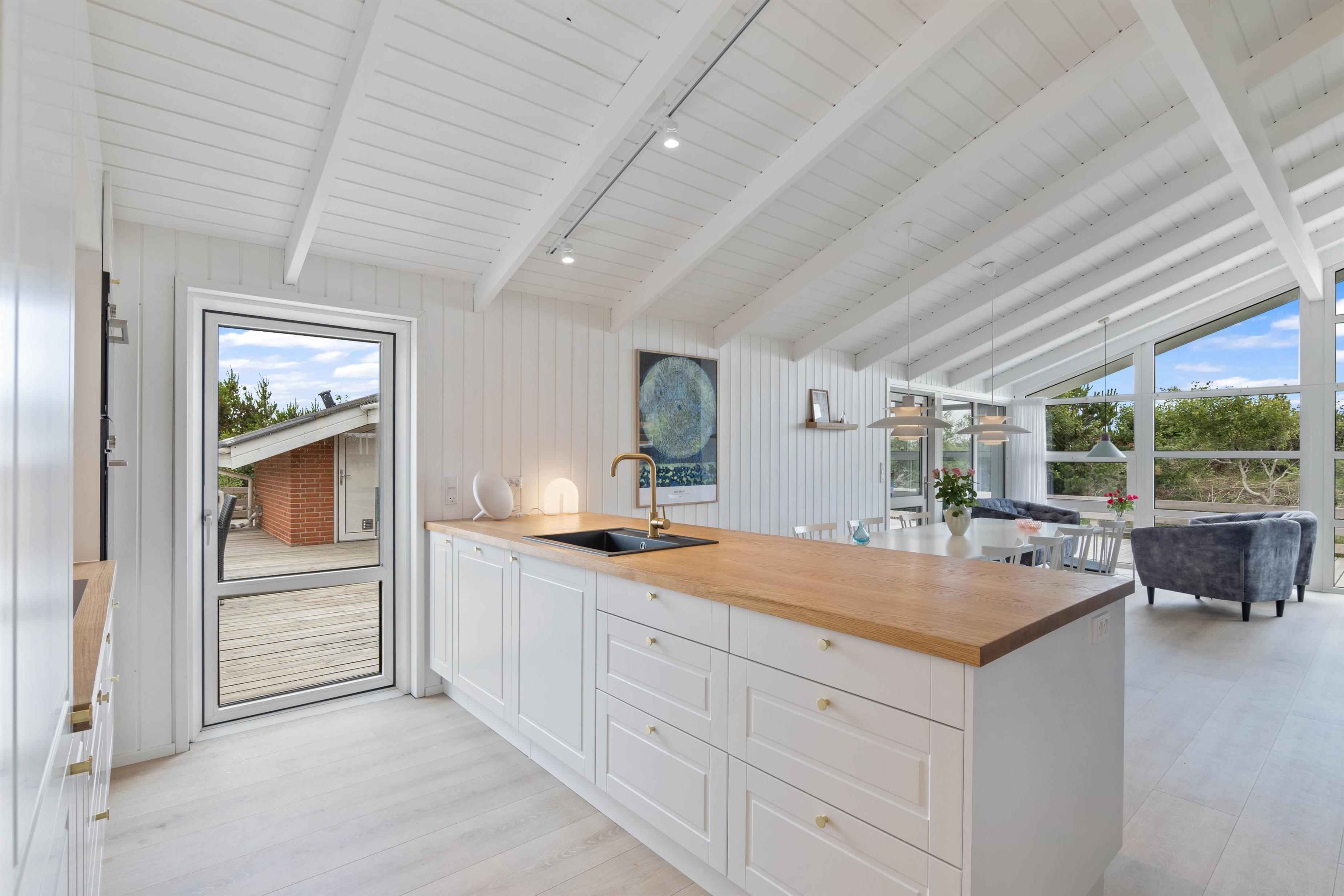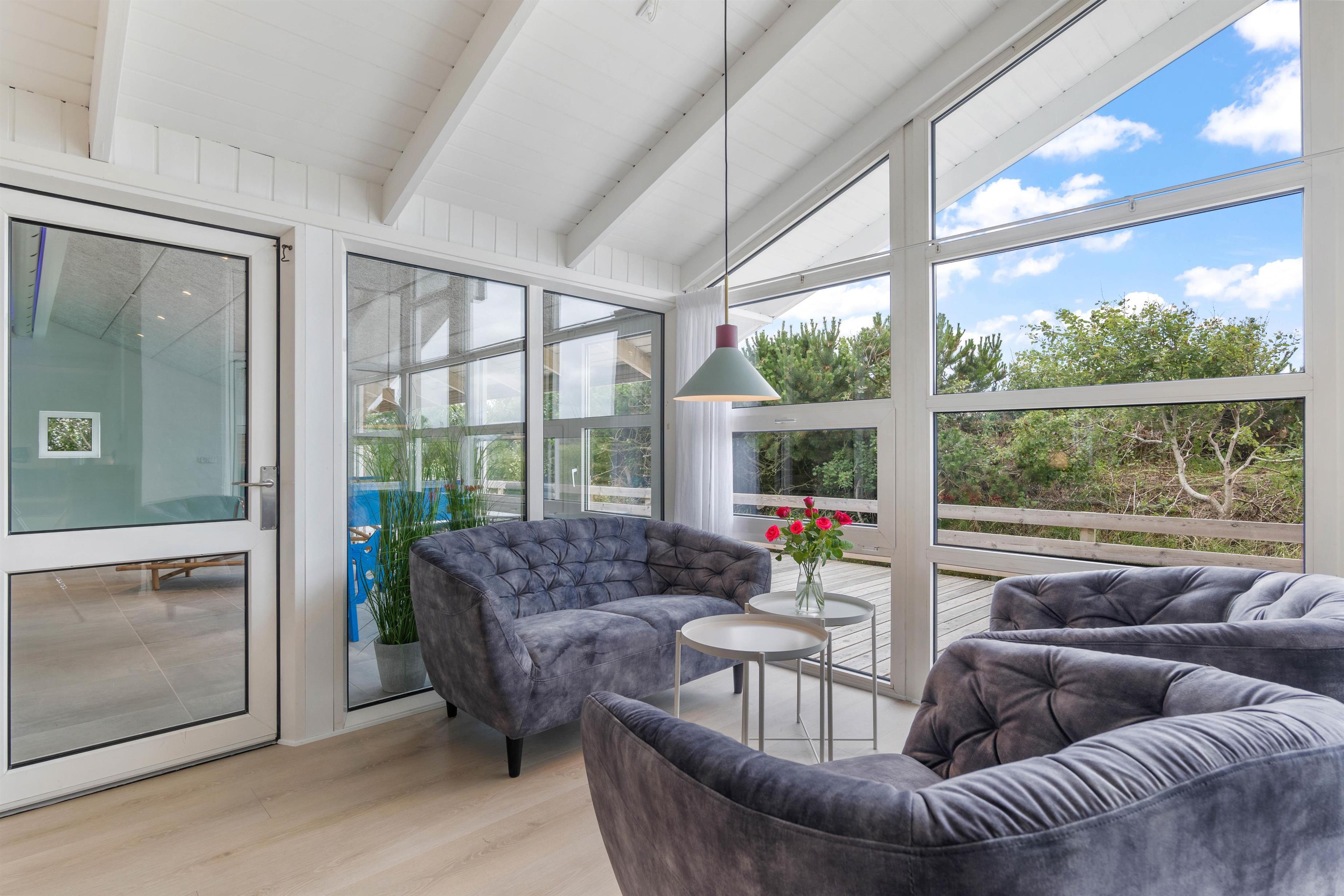 Tilhørende sommerhuset er der en stor træterrasse, hvor I kan tilbringe feriens varme og solrige dage. Her kan I nyde udsigten til den omkringliggende og karakteristiske natur, hvor klitter og hedearealer er dominerende. I har både havemøbler, liggestole og gasgrill til rådighed.
