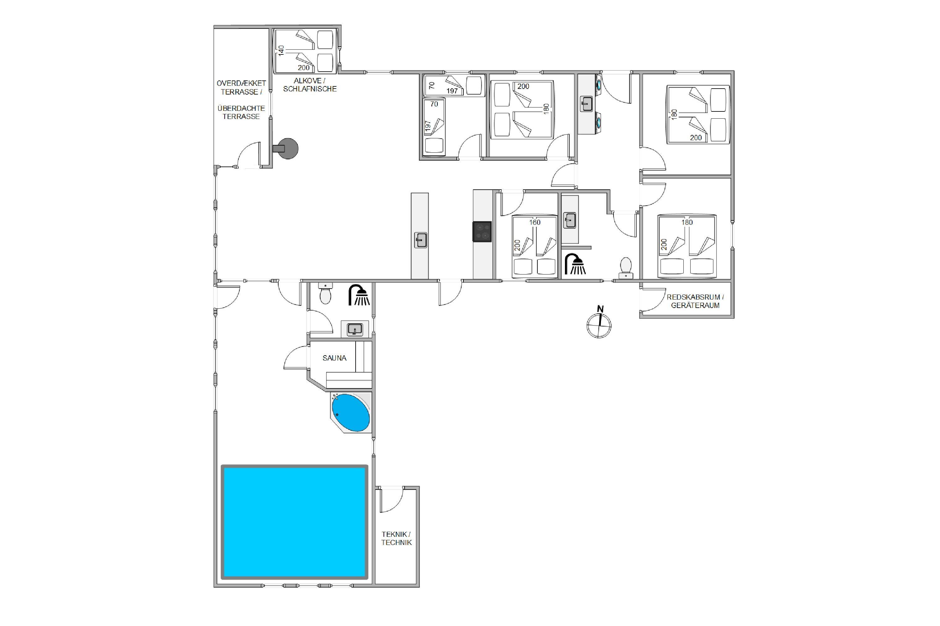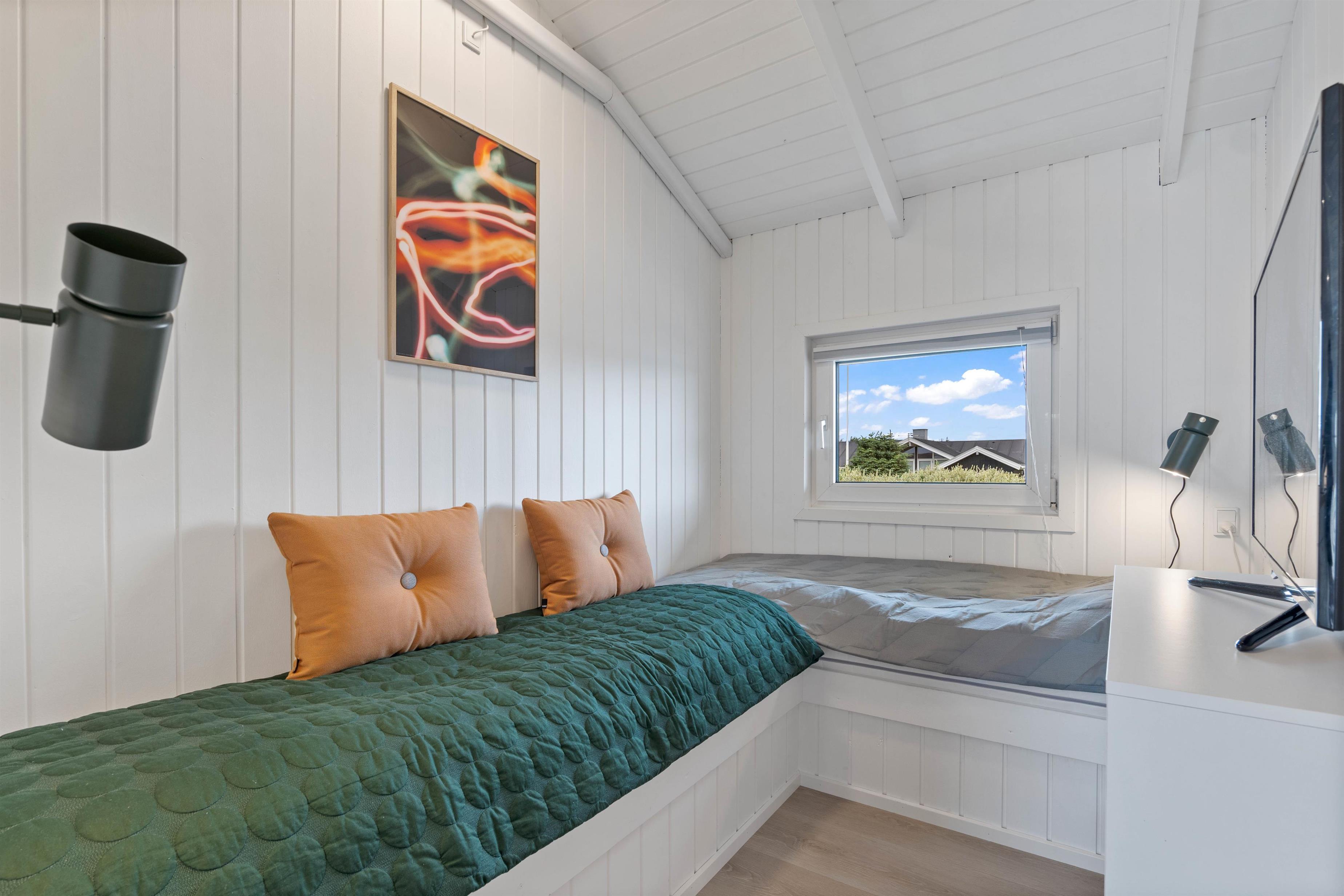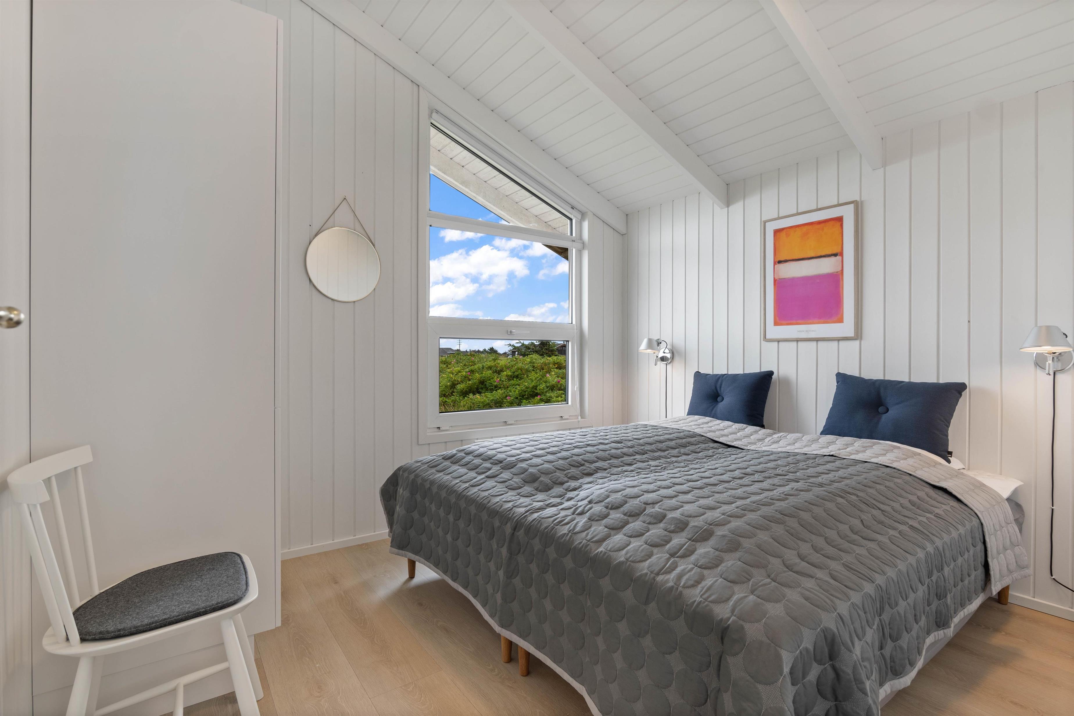 Når I efterhånden ikke har mere energi tilbage, kan I søge mod sommerhusets soveværelser. I det 191 kvadratmeter store sommerhus er der 5 soveværelser, der i alt er indrettet med 4 dobbeltsenge og 2 enkeltsenge, hvor I kan få jeres skønhedssøvn. I 2 af soveværelserne finder I desuden et lille skrivebord, hvor I blandt andet kan finde ro til at læse en god bog. Med hele 2 badeværelser slipper I for at stå i kø, når I står op næste morgen.