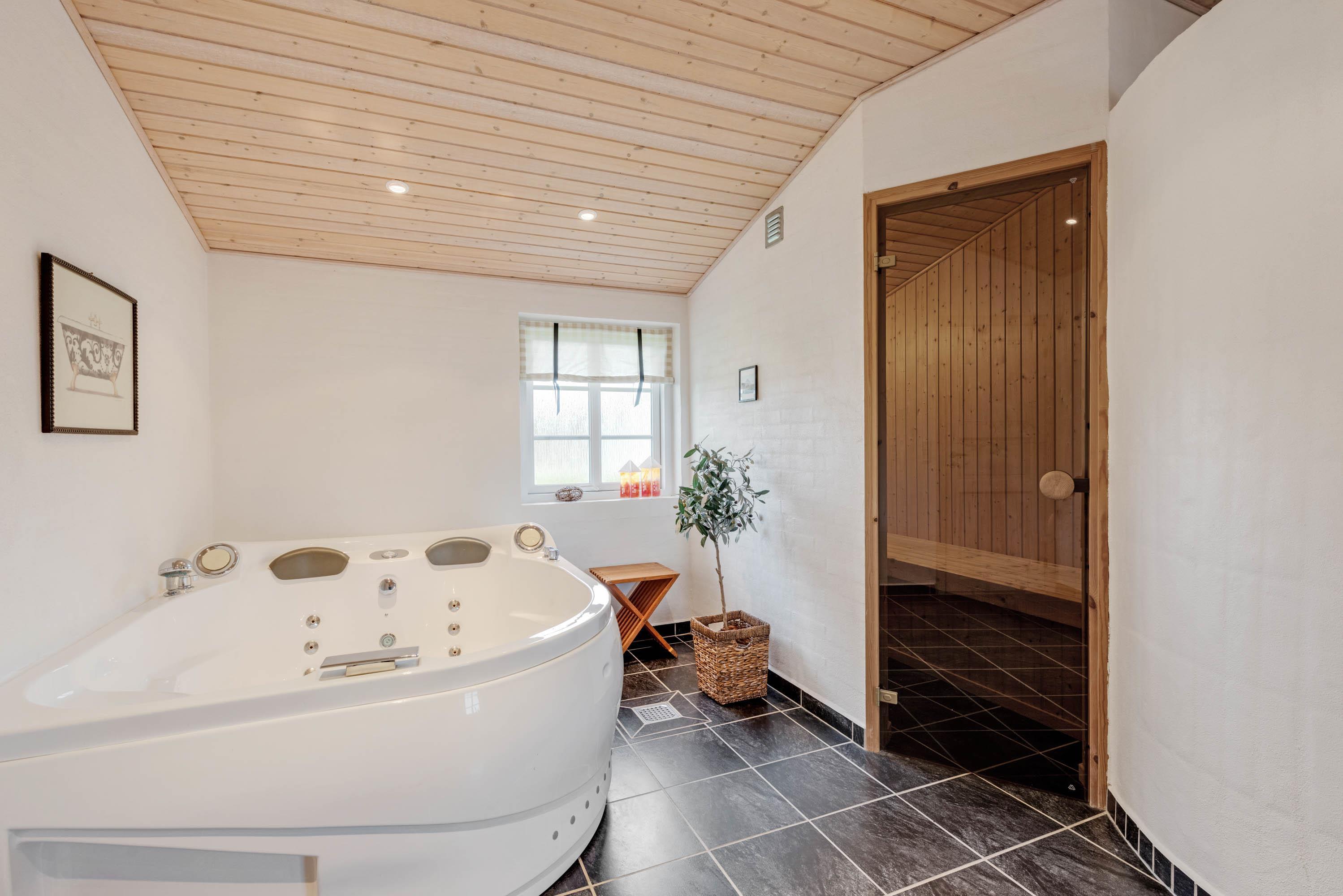 Indbydende og praktisk indretning med sauna, spabad og brændeovn