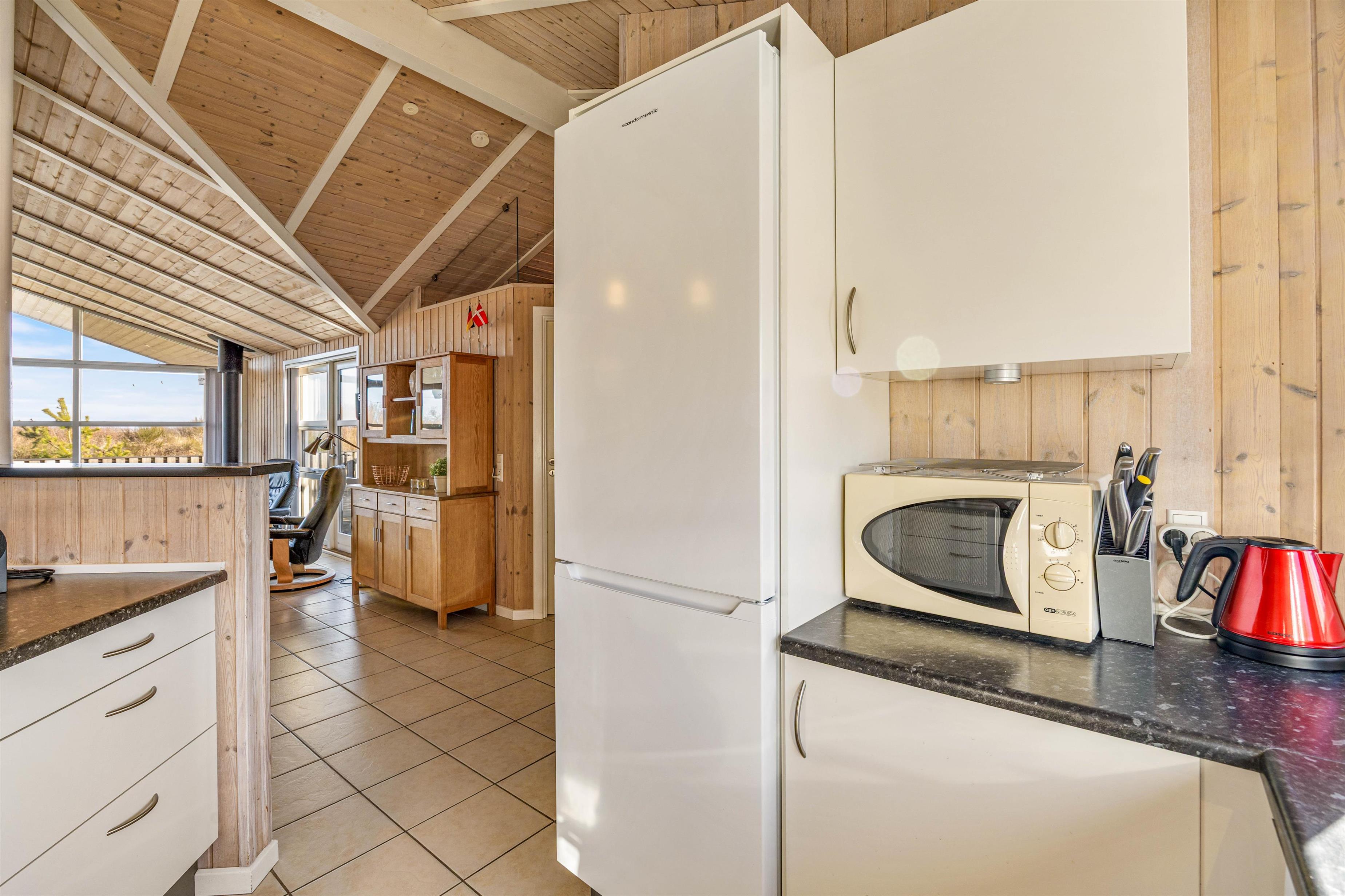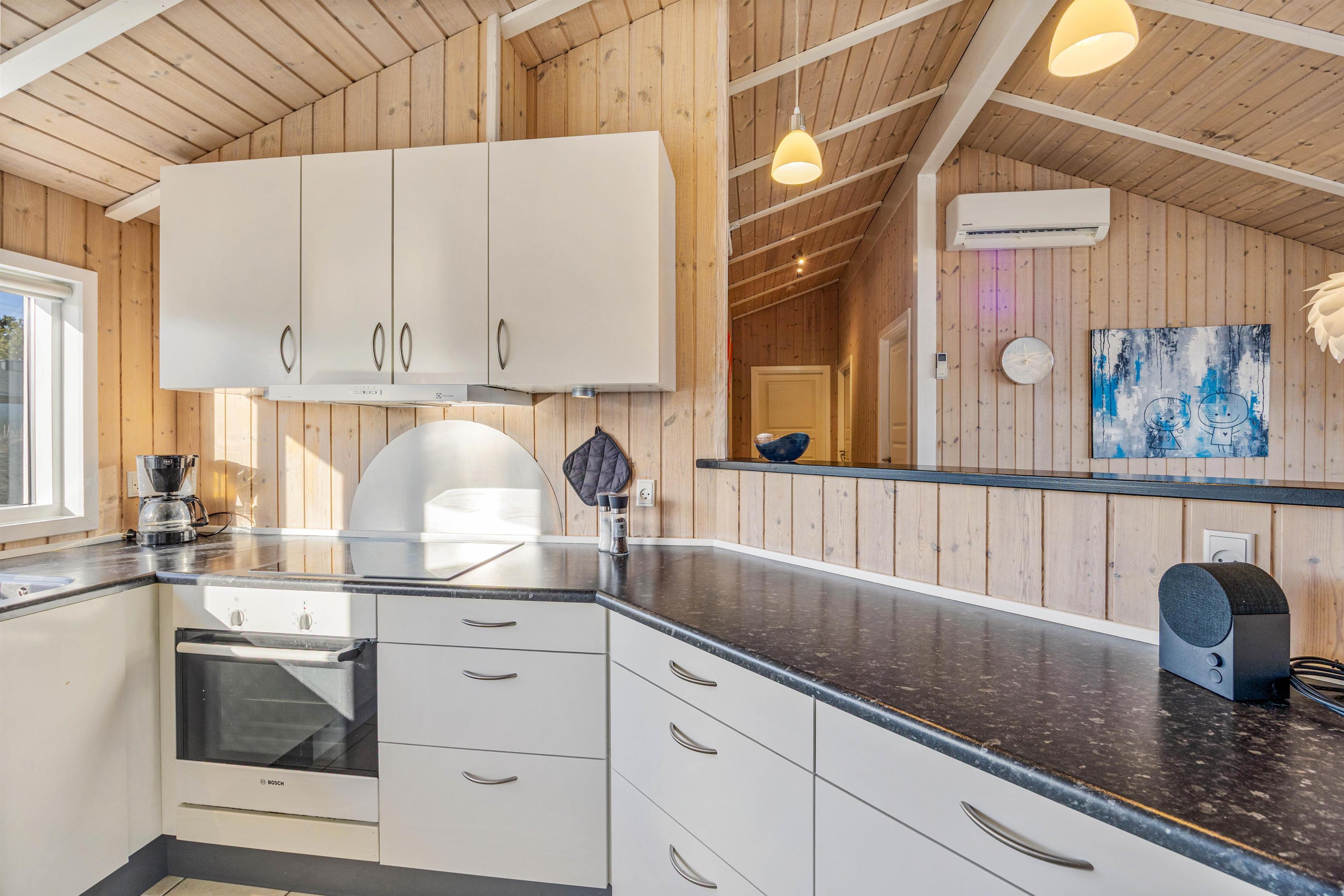 Da sommerhuset har plads til 8 personer, har I mulighed for at nyde ferien med hele familien. Det store køkkenalrum inviterer til hygge og socialt samvær foran feriehusets brændeovn. I stuen er der store gulv-til-loft vinduer, så I får den bedste udsigt til den vestjyske natur.