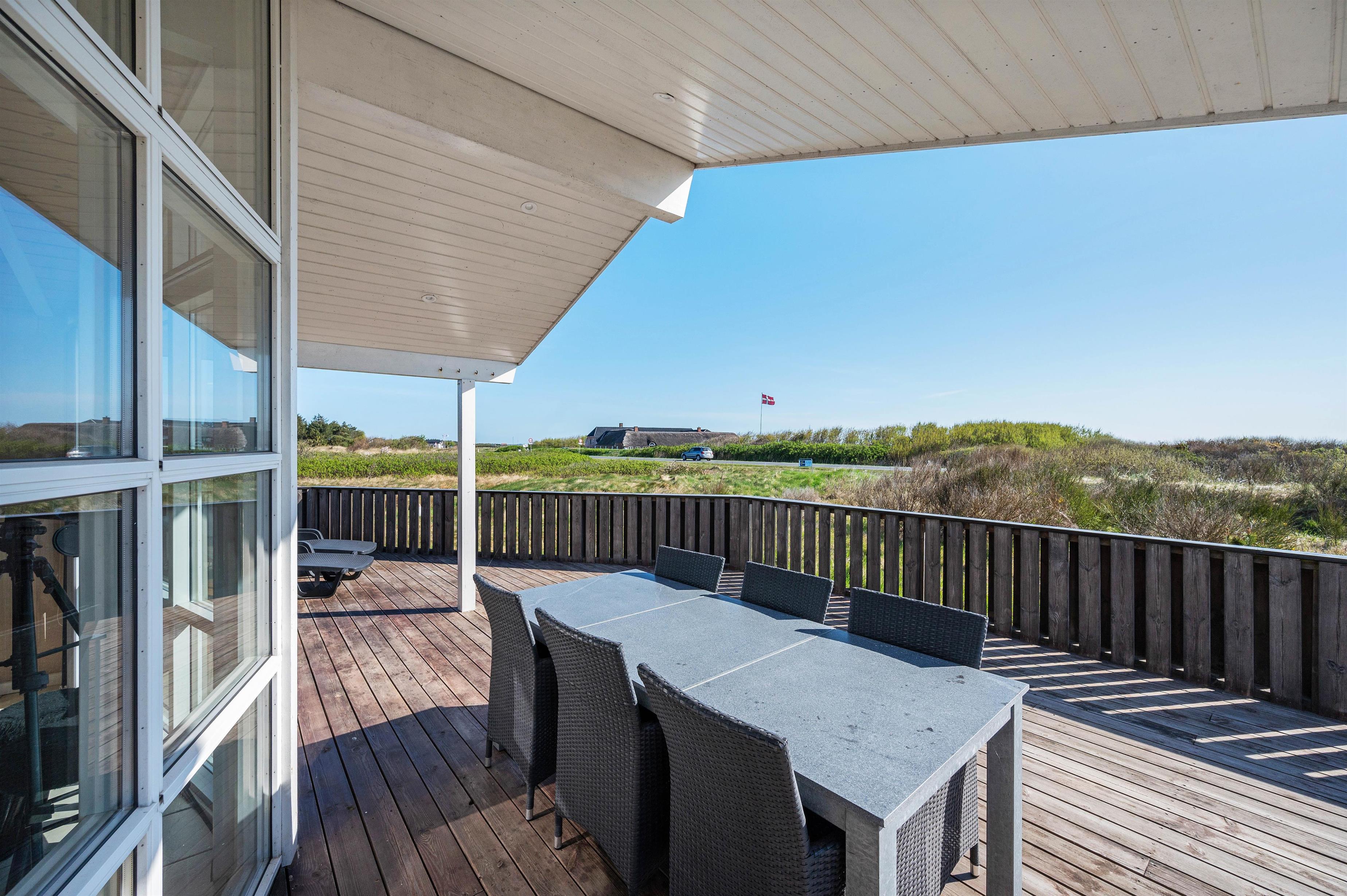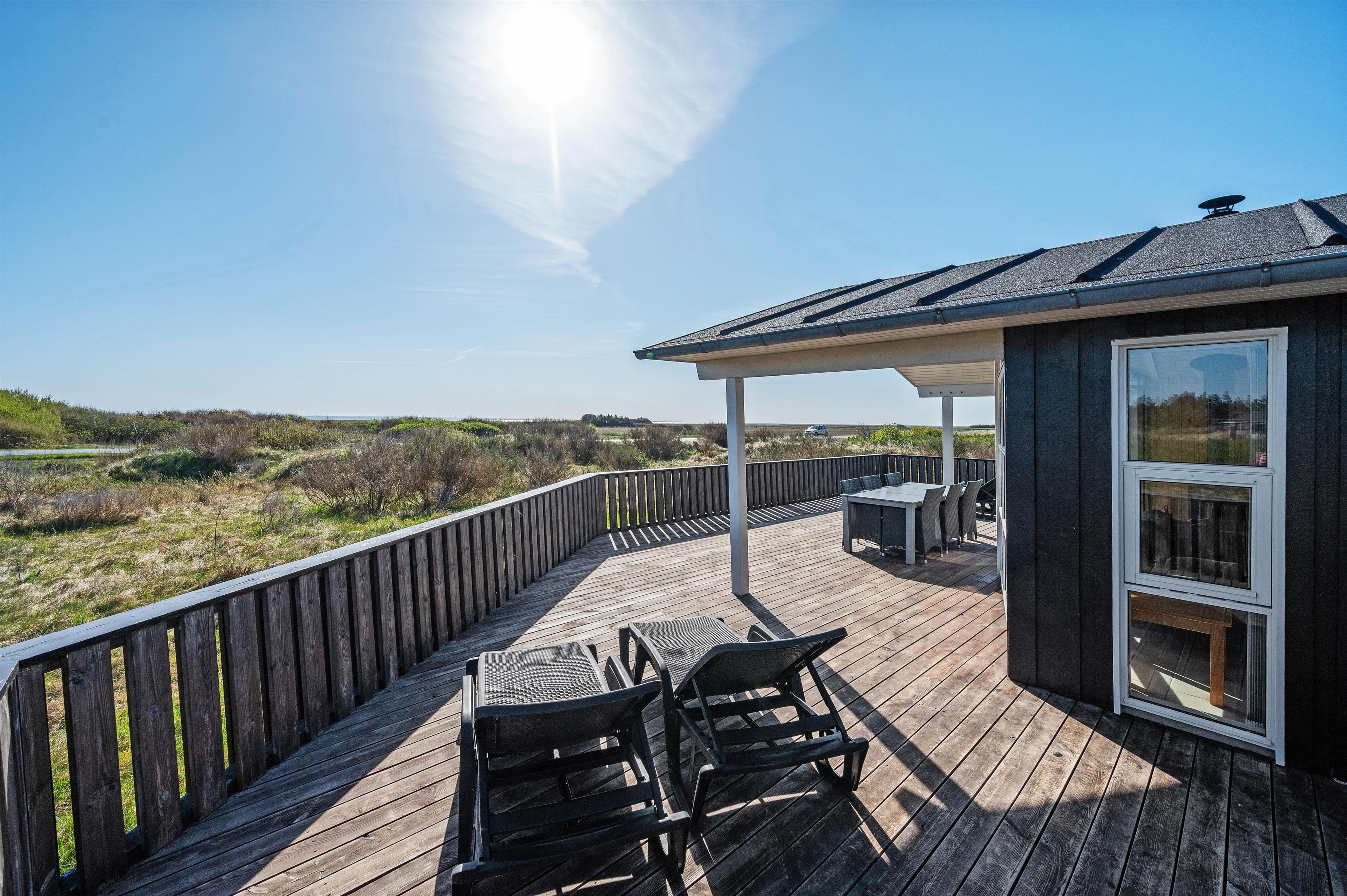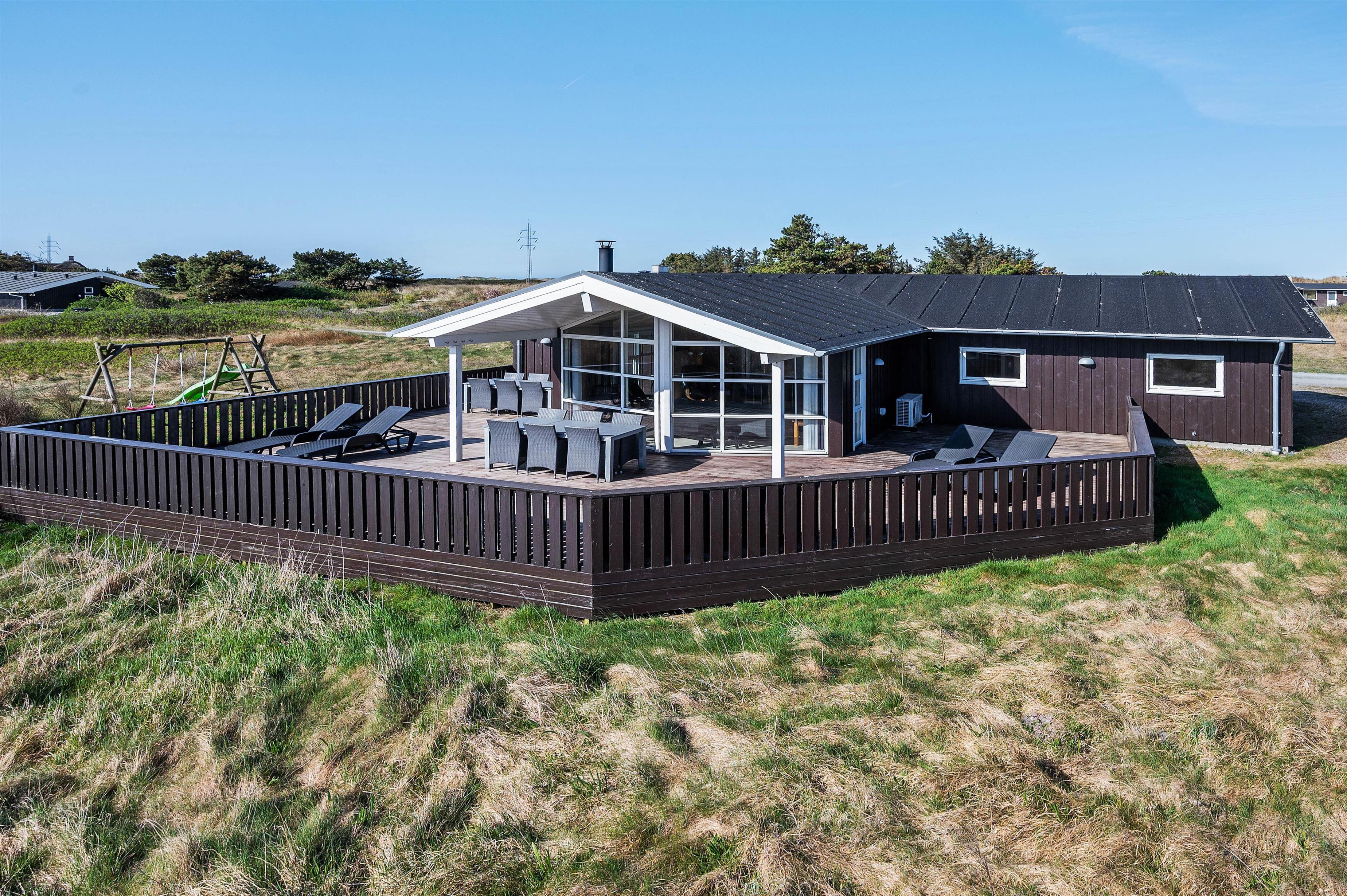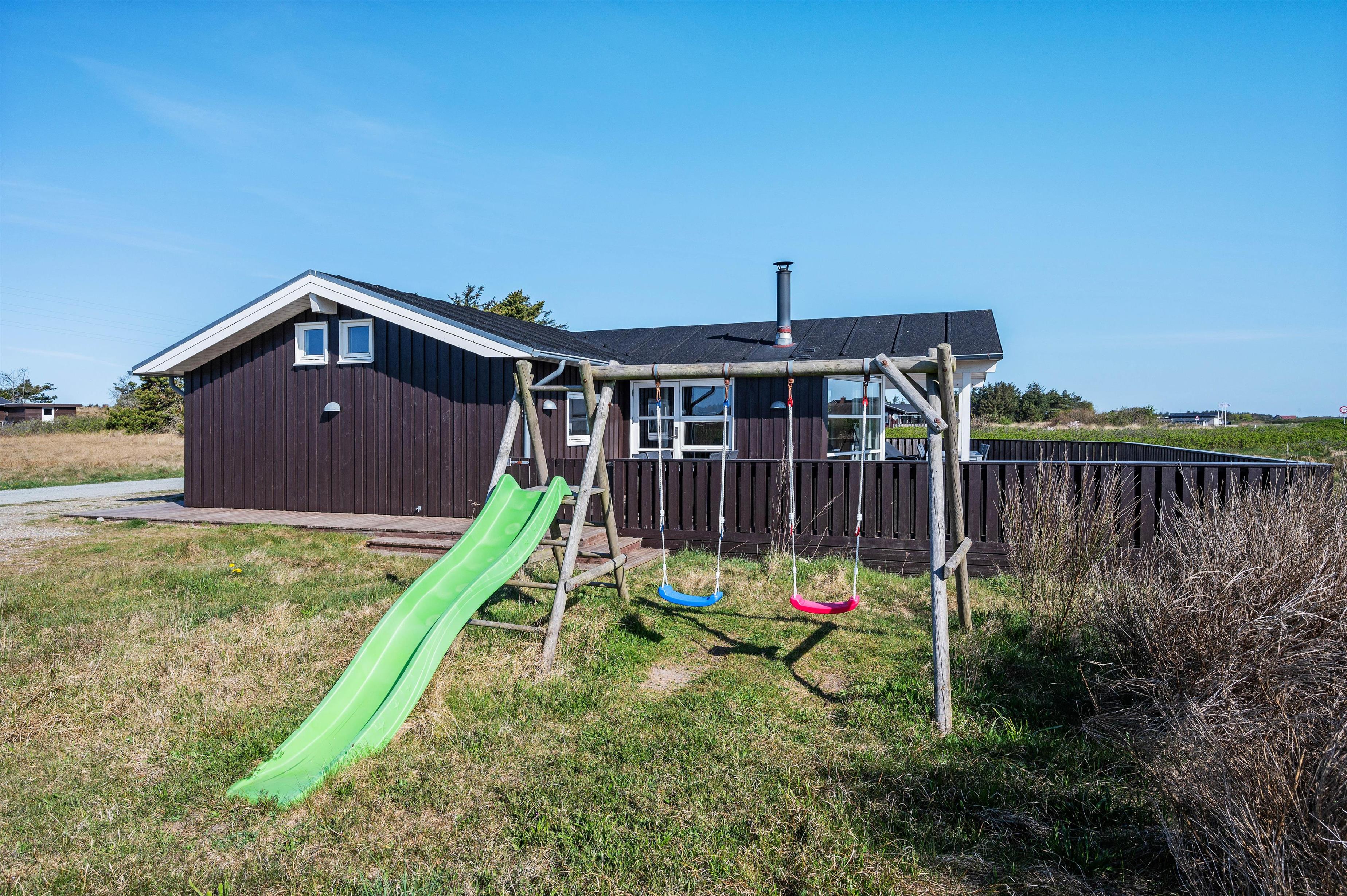 Feriehusets store lukkede terrasse er det perfekte spot til en kop kaffe i morgensolen med udsigt mod Ringkøbing fjord. Terrassen er delvist overdækket, så I stadig kan nyde den friske luft, hvis I trænger til skygge. Da hunden er velkommen i sommerhuset, betyder den lukkede terrasse også, at I ikke skal bekymre jer om, hvor hunden befinder sig. Til børnene er der gynger og rutsjebane i haven.