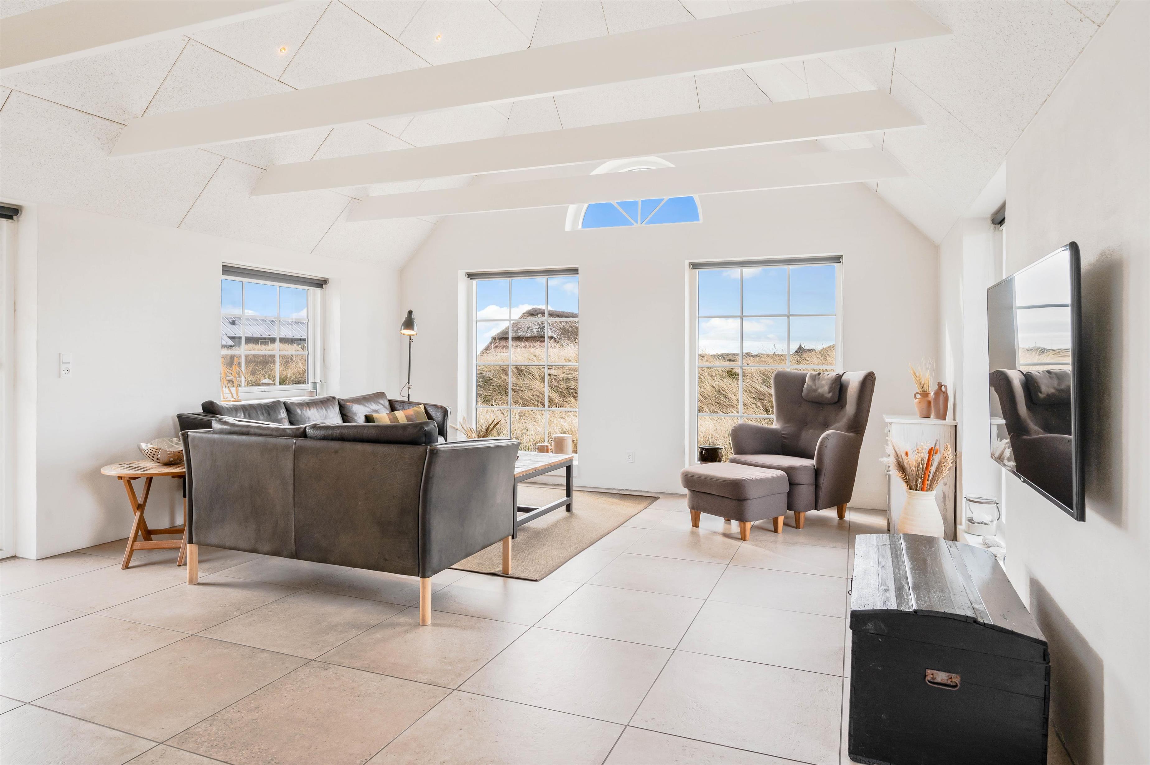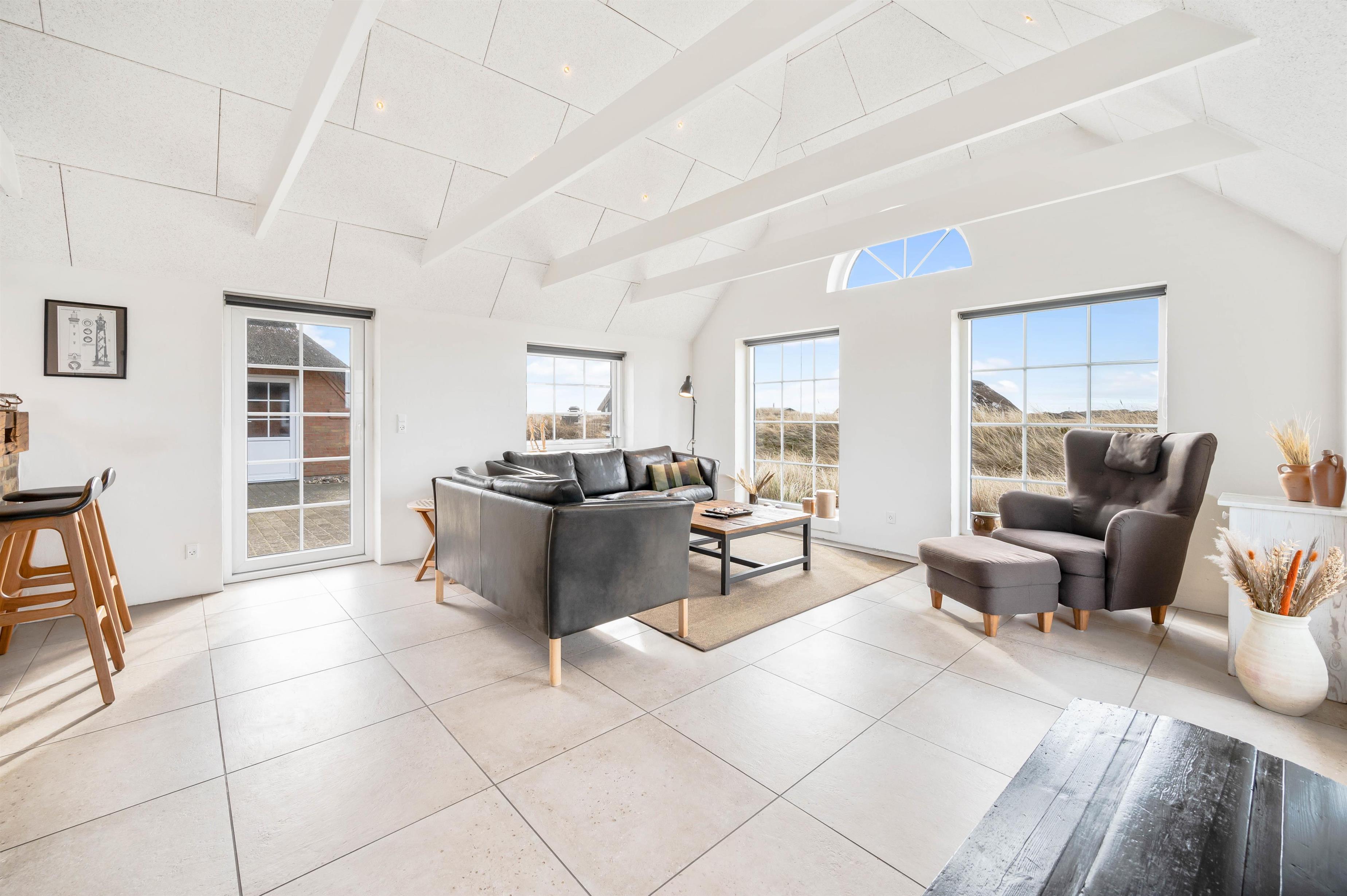 Lyset strømmer ind ad vinduerne i denne lille perle i Klegod. Det smukke lysindfald er med til at bringe følelsen af Vesterhavet helt ind i stuen, og blikket bliver naturligt draget mod de åbne vidder, man kan nyde synet af gennem vinduerne.