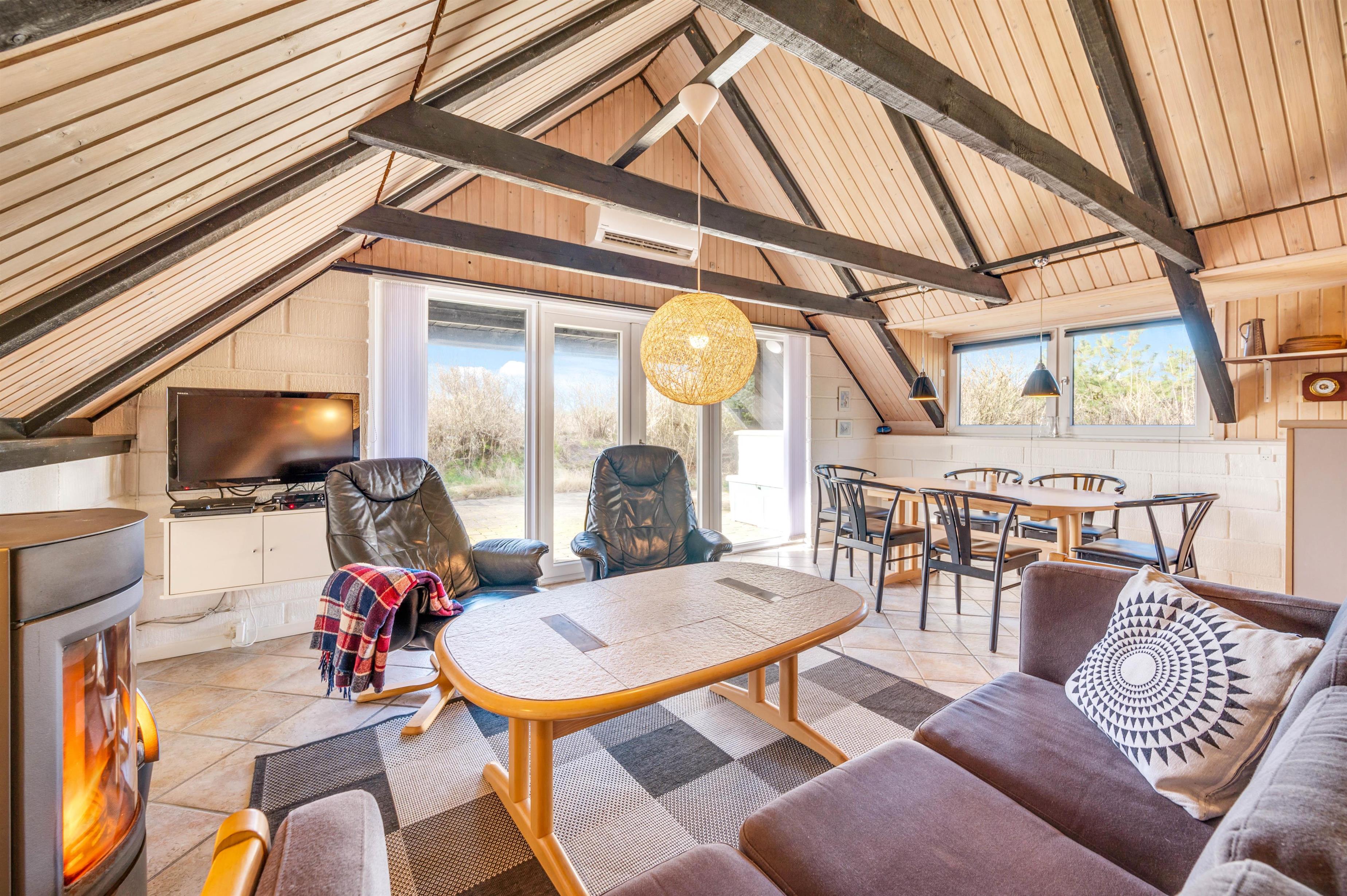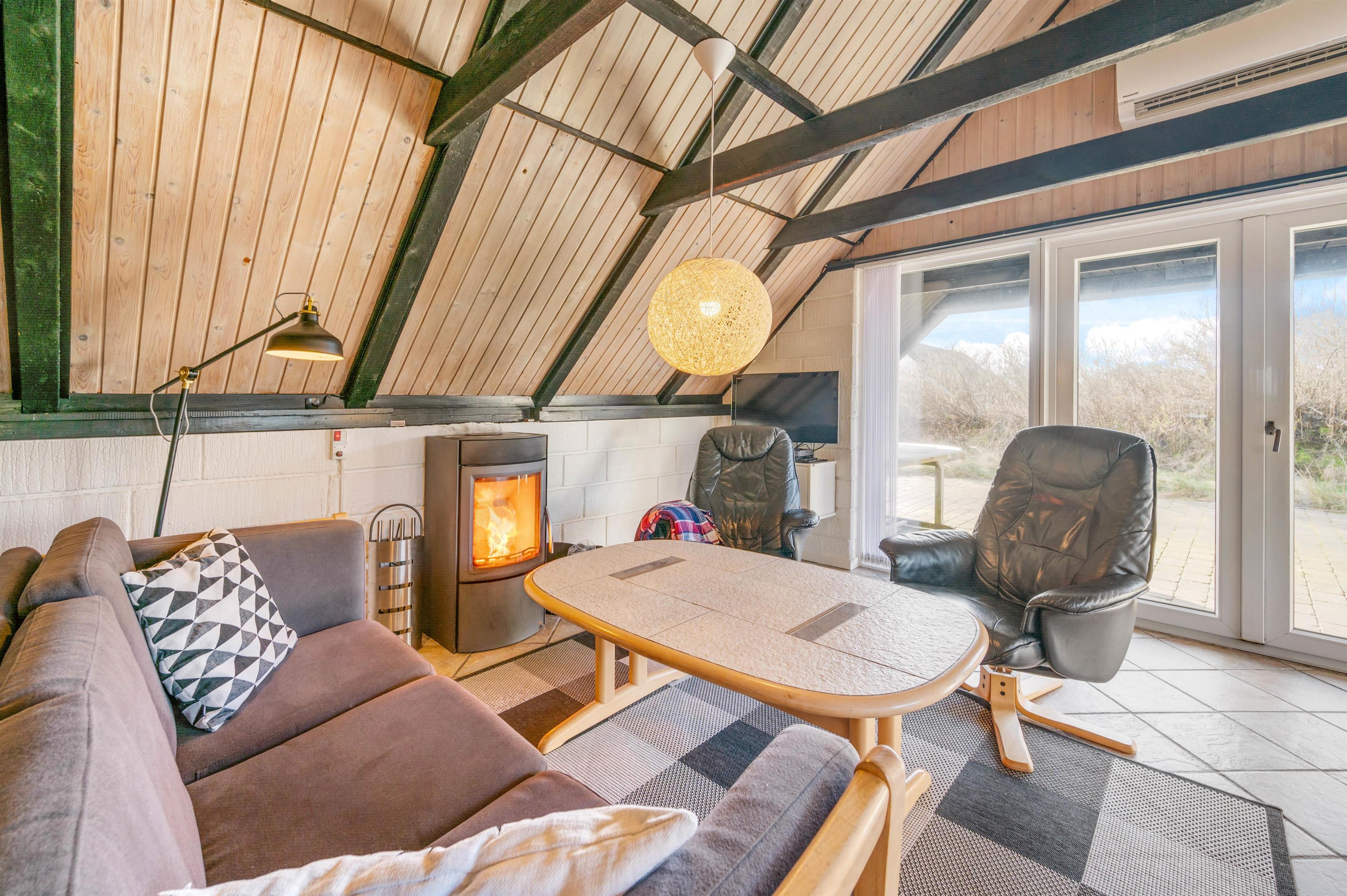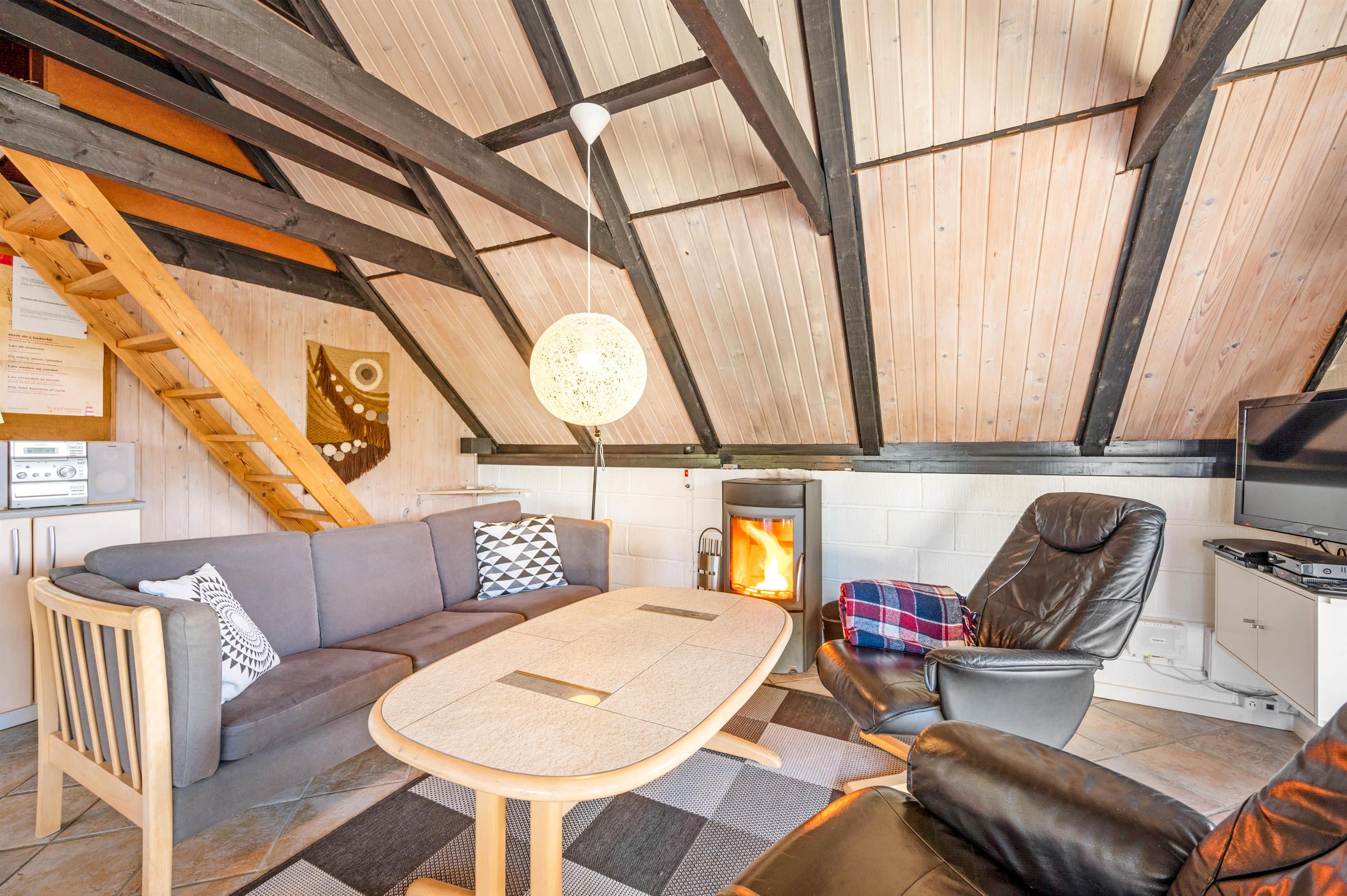 Sommerhusets opholdsstue er samlingspunktet for hele feriebesætningen. Her kan I samle jer til hyggelige stunder med madlavning, spil og film. For at sætte prikken over i’et, kan I tænde op i brændeovnen, der sørger for god varme og stemning. Fra stuen har I også udsigt til Nr. Lyngvig Fyr.