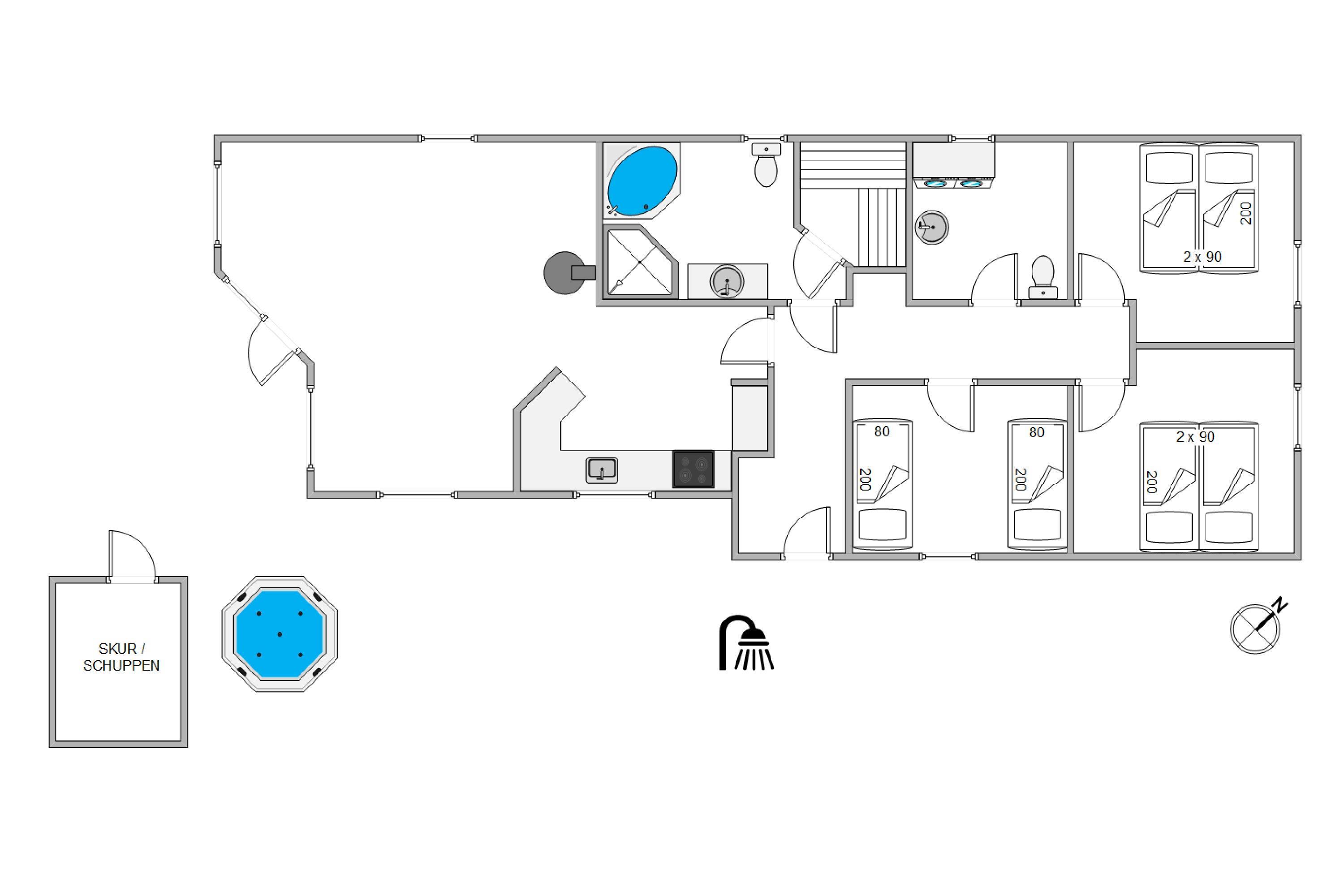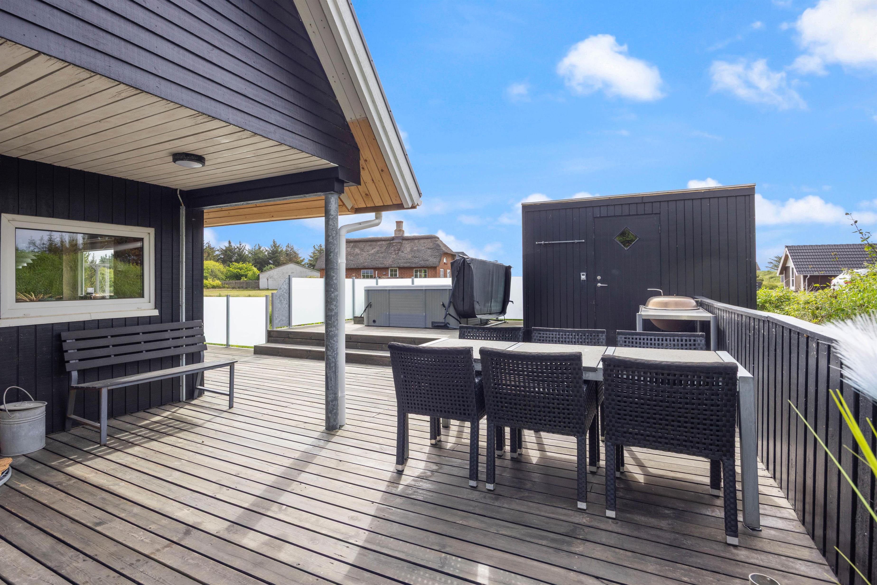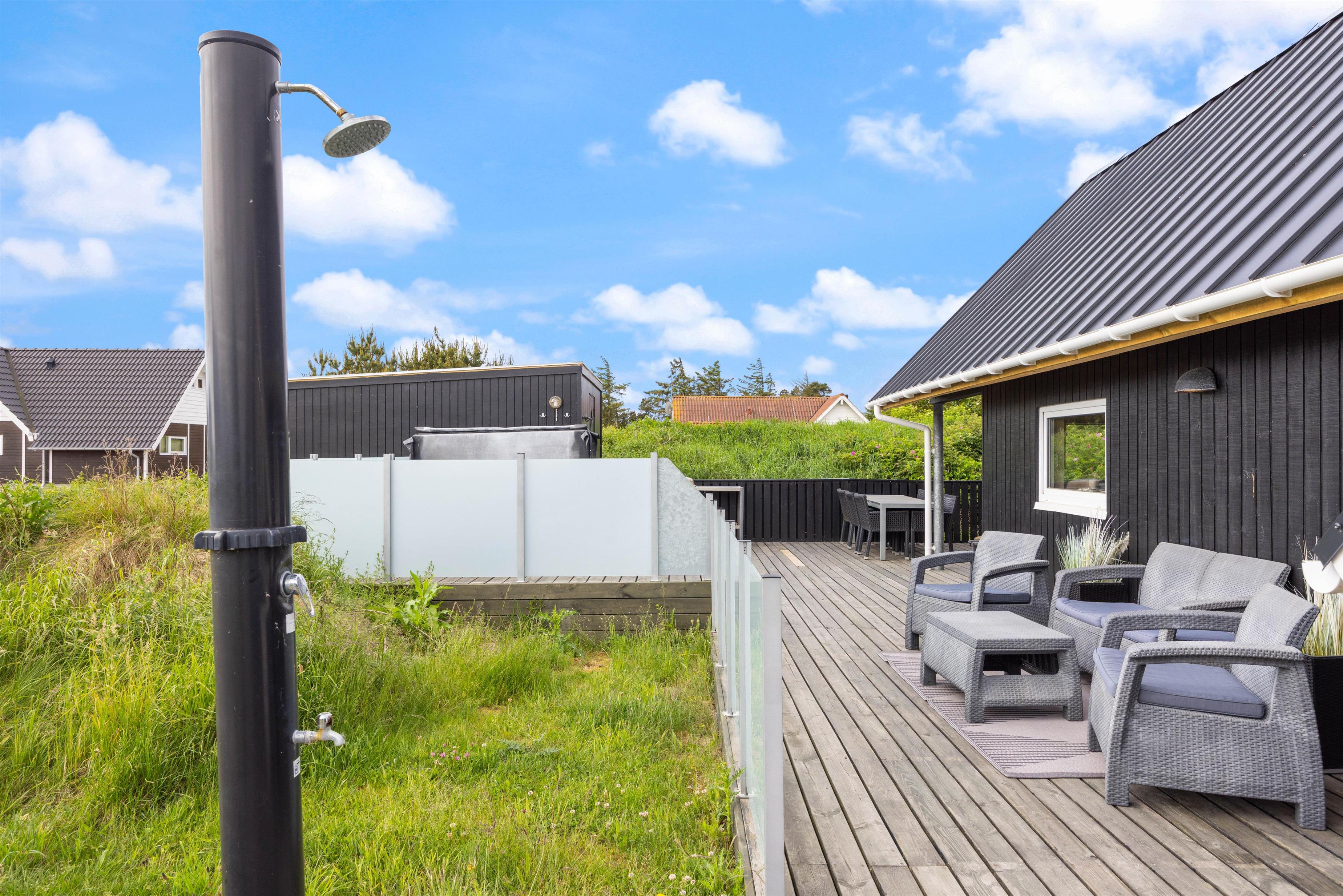 Efter en dejlig gåtur ved havet, kan I sætte jer ned i udespaen og nyde roen. Hvis I trænger til et forfriskende skyl, kan I tage et skyl under udebruseren, som er tilgængelig fra april til november.