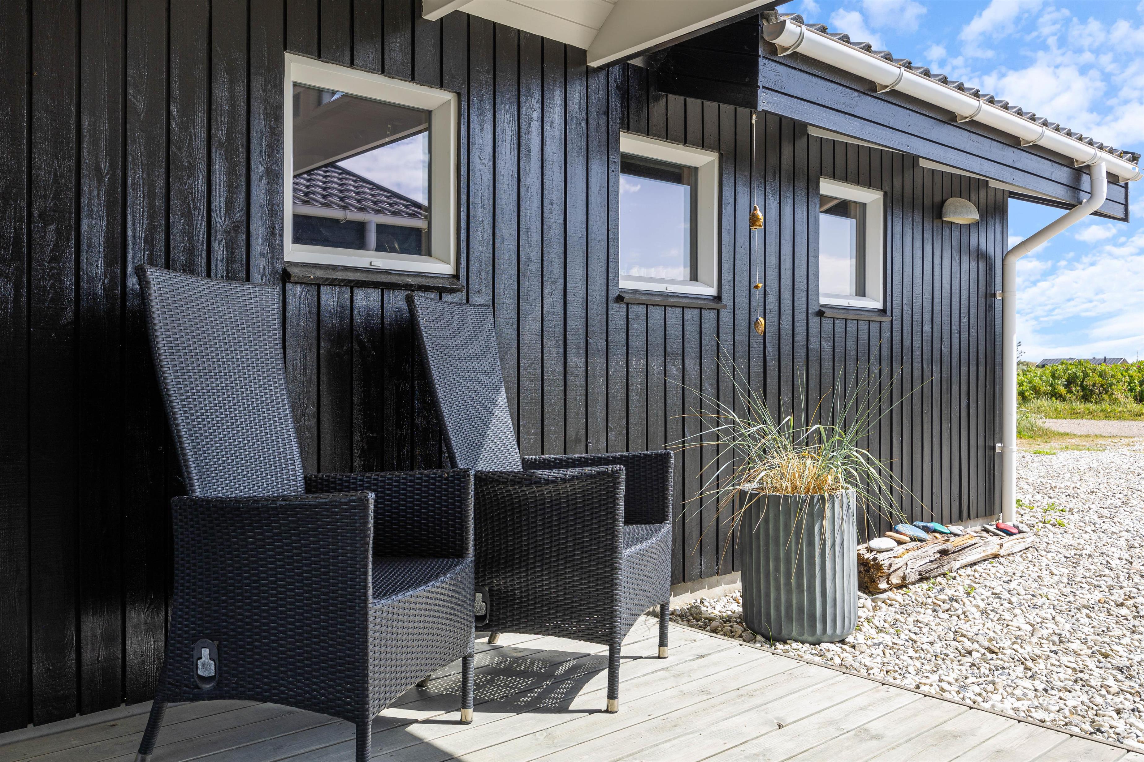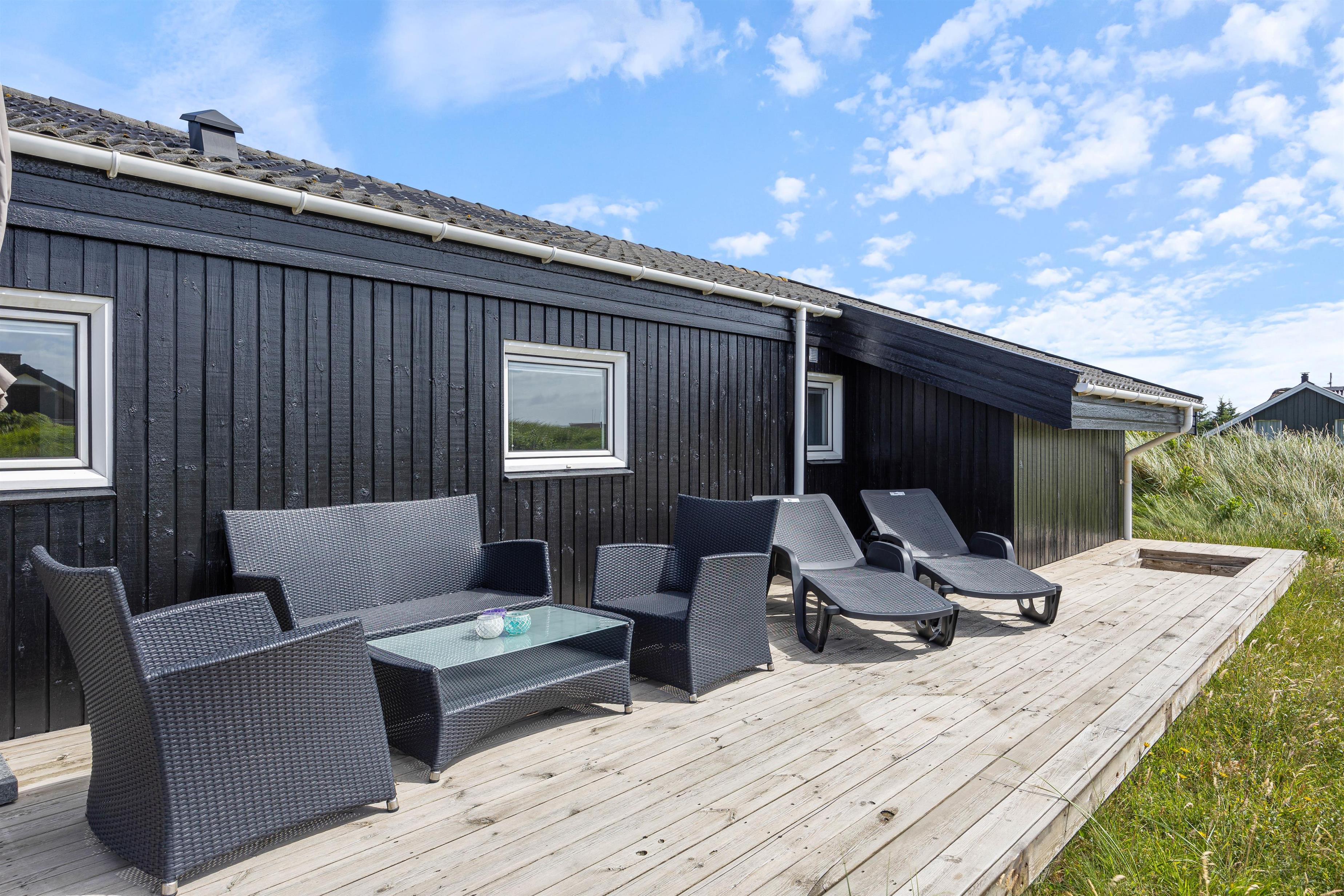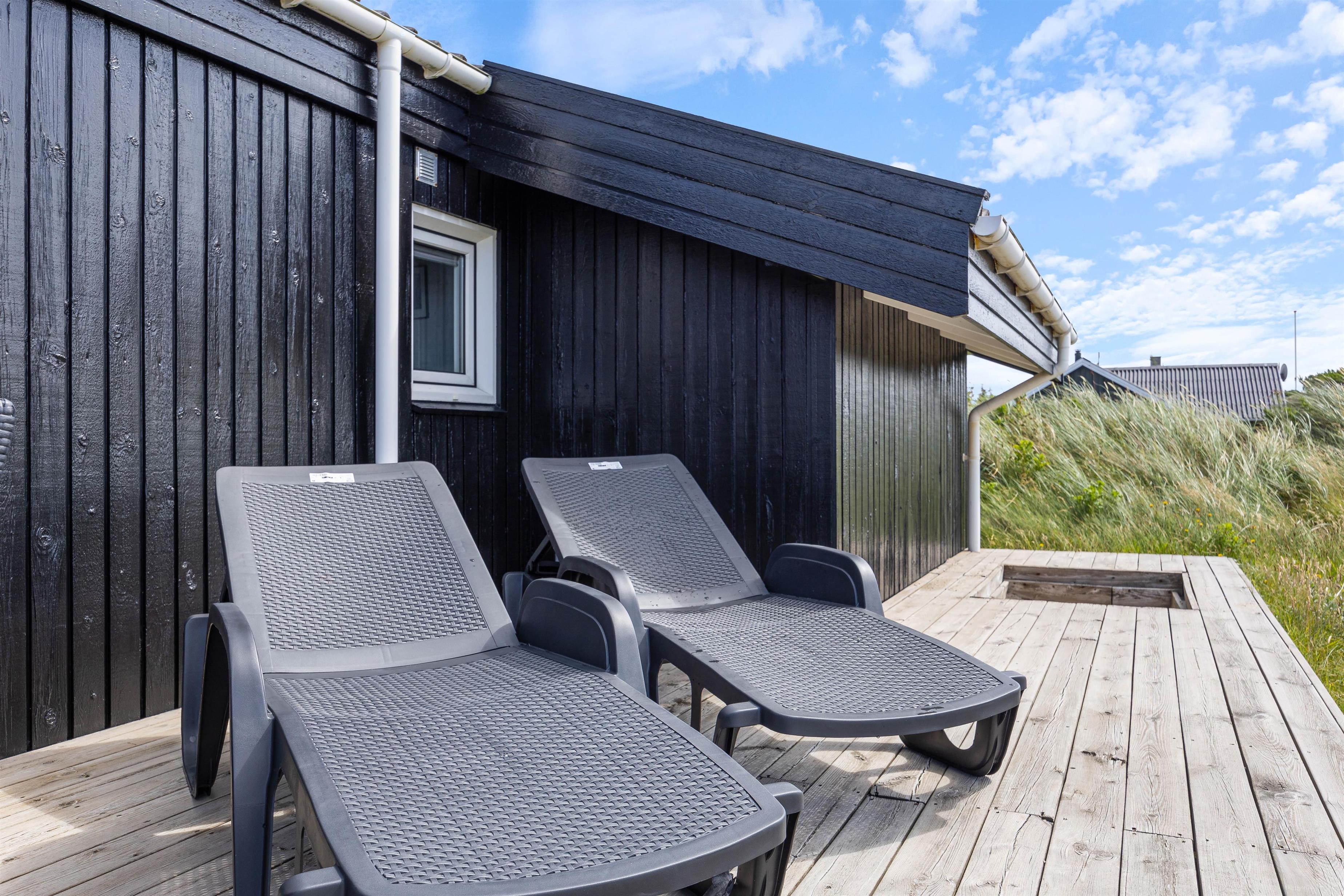 Udendørsområdet på din ferieadresse i Klegod bør bestemt ikke være uomtalt. Terrassen strækker sig rundt om hele feriehuset, så alle vil kunne finde en god plads til at nyde det skønne vejr på terrassen. På den sydlige del af terrassen kan I tilbringe de mest vidunderlige timer i solen, og om aftenen kan I tilberede et lækkert måltid på grillen, og med lyden af Vesterhavet i baggrunden vil det blive en uforglemmelig aften. Hvis det skulle være lidt blæsende, har I adgang til den overdækkede og afskærmede del af terrassen fra stuen.