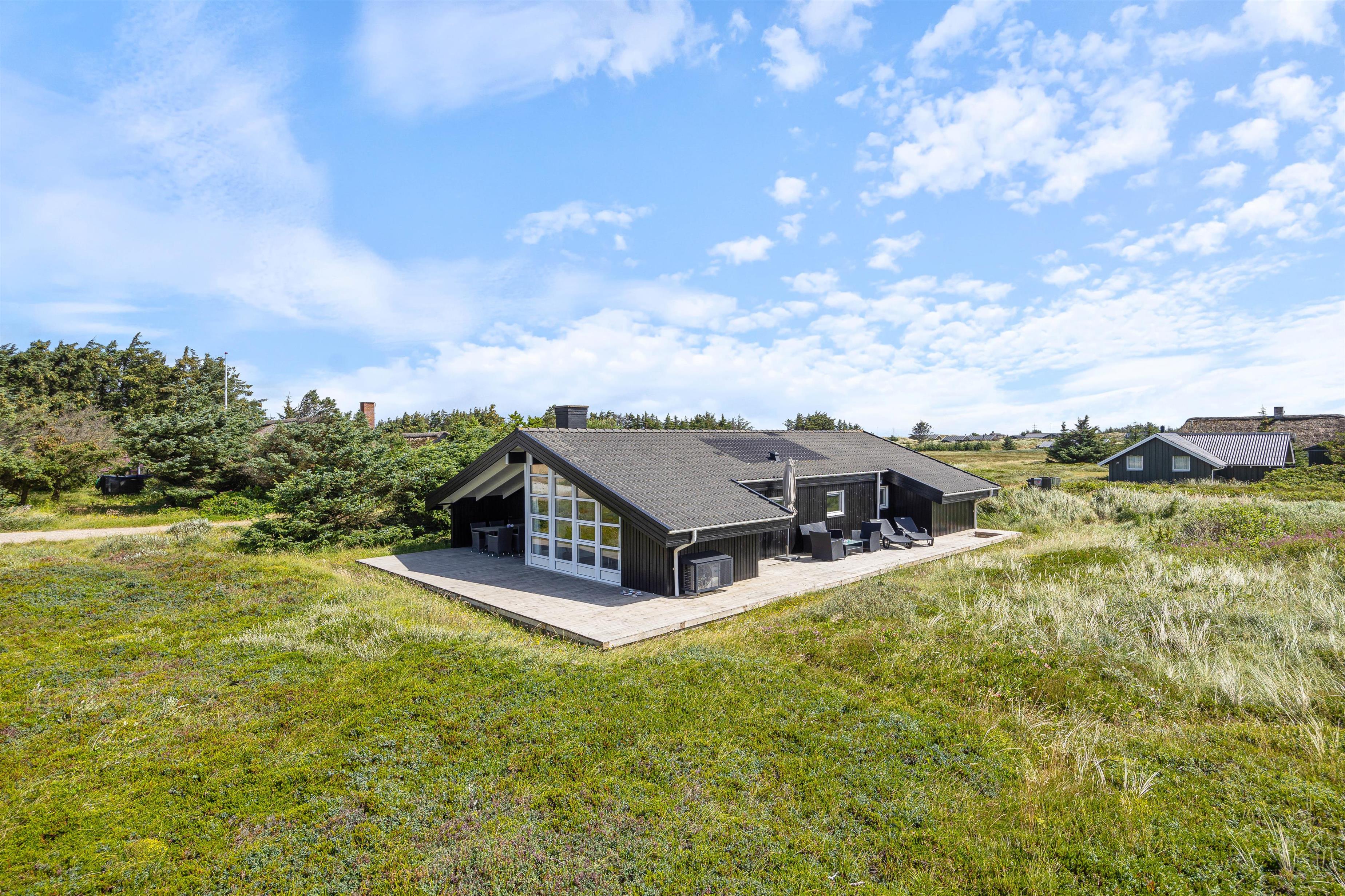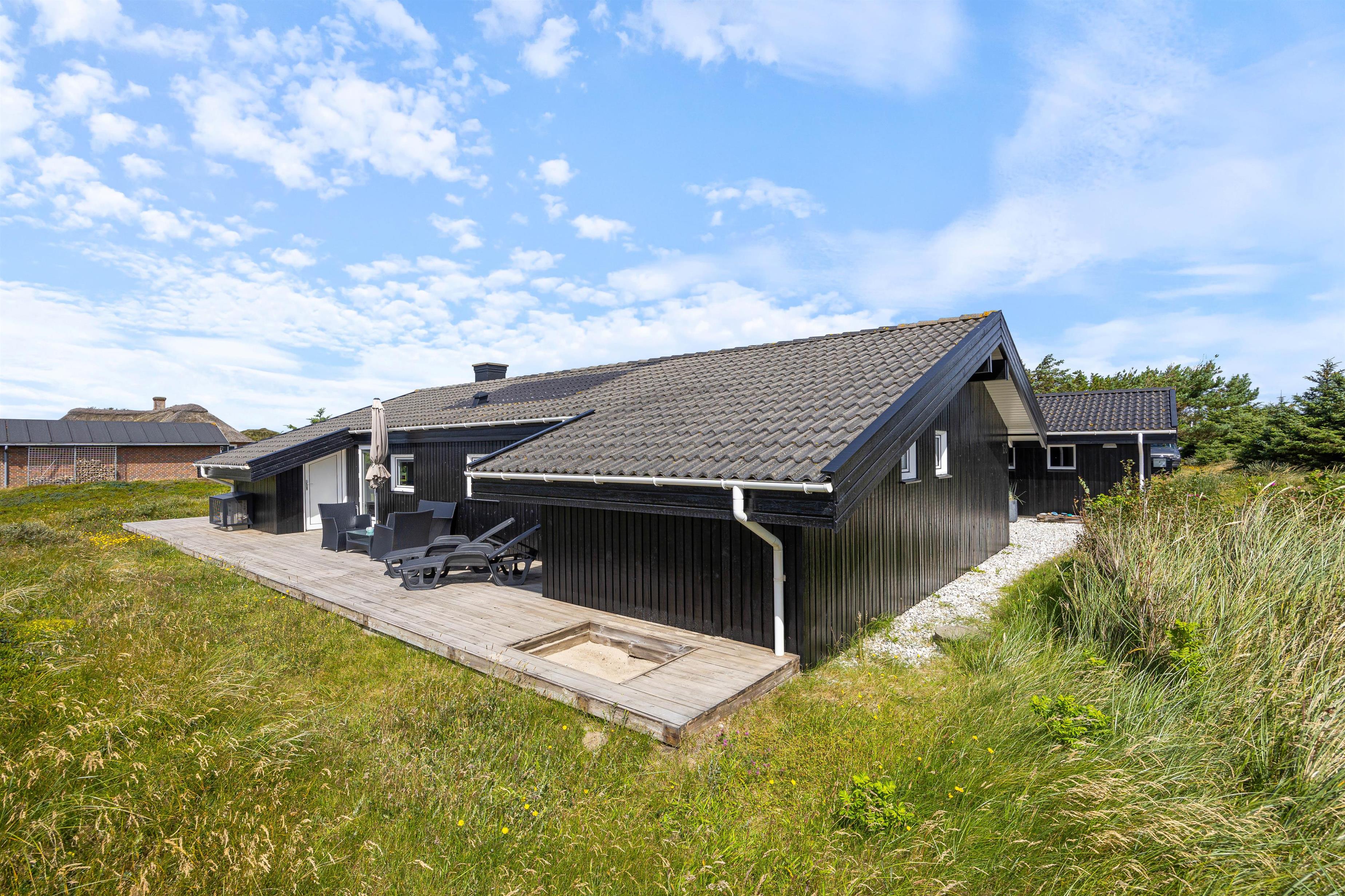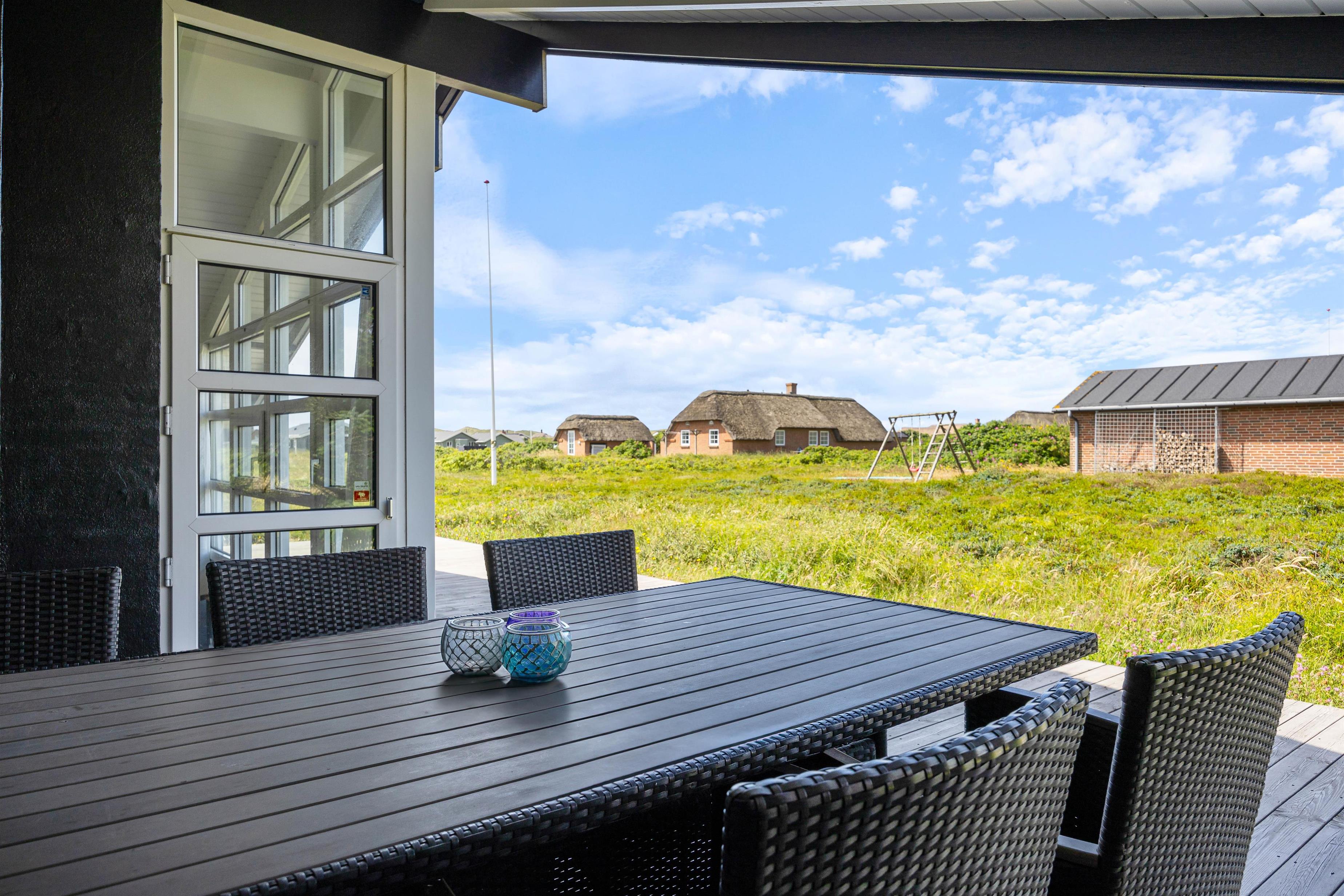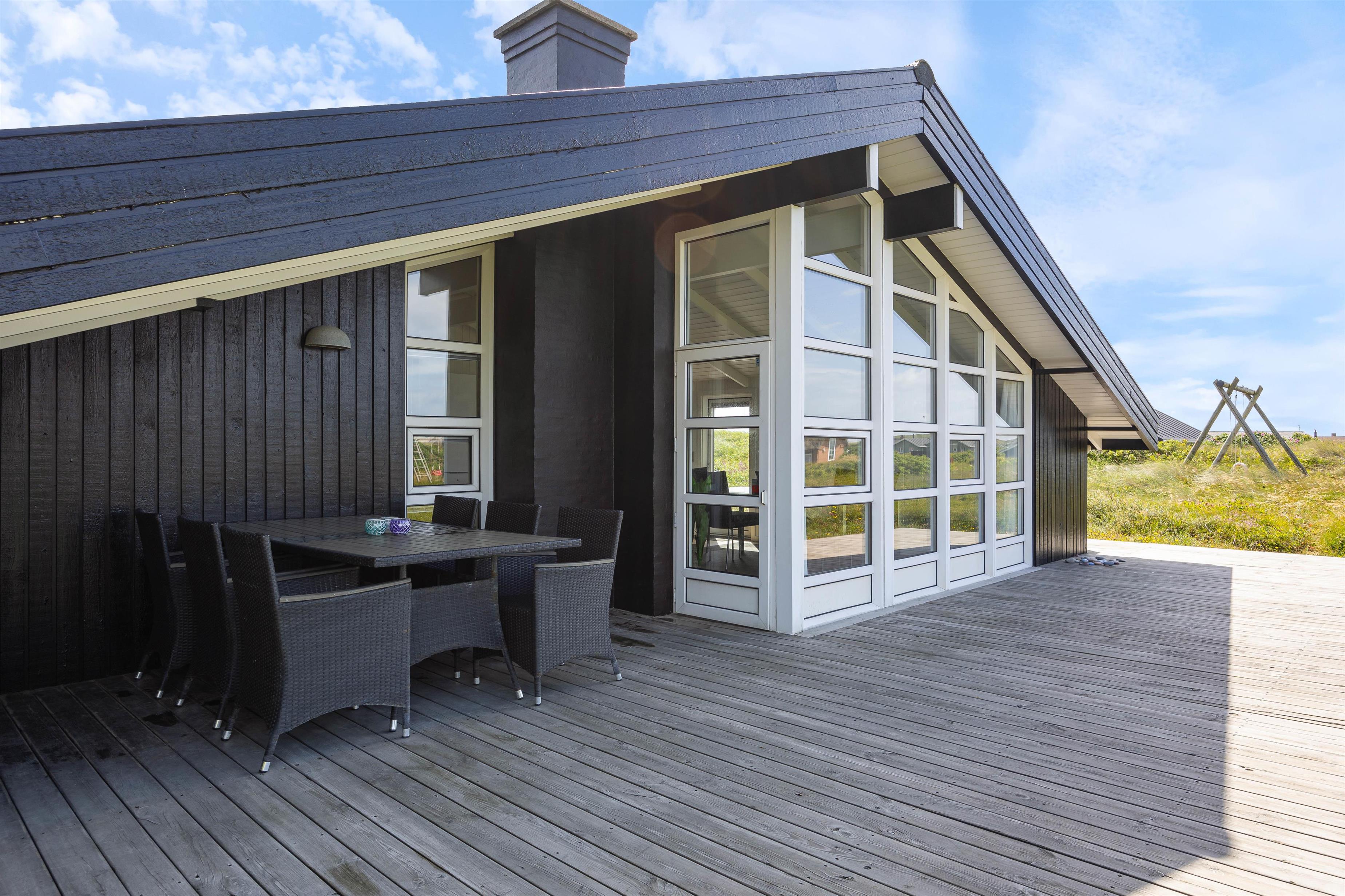 Udendørsområdet på din ferieadresse i Klegod bør bestemt ikke være uomtalt. Terrassen strækker sig rundt om hele feriehuset, så alle vil kunne finde en god plads til at nyde det skønne vejr på terrassen. På den sydlige del af terrassen kan I tilbringe de mest vidunderlige timer i solen, og om aftenen kan I tilberede et lækkert måltid på grillen, og med lyden af Vesterhavet i baggrunden vil det blive en uforglemmelig aften. Hvis det skulle være lidt blæsende, har I adgang til den overdækkede og afskærmede del af terrassen fra stuen.