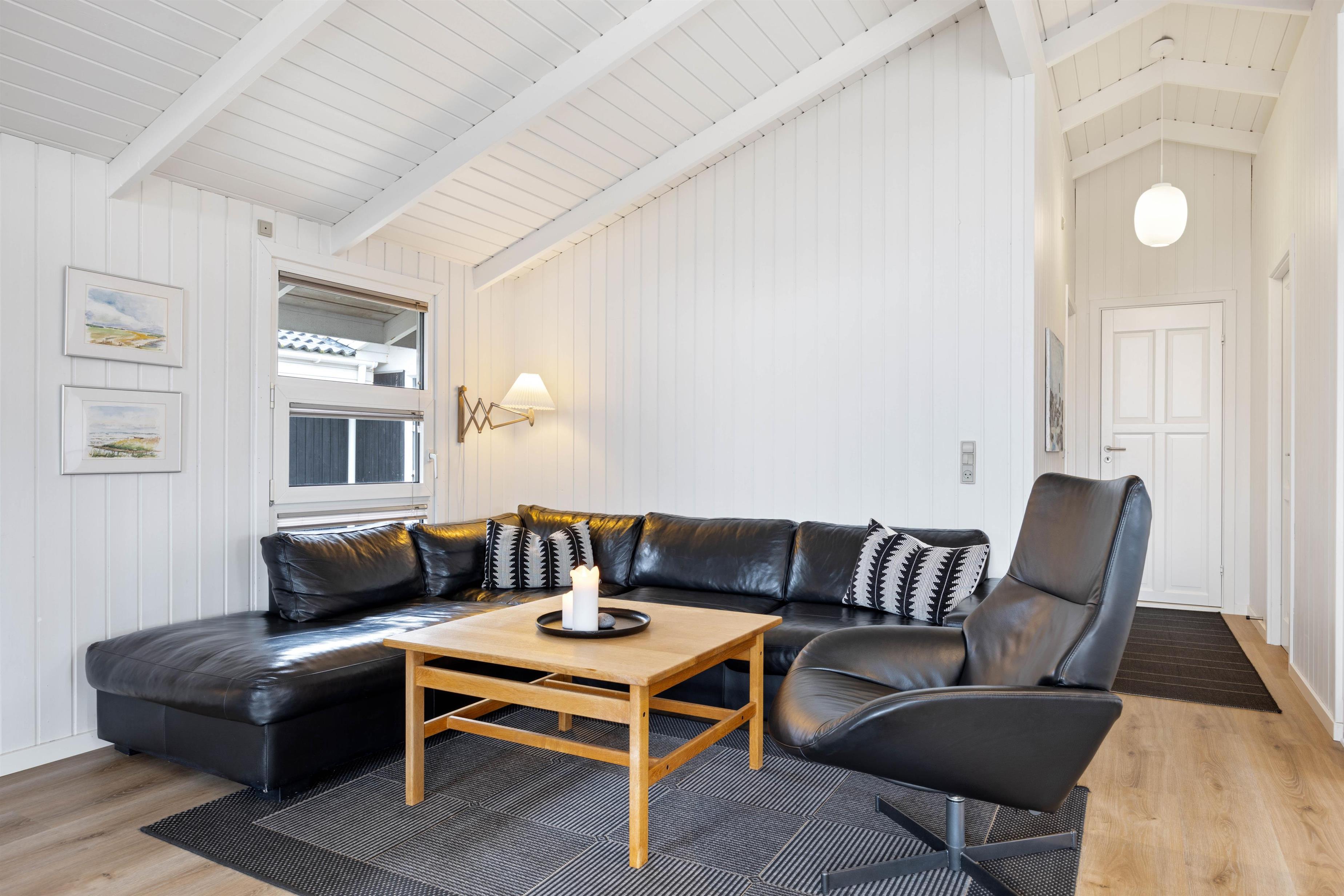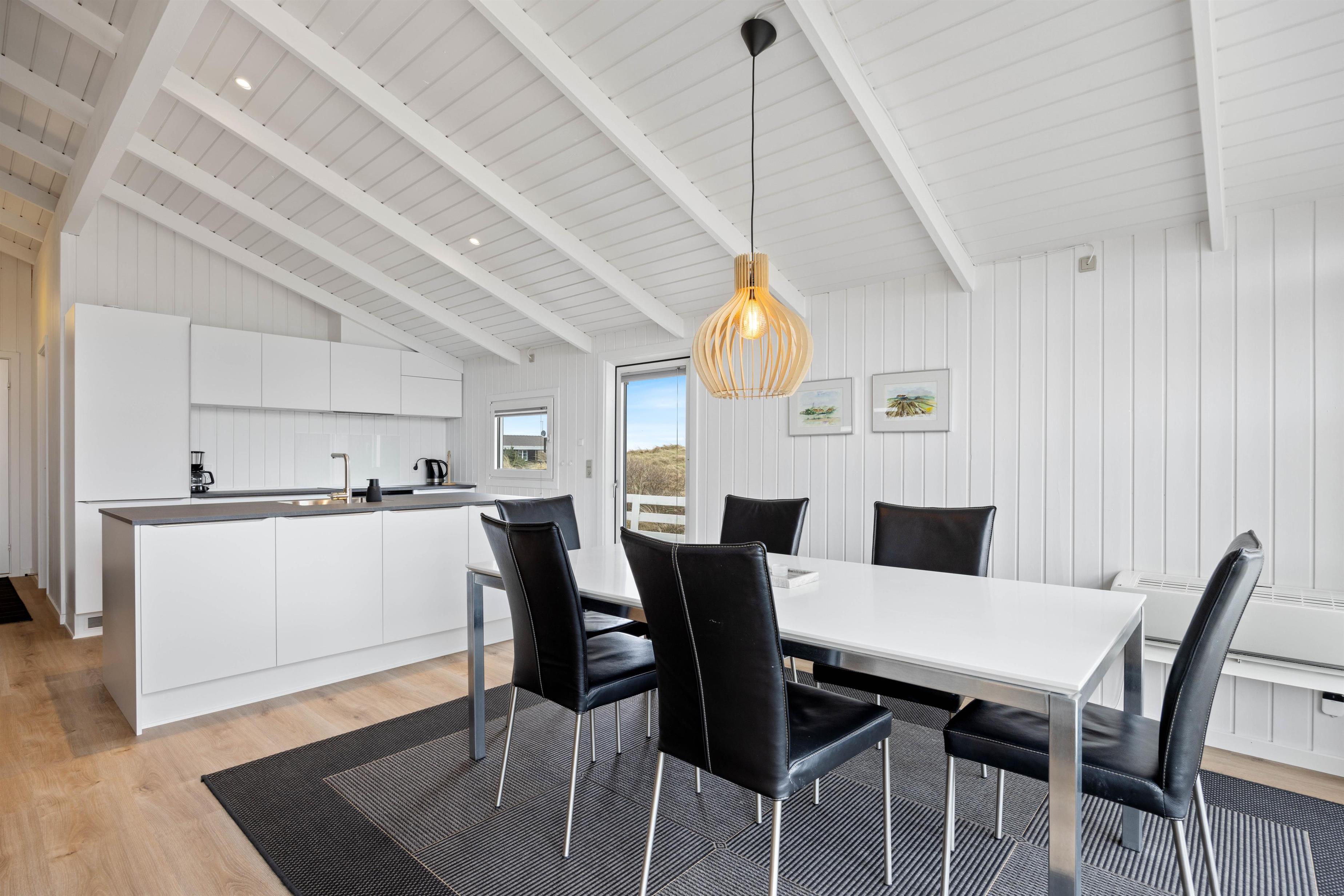 Feriehuset på Fladsbjergvej 158 imponerer med sit lyse og åbne køkkenalrum. Det høje, hvide loft med de åbne træbjælker får feriehuset til at virke hyggeligt og dejligt rummeligt, og gennem det store vindue foran kan I fange de smukkeste solstråler.