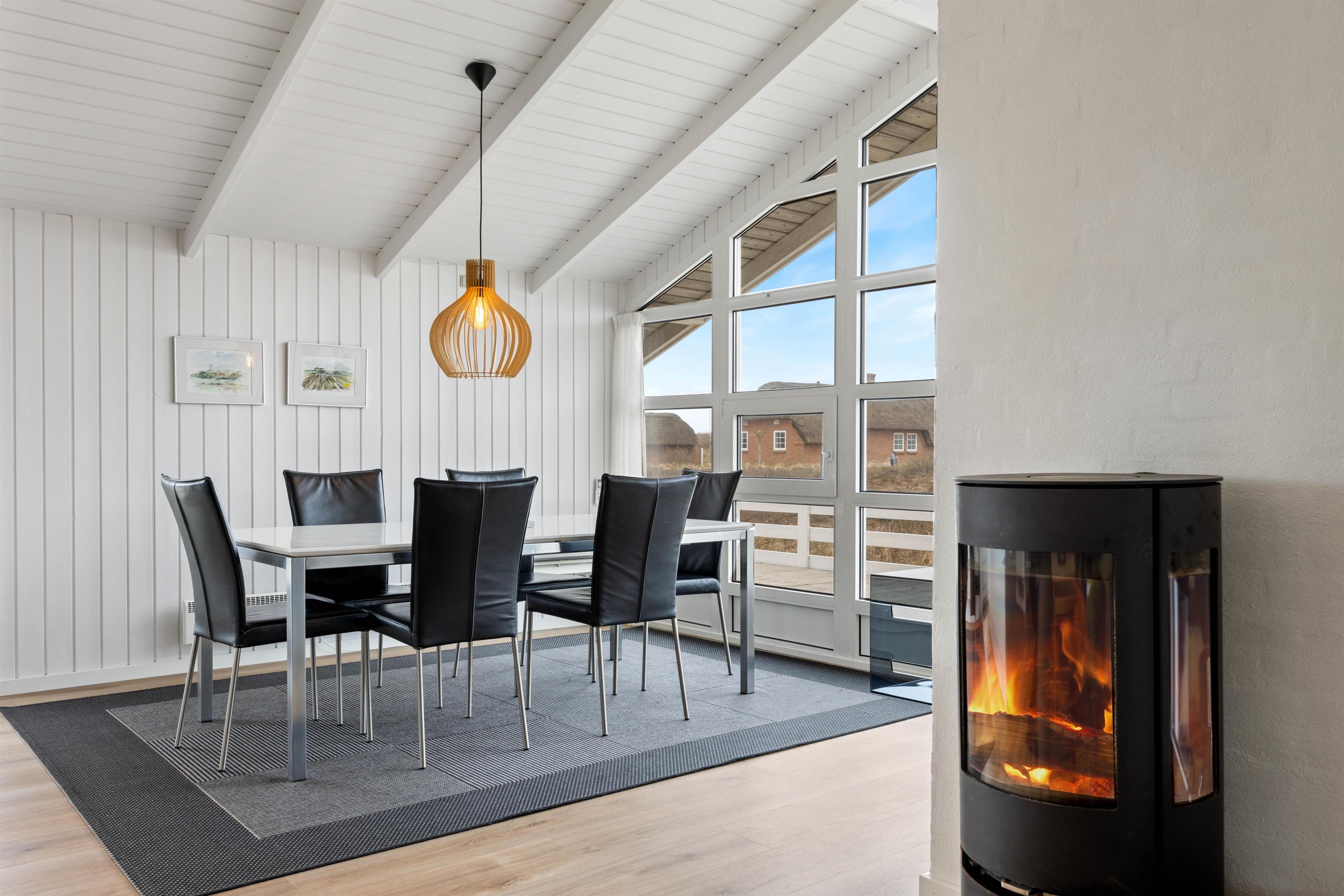 Det åbne køkken, som er renvoret i 2024, er integreret i alrummet og indbyder til fælles madlavning og mange hyggelige timer sammen. Efter middagen kan I sætte jer til rette i sofaen, tænde op i brændeovnen og nyde den hyggelige varme og knitren fra træet.