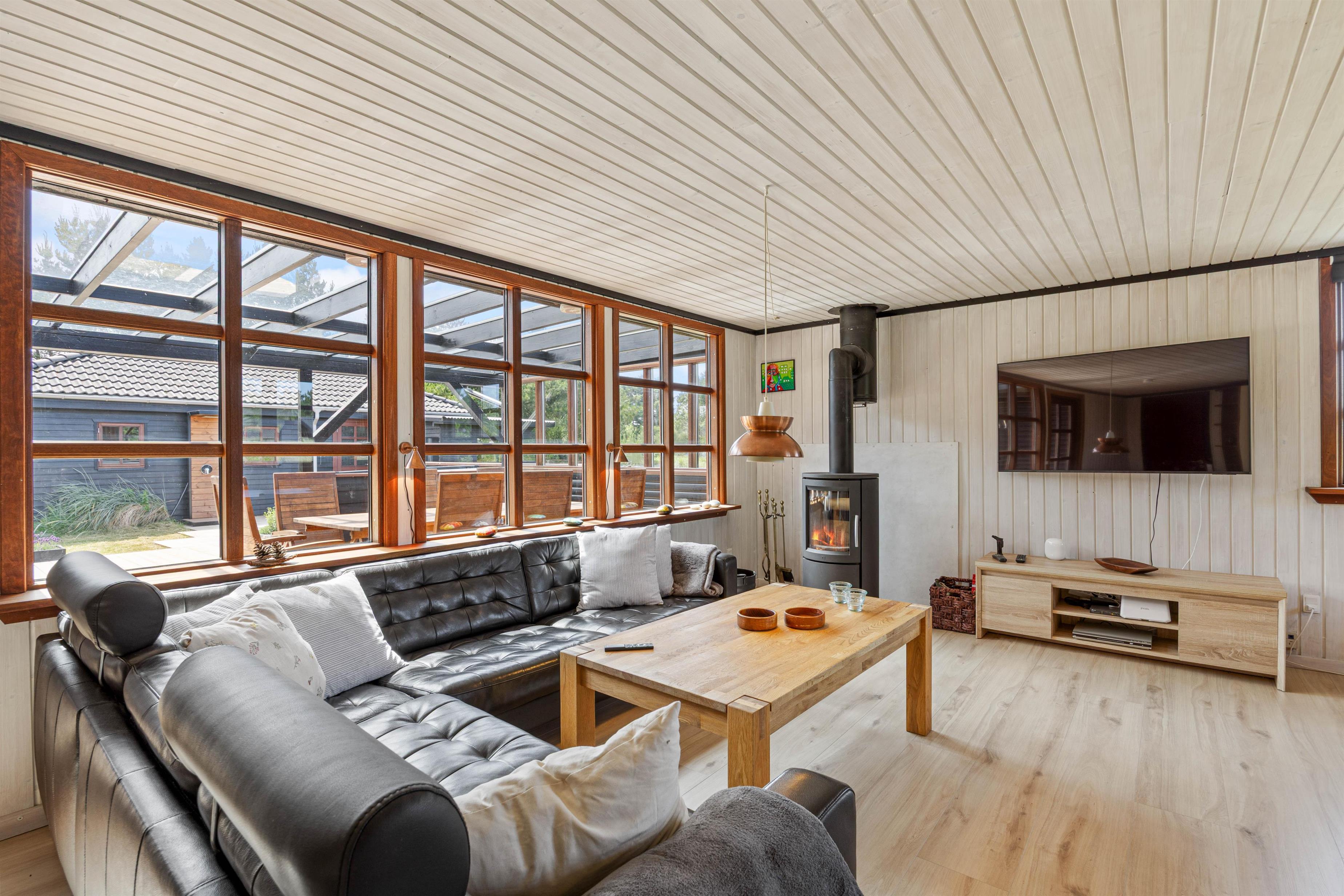 Indenfor bliver I mødt af en dejlig og hyggelig atmosfære. I stuen kan I samles omkring brændeovnen – perfekt til en rolig aften med spil og film med ildens knitrende lyde i baggrunden. Det åbne køkken er blandt andet udstyret med opvaskemaskine, så I ikke skal tænke på opvasken efter madlavningen.