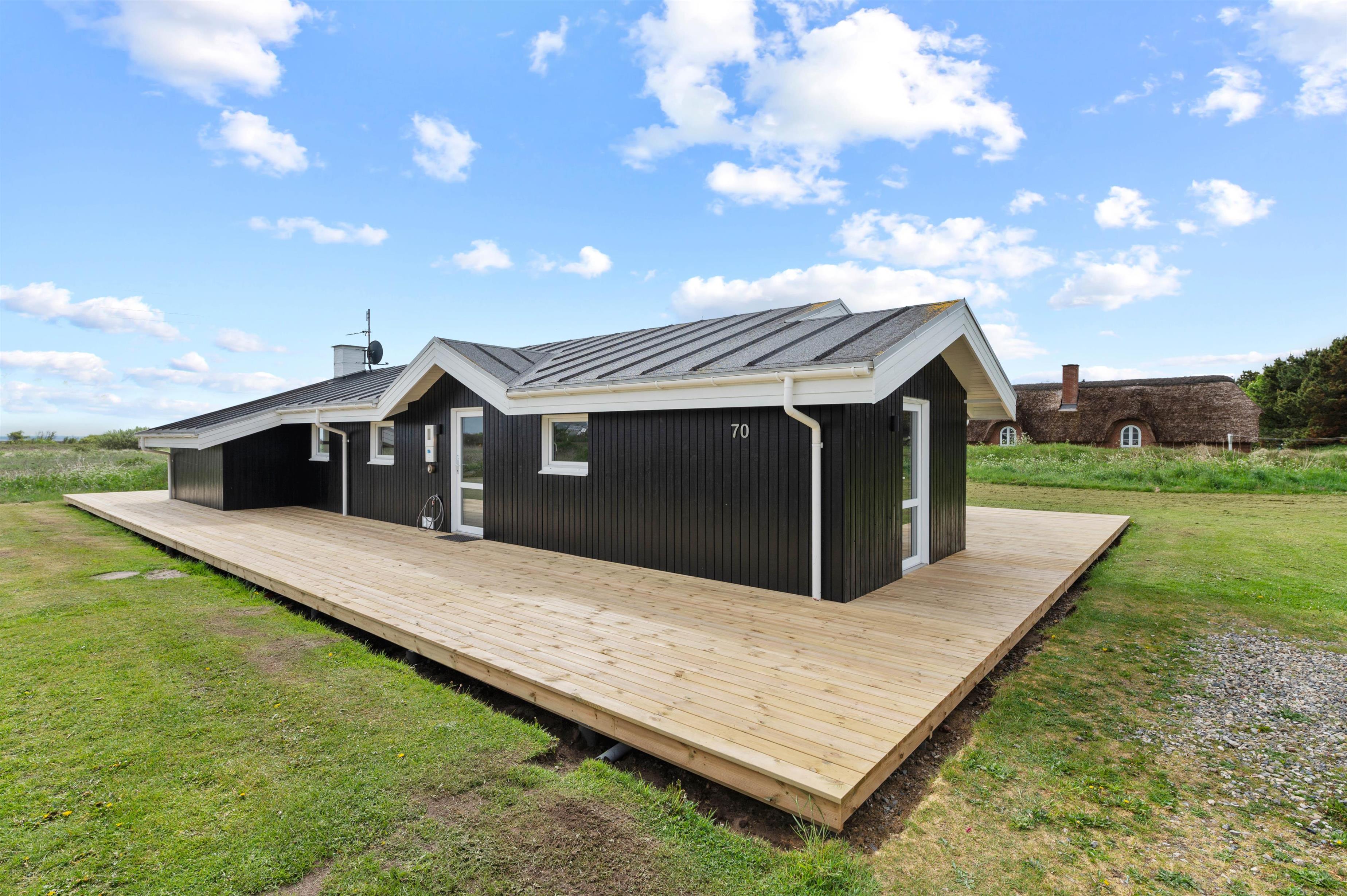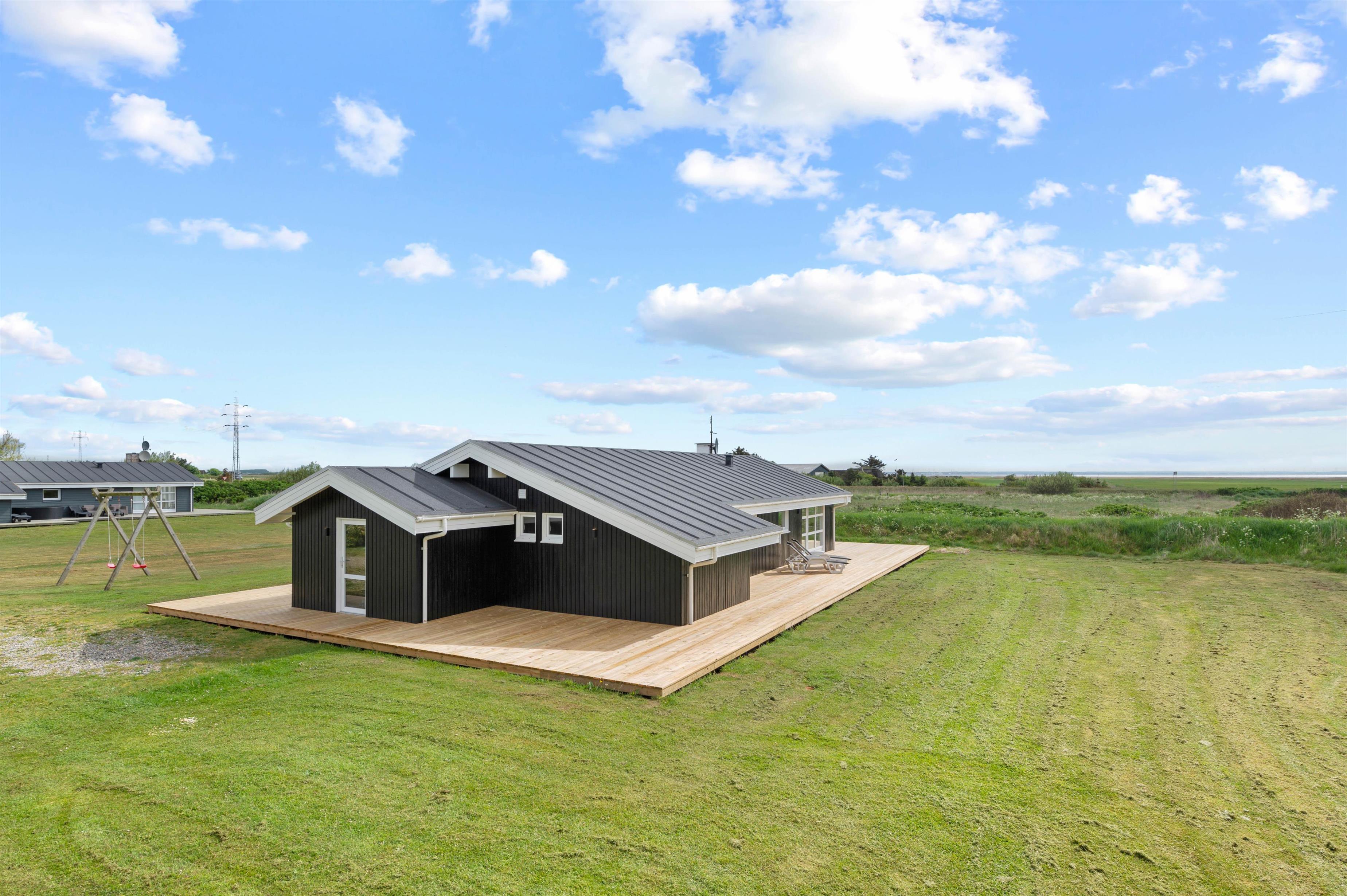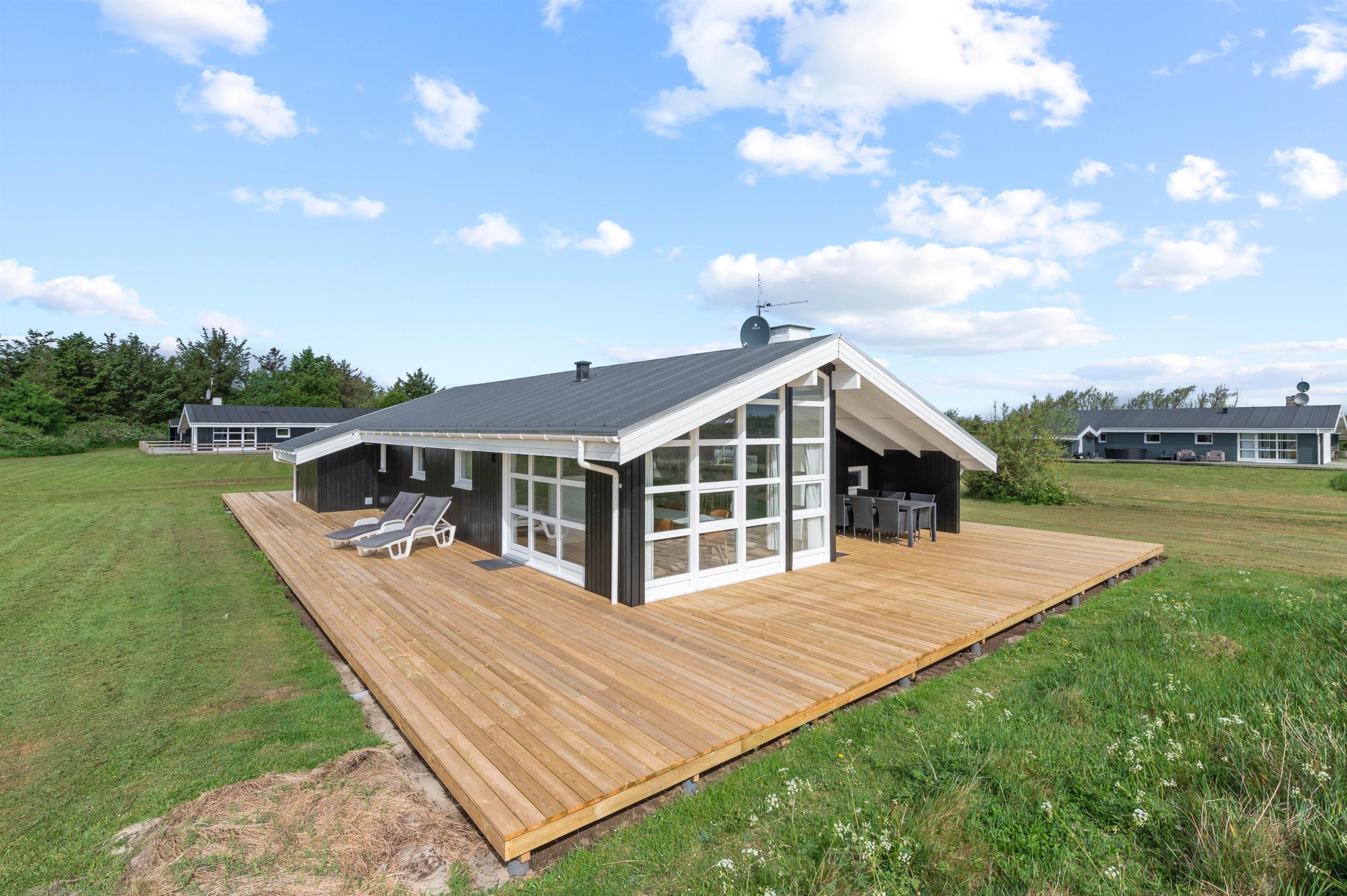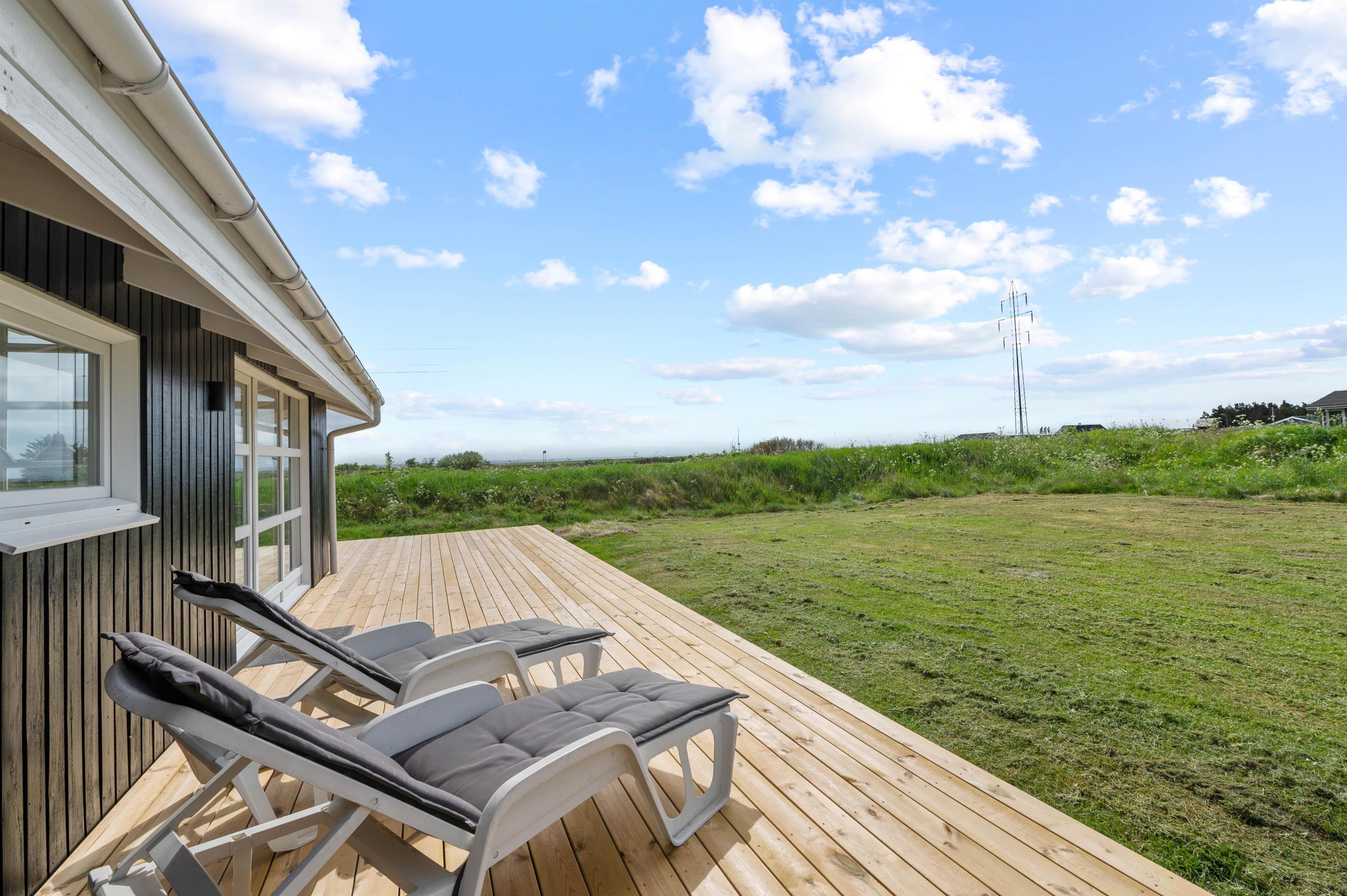 Sommerhuset har en stor og god terrasse, som omkranser huset hele vejen rundt. Mod øst, hvor udsigten mod Ringkøbing Fjord er, er der en delvist overdækket og delvist afskærmet terrasse. Her kan man tilbringe hyggelige grill aftener, ligesom den er ideel i morgen og formiddags timerne. På græsplæne grunden er der et gyngestativ til de små. Det er tilladt at medbringe 2 stk. hunde i sommerhuset.