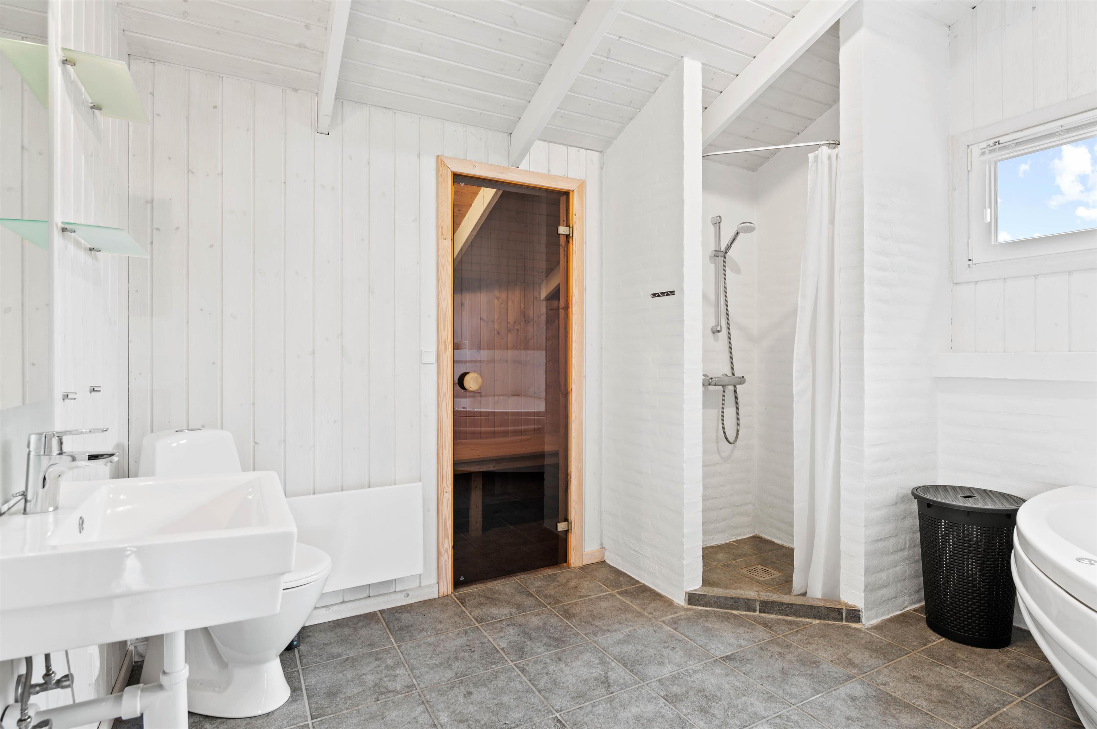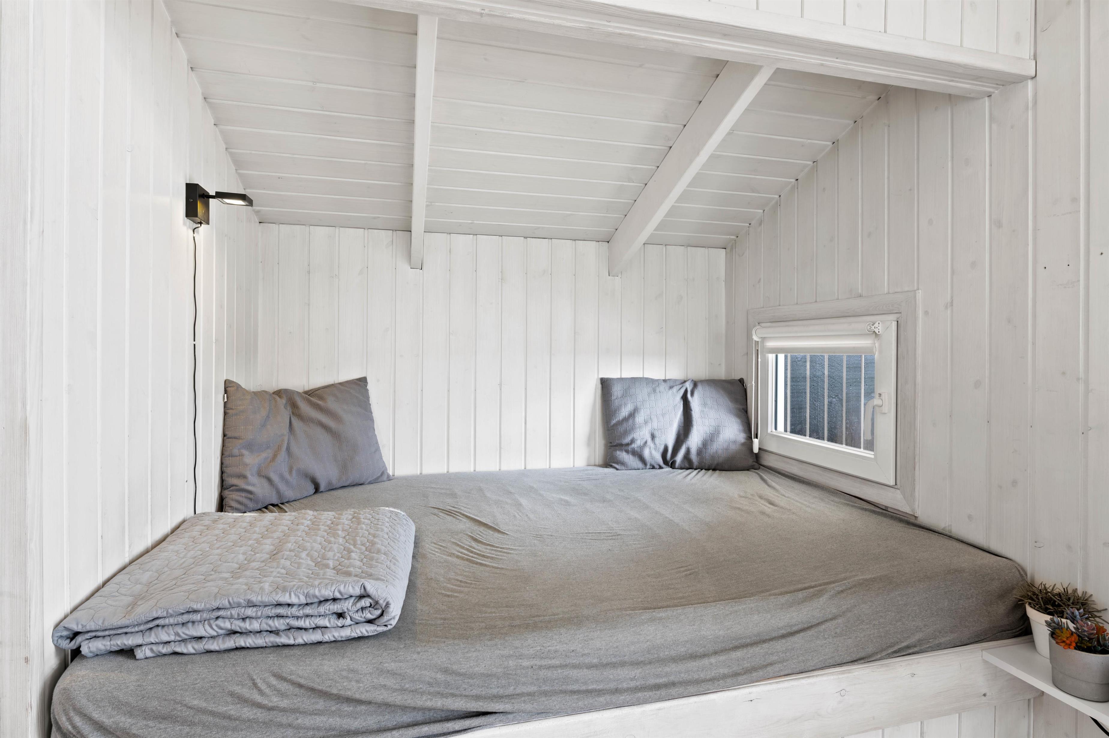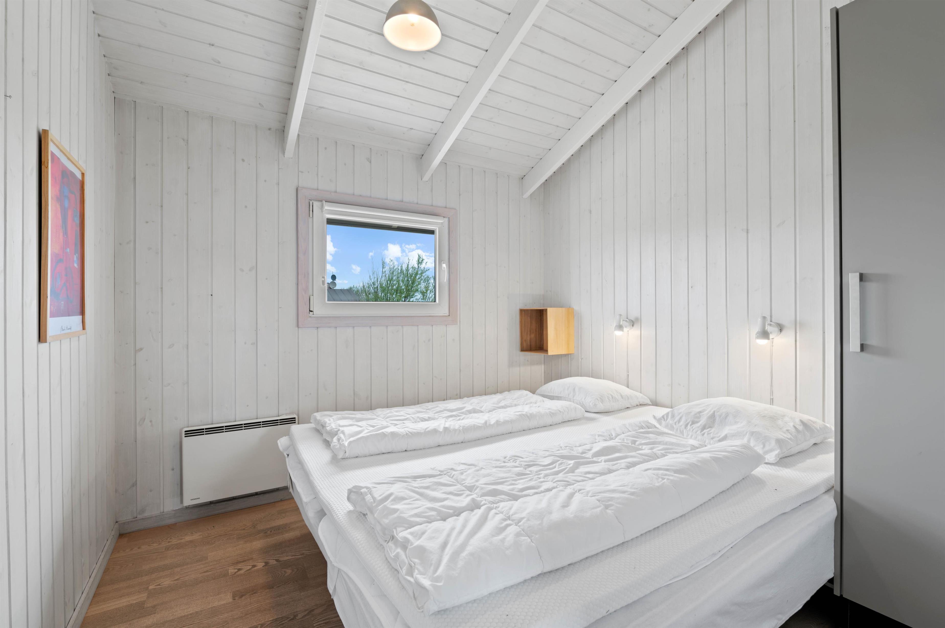 Sommerhuset har 3 soveværelser og en alkove i stuen, så der i alt er 8 sovepladser i huset. Alle soveværelserne har trægulv og lyse trævægge. 2 af værelserne har hver en dobbeltseng og på det sidste værelse er der 2 enkeltsenge. Der er 2 badeværelser i sommerhuset, begge har gulvvarme og en bruseniche. På det store badeværelse er der også en hjørnespa og en god sauna.