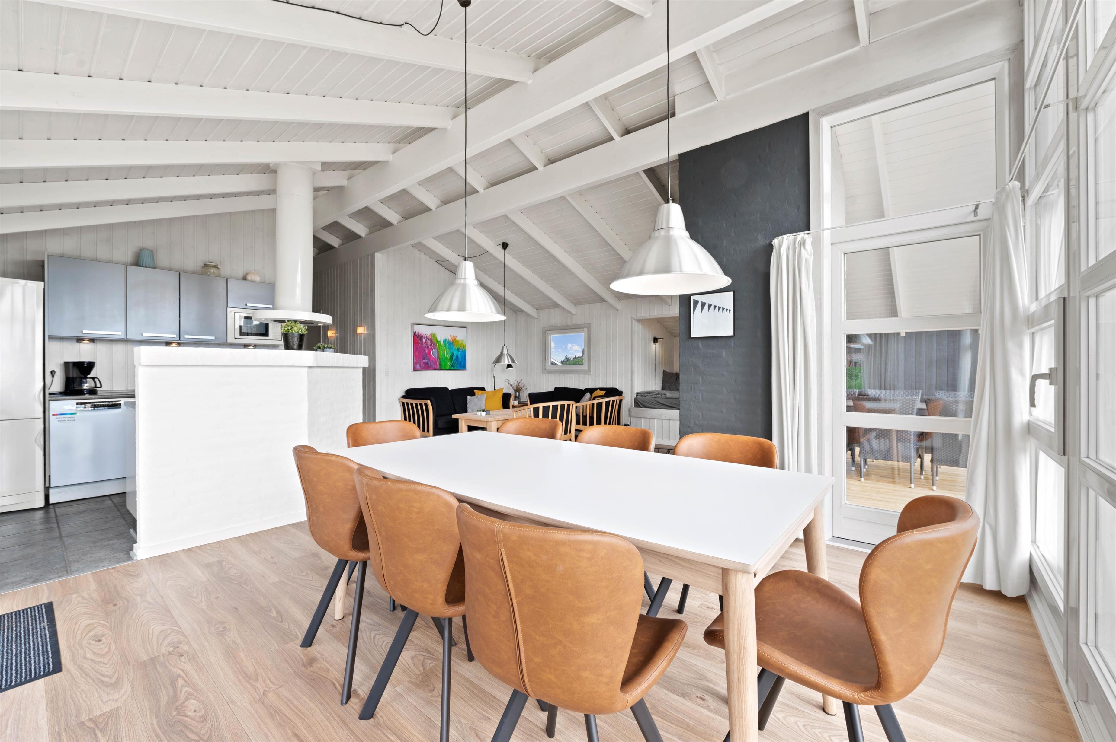 Køkken og stue er placeret i huset længst mod øst, hvorfra der er en skøn udsigt og hvor Ringkøbing Fjord kan ses i horisonten. Der er trægulv og træloft til kip. I køkkenet er der en opvaskemaskine, en mikroovn og en fryser på 70 L. Stuen har store flotte vinduespartier, der er en flot brændeovnsindsats bygget ind i skorstenen, og den skaber både hygge og varme. Der er et fladskærms-TV, parabol og gratis trådløst internet. Derudover er der en vaskemaskine og en tørretumbler i sommerhuset.