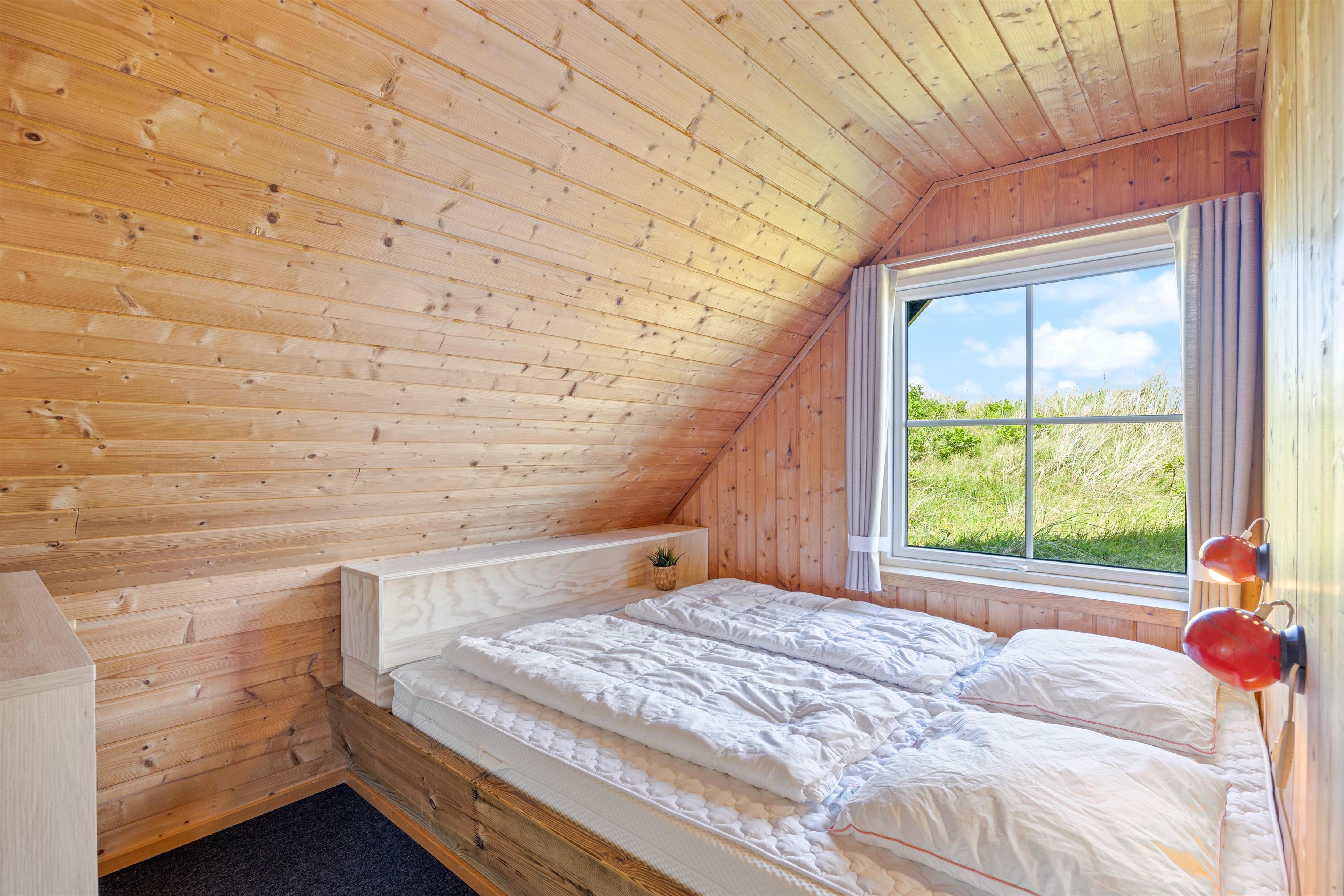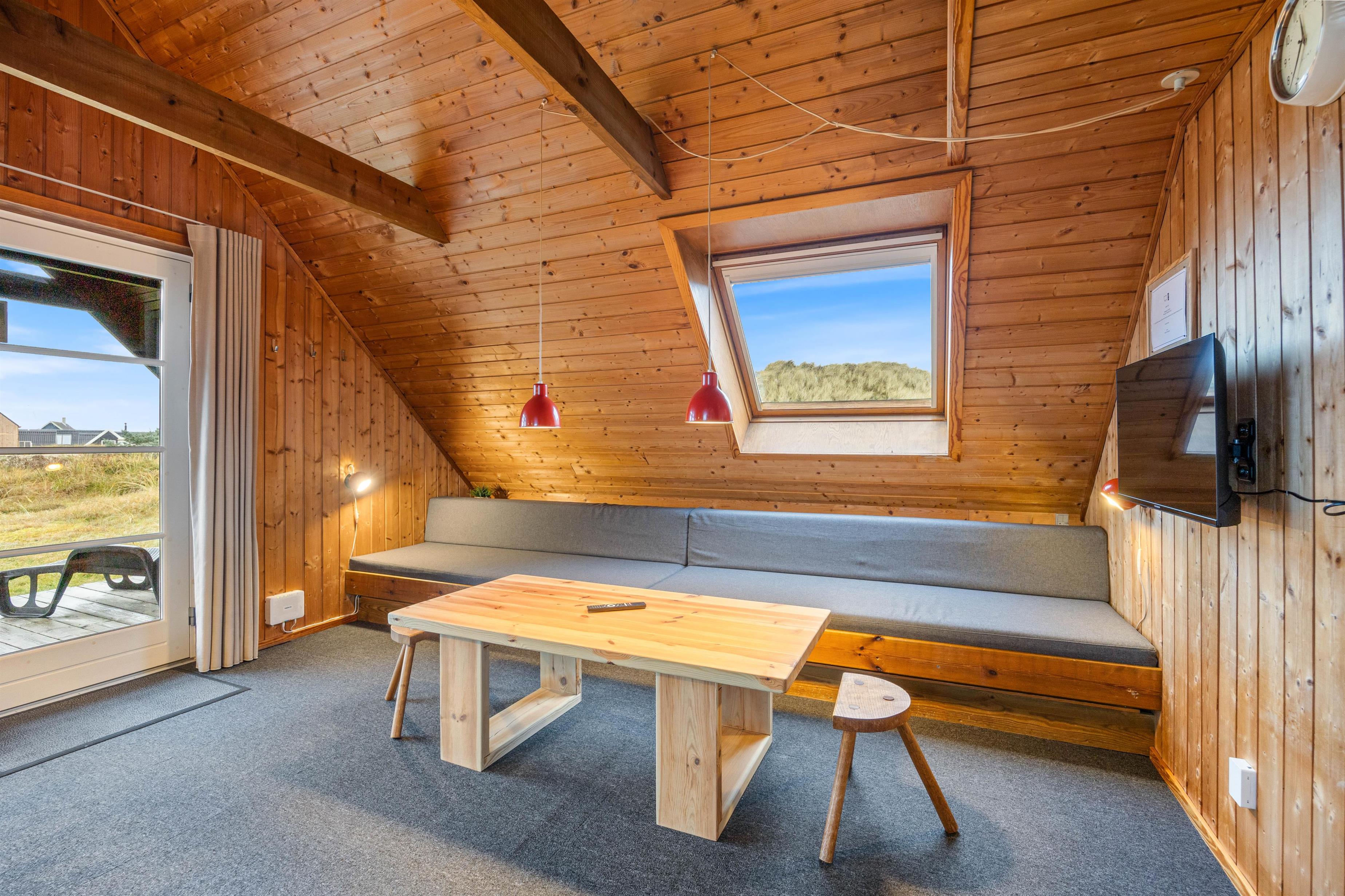 Med det samme I træder ind i dette sommerhus, vil I mærke den hyggelige atmosfære, som skråvæggene og træbjælkerne danner. I sommerhusets hyggelige stue, kan I sætte jer i sofaen og se en film på faldskærms-tv'et. Sommerhuset har to hyggelige soverum, som sikrer en god nats søvn efter en dag fyldt med aktiviteter. Derudover finder I også et badeværelse i sommerhuset.