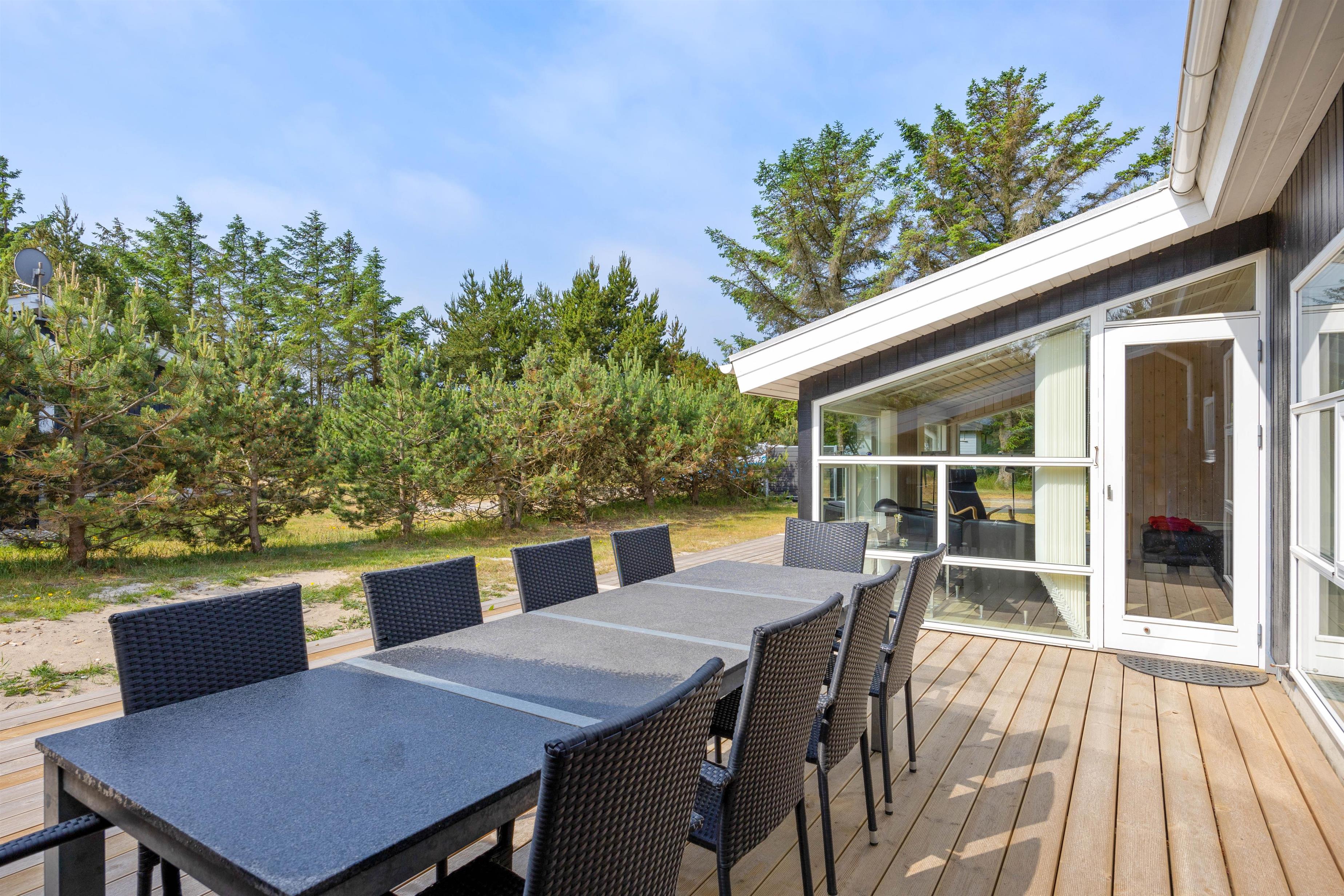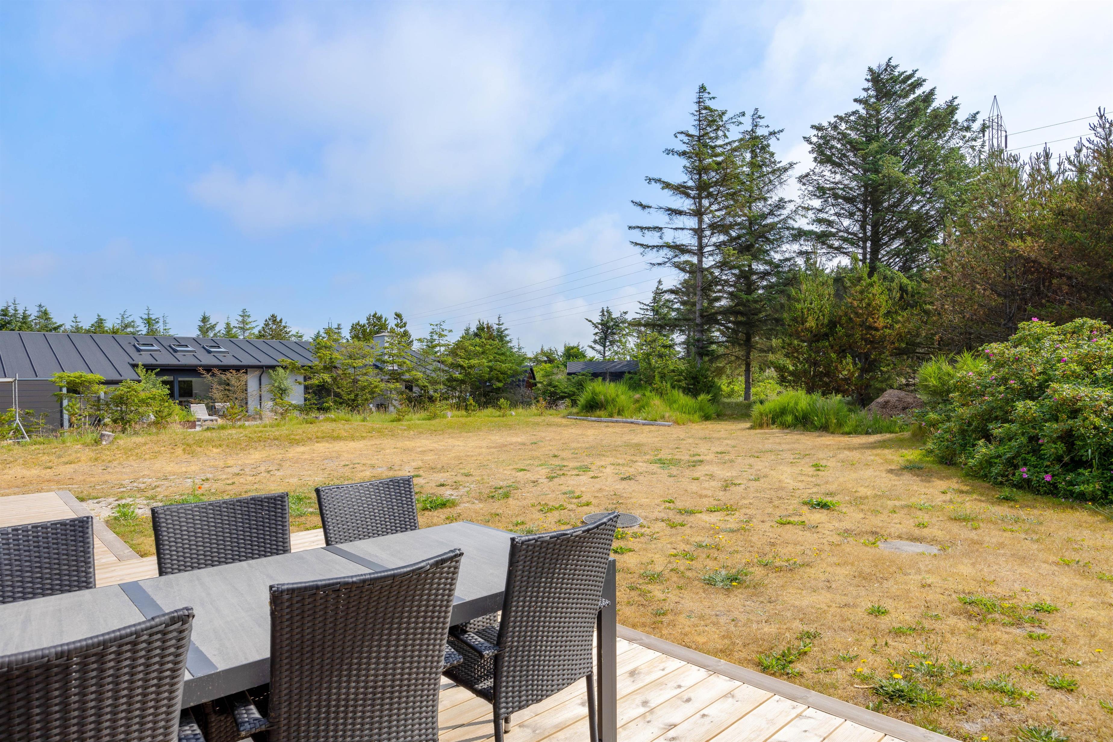 Fra stuen kan I træde ud på den store sydvendte terrasse - det bedste sted at tilbringe feriens solrige dage. Havemøbler og liggestole står klar til jer, så I kan finde jer godt til rette på terrassen, mens solen viser sig fra sin bedste side. Terrassen har også en overdækket krog, der er perfekt, hvis man trænger til lidt tid i skyggen.