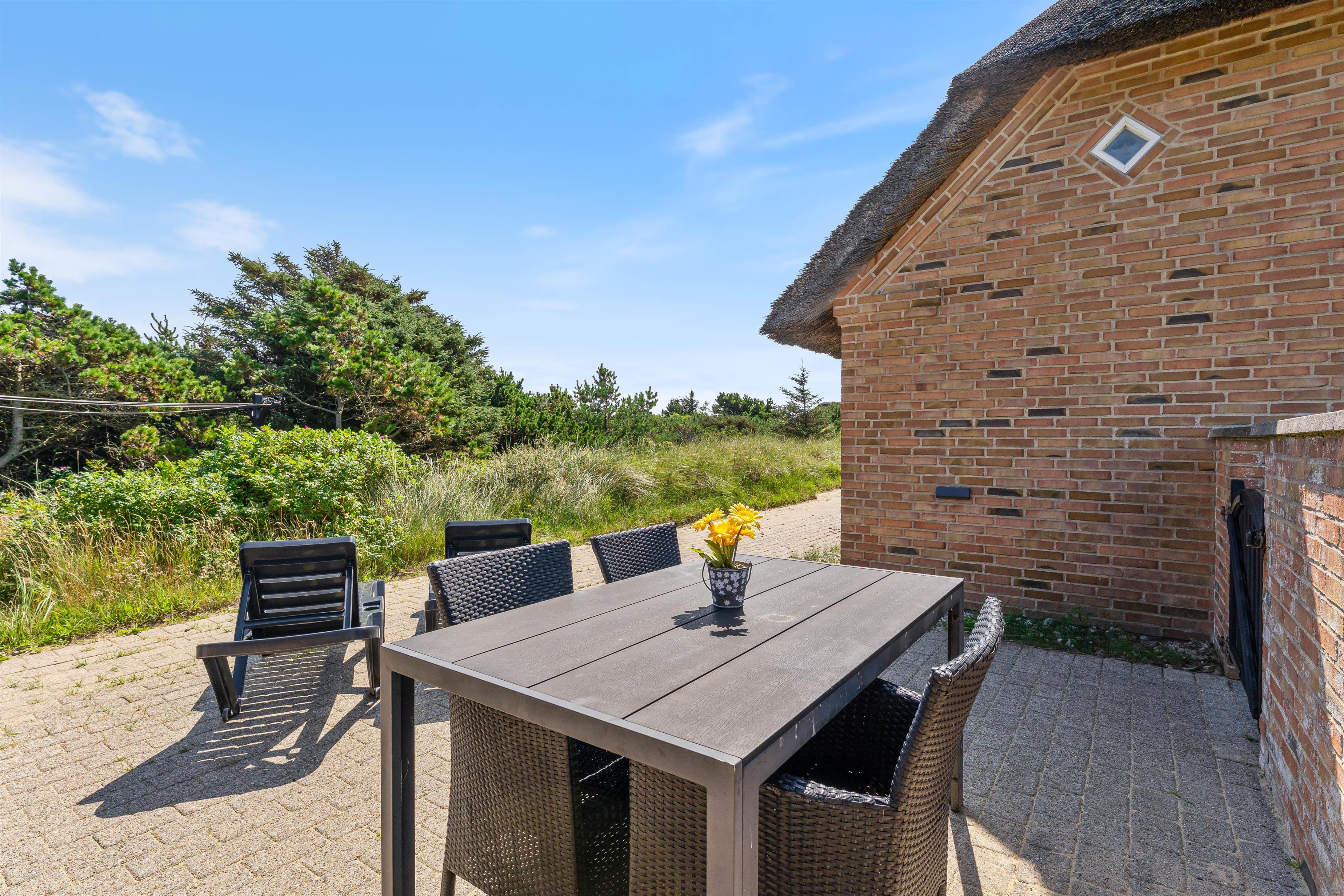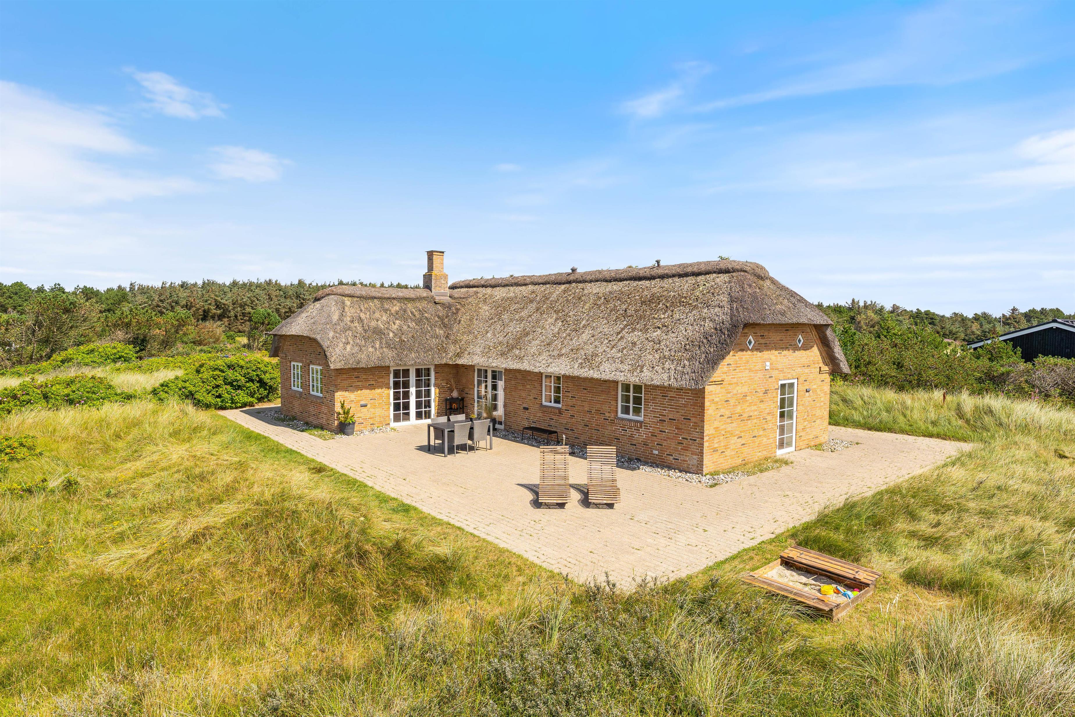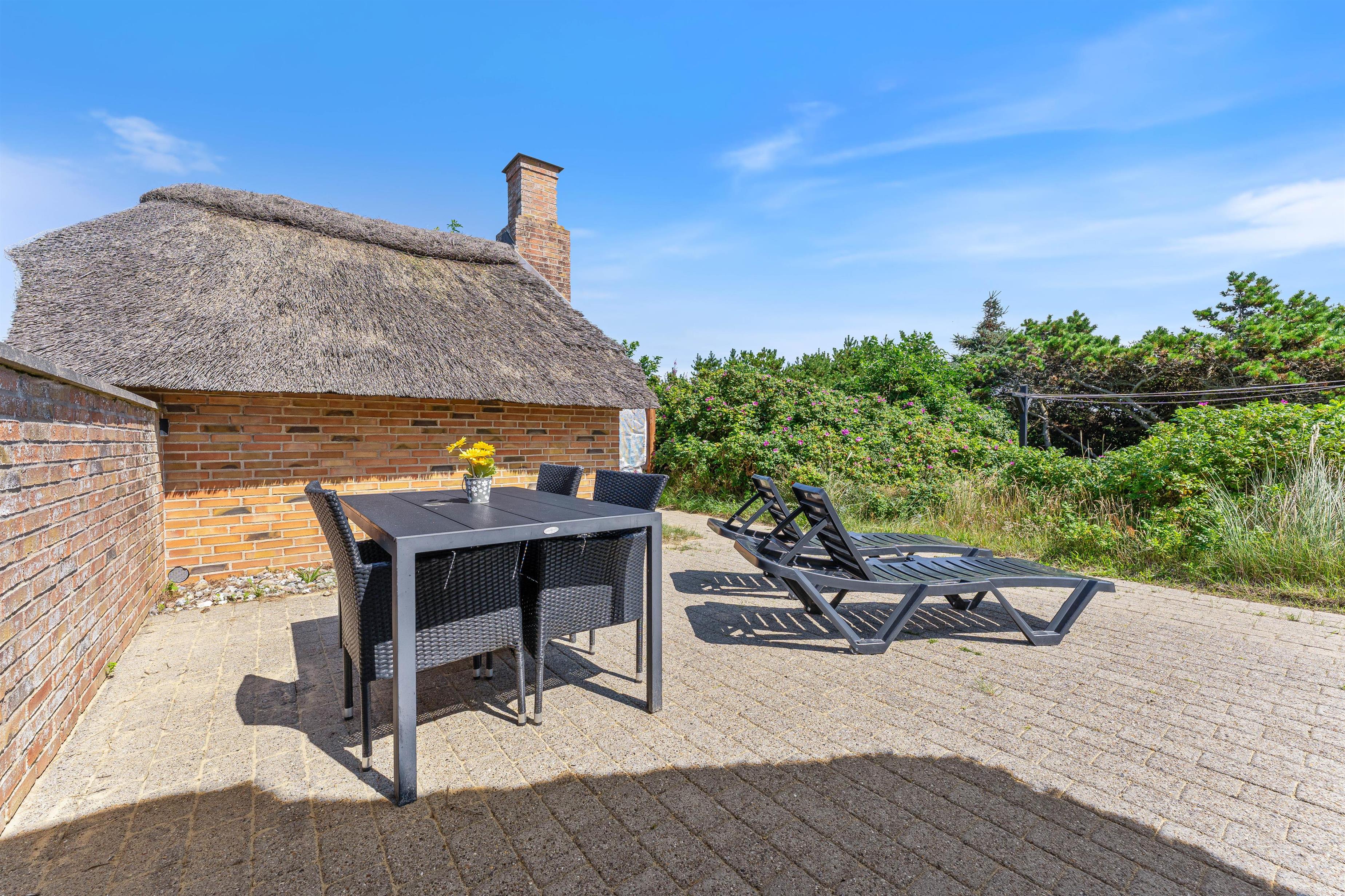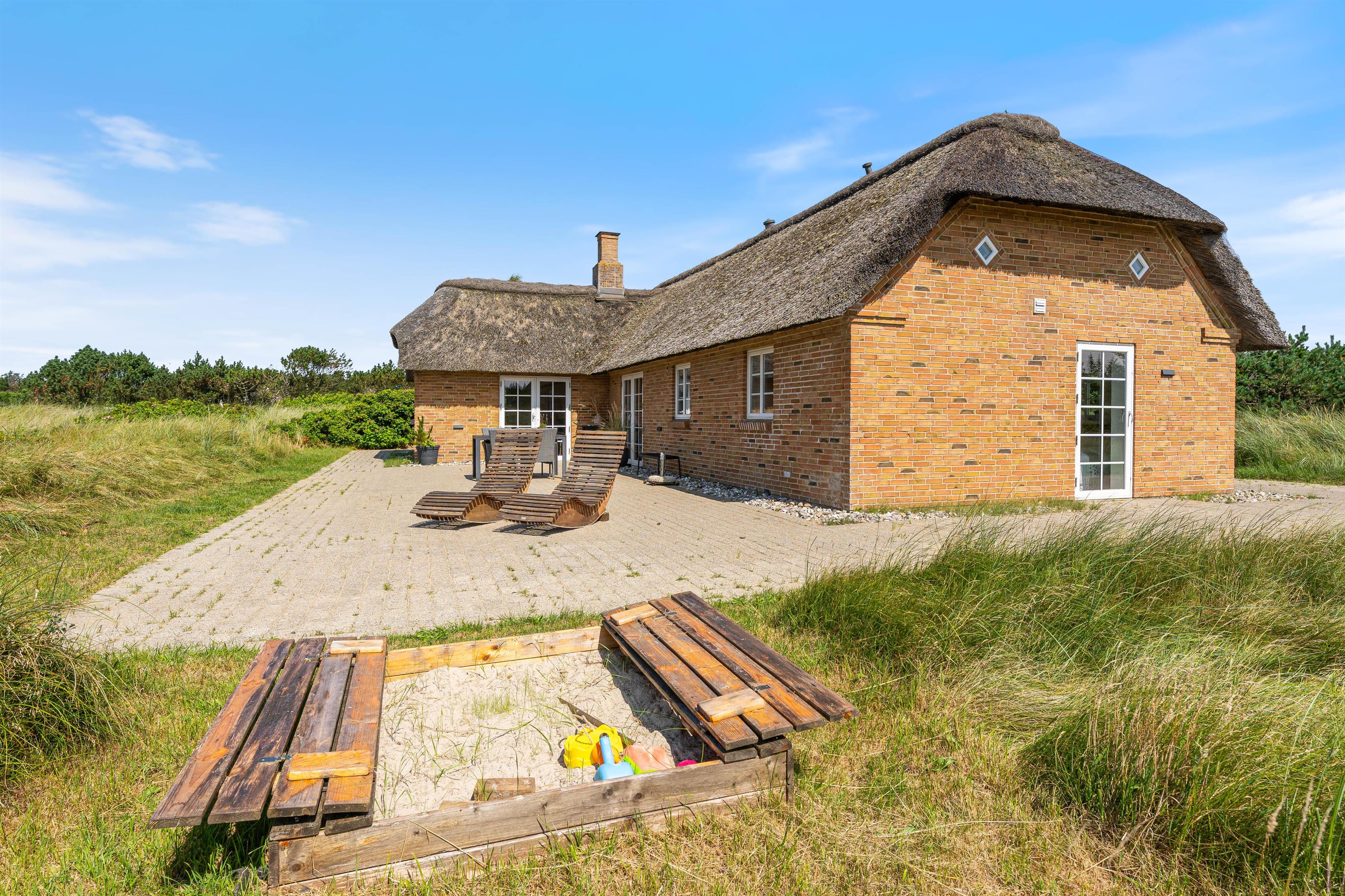 Tilhørende sommerhuset er en rummelig flisebelagt terrasse. Her er der en direkte udsigt til det skønne sommerhusområde og smukke hedelandskab. Derudover er sommerhuset omringet af en smuk naturgrund dækket af lyng og marehalm. Her kan I nyde vejret i liggestolene eller havemøblerne i selskab med et lækkert grillmåltid. Desuden er der her også plads til børnene - der er nemlig en sandkasse, som de kan underholdes med.