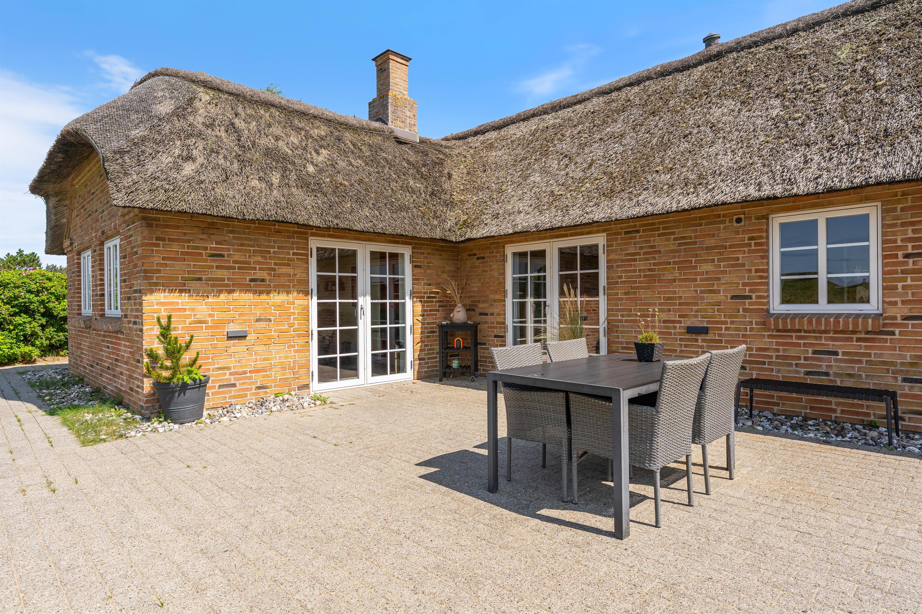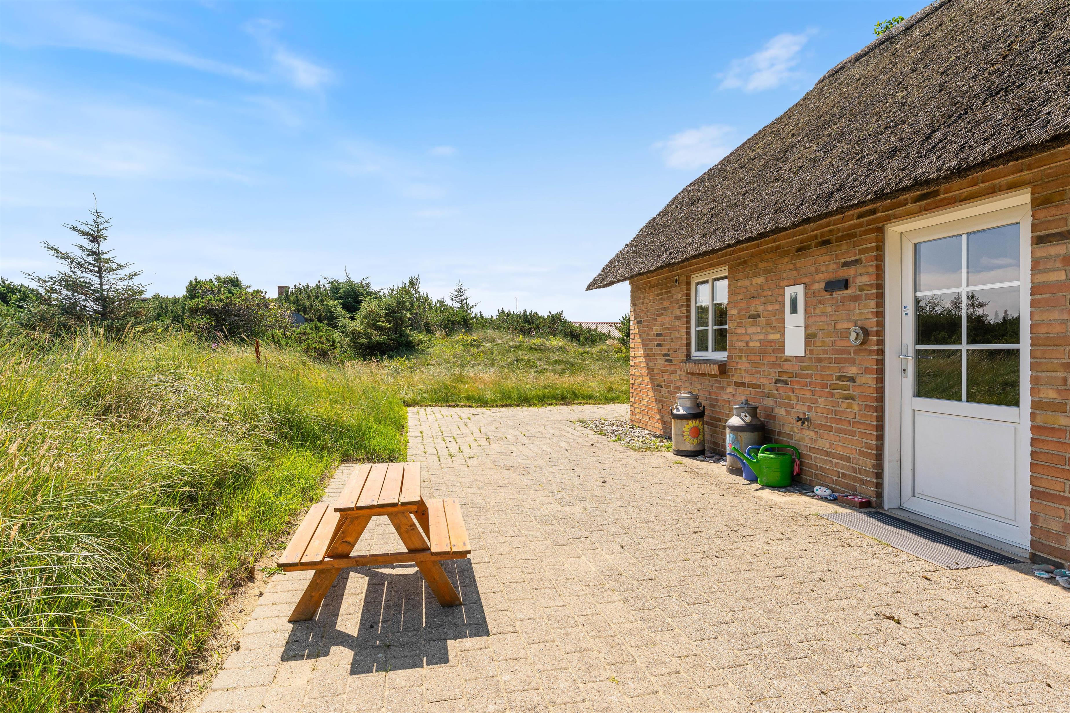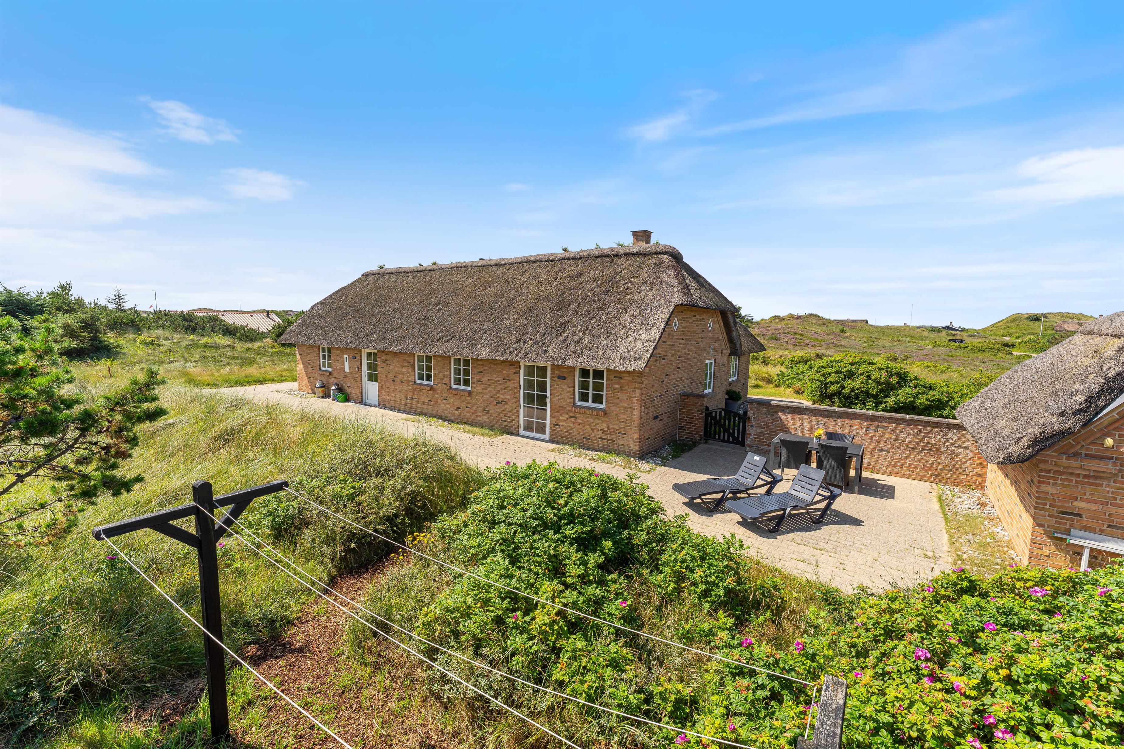 Tilhørende sommerhuset er en rummelig flisebelagt terrasse. Her er der en direkte udsigt til det skønne sommerhusområde og smukke hedelandskab. Derudover er sommerhuset omringet af en smuk naturgrund dækket af lyng og marehalm. Her kan I nyde vejret i liggestolene eller havemøblerne i selskab med et lækkert grillmåltid. Desuden er der her også plads til børnene - der er nemlig en sandkasse, som de kan underholdes med.